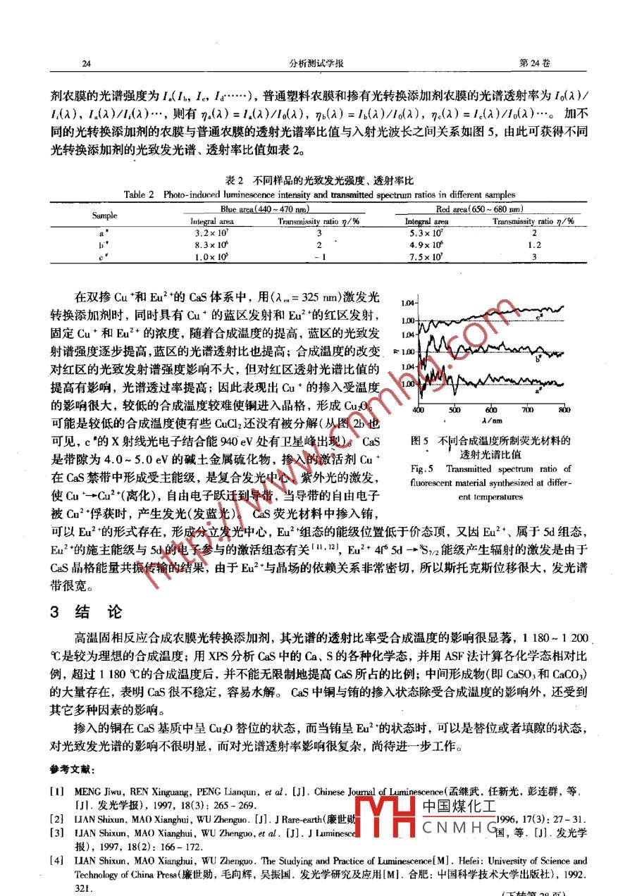 第24卷第6期分析測(cè)試學(xué)報(bào)Vol.24 No.6 .2005年11月FENXI CESHI XUEBAO(Jounal of Instrumpental Analysis)1 ~24農(nóng)膜光轉(zhuǎn)換添加劑的XPS剖析孫海珍1.3,王水菊2.3,陳謀智4,陳松巖4,蔡加法4(1.廈門大學(xué)化學(xué)系,福建廈門361005; 2.廈門大學(xué)固體表面物理化學(xué)國(guó)家重點(diǎn)實(shí)驗(yàn)室,福建廈門361005; 3.廈門大學(xué)分析測(cè)試中心,福建廈門361005; 4.廈門大學(xué)物理系,福建廈門361005)摘要: 報(bào)道了無保護(hù)氣氛條件下,采用高溫固相還原法合成適用于農(nóng)用塑料地膜的光轉(zhuǎn)換添加劑,共摻銅、銪激活劑的硫化鈣(CaS)無機(jī)熒光材料,用X射線光電子能譜(XPS)方法對(duì)光轉(zhuǎn)換添加劑中不同工藝下激活劑元素進(jìn)行表征,再通過光致發(fā)光譜、透射光譜測(cè)量,探索材料中激活劑的能量傳輸特性,為高新農(nóng)業(yè)的發(fā)展提供清潔能源。關(guān)鍵詞:硫化鈣;光轉(zhuǎn)換添加劑;激活劑中圈分類號(hào): 0657. 39; TN383. 1. 文獻(xiàn)標(biāo)識(shí)碼: A文章編號(hào): 1004 - 4957(2005)06- 0021 - 04XPS Dissection of the Optical Transtion Additive in Farm FilmSUN Hai -zhen'., WANG Shui-ju2., CHEN Mou-zhi', CHEN Song-yan*, CAI Jjia-fa*(1. Departnent of Chermistry, Xiamen University, Xiamen 361005, China; 2. State Key Laboratory for Physics Chemisty ofSolid Suface, Xiamen University , Xiamen 361005, China; 3. Analysis and Testing Cenlre , Xiamen Univrsity, .Xiamen 361005, Chima; 4. Department of Physics, Xiamen University , Xiamen 361005, China)Abstract: An optical transition additive used in fam flm was synthesized by doping the Cu and Eu activatorsinto an inorganic fluorescent material, CaS with the high-temperature solid phase reduction method under un-protected atmosphere. .The characteristics of the activators in the flms prepared under different conditionswere measured by X- ray photo electron spectroscopy. The energy - transfer propertied of the activators in thefilms were investigated by the photo- induced luminescence spectra and transmission spectra. It is useful fordeveloping a clean energy source in agriculture.Key words: CaS; Optical transition additive; Activator農(nóng)用地膜中的光轉(zhuǎn)換添加劑,是采用硫化鈣為基質(zhì),共摻Cu+、Eu2+等方法,使CaS: Cu, Eu的發(fā).射光譜和葉綠素光合作用的吸收光譜吻合,以此提高農(nóng)作物的光合作用能力,縮短作物的生長(zhǎng)期,提高產(chǎn)量,對(duì)此已有不少報(bào)道11-4。本文合成了系列共摻Cu +. Eu2 *的硫化鈣熒光材料,用X射線光電子能譜(XPS)方法來研究工藝條件、摻雜狀態(tài),結(jié)合對(duì)應(yīng)的光致發(fā)射光譜和透射譜,探索材料內(nèi)部的能量傳遞特性,為制備優(yōu)質(zhì)模擬光轉(zhuǎn)換添加劑提供理論支持。1實(shí)驗(yàn)部分1.1儀器及 測(cè)試條件XPS實(shí)驗(yàn)用PHI Quantum 2000 Scanning ESCA Microprobe電子能譜儀,儀器激發(fā)源用帶有單色器的Al靶,Al Kar.2能量hu=1 486.60 eV,分析室真空度優(yōu)于1x10-7 Pa,通過能Ep= 23.5 eV,所有譜圖均以碳污染物CIs結(jié)合能284. 80 eV進(jìn)行荷電校正。使用 FL-920瞬態(tài)熒光光譜儀和He - Cd(325 nm)激光器測(cè)試材料的光致發(fā)光譜。用SP . 750i單色儀、ED- 44探測(cè)器和NCL數(shù)據(jù)采集系統(tǒng)測(cè)試材料的透射光譜。1.2 試樣制備試樣采用高溫固相反應(yīng)制備,按化學(xué)計(jì)量比稱取CaSO中國(guó)煤化工nol, AR)、Eu2O,(0.03 mol, 99. 9%)、NHCl(適量, AR)和適量的碳粉等,磨!YHC N M H G將之置于高溫爐中灼燒2 h,得到的樣品經(jīng)XRD測(cè)試,證明為CaS物相。收稿日期: 2004-11- 02;修回日期: 2005-08-02基金項(xiàng)目:福建省自然科學(xué)基金資助項(xiàng)目(01100)0廈門大學(xué)自選課題基金資助項(xiàng)目(Y0700)貨者籮衡:建海珍(1978-),女山西大同人,碩士研究生;玉水菊.聯(lián)系人,Tl: 0592- 2184829. E- mal: sjwang@ xm .du.cn”2分析測(cè)試學(xué)報(bào)第24卷2結(jié)果與討論2.1熒光材料的 XPS分析對(duì)不同溫度下a"(1 200 C)、b"(1 180 C)、c*(1 120 C )合成的硫化鈣熒光材料進(jìn)行XPS測(cè)試,從全譜圖中可見,所制熒光材料中存在鈣、硫、氧、碳、硅、氯、鉀等元素,鉀的出現(xiàn)可能與助熔劑或摻雜材料的純度有關(guān),高溫灼燒使石英舟析出硅(Si),而出現(xiàn)碳可能與計(jì)量加入脫氧用的碳粉的數(shù)量過剩或反應(yīng)不充分有關(guān)。使用原子靈敏度因子( atomnic sensitivity faclor, ASF)分析法,計(jì)算S/Ca的相對(duì)原子濃度比獲知:a"樣品S/Ca約為2.17, b*樣品S/Ca約為1.80, e*樣品S/Ca約為1.66,其比值偏離1: 1較多??梢奀a的析出量較高。這可能是高溫固體反應(yīng)時(shí),對(duì)CaS: Cu, Eu這一較為復(fù)雜的熒光體,反應(yīng)時(shí)受蒸汽壓的影響較大,各元素的蒸汽壓和化學(xué)活性差別較大,樣品的Ca/S為a# 2. 44),碳的電負(fù)性略大于硫(2.5≥2.44),如果反應(yīng)室中脫氧不充分,就存在氧(或碳)取代硫與鈣結(jié)合的可能性。分別對(duì)不同工藝制備的CaS的Ca、S進(jìn)行XPS譜峰擬合如圖1, Ca與S的XPS譜峰不對(duì)稱,用PHI公司的譜圖處理軟件Mulipark進(jìn)行譜圖曲線擬合,擬合時(shí)對(duì)自旋-軌道偶合裂分的2p3z2 與2p1z能量間隔,譜峰面積比,半高寬及a峰形的高斯-洛倫茲比例等進(jìn)行限定。擬合。結(jié)果可知試樣中有多種價(jià)態(tài)的硫和鈣,可得Ca(I)、(I)、(M)和S(I ).(I)、(I)、(IV),這表明所制備的CaS中, Ca和s各是以多種形174171168165162159 354352350348346344態(tài)存在。其分