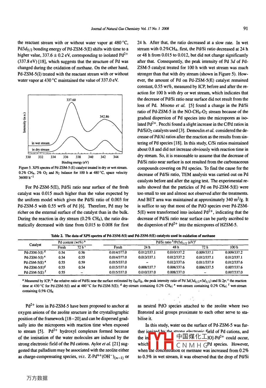 Available online at www.sciencedirect.comJOURWLOF小ScienceDirectNATURAL GASCHEMISTRYEL SEVIERJoumal of Natural Gas Chemistry 17(2008)87-92www. elsevier.com/locate/jngcEffect of water on the performance of Pd-ZSM-5 catalysts forthe combustion of methaneBo Zhang,Xingyi Wang*,Ogtour M'Ramadj,DaoLi, Hua Zhang,Guanzhong LuLaboratory for Advanced Materials, Research Instiute of Industrial Catalysis, East China Universityof Science and Tehnology, Shanghai 200237, China[Manuscrip rceive July 10, 2007; revised September 27.2007 IAbstract: Palladium-based catalysts were prepared using impregnation (I) and ion exchange method (E) with ZSM-5 assupport. Pd-ZSM-5(I) and Pd-ZSM-5(E) catalysts presented the high activity for the combustion of methane. The orderof activity was consistent with Bronsted acidity of the catalysts: Pd-ZSM-5(I)>Pd-ZSM-5(E). It was shown by FT-IR thatmethane was adsorbed on the acidic bridging hydroxyl groups of ZSM-S-supported Pd catalysts. The effect of water on theactivity of Pd-ZSM-5 was investigated. The inhibition effect of water on the conversion of methane was observed. However,water promoted the stability of Pd-ZSM-5 obviously during extended time periods. XPS measurement showed that PdSiratio near the surface of Pd- ZSM-5(E) decreased more pronouncedly with time in dry stream than that of Pd- ZSM-5(D), this isatributed to the dispersion of Pd into the micropores. The addition of water, however, retarded Pd dispersion. And high partialpressure of methane reduced this effect of water vapor. The decrease in activity during the stability test can be explained on thebasis of the reduction of Pd/Si ratio.Key words: methane combustion; Bronsted acid; paladium; ZSM-S; water1. Introductionadditive which could be completely reversible or permanentin deactivation of Pd catalysts, depending on the time periodCatalytic combustion of methane is an important technol-of exposure [11]. Recently, Ribeiro tested the kinetic rate ofogy employed to decrease the emission of NOz in the ap-methane oxidation in the presence of water on Pd catalystsplication of natural gas. Supported palladium catalysts pos-and found the magnitude of inhibition effect of water on thesess an excellent activity for the oxidation of methane andoxidation of methane as a function of temperature. At 553 K,therefore have been extensively used for catalytic combustionthe reaction order of water was about - 1; above 723 K, thepurposes [1], but the thermal stability of Pd catalys remainswater reaction order was close to 0[12].to be a problem. The state and dispersion of Pd supported onCurrently, carbenium ion chemistry is considered to beAl2O3 [2], SiO2 [3] or zeolites [4,5] were less stable at lowerthe most probable route for the initiation of alkane via hydridetemperature than the decomposition temperature of PdO dur-transfer on a solid acid [13,14]. Truitt and co-workers [15]ing the catalytic combustion of methane. Even though the ini-discovered that trace amounts of Lewis acid sites facilitatedtial activity is high at this temperature, the catalysts are notthe abstraction of hydride from alkane and generate reac-able to maintain the high conversion level during extendedtive carbenium ions. Liu and Flytzani-Stephanopoulos [16]time periods, that is, the activity is not stable [6,7]. Previousproved that the strength and geometry of acidic sites on thestudies showed that the addition of other metal elements intocatalyst surface played an important role in the breakage ofPd catalysts can improve their stability to some extent [4,8,9].C-H bond and the formation of intermediate species. How-There were also studies on the effects of water and carbonever, several recent publications still proposed the direct pro-dioxide on the activity of Pd catalysts for the combustion oftonatiot'dby Sommer and co-methane [10]. The efect of water was generally considered asworke中國(guó)煤化工:otolyse the Cc- H bondan inhibition effect, which depended on the reaction tempera-and thYHC N M H G alkanes was achievedture. Burch observed that the inhibition effects of water were at low temperature[1小Accoraing to the recent result [15],●Corresponding author, Tel: +86-21-64253372; E-mail: wangxy@ecust.edu.cnThis work was supported by the National Nanral Science Foundation of China (No.20377012).88Bo Zhang e al/Joumal of Natural Gas Chemisty VoL. 17No. 12008alkane did not simply undergo physical adsorption on the ze-2.3. Characterization of catalystsolite but rather formed a specific adsorpion complex with theprolon on Bransted acid sites. The formation of adsorptionBET surface area of catalyst was measured by nitrogencomplex was the route of activating the C-H bonds. How-adsorption at 77 K on a Micromeritics ASAP 2000 surfaceever, the mechanismic steps catalyzed by solid acids and theanalyzer. XPS spectum of catalyst was recorded on a Perkin-role of acid sites for the combustion of methane are ambigu-Elmer PHl-5400spectrometer, using a monochromatic MgKaous. The proof related to the C- -H activation is inadequateradiation(1253.6eV). The binding energy of adventitiousCls[13,14]. Therefore, an explicit understanding is needed to(284.6eV with an accuracy of士0.2 eV) was used as a refer-identify the role of the surface acidity of catalyst in the activa-ence.tion of methane during the catalyic combustion of methane.The FT-IR spetra were recorded using a NICOLETIn this study, plladium-based catalysts sppred onNEXUS 470 spectrophotometer with a rsoutio of 4 cm-!.ZSM-5 were prepared. The efet of water vapor on the ac-A total of 15 mg sample was ground finely, pressed into ativity and sabiliy of Pd-ZSM-5 catalysts for the oxidation of sef-pporing wafer, and mounted into a quatz IR cell wihCH4 was studied.CaF2 windows. Before adsorbing pyridine at room tempera-ture, the wafer was heated at 300°C for 4 h under 10-3 torr2. Experimental(1 tor= 133 Pa). The FT-IR spectra of pyridine adsorbed onthe catalyst were recorded after subsequent evacuation 
