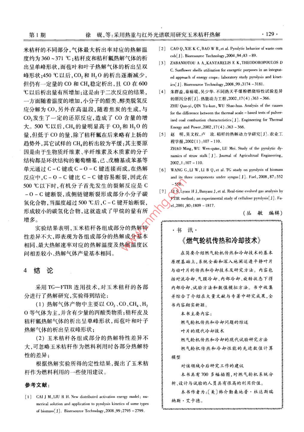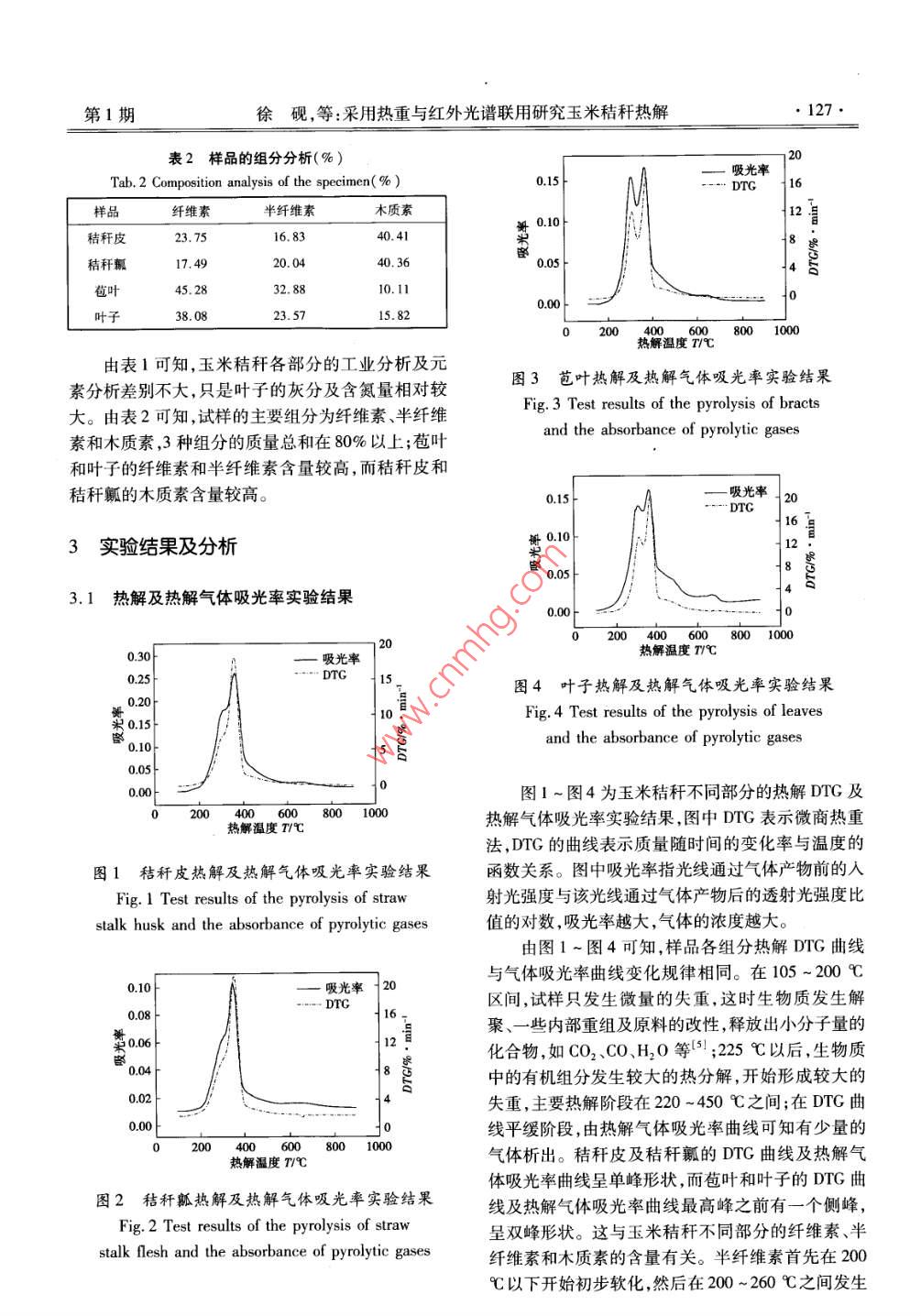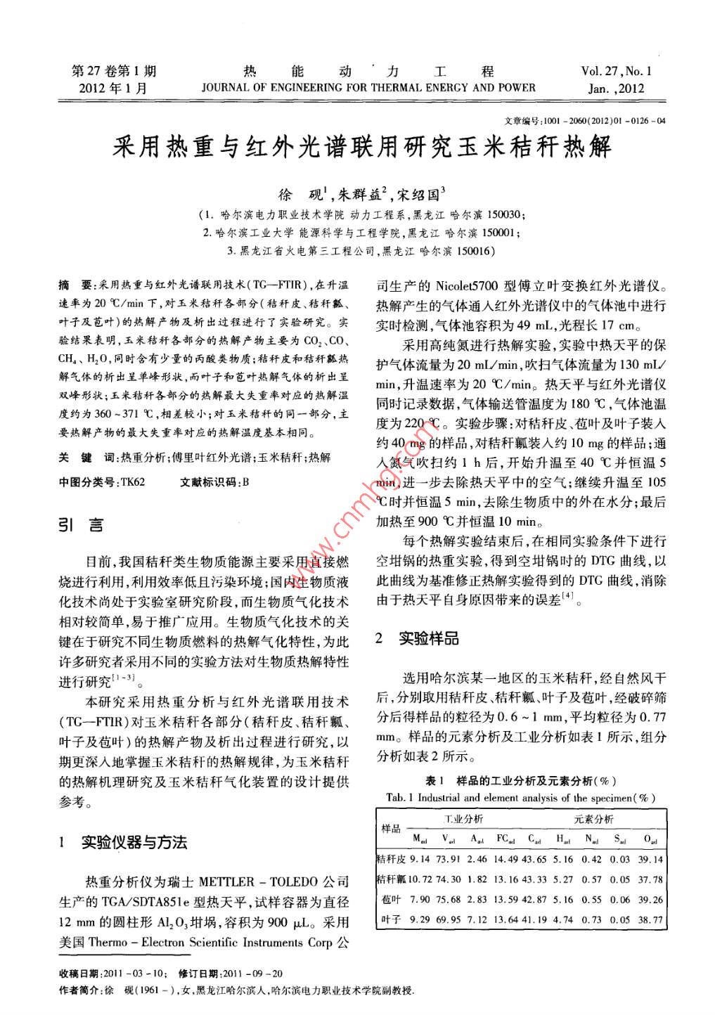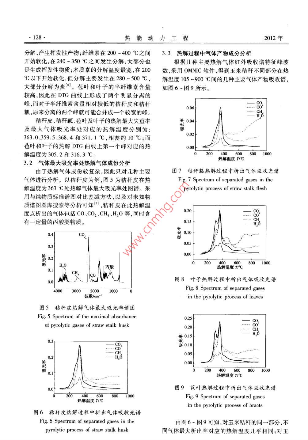 第27卷第1期熱能動力I程Vol. 27,No.12012年1月JOURNAL OF ENGINEERING FOR THERMAL ENERCY AND POWERJan. ,2012文章編號:1001 -2060(2012)01 -0126 -04采用熱重與紅外光譜聯(lián)用研究玉米秸稈熱解徐硯',朱群益,宋紹國3(1.哈爾濱電力職業(yè)技術(shù)學(xué)院動力工程系,黑龍江哈爾濱150030;2.哈爾濱工業(yè)大學(xué)能源科學(xué)與工程學(xué)院,黑龍江哈爾濱150001;3.黑龍江省火電第三工程公司,黑龍江哈爾濱150016)摘要:采用熱重與紅外光譜聯(lián)用技術(shù)(TC- -FTIR),在升溫司生產(chǎn)的Nicole5700型傅立葉變換紅外光譜儀。速率為20 C/min下,對玉米秸稈各部分(秸稈皮、秸稈瓤、熱解產(chǎn)生的氣體通人紅外光譜儀中的氣體池中進(jìn)行葉子及苞葉)的熱解產(chǎn)物及析出過程進(jìn)行了實(shí)驗(yàn)研究。5實(shí)時檢測,氣體池容積為49 mL,光程長17 cm。驗(yàn)結(jié)果表明,玉米秸稈各部分的熱解產(chǎn)物主要為CO2、CO、采用高純氮進(jìn)行熱解實(shí)驗(yàn),實(shí)驗(yàn)中熱天平的保CH、H20,同時含有少量的丙酸類物質(zhì);秸稈皮和秸稈瓤熱護(hù)氣體流量為20 mL/min,吹掃氣體流量為130 mL/解氣體的析出呈單峰形狀,而葉子和芭葉熱解氣體的析出呈min,升溫速率為20 C/min。熱天平與紅外光譜儀雙峰形狀;玉米秸稈各部分的熱解最大失重率對應(yīng)的熱解溫同時記錄數(shù)據(jù),氣體輸送管溫度為180 C ,氣體池溫度約為360~371 C,相差較小;對玉米秸稈的同一部分,主度為220心。實(shí)驗(yàn)步驟:對秸稈皮、苞葉及葉子裝人要熱解產(chǎn)物的最大失重率對應(yīng)的熱解溫度基本相同。約40mg的樣品,對秸稈瓤裝人約10mg的樣品;通關(guān)鍵詞:熱重分析;傅里葉紅外光譜;玉米秸稈;熱解人氮?dú)獯祾呒s1 h后,開始升溫至40 C并恒溫5中圖分類號:TK62文獻(xiàn)標(biāo)識碼:Bmin,進(jìn)一步去除熱天平中的空氣;繼續(xù)升溫至105C時并恒溫5 min, 去除生物質(zhì)中的外在水分;最后加熱至900 9C并恒溫10 min。每個熱解實(shí)驗(yàn)結(jié)束后,在相同實(shí)驗(yàn)條件下進(jìn)行目前,我國秸稈類生物質(zhì)能源主要采用直接燃空坩鍋的熱重實(shí)驗(yàn),得到空坩鍋時的DTG曲線,以燒進(jìn)行利用,利用效率低且污染環(huán)境;國內(nèi)生物質(zhì)液此曲線為基準(zhǔn)修正熱解實(shí)驗(yàn)得到的DTG曲線,消除化技術(shù)尚處于實(shí)驗(yàn)室研究階段,而生物質(zhì)氣化技術(shù)由于熱天平自身原因帶來的誤差中。相對較簡單,易于推廣應(yīng)用。生物質(zhì)氣化技術(shù)的關(guān)鍵在于研究不同生物質(zhì)燃料的熱解氣化特性,為此2 實(shí)驗(yàn)樣品許多研究者采用不同的實(shí)驗(yàn)方法對生物質(zhì)熱解特性進(jìn)行研究-3)。選用哈爾濱某一地區(qū)的玉米秸稈,經(jīng)自然風(fēng)干本研究采用熱重分析與紅外光譜聯(lián)用技術(shù)后,分別取用秸稈皮、秸稈瓤、葉子及苞葉,經(jīng)破碎篩(TC- -FTIR)對玉米秸稈各部分(秸稈皮、秸稈瓤、分后得樣品的粒徑為0.6~1 mm,平均粒徑為0.77葉子及苞葉)的熱解產(chǎn)物及析出過程進(jìn)行研究,以mm。樣品的元素分析及工業(yè)分析如表1所示,組分期更深入地掌握玉米秸稈的熱解規(guī)律,為玉米秸稈分析如表2所示。的熱解機(jī)理研究及玉米秸稈氣化裝置的設(shè)計(jì)提供表1樣品的工業(yè)分析及元素分析(% )參考。Tab. I Industrial and element analysis of the specimen(% )工業(yè)分析元素分析.1實(shí)驗(yàn)儀器與方法1.u V A。FC.CuH_N.u S. 0秸稈皮9.14 73.91 2.46 14.4943.65 5.16 0.42 0.03 39.14熱重分析儀為瑞士METTLER-T0LEDO公司精稈瓤10.7274.30 1.82 13.1643.33 5.27 0.57 0.05 37.78生產(chǎn)的TGA/SDTA851e型熱天平,試樣容器為直徑苞葉7.90 75.68 2.83 13.5942.87 5.16 0.55 0.06 39.26 .12 mm的圓柱形AI2O3坩堝,容積為900 μL。采用葉子9.29 69.95 7.12 13.6441.19 4.74 0.73 0.05 38.77美國Thermo - Electron Scientifie Instruments Corp公收稿日期:2011-03-10;修訂日期:2011-09-20作者簡介:徐硯(1961 -),女,黑龍江哈爾濱人,哈爾濱電力職業(yè)技術(shù)學(xué)院副教授.第1期徐硯,等:采用熱重與紅外光譜聯(lián)用研究玉米秸稈熱解, 127表2樣品的組分分析(% )_吸光率Tab.2 Composition analysis of the specimen( % )-- DTG16樣品纖維素半纖維素木質(zhì)素0.10秸稈皮23. 7516.8340.41米秸稈瓤17.4920.0440.360.05苞葉45.2832. 8810.110.00葉子38.0823. 5715.82200 4000600800 1000由表1可知,玉米秸稈各部分的工業(yè)分析及元圖3芭葉熱解及熱解 氣體吸光率實(shí)驗(yàn)結(jié)果素分析差別不大,只是葉子的灰分及含氮量相對較Fig. 3 Test results of the pyrolysis of bracts大。由表2可知,試樣的主要組分為纖維素、半纖維and the absorbance of pyrolytic gases素和木質(zhì)素,3種組分的質(zhì)量總和在80%以上;苞葉和葉子的纖維素和半纖維素含量較高,而秸稈皮和秸稈瓤的木質(zhì)素含量較高。0.15吸光率-20+13實(shí)驗(yàn)結(jié)果及分析t 0.102!0.05 t3.1熱解及 熱解氣體吸光率實(shí)驗(yàn)結(jié)果0.00-0 200400600 800 100020熱解溫度T/C0.30一-吸光率0.25---. DTG15.圖4葉子 熱解及熱解氣體吸光率實(shí)驗(yàn)結(jié)果0.20Fig. 4 Test results of the pyrolysis of leaves米0.150圖1 ~圖4為玉米秸稈不同部分的熱解DTG及0 200 400 600 800 1000熱解氣體吸光率實(shí)驗(yàn)結(jié)果,圖中DTG表示微商熱重法,DTG的曲線表示質(zhì)量隨時間的變化率與溫度的圖1秸稈皮熱解及 熱解氣體吸光率實(shí)驗(yàn)結(jié)果函數(shù)關(guān)系