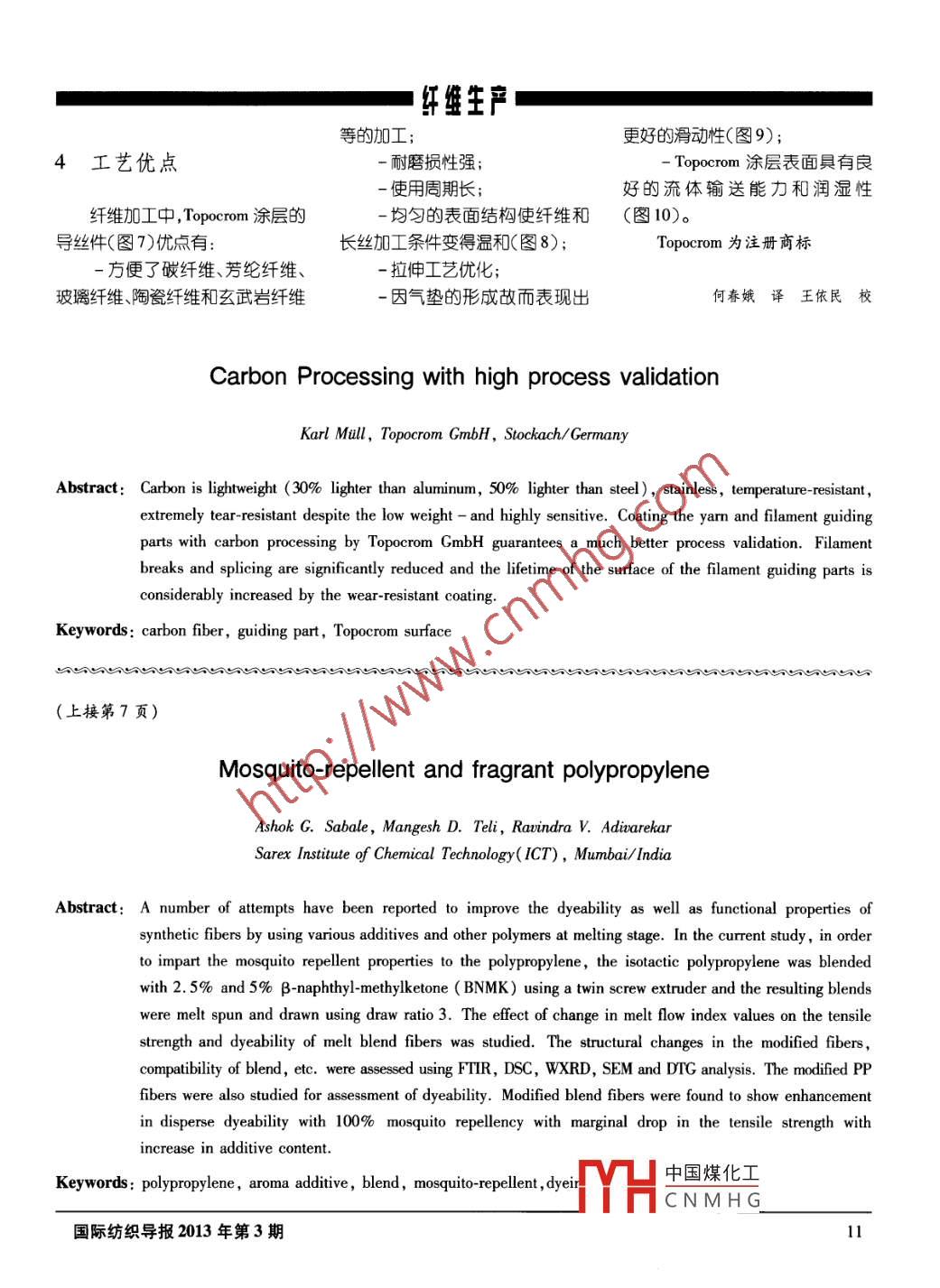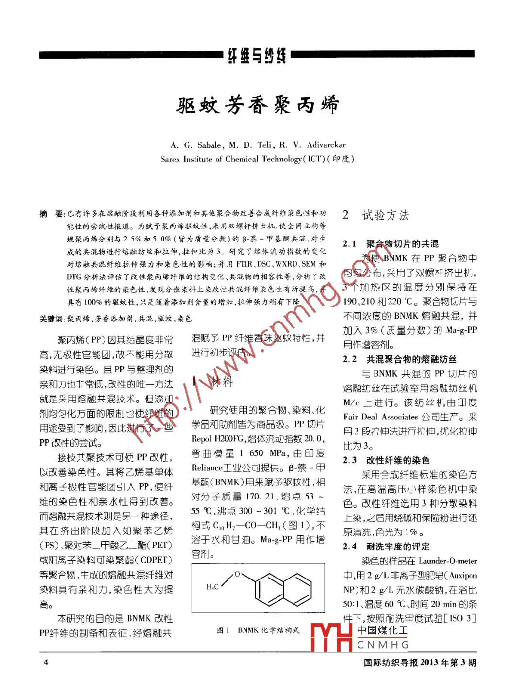紅盤與線驅蚊芳香聚丙烯A. G. Sabale, M. D. Teli. R. V. AdvarekarSarex Institute of Chemical Technology (ICT)(EPRt摘要:已有許多在熔融階段利用各種添加劑和其他聚合物改善合成纖單染色性和功2試驗方法能性的嘗試性報道。為賦予聚丙烯驅蚊性,采用雙螺杄擠出機,使全同立構等規(guī)聚丙烯分別與2.5%和5.0%(皆為質量分數(shù))的β-萘一甲基酮共混,對生成的共混物進行熔融紡絲和拉伸,拉伸比為3。研究了熔體流動指數(shù)的變化2.1聚合物切片的共混對熔融共混纖維拉伸強力和染色性的影響;并用FTIR、DSC、WXRD、SEM和為使BNMK在P聚合物中DrG分析法評估了改性聚丙烯纖維的結構變化、共混物的相容性等,分析了改均勻分布采用了雙螺桿擠出機,性聚丙烯纖維的染色性,發(fā)現(xiàn)分散來料上染改性共混纖維染色性有所提高,并3個加熱區(qū)的溫度分別保持在具有100%的驅蚊性,只是隨著添加劑含量的增加,拉仲強力稍有下降」190、210和220℃。聚合物切片與關鍵詞:聚丙烯,芳香添加劑,共混,驅蚊,染色不同濃度的BNMK熔融共混,并聚丙烯(PP)因其結晶度非?;熨x予P纖維香味驅蚊特性,并3%(質量分數(shù))的MagP用作增容劑高,無極性官能團,故不能用分散進行初步評估。2.2共混聚合物的熔融紡絲染料進行染色。且PP與整理劑的親和力也非常低,改性的唯一方法1材料與BNMK共混的PP切片的熔融紡絲在試驗室用熔融紡絲機就是采用熔融共混技術。但添加M/c上進行。該紡絲機由印度劑均勻化方面的限制也使纖維的研究使用的聚合物、染料、化用途受到了影,因此進行了一些學品和助劑皆為商品級。P切片F(xiàn)air Deal Associates公司生嚴。采Repl H200FG,熔體流動指數(shù)20.0用3段拉伸法進行拉伸,優(yōu)化拉伸PP改性的嘗試。接枝共聚技術可使P改性,雪曲模量1650MPa,由印度比為3。以改善染色性。其將乙烯基單體 Reliance I業(yè)公司提供。B禁-2.3改性纖維的染色采用合成纖維標準的染色方和離子極性官能團引入P,使纖基酮(BNK用來賦予驅蟻性,相法,在高溫高壓小樣染色機中染而烴融共混技術則是另一種途徑,55℃,沸點300-301℃,化學結色。改性纖維選用3種分散染料維的染色性和親水性得到改善對分子質量170.21,熔點53~其在擠出階段加入如聚苯乙構式CnH2C0-CH1(圖1),不上染,之后用燒堿和保險粉進行還原清洗,色光為1%。(PS)、聚對苯二甲酸乙二酯(PET)浴于水和甘油。MagP用作增24耐洗牢度的評定或陽離子染料可染聚酯( CDPET)容劑。染色的樣品在 Launder-O- meter等聚合物,生成的焓融其混纖維對中,用2gL非離子型肥皂( Auxipon染料員有親和力,染色性大為提NP)和2g/L無水碳酸鈉,在浴比0:1、溫度60℃、時間20min的條本研究的目的是BNMK改性件下,按照耐洗牢度試驗[ISO3PP纖維的制備和表征,經熔融共圖1BNMK化學結構式中國煤化工CNMHG國際紡織導報2013年第3期紅維與繡統(tǒng)2.5色深度的評定表1BNMK含量對改性PP纖維色深度(KS值)的影響樣品色深度用 Kubelka munkBNMK舍量(質量分數(shù))K/S值變化率/耐洗牢度函數(shù)(KS值)表示,采用美國分散染料K/S值%級Datacolor International公司生嚴的CBENE Yellow GNL0.0100.00SF300計算機配色系統(tǒng)評定。.6l2.6纖維結構的分析5.0176.31采用標準方法對拉伸強力和CBENE Red 38LS0.0100.00斷裂伸長率進行測定,并采用FTIR2.5243.76光譜圖、差示掃描量熱法(DSC)、5.0l1.01X射線行射法(WXRD)熱重量法 CBENE Neavy Blue3Rr3.95100.00(TGA)等進行分析。55555555521.24537.705.026.95682.633測試結果和討論BNMK芳香聚合物改性的PP纖維及結晶溫度,利用下式可計算出試純PP分別與25%和5.0%顯示了100%的驅蚊性而未處理樣的總結晶百分率(Xa)(皆為質量分數(shù))的BNMK共混得的P纖維驅蚊性為零。Xta△Hx100%到的芳香纖維,有一股濃郁的香32染色性△Hm0味,這種改性P纖維即便經過反改性PP纖維的染色結果示于式中:△mDC測得的熔化熱;復洗滌,2年后仍有濃郁的香氣,表1。與純PP纖維相比,改性PP△Hm—熔化熱參考值,聚這表明該香味具有高度的耐久性。纖維上染較深對所選用的3種分丙烯的熔化熱參該芳香纖維的耐洗性可能是芳香散染料都是如此。且隨著改性PP考值是207Jgo化合物在纖維紡絲前共混并嵌入纖維中添加劑含量的增加,染色性DSC分析表明,純PP和改性纖維結構所致。也在提高。當添加劑含量為25%PP的忘結晶百分率分別為x,1%且純P和性P的FIR光譜(質量分數(shù))時染色性提高范圍為和3674%。結晶度下降,必然意圖表明改性PP在2922.26cm1130.61%~537.70%;當添加劑含味著芳香添加劑BNMK的加入使處存在代表PP結構的CH基。量為50%(質量分數(shù))時,染色性非晶含量增加這定是染色性顯著另外,在1200-1600cm范圍內提高范圍為176,31%-682.63%。提高的主要原因所在。存在4個主要的吸收帶純PP難于用分散染料上染,而改-WXRD法122.87、1271.09、1280.73及性PP染色性顯著提高的原因可能用WXRD法分析純PP和改1363.67cm,這與改性P纖維與蓬松的芳香添加劑BNMK分子性P試樣的X射線結晶度。純混入聚合物基體使纖維的結晶度P試樣顯示出高結晶取向結構,3.1驅蚊性降低,非晶含量增加有關。結晶度為83.92%,且在20為按標準方法分別測試純PP和為進一步了解改性PP纖維染14.217°、16.813°、18.529°和與BNMK共混的改性P芳香纖色性提高的原因,對改性纖維內部21.731°處顯示了尖銳的結晶峰,維的驅蚊性。用改性PP和純PP結構進行了分析。表明纖維結構中存在高取向的結制作帳篷,將雌蚊放置于帳篷之中DSC法晶區(qū)。而在經5.0%(