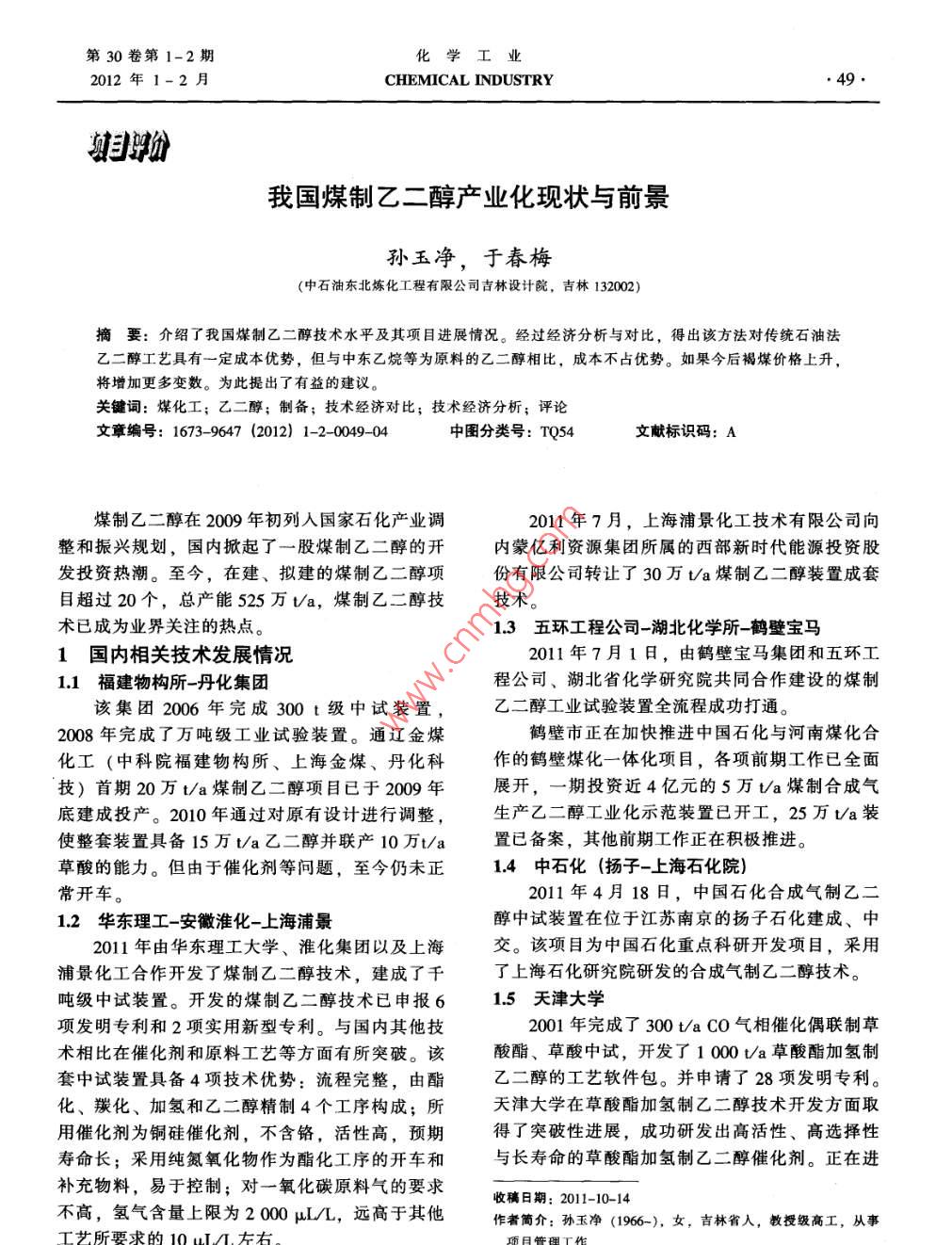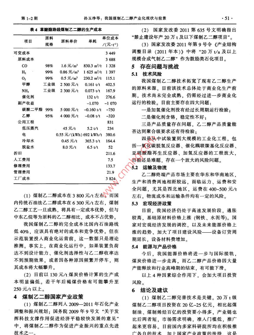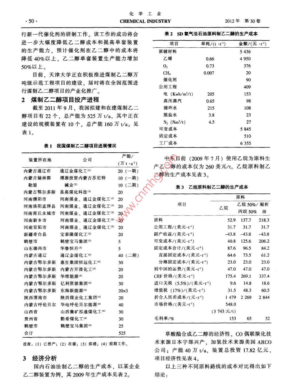 第30卷第1-2期化學工業(yè)2012年1-2月CHEMICAL INDUSTRY49射我國煤制乙二醇產(chǎn)業(yè)化現(xiàn)狀與前景孫玉凈,于春梅(中石油東北煉化工程有限公司吉林設(shè)計院,吉林132002摘要:介紹了我國煤制乙二醇技術(shù)水平及其項目進展情況。經(jīng)過經(jīng)濟分析與對比,得出該方法對傳統(tǒng)石油法乙二醇工藝具有一定成本優(yōu)勢,但與中東乙烷等為原料的乙二醇相比,成本不占優(yōu)勢。如果今后褐煤價格上升,將增加更多變數(shù)。為此提出了有益的建議。關(guān)鍵詞:煤化工;乙二醇;制備;技術(shù)經(jīng)濟對比;技術(shù)經(jīng)濟分析;評論文章編號:1673-9647(2012)1-2-0049-04中圖分類號:TQ54文獻標識碼:A煤制乙二醇在2009年初列入國家石化產(chǎn)業(yè)調(diào)2011年7月,上海浦景化工技術(shù)有限公司向整和振興規(guī)劃,國內(nèi)掀起了一股煤制乙二醇的開內(nèi)蒙億利資源集團所屬的西部新時代能源投資股發(fā)投資熱潮。至今,在建、擬建的煤制乙二醇項份有限公司轉(zhuǎn)讓了30萬ta煤制乙二醇裝置成套目超過20個,總產(chǎn)能525萬U/a,煤制乙二醇技技術(shù)。術(shù)已成為業(yè)界關(guān)注的熱點。13五環(huán)工程公司-湖北化學所-鶴壁寶馬1國內(nèi)相關(guān)技術(shù)發(fā)展情況2011年7月1日,由鶴壁寶馬集團和五環(huán)工11福建物構(gòu)所-丹化集團程公司、湖北省化學研究院共同合作建設(shè)的煤制該集團2006年完成300t級中試裝置乙二醇工業(yè)試驗裝置全流程成功打通2008年完成了萬噸級工業(yè)試驗裝置。通遼金煤鶴壁市正在加快推進中國石化與河南煤化合化工(中科院福建物構(gòu)所、上海金煤、丹化科作的鶴壁煤化一體化項目,各項前期工作已全面技)首期20萬ta煤制乙二醇項目已于2009年展開,一期投資近4億元的5萬ta煤制合成氣底建成投產(chǎn)。2010年通過對原有設(shè)計進行調(diào)整,生產(chǎn)乙二醇工業(yè)化示范裝置已開工,25萬Ua裝使整套裝置具備15萬ta乙二醇并聯(lián)產(chǎn)10萬t/a置已備案,其他前期工作正在積極推進。草酸的能力。但由于催化劑等問題,至今仍未正14中石化(揚子-上海石化院)常開車。2011年4月18日,中國石化合成氣制乙二12華東理工一安徽淮化-上海浦景醇中試裝置在位于江蘇南京的揚子石化建成、中2011年由華東理工大學、淮化集團以及上海交。該項目為中國石化重點科研開發(fā)項目,采用浦景化工合作開發(fā)了煤制乙二醇技術(shù),建成了千了上海石化研究院研發(fā)的合成氣制乙二醇技術(shù)。噸級中試裝置。開發(fā)的煤制乙二醇技術(shù)已申報61.5天津大學項發(fā)明專利和2項實用新型專利。與國內(nèi)其他技2001年完成了300t/aCO氣相催化偶聯(lián)制草術(shù)相比在催化劑和原料工藝等方面有所突破。該酸酯、草酸中試,開發(fā)了1000/a草酸酯加氫制套中試裝置具備4項技術(shù)優(yōu)勢:流程完整,由酯乙二醇的工藝軟件包。并申請了28項發(fā)明專利?;?、羰化、加氫和乙二醇精制4個工序構(gòu)成;所天津大學在草酸酯加氫制乙二醇技術(shù)開發(fā)方面取用催化劑為銅硅催化劑,不含鉻,活性高,預(yù)期得了突破性進展,成功研發(fā)出高活性、高選擇性壽命長;采用純氮氧化物作為酯化工序的開車和與長壽命的草酸酯加氫制乙二醇催化劑。正在進補充物料,易于控制;對一氧化碳原料氣的要求收稿日期:2011-10-14不高,氫氣含量上限為2000μL/L,遠高于其他作者簡介:孫玉凈(1966-),女,吉林省人,教授級高工,從事工藝所要求的10山/左右化學工業(yè)CHEMICAL INDUSTRY2012年第30卷行新一代催化劑的研制工作。該工作的成功將會表2SD氧氣法石油原料制乙二醇的生產(chǎn)成本進一步大幅度降低乙二醇成本和提高單套裝置項目單耗/(tt")金額/(元,t)的生產(chǎn)能力,預(yù)計催化劑在乙二醇中的成本將原輔材料5436降低40%以上,乙二醇單套裝置生產(chǎn)能力增加495050%以上。0.73目前,天津大學正在積極推進煤制乙二醇萬CHa0.007噸級示范工程項目的建設(shè),屆時將在全國范圍進催化劑行煤制乙二醇項目的產(chǎn)業(yè)化推廣公用工程電(Kwh/m3/t)2煤制乙二醇項目投產(chǎn)進程高壓蒸汽0.65截至2011年9月,我國擬建和在建煤制乙二循環(huán)水215醇項目有22個,總產(chǎn)能為525萬t/a,其中正在脫鹽水3.8建設(shè)的規(guī)模裝置有10個,總產(chǎn)能160萬t/a。見N2(Nm /t)4.5表1可變成本5845固定成本510表1我國煤制乙二醇項目進展情況工廠成本6355產(chǎn)能/公司中東目前(2009年7月)使用乙烷為原料生(萬t·a4)內(nèi)蒙古通遼市通遼金煤化工①20(一期產(chǎn)乙二醇的成本僅為260美元/t。乙烷原料制乙內(nèi)蒙古錫林郭博源投資內(nèi)蒙古蘇尼特10(一期)二醇的生產(chǎn)成本見表3。勒盟堿業(yè)(2)10(二期表3乙烷原料制乙二醇的生產(chǎn)成本內(nèi)蒙古鄂爾多斯易高煤化科技河南濮陽市河南煤業(yè)、通遼金煤化工③)20原料河南洛陽孟津縣河南煤業(yè)、通遼金煤化工20項目乙烷乙烷50%/凝析河南商丘永城市河南煤業(yè)、通遼金煤化工③)20丙烷50%油河南新鄉(xiāng)市河南煤業(yè)、通遼金煤化工)20原料529137.7218.3河南安陽市河南煤業(yè)、通遼金煤化工0)20公用工程/(美元,t)31731.731.7新疆奇臺縣寶泰隆煤化工③副產(chǎn)收益/(美元,t43.8-43.8-43.8鶴壁市鶴壁寶馬集團③255可變成本/(美元t)40.8125,6206,2山東德州市華魯恒升③固定成本合計/