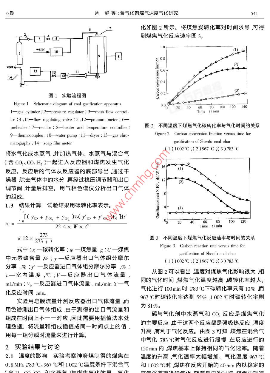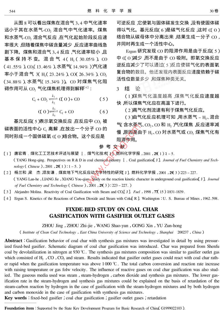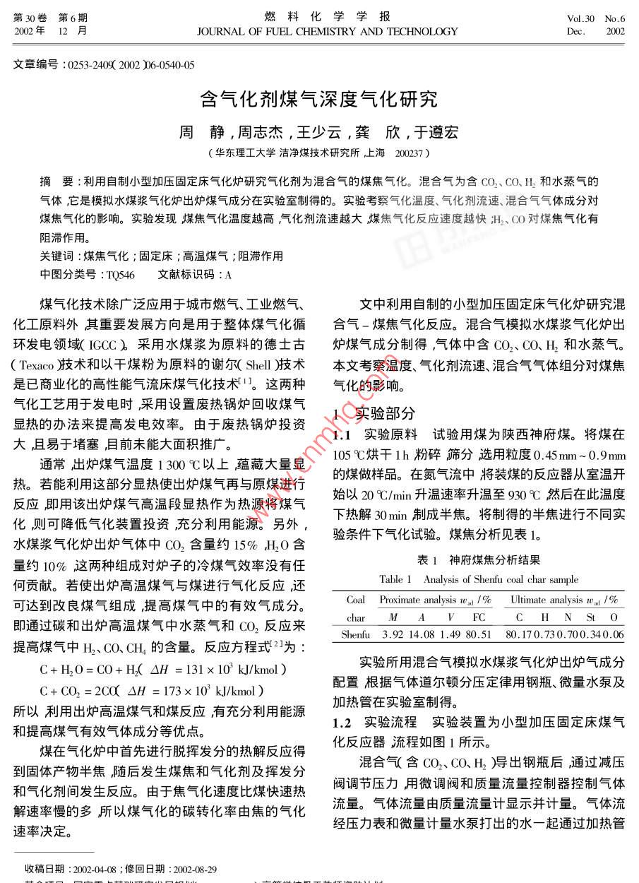第30卷第6期燃料化學(xué)學(xué)報(bào)Vol.30 No.62002年12 月JOURNAL OF FUEL CHEMISTRY AND TBCHNOLOGYDec.2002文章編號(hào):0253-2409 2002 )06-0540-05含氣化劑煤氣深度氣化研究周靜,周志杰,王少云,龔欣,于遵宏(華東理工大學(xué)潔凈煤技術(shù)研究所上海200237 )摘要:利用自制小型加壓固定 床氣化爐研究氣化劑為混合氣的煤焦氣化?;旌蠚鉃楹珻O、Co、H和水蒸氣的氣體,它是模擬水煤漿氣化爐出爐煤氣成分在實(shí)驗(yàn)室制得的。實(shí)驗(yàn)考察氣化溫度、氣化劑流速、混合氣氣體成分對(duì)煤焦氣化的影響。實(shí)驗(yàn)發(fā)現(xiàn)煤焦氣化溫度越高氣化劑流速越大煤焦氣化反應(yīng)速度越快;H、co對(duì)煤焦氣化有阻滯作用。關(guān)鍵詞:煤焦氣化;固定床;高溫煤氣;阻滯作用中圖分類號(hào):TQ546文獻(xiàn)標(biāo)識(shí)碼:A .煤氣化技術(shù)除廣泛應(yīng)用于城市燃?xì)夤I(yè)燃?xì)?、文中利用自制的小型加壓固定床氣化爐研究混化工原料外其重要發(fā)展方向是用于整體煤氣化循合氣-煤焦氣化反應(yīng)?;旌蠚饽M水煤漿氣化爐出環(huán)發(fā)電領(lǐng)域( ICCC)采用水煤漿為原料的德士古爐煤氣成分制得,氣體中含CO2、CO、H2和水蒸氣。( Texaco )技術(shù)和以干煤粉為原料的謝爾( Shell )技術(shù)本文考察溫度、氣化劑流速、混合氣氣體組分對(duì)煤焦是已商業(yè)化的高性能氣流床煤氣化技術(shù)"。這兩種氣化的影響。氣化工藝用于發(fā)電時(shí),采用設(shè)置廢熱鍋爐回收煤氣1實(shí)驗(yàn)部分顯熱的辦法來(lái)提高發(fā)電效率。由于廢熱鍋爐投資1.1 實(shí)驗(yàn)原料試驗(yàn)用煤為陜西神府煤。將煤在大,且易于堵塞,目 前未能大面積推廣。通常出爐煤氣溫度1300C以上蘊(yùn)藏大量顯105 C烘干1h粉碎篩分選用粒度0.45 mm~ 0.9mm熱。若能利用這部分顯熱使出爐煤氣再與原煤進(jìn)行的煤做樣品。在氮?dú)饬髦袑⒀b煤的反應(yīng)器從室溫開反應(yīng),即用該出爐煤氣高溫段顯熱作為熱源將煤氣始以20 C/min升溫速率升溫至930 C然后在此溫度化,則可降低氣化裝置投資充分利用能源。另外,下熱解30min制成半焦。將制得的半焦進(jìn)行不同實(shí)水煤漿氣化爐出爐氣體中CO2含量約15% ,H2O 含驗(yàn)條件下氣化試驗(yàn)。煤焦分析見表1。量約10%這兩種組成對(duì)爐子的冷煤氣效率沒有任表1神府煤焦分析結(jié)果Table 1 Analysis of Shenfu coal char sample何貢獻(xiàn)。若使出爐高溫煤氣與煤進(jìn)行氣化反應(yīng),還可達(dá)到改良煤氣組成提高煤氣中的有效氣成分。Coal Proximate analysis wa 1%Ultimate analysis wwl 1%charM.AVFCC HNSt 0即通過碳和出爐高溫煤氣中水蒸氣和CO2反應(yīng)來(lái)Shenfu 3.92 14.08 1.49 80.51 80. 170.730.700.340.06提高煤氣中H2、CO、CH4的含量。反應(yīng)方程式2為:實(shí)驗(yàn)所用混合氣模擬水煤漿氣化爐出爐氣成分C+H20=CO+H(△H = 131x 10 kJ/kmol )配置根據(jù)氣體道爾頓分壓定律用鋼瓶、微量水泵及C+ CO2=2C0( OH = 173x 10 kJ/kmol )所以利用出爐高溫煤氣和煤反應(yīng),有充分利用能源加熱管在實(shí)驗(yàn)室制得。1.2 實(shí)驗(yàn)流程 實(shí)驗(yàn)裝置為小型加壓固定床煤氣和提高煤氣有效氣體成分等優(yōu)點(diǎn)。煤在氣化爐中首先進(jìn)行脫揮發(fā)分的熱解反應(yīng)得化反應(yīng)器流程如圖1所示。到固體產(chǎn)物半焦,隨后發(fā)生煤焦和氣化劑及揮發(fā)分混合氣(含CO2、CO、H2 )導(dǎo)出鋼瓶后通過減壓和氣化劑間發(fā)生反應(yīng)。由于焦氣化速度比煤快速熱閥調(diào)節(jié)壓力用微調(diào)閥和質(zhì)量流量控制器控制氣體解速率慢的多所以煤氣化的碳轉(zhuǎn)化率由焦的氣化流量。氣體流量由質(zhì)量流量計(jì)顯示并計(jì)量。氣體流經(jīng)壓力表和微量計(jì)量水泵打出的水一起通過加熱管速率決定。收稿日期: 2002-04-08 ;修回日期:2002-08-296期周靜等:含氣化劑煤氣深度氣化研究5416工化如圖2所示。將煤焦炭轉(zhuǎn)化率對(duì)時(shí)間求導(dǎo),可得上系353到煤焦氣化反應(yīng)速率圖3。- witcr 100g0.8vent←130.614/(3圖1實(shí)驗(yàn)流程圖Figure 1 Schematic diagram of coal gasification apparatus0020 406080100120 1401- -gas cylinder ; 2- pressure regulator ; 3- -mass flow control-Time 1/minler ;4 ,15- -flow regulating valve; 5 ,J12- pressure meter ; 6一圖2不同溫度下煤焦氣化碳轉(zhuǎn)化率與氣化時(shí)間的關(guān)系preheater; 7- reactor ; 8- -heater and temperature controller ;Figure 2 Carbon conversion fraction versus time for9- -thermocouples ; 10- -water pump;11- dryer ;13- -gas chro-matography ; 14- -soap film metergaifcation of Shenfu coal char(1)1002 C ;(2)967 C ;(3)783 C將水氣化成水蒸氣并加熱氣體。水蒸氣與混合氣(含CO2、CO、H2 )-起進(jìn)入反應(yīng)器和煤焦發(fā)生氣化管160反應(yīng)。反應(yīng)后的氣體從反應(yīng)器的底部導(dǎo)出通過干燥器除去氣體中的水分再經(jīng)過穩(wěn)壓調(diào)節(jié)器和出口與12調(diào)節(jié)閥,計(jì)量后排空。用氣相色譜儀分析出口氣體8的組成。1.3結(jié)果計(jì)算試驗(yàn)結(jié)果用碳轉(zhuǎn)化率表示。, [(yo∞+ yo, + ya, )V(Y'+ y'a, )Vo H'%一2040.60.80100120r =-22.4x WxCTime t/ min273x 12x273+t圖3不同溫度下煤焦氣化反應(yīng)速率與時(shí)間的關(guān)系Figure 3 Carbon reaction rate versus time for式中:x-碳轉(zhuǎn)化率;n- -煤焦量g;c-煤焦gasification of Shenfu coal char中元素碳含量,% iy一反應(yīng)器出口氣體組分