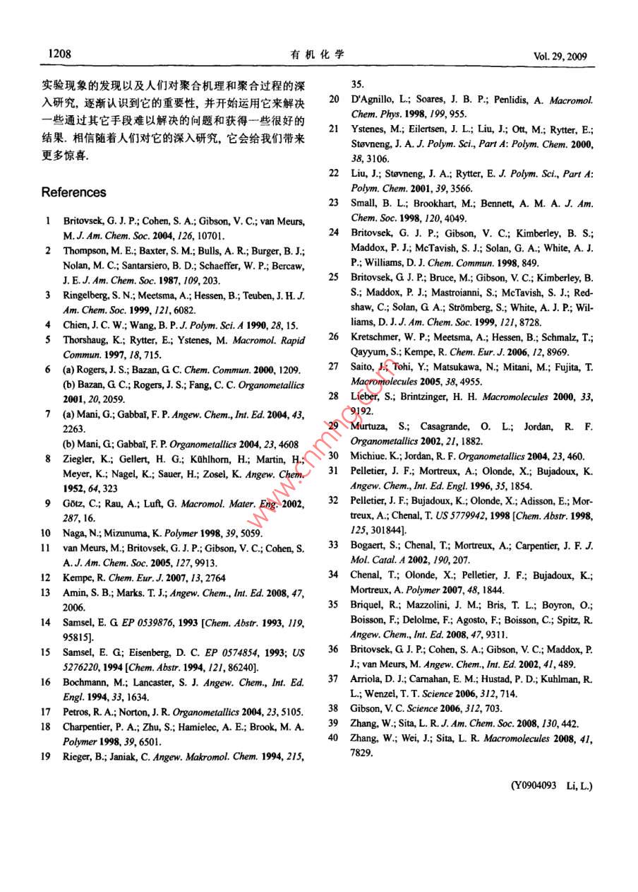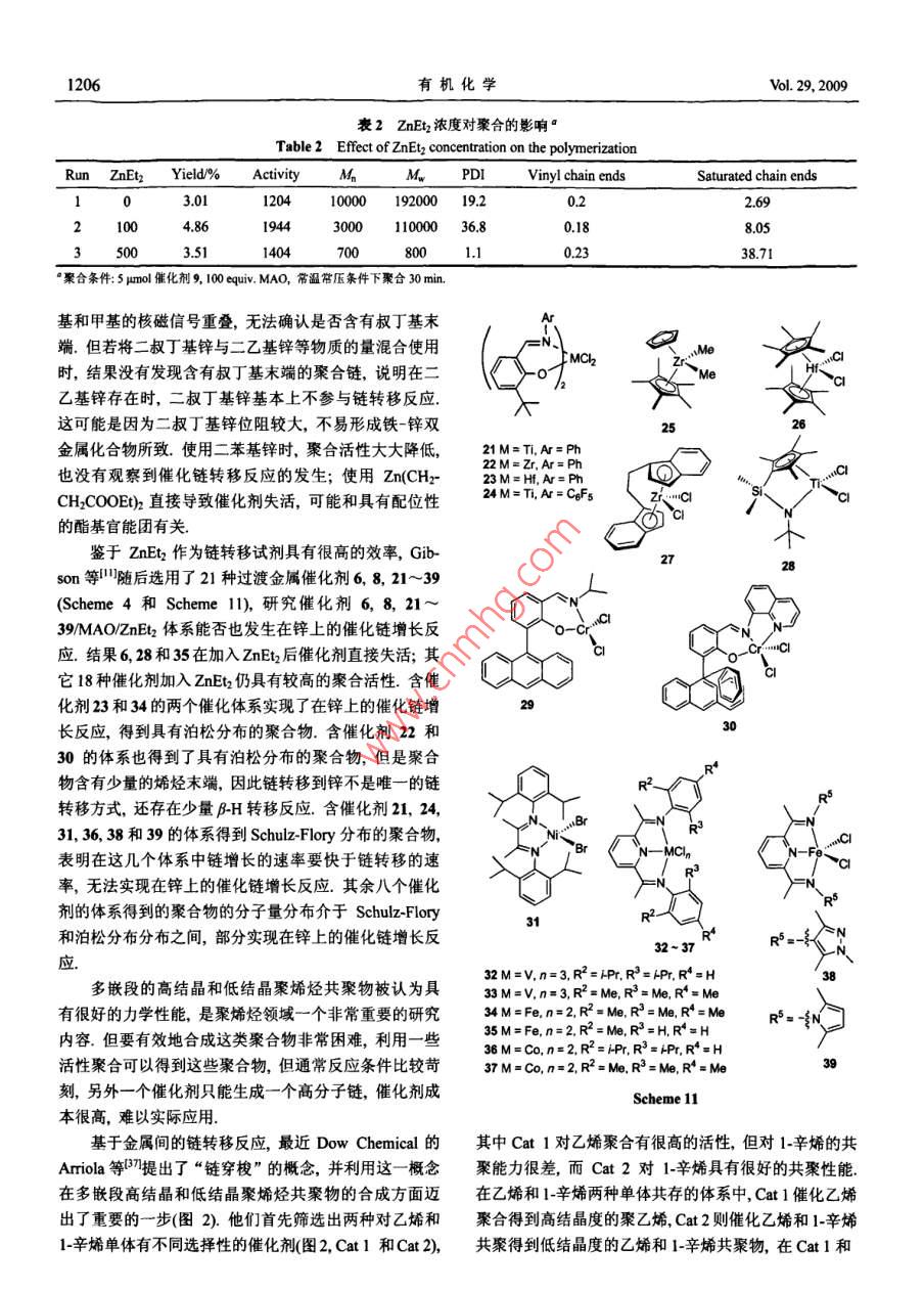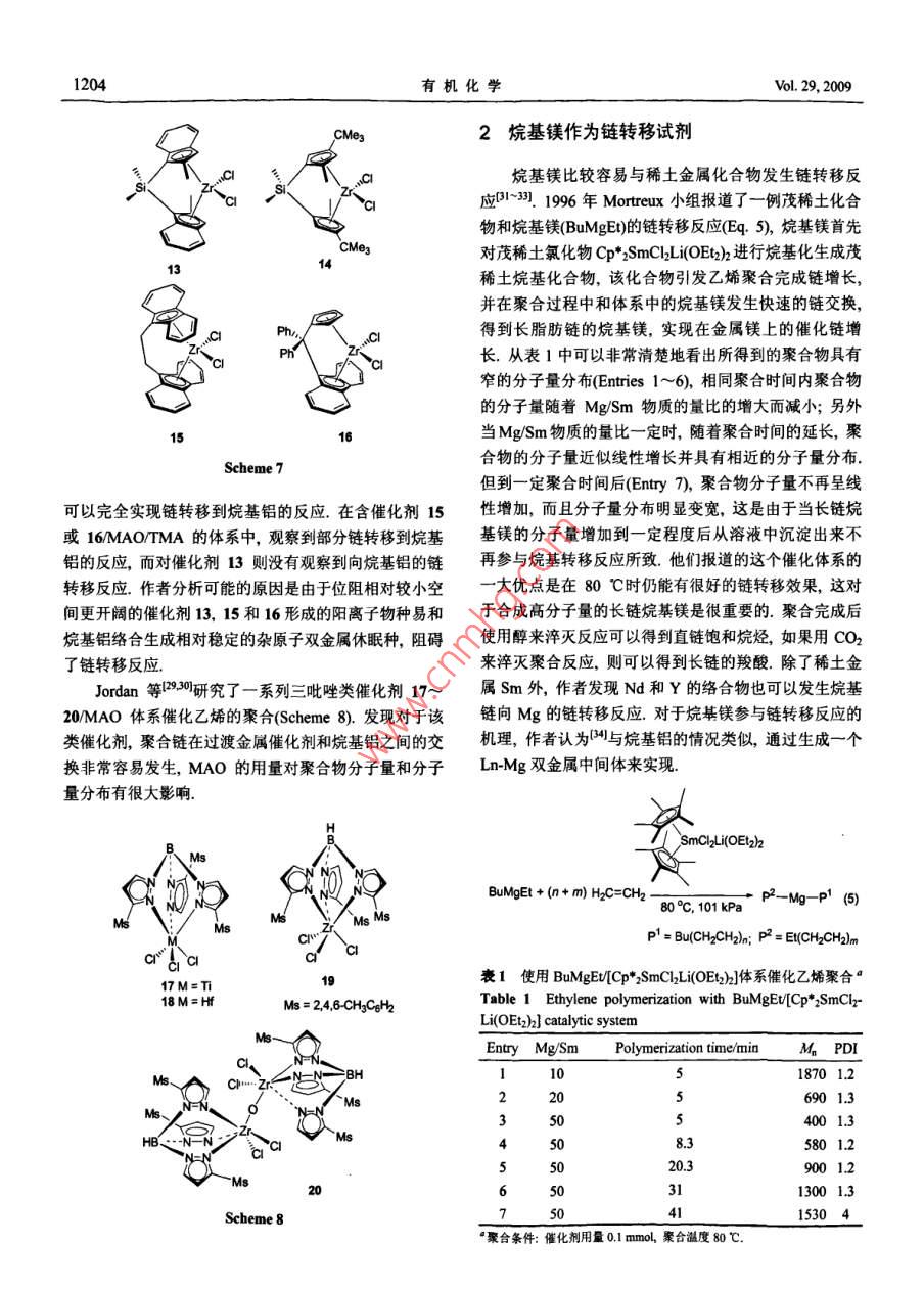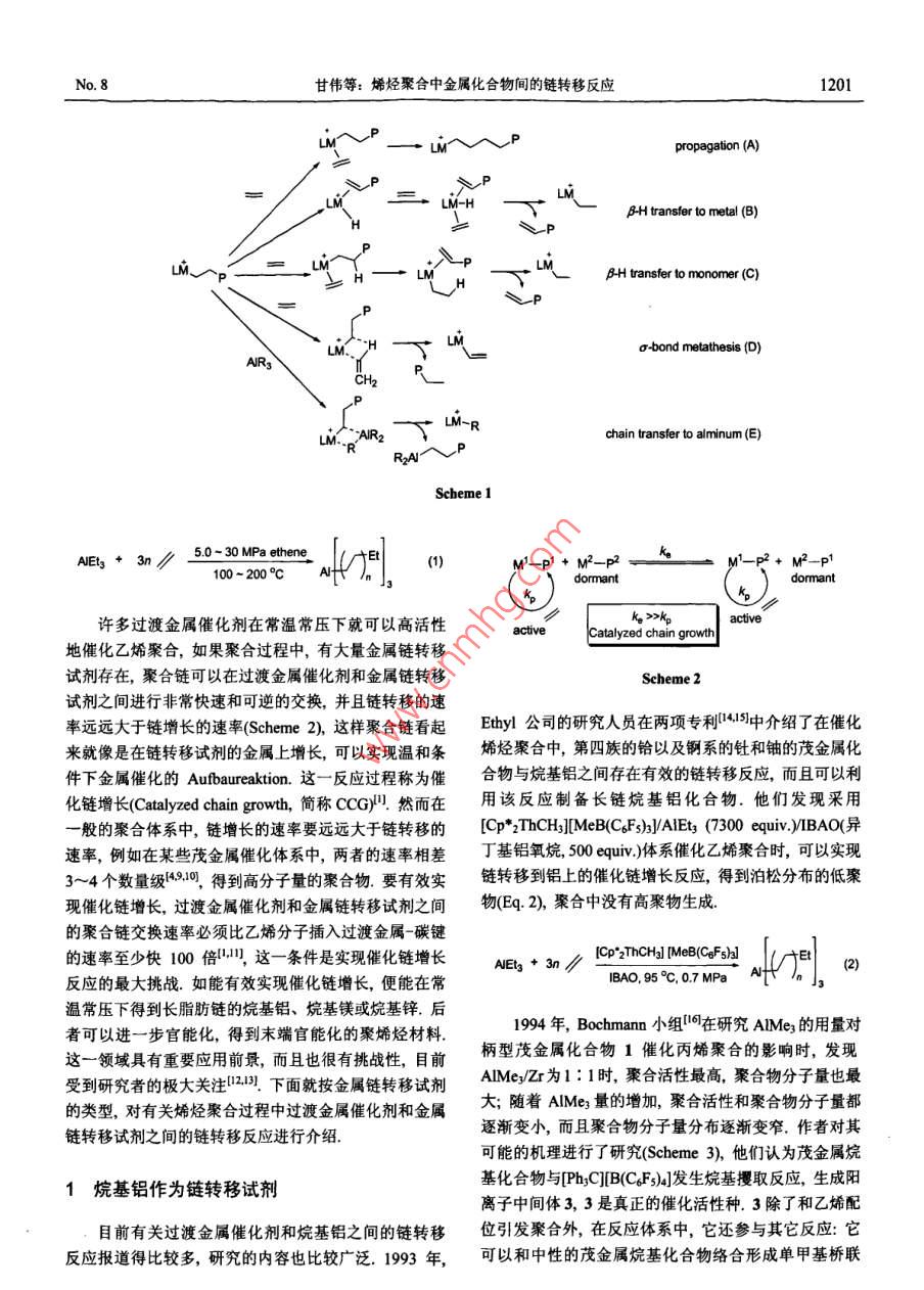 2009年第29卷有機(jī)化學(xué)Vol. 29, 2009第8期, 1200~ 1208Chinese Jounal of Organic CbemistryNo. 8, 1200~ 1208●綜述與進(jìn)展●烯烴聚合中金屬化合物間的鏈轉(zhuǎn)移反應(yīng)甘偉∞b聶萬(wàn)麗*陳耀峰*.b(°西北大學(xué)化學(xué)與材料學(xué)院西安710069)(°中國(guó)科學(xué)院上海有機(jī)化學(xué)研究所金屬有機(jī)化學(xué)國(guó)家重點(diǎn)實(shí)驗(yàn)室上海 200032)情要烯烴聚合過(guò)程中,金屬化合物之間快速可逆的鏈轉(zhuǎn)移反應(yīng)是-一個(gè)重要和有用的反應(yīng),它不僅影響催化劑的活性和實(shí)現(xiàn)對(duì)聚合物分子量的控制,還可以得到長(zhǎng)鏈烷基金屬化合物,進(jìn)而通過(guò)后續(xù)轉(zhuǎn)化得到特種聚烯烴材料,如官能團(tuán)化聚烯烴和多嵌段聚烯烴共聚物.綜述了這一方面的主要發(fā)展情況.關(guān)鍵詞金屬化合物; 鏈轉(zhuǎn)移;烯烴聚合Chain Transfer Reaction between Metal Complexes inOlefin PolymerizationGan, WeigbNie, Wanli*= Chen, Yaofeng*b(° School Chemistry & Material Science, Northwest University, Xi'an 710069)(° State Key Laboratory of Organomelallic Chemistry, Shanghai Istitute of Organic Chemistry,Chinese Academy of Sciences, Shanghai 200032)Abstract During olefin polymerization process, a rapid and reversible chain transfer reaction between themetal complexes is of great importance. This reaction not only affects the activity of the catalytic system andthe molecular weight of the polymer but also provides the metal complex with long alkyl chain, which canbe used in the preparation of some high quality polyolefins, such as functionalized polyolefins and olefinmultiblock copolymers. This review describes the major advances in this field.Keywords metal complex; chain transfer; olefin polymerization小分子的乙烯通過(guò)配位聚合可以得到高分子量的烷基鋁幾乎能與所有類型的過(guò)渡金屬烯烴聚合催化劑聚乙烯.在其配位聚合過(guò)程中涉及多個(gè)基元反應(yīng):鏈引發(fā)生鏈轉(zhuǎn)移反應(yīng),例如前過(guò)渡金屬的鈦、鋯、鉿和鉻167),發(fā)、鏈增長(zhǎng)、鏈轉(zhuǎn)移和鏈終止"(Scheme 1).鏈增長(zhǎng)和鏈后過(guò)渡金屬的鐵,以及鑭系和鋼系金屬等.除了烷基鋁轉(zhuǎn)移是一對(duì)競(jìng)爭(zhēng)反應(yīng),兩者的速率影響著產(chǎn)物的分子外,烷基鎂和烷基鋅等也能作為金屬鏈轉(zhuǎn)移試劑,與過(guò)量.在烯烴聚合過(guò)程中, -H轉(zhuǎn)移是常見(jiàn)的鏈轉(zhuǎn)移方式,渡金屬烯烴聚合催化劑發(fā)生鏈轉(zhuǎn)移反應(yīng).它包括B-H轉(zhuǎn)移到中心金屬(B)和B-H轉(zhuǎn)移到單體(C)兩20世紀(jì)50年代,Ziegler 等8報(bào)道了這樣-一個(gè)反應(yīng)種類型,這些鏈轉(zhuǎn)移產(chǎn)生烯烴封端的聚烯烴鏈.通常情(他稱之為Aufbaureation). 這一反應(yīng)是在高溫高壓下,況下,鏈轉(zhuǎn)移到烷基鋁(E)是伴隨著β-H轉(zhuǎn)移的一個(gè)副烷基鋁引發(fā)乙烯分子低聚,乙烯分子連續(xù)插入到AI- C反應(yīng).另外一種不常見(jiàn)的鏈轉(zhuǎn)移方式是σ鍵易位機(jī)理鍵,完成鏈增長(zhǎng)得到長(zhǎng)脂肪鏈鋁化合物(Eq.1). 該反應(yīng)(D),在一些前過(guò)渡金屬催化體系中有所發(fā)生231.烷基在工業(yè)上用于從乙烯合成線性的a-聚烯烴以及長(zhǎng)脂肪鋁作為烯烴聚合反應(yīng)一種常用的助催化劑,關(guān)于過(guò)渡金鏈伯醇.然而該反應(yīng)在高溫高壓下進(jìn)行使得設(shè)備投資巨屬催化劑與烷基鋁之間的鏈轉(zhuǎn)移反應(yīng)很早就有報(bào)道(4.].大,另外也存在安全問(wèn)題.●E-mail: niewl126@126.com; yaofchen@mailsocac.cnReceived April 9, 2009; revised and aceped May 25, 2009..No. 8甘偉等:烯烴聚合中金屬化合物間的鏈轉(zhuǎn)移反應(yīng)1201Lim 一Ppropagation (A)=BH transfer to metal (B)i一p=_ LMBH transfer to monomer (C)LM.σ-bond metathesis (向)AIR3 ^iMARz。 pchain transfer to alminum(E)RzANScheme 1。AEs+ 3n/ 5.0-30MPathene(1M'-p1+ M2-p2M-p2+ M-p1100 - 200°C :dormantdomant許多過(guò)渡金屬催化劑在常溫常壓下就可以高活性activek。>>kpCatalyzed chain growth地催化乙烯聚合,如果聚合過(guò)程中,有大量金屬鏈轉(zhuǎn)移試劑存在,聚合鏈可以在過(guò)渡金屬催化劑和金屬鏈轉(zhuǎn)移Scheme2試劑之間進(jìn)行非??焖俸涂赡娴慕粨Q,并且鏈轉(zhuǎn)移的速率遠(yuǎn)遠(yuǎn)大于鏈增長(zhǎng)的速率(Scheme 2), 這樣聚合鏈看起Ethyl公司的研究人員在兩項(xiàng)專利1[4.15]中介紹了在催化來(lái)就像是在鏈轉(zhuǎn)移試劑的金屬上增長(zhǎng),可以實(shí)現(xiàn)溫和條烯烴聚合中,第四族的鉿以及錒系的釷和鈾的茂金屬化件下金屬催化的Aufbaureaktion. 這- -反應(yīng)過(guò)程稱為催合物與烷基鋁之間存在有效的鏈轉(zhuǎn)移反應(yīng),而且可以利化鏈增長(zhǎng)(Catalyzed chain growth,簡(jiǎn)稱CCG)"然而在用該反應(yīng)制備長(zhǎng)鏈烷基鋁化合物.他們發(fā)現(xiàn)采用一般的聚合體系中, 鏈增長(zhǎng)的速率要遠(yuǎn)遠(yuǎn)大于鏈轉(zhuǎn)移的[Cp*2ThCHJ][MeB(CF>)3/AlEty (7300 equiv.)/IBAO(異速率,例如在某些茂金屬催化體系中,兩者的速率相差丁基鋁氧烷, 500 equiv,)體系催化乙烯聚合時(shí),可以實(shí)現(xiàn)3~4個(gè)數(shù)量級(jí)149.10,得到高分子量的聚合物.要有效實(shí)鏈轉(zhuǎn)移到鋁上的催化鏈增長(zhǎng)反應(yīng),得到泊松分布的低聚現(xiàn)催化鏈增長(zhǎng),過(guò)渡金屬催化劑和金屬鏈轉(zhuǎn)移試劑之間物(Eq. 2),聚合中沒(méi)有高聚物生成.的聚合鏈交換速率必