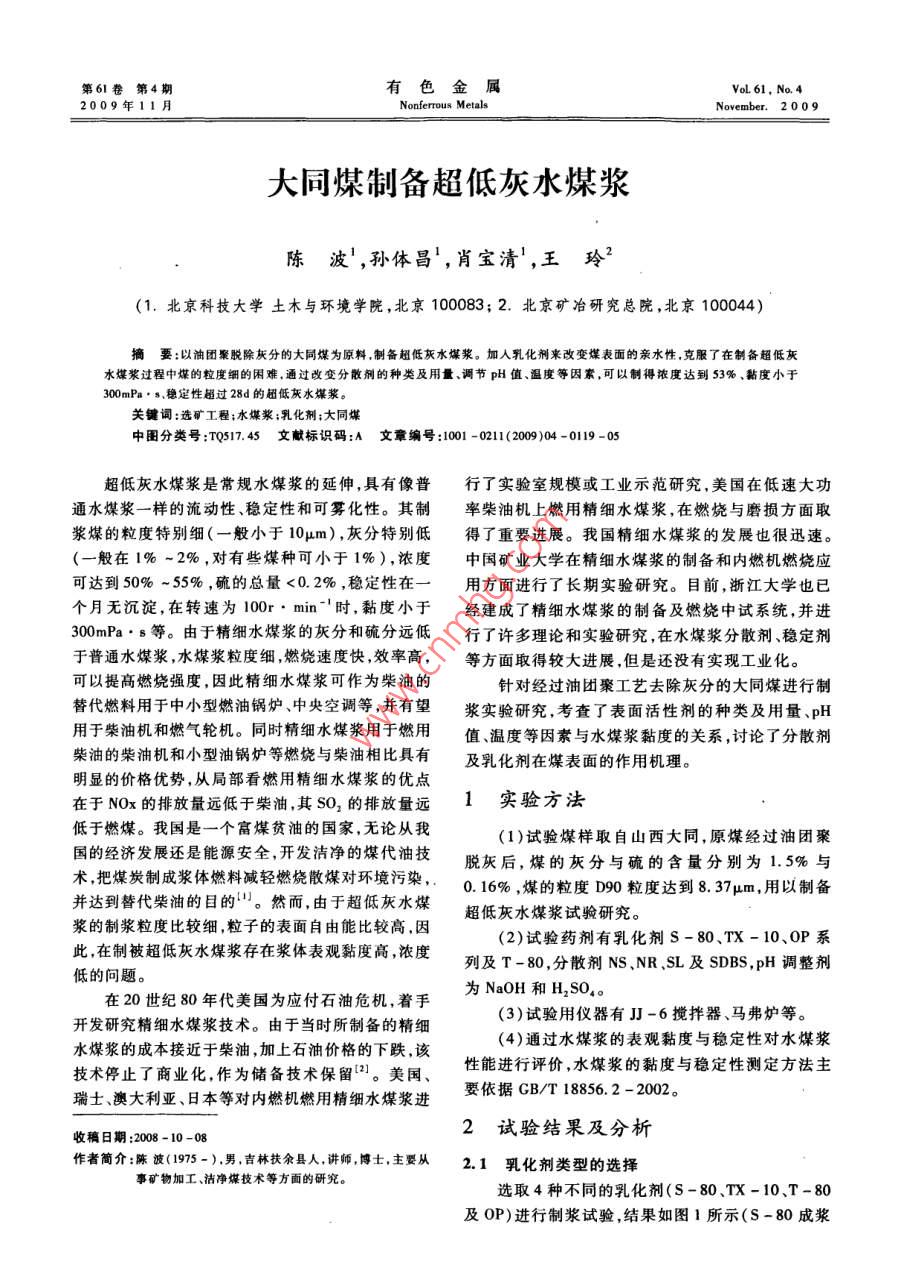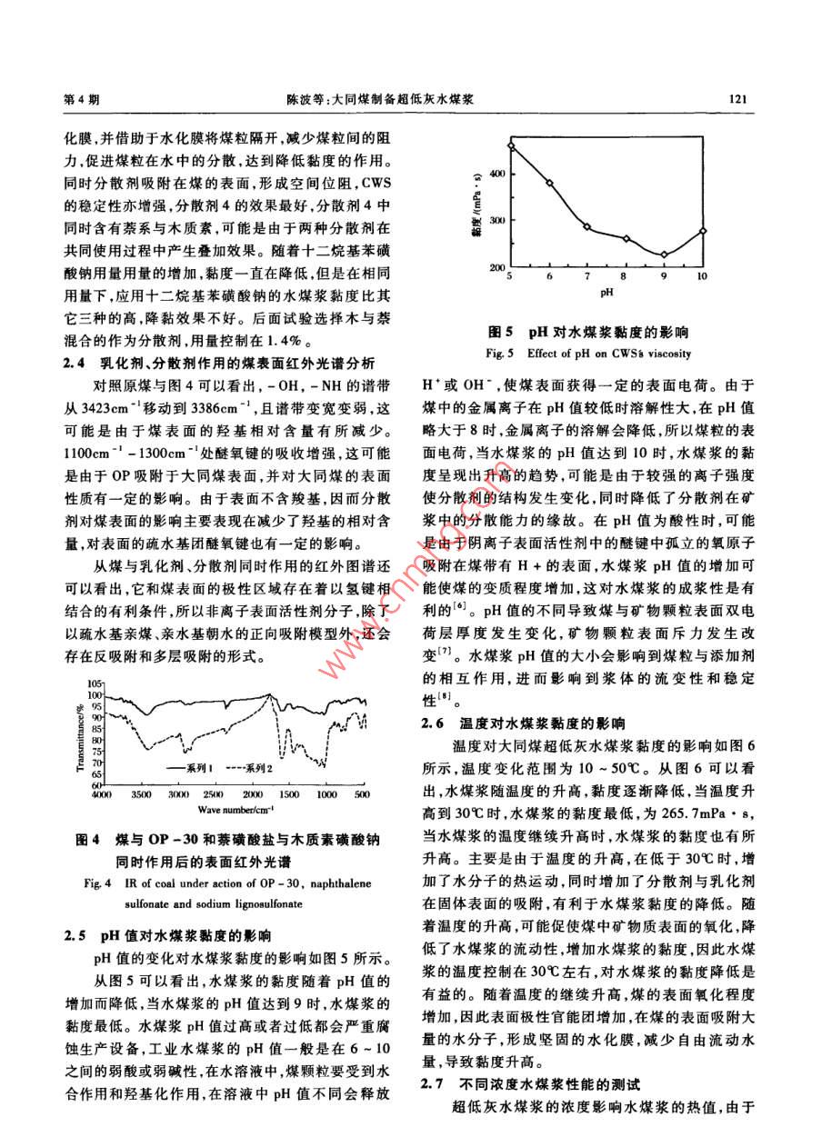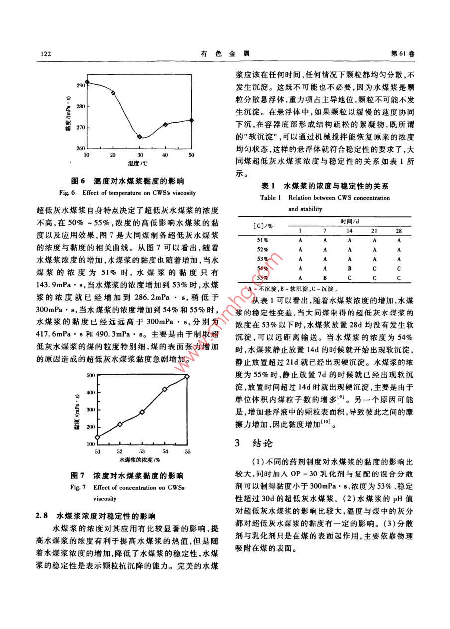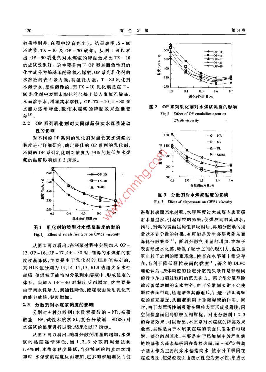 第6|卷第4期有色金屬VoL 61, No 42009年11月Nonferrous MetalsNovember. 2009大同煤制備超低灰水煤漿陳波',孫體昌,肖寶清',王玲2(1.北京科技大學土木與環(huán)境學院,北京100083;2.北京礦冶研究總院,北京100044)摘要:以油團聚脫除灰分的大同煤為原料,制備超低灰水煤漿。加入乳化劑來改變煤表面的親水性,克服了在制備超低灰水煤漿過程中煤的粒度細的困難,通過改變分散劑的種類及用量、調節(jié)pH值、溫度等因素,可以制得濃度達到53%、黏度小于300mPa·s穩(wěn)定性超過28d的超低灰水煤漿。關鍵詞:選礦工程;水煤漿;乳化劑;大同煤中圖分類號:TQ51745文獻標識碼:A文章編號:1001-0211(2009)04-0119-05超低灰水煤漿是常規(guī)水煤漿的延伸,具有像普行了實驗室規(guī)模或工業(yè)示范研究,美國在低速大功通水煤漿一樣的流動性、穩(wěn)定性和可霧化性。其制率柴油機上燃用精細水煤漿,在燃燒與磨損方面取漿煤的粒度特別細(一般小于10μm),灰分特別低得了重要進展。我國精細水煤漿的發(fā)展也很迅速。(一般在1%~2%,對有些煤種可小于1%),濃度中國礦業(yè)大學在精細水煤漿的制備和內燃機燃燒應可達到50%~55%,硫的總量<0.2%,穩(wěn)定性在一用方面進行了長期實驗研究。目前,浙江大學也個月無沉淀,在轉速為100·min"時,黏度小于經建成了精細水煤漿的制備及燃燒中試系統,并進300mPa·s等。由于精細水煤漿的灰分和硫分遠低行了許多理論和實驗研究在水煤漿分散劑、穩(wěn)定劑于普通水煤漿水煤漿粒度細,燃燒速度快效率高,等方面取得較大進展,但是還沒有實現工業(yè)化可以提高燃燒強度,因此精細水煤漿可作為柴油的針對經過油團聚工藝去除灰分的大同煤進行制替代燃料用于中小型燃油鍋爐、中央空調等,并有望漿實驗研究,考查了表面活性劑的種類及用量、pH用于柴油機和燃氣輪機。同時精細水煤漿用于燃用值、溫度等因素與水煤漿黏度的關系,討論了分散劑柴油的柴油機和小型油鍋爐等燃燒與柴油相比具有及乳化劑在煤表面的作用機理。明顯的價格優(yōu)勢,從局部看燃用精細水煤漿的優(yōu)點在于NOx的排放量遠低于柴油其SO2的排放量遠1實驗方法低于燃煤。我國是一個富煤貧油的國家,無論從我(1)試驗煤樣取自山西大同,原煤經過油團聚國的經濟發(fā)展還是能源安全開發(fā)潔凈的煤代油技脫灰后,煤的灰分與硫的含量分別為1.5%與術,把煤炭制成漿體燃料減輕燃燒散煤對環(huán)境污染,0.16%,煤的粒度D90粒度達到8.37μm,用以制備并達到替代柴油的目的。然而,由于超低灰水煤漿的制漿粒度比較細,粒子的表面自由能比較高,因超低灰水煤漿試驗研究。(2)試驗藥劑有乳化劑S-80、TX-10、OP系此在制被超低灰水煤漿存在漿體表觀黏度高濃度列及T-80,分散劑NS、NR,SL及SDBs,pH調整劑低的問題。在20世紀80年代美國為應付石油危機,著手為NaOH和H2SO4。開發(fā)研究精細水煤漿技術。由于當時所制備的精細(3)試驗用儀器有JJ-6攪拌器、馬弗爐等。水煤漿的成本接近于柴油,加上石油價格的下跌,該(4)通過水煤漿的表觀黏度與穩(wěn)定性對水煤漿技術停止了商業(yè)化,作為儲備技術保留。美國、性能進行評價,水煤漿的黏度與穩(wěn)定性測定方法主瑞士、澳大利亞、日本等對內燃機燃用精細水煤漿進要依據GBT18856.2-2002收稿日期:2008-10-082試驗結果及分析作者簡介:陳波(1975-)男,吉林扶余縣人,講師博士,主要從2.1乳化劑類型的選擇事礦物加工、潔凈煤技術等方面的研究選取4種不同的乳化劑(S-80、TX-10、T-8及OP)進行制漿試驗,結果如圖1所示(S-80成漿120有色金屬第6卷效果特別差,在圖中沒有列出)。結果表明,S-80不成漿,TX-10及OP-30成漿。從圖1可以看oP-12出,OP-30乳化劑對水煤漿的降黏效果比TX-10的成漿效果好。這主要是由于OP型表面活性劑的化學成分為烷基苯酚聚氧乙烯醚,OP系列乳化劑的水溶液的表面張力低,潤濕能力強。T-80乳化劑不溶于水,是油溶性的,而TX-10乳化劑是在T一0480乳化劑中表面未酯化的羥基上接入聚氧乙烯基乳化劑的用量席從而溶于水,增加其水溶性。OP、TX-10、T-80親水能力逐漸降低,致使水煤漿的降黏效果逐漸變圖2OP系列乳化劑對水煤漿黏度的影響差Fig 2 Effect of OP emulsifier agent on2.2oP系列乳化劑對大同煤超低灰水煤漿流動WSs viscosity性的影響對不同的OP系列的乳化劑對超低灰水煤漿的-o- NR黏度進行詳細研究,確定最佳的OP系列的乳化劑,不同的OP系列乳化劑對濃度為53%的超低灰水煤X--SDBS漿的黏度影響如圖2所示◆OP30TX-1014L6分散劑的用量鸕圖3分散劑對水煤漿黏度的影響Fig. 3 Effect of dispersants on CWSs viscosity得煤粒表面親水過強、水膜厚度過大或煤內表面吸乳化劑的用量隔附水量過多,引起煤粒的膨脹,使煤粒間的流動水圖1乳化劑的類型對水煤漿黏度的影響同時,當煤的表面達到飽和吸附后,再加分散劑的用Fig 1. Effect of emulsifier type on CWSs viscosity量達不到分散的效果,有可能是發(fā)生多層吸附從而降低分散效果。隨著分散劑用量的增加,在粒子從圖2可以看出,在制漿過程中分別加入OP12,OP-16,OP-17,OP-30時,制得的水煤漿的黏表面形成水化膜降低了粒子之間的吸引力,也就是度逐漸降低,主要是由于乳化劑的HLB值決定的,阻止粒子之間的團聚現象,使其在水溶液中穩(wěn)定存其HLB值分別為13,14,15,17,HLB值越大親水性在,有利于降低顆粒表面的黏度,著名的DLvo越強,使煤粒子能均勻分散到水溶液中,
