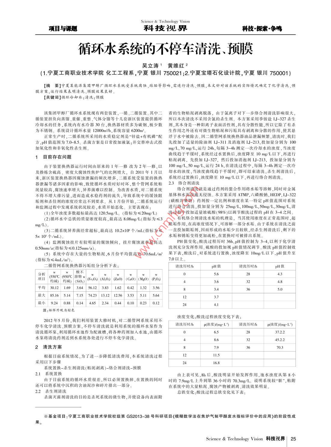 項目與課題科技視界科技*探索爭鳴循環(huán)水系統(tǒng)的不停車清洗、預膜吳立濤1黃維紅2(1.寧夏工商職業(yè)技術學院化工工程系,寧夏銀川750021;2.寧夏寶塔石化設計院,寧夏銀川750001)[摘要]寧夏某能源集團甲醇廠循環(huán)水系統(tǒng)受系統(tǒng)腐蝕、結垢等影響,需進行清洗、預膜,本文針對該系統(tǒng)的實際情況確定了化學清洗、預膜方案,運行結果表明清洗、預膜效果良好。[關鍵詞]循環(huán)冷卻水;清洗;預膜該集團甲醇廠循環(huán)水系統(tǒng)現(xiàn)有兩套裝置,一-循、二循裝置。其中二著 的生物粘泥剝離脫落,由于氯離子對下一步絡合劑清洗影響很大,循裝置擔負向蒸餾、重催、重整、氣體分餾等十兒套新區(qū)裝置提供循環(huán)所以 本次清洗不采用含氯的殺生劑。本方案采用季銨鹽LJ-327殺生冷卻水的任務,系統(tǒng)內(nèi)有水冷器30臺,換熱器材質(zhì)多為碳鋼.極少數(shù)劑 ,其本身是一種陽離子表面活性劑,具有分散性能,所以它除了有殺為不銹鋼。系統(tǒng)設計循環(huán)水量12000m/h, 系統(tǒng)容量6200m'.生作用之外還有對微生物粘泥和污垢具有剝離和分散的作用,使其懸正常生產(chǎn)時,二循系統(tǒng)所采用的水質(zhì)穩(wěn)定劑是“鋅鹽+有機磷"配浮于水中被除去。因二循管網(wǎng)系統(tǒng)換熱器油品泄漏頻繁,清洗時,我們方,pH值范圍為7.0-8.5. 殺菌方案是8常投加液氯;并交替沖擊式投 先投加了適量的除油劑1J-311及消泡劑1J-213.投加量分別為100加氧化性和非氧化性殺生劑。mg/L, 70 mg/L,運行24h,每隔3- -4h測定- -次冷卻水的濁度,當濁度曲線趨于平緩時,系統(tǒng)經(jīng)過水置換后,濁度降至10 mg/L以下,再進行1目前存 在問題粘泥剝離,先投加1J-327,然后投加消泡劑IJ-213,投加量分別為由于裝置換熱器運行時間由原來的1年-一修改為2年一 -修,以100mg/L. 50 mg/L,運行24 h,在清洗過程中,每隔3- 4h測定- -次冷及摻煉含硫高、密度大腐蝕性焦爐氣的比例增大,自2011年1月以卻水的濁度,當濁度曲線趨于平緩時,即可結束清洗.殺生劑清洗后,來,新區(qū)裝置換熱器因腐蝕泄漏的頻次增多,二循系統(tǒng)受裝置的換熱系統(tǒng)經(jīng)過置換后, 濁度降至10 mg/L以下,再進行絡合劑清洗。器泄漏等諸多因索的影響,致使循環(huán)水質(zhì)時好時壞,整個管網(wǎng)系統(tǒng)粘2.3絡合劑清洗泥量較高,腐蝕速率增大,異養(yǎng)菌難以控制。為改善水質(zhì),對二循系統(tǒng)絡合劑清洗就是通過藥劑的整合作用將水垢等溶解,同時對金屬不得不增大排污量,進而造成水穩(wěn)藥劑的流失,導致系統(tǒng)中的緩蝕阻基體 和水泥設施無侵蝕。本方案采用ATMP,六磷酸鈉,HEDP, 1J-322垢劑和殺佳劑的濃度經(jīng)常達不到要求。從1月份開始,二循系統(tǒng)運行(磺酸共聚物) 藥劑按一定比例和濃度在某-特定pH值范圍對系統(tǒng)和監(jiān)測過程中發(fā)現(xiàn)系統(tǒng)狀況較差,水質(zhì)開始惡化。主要表現(xiàn)在:進行絡合清洗.投加量分別為25mg/L, 100ng/L, 50ng/L, 30mg/L,清(1)全年濁度多數(shù)超標最高達120.5mg/L。 (指標為≤20mg/L)洗過程中投加適量濃硫酸(98%)以調(diào)節(jié)酸洗過程的pH在3- 4之間。(2)循環(huán)水中總鐵的質(zhì)量濃度較高,最高達8.08mg/L(指標為≤3有機絡合劑清洗水垢的機理是,當其使用濃度在正常范圍時,起mg/L阻垢作用,在高濃度情況下,可溶解一- 部分水垢。由于系統(tǒng)在清洗之前(3)二循系統(tǒng)異 養(yǎng)菌經(jīng)常超標.最高達10.2x10 個/mL(指標為≤一 直投加阻垢劑,因而形成的水垢少且較軟,經(jīng)殺生劑清洗后,剩下的5x 10*個/mL)(4)監(jiān)測腐蝕掛片有較明顯的腐蝕傾向,掛片腐蝕速率最高達PH值變化:酸洗過程歷時36h,pH值控制為3-4,以利于化學清0.50mm/a(指標為≤0.125mm/a)。洗劑充分發(fā)揮作用。硫酸的投加視pH值情況調(diào)節(jié)。酸洗pH值控制效(5) 系統(tǒng)中存在大量的生物粘泥,6月份平均值高達70.6mL/mt 果下表,酸洗后,對系統(tǒng)進行置換.濁度降至10mg/L以下,pH值升至(指標為≤4mL/ml)7.0以上二循管網(wǎng)系統(tǒng)換熱器污垢組分分析下表:清洗歷時/兒pH清洗歷時小.pH值析5.624.3目(S5O0 (950資物w(FeO) (A.O3| (Zn0) |(Cao)(MgO)| PO3平均30.12| 1.69 3.64 56.121.32 3.563.45.0最大| 85.16 5.14| 7.15| 74.23 | 13.12| 12.56 3.53 5.11| 5.6最小9.24| 0.88 0.14 4.65| 2.34| 0.44 0.10 0.23 | 0.124注:垢樣外現(xiàn)為棕色2012年5月份,我們利用裝置大修時機,對二循管網(wǎng)系統(tǒng)采用不濁度變化:酸洗過程濁度變化下表:停車化學清洗預膜方案,不停車清洗就是利用系統(tǒng)的循環(huán)水泵作為清洗歷時/hp(獨度)(mg+L)清 洗歷時/hp(獨度/(mg.1)清洗循環(huán)泵,利用循環(huán)水池作為配液槽,將各種藥劑加人水池,由循環(huán)6.52:37.2.2水泵將清洗藥劑送到水系統(tǒng)各處進行不停車化學清洗。45.2.22清洗方案7.9370.3根據(jù)目前系統(tǒng)情況.為了進一步降低清洗費用,本系統(tǒng)清洗過程1.5采用以下步驟16.8系統(tǒng)置換-殺生劑清洗(粘泥剝離)-絡合劑清洗-預膜由于目前系統(tǒng)的循環(huán)水質(zhì)很差,所以必須置換掉,在置換的同時由上表可見,8h后,酸洗明顯開始發(fā)揮作用,池水濁度從第8小時的7.9mg/L上升到第36小時的70.3mg/L。說明系統(tǒng)較“臟”,粘附還可以將系統(tǒng)中沉積的含油泥沙和碎片排出一部分。在系統(tǒng)中的大量粘泥腐蝕產(chǎn)物被剝離、清洗效果明顯。2.2殺生