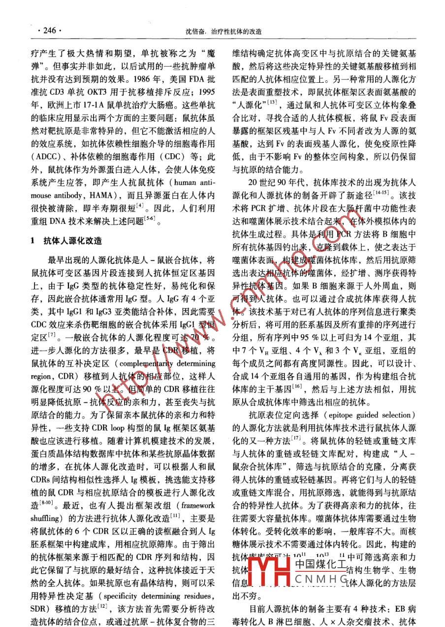 學(xué)分子生物學(xué)雜志,2006,3(4):245249 J Med Mol Biol,2006,3(4):245-249院士述評治療性抗體的改造沈倍奮軍事醫(yī)學(xué)科學(xué)院基礎(chǔ)醫(yī)學(xué)研究所北京市,100850沈倍奮,中國工程院院士,軍事醫(yī)學(xué)科學(xué)院基礎(chǔ)醫(yī)學(xué)研究所研究員,博士生導(dǎo)師。中國人民解放軍分子免疫學(xué)重點實驗室主任?,F(xiàn)任中華醫(yī)學(xué)會副會長,中國發(fā)明家學(xué)會副理事長。從事單克隆抗體和基因工程抗體的研究和應(yīng)用多年,近年來與不同學(xué)科的專家合作致力于基于抗原一抗體相互作用的立體結(jié)構(gòu)信息設(shè)計新功能分子的研究。在國內(nèi)外學(xué)術(shù)期刊上發(fā)表論文200余篇,主編專著4部。【摘要】市場上已有18個被FDA批準(zhǔn)的單克隆抗體,它們用于治療如腫瘤、移植排斥、自身免疫病、病毒感染等人類疾病。治療性抗體代表了生物制藥業(yè)發(fā)展最快的領(lǐng)域之一。隨著技術(shù)的發(fā)展,各種形式的工程抗體被構(gòu)建來改善它們的特性和效能,包括:鼠抗體人源化,提高生物學(xué)活性,如親和力成熟,改進(jìn)效應(yīng)功能,改善藥代動力學(xué)。文章評述了這一領(lǐng)域的最新進(jìn)展,同時也討論了工程抗體的免疫原性和親和力【關(guān)鍵詞】單克隆抗體;治療性抗體;基因工程抗體;抗體人源化【中圖分類號】R392.116Improvement of Therapeutic AntibodiesInstitute of Basic Medical Sciences, Academy of Military Medical Sciences, Beijing, 100850,ChinaAbstract] In the market, there are eighteen monoclonal antibodies approved by the FDA. Theyhave been used to treat human disease, such as cancer, transplant rejection, autoimmudisease..&tiviral prophylaxis and so on. The therapeutic antibodies represent one of the fastest growing areas ofthe biopharmaceutical industry. With the technology development, a diversity of engineered antibodyforms have been created to improve their characterization and efficacy, including humanization ofmurine antibodies, enhancing their biological activities such as affinity maturation, improvement ofeffector functions, and altering pharmacokinetics. This review summarized recent developments inthis field, also discussed the immunogenicity and affinity of engineered antibodiesKey words] monoclonal antibody; therapeutic antibody; engineered antibody; humanized anti-bod治療性抗體是可以用來治療疾病的抗體,因此中最重要的一大類,也是世界生物工程制藥業(yè)的支也稱它們?yōu)榭贵w藥物。截至2005年5月,美國柱產(chǎn)品之一。FDA已經(jīng)批準(zhǔn)18個抗體藥物,主要用于治療腫抗體作為治療性藥物已有上百年的歷史。當(dāng)時瘤、自身免疫性疾病、病毒感染和器官移植時的排主要用抗血清進(jìn)行治療,由于其成分太復(fù)雜、多斥反應(yīng)等。同時有100多種治療性抗體正在進(jìn)行變,而且是異源蛋白,在治療時會出現(xiàn)嚴(yán)重副作臨床試驗,500多種抗體處于臨床前研究。2003~用中國煤化工世,它是一種均一2004年抗體藥物銷售增長48.1%,突破100億美性好CNMHG抗原決定簇的抗元。在以后幾年里,抗體藥物可能以更快的速度增體。1982年,Lewy制備了針對一個B淋巴瘤患者長,預(yù)計到2010年可達(dá)到300億美元2。從抗體瘤細(xì)胞的抗獨特型單克隆抗體,對該患者的治療取藥物的發(fā)展速度來看,目前它已成為生物技術(shù)藥物得很好的療效。這一結(jié)果引起了人們對單抗用于治沈倍奮.治療性抗體的改造療產(chǎn)生了極大熱情和期望,單抗被稱之為“魔維結(jié)構(gòu)確定抗體高變區(qū)中與抗原結(jié)合的關(guān)鍵氨基彈”。但事實并非如此,以后試用的一些抗腫瘤單酸,然后將這些決定特異性的關(guān)鍵氨基酸移植到相抗并沒有達(dá)到預(yù)期的效果。1986年,美國FDA批匹配的人抗體相應(yīng)位置上。另一種常用的人源化方準(zhǔn)抗CD3單抗OKT3用于抗移植排斥反應(yīng);1995法是表面重塑技術(shù),即鼠抗體框架區(qū)表面氨基酸的年,歐洲上市17-1A鼠單抗治療大腸癌。這些單抗“人源化”,通過鼠和人抗體可變區(qū)立體構(gòu)象疊的臨床應(yīng)用顯示出兩個方面的主要問題:鼠抗體雖合比對,尋找合適的人抗體模板,將鼠Fv段表面然對靶抗原是非常特異的,但它不能激活相應(yīng)的人暴露的框架區(qū)殘基中與人Fv不同者改為人源的氨的效應(yīng)系統(tǒng),如抗體依賴性細(xì)胞介導(dǎo)的細(xì)胞毒作用基酸,達(dá)到Fv的表面殘基人源化,使免疫原性降(ADCC)、補體依賴的細(xì)胞毒作用(CDC)等;此低,由于不影響Fv的整體空間構(gòu)象,所以仍保留外,鼠抗體作為外源蛋白進(jìn)入人體,會使人體免疫與抗原的結(jié)合能力。系統(tǒng)產(chǎn)生應(yīng)答,即產(chǎn)生人抗鼠抗體( human anti20世紀(jì)90年代,抗體庫技術(shù)的出現(xiàn)為抗體人mouse antibody,HAMA),而且異源蛋白在人體內(nèi)源化和人源抗體的制備開辟了新途徑41。該技很快被清除,即半壽期很短4。因此,人們利用術(shù)將PCR擴增、抗體片段在大腸桿菌中功能性表重組DNA技術(shù)來解決上述問題561。達(dá)和噬菌體展示技術(shù)結(jié)合起來,在體外模擬體內(nèi)的抗體生成過程。具體是利用PCR方法將B細(xì)胞中1抗體人源化改造所有抗體基因釣出來,克隆到載體上,使之表達(dá)于最早出現(xiàn)的人源化抗體是人-鼠嵌合抗體,將噬菌體表面,構(gòu)建成噬菌體抗體庫,然后用抗原篩鼠抗體可變區(qū)基因片段