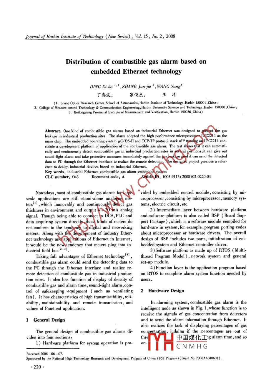 Journal of Harbin Institute of Technology( New Series, Vol 15, No. 2, 2008Distribution of combustible gas alarm based onembedded Ethernet technologyDING Xi-bo,, ZHANG Jun-jie, WANG Yang丁喜波,張俊杰,王ce Optics Research Center, School of Astronautic, Harbin Institute of Technology, Harbin 150001, China;2. College of Measure-control Technology Communication Engineering, Harbin University Science and Technology, Harbin 150080,China;3. Heilongjiang Provincial Institute of Measurement and Verification, Harbin 150036, China)Abstract: One kind of combustible gas alarms based on industrial Ethemet was designed to prevent the gasleakage in industrial production sites. The alarm adopted the high performance microprocessor LPC2214 as themain chip. The embedded operating system uC/OS-ll and TCP/IP protocol stack ulP running on LPC2214 con-stitute a development platform of application of the combustible gas alarm. The test shows that it can automati-cally and continuously detect combustible gas in industrial production sites in several positions; it can give ousound-light alarm and take proteres immediately against the gas leakage and it can send the deteeteddata to PC through the Ethernet interface to realize the remote detection. The designed project provides a reference to design industrial devices based on industrial Ethernet.Key words: industrial Ethernet; combustible gas alarm; embedded systemCLC number: 043Document code: AArticle II:10059113(2008)02022004Nowadays, most of combustible gas alarms for large vided by embedded control module, consisting byscale applications are still stand-alone analogue me- croprocessor, consisting by microprocessor, memory sys-electric circuit etcthickness in environment and output 4-20 mA analog2)Intermediate layer between hardware platformsignal. Though being able to connect to DCS, PLC and and software platform is also called BSP( Board Sup-data acquiring system directly, those kinds of meters do port Package), which is a software module compiled fornot conform to the tendency to digital and networking hardware in system, for example, program porting codesmeters. Along with the development of industry Ether- about microprocessor or hardware drivers. The overallnet technology and applications of Ethernet in Internet, design of BSP includes two parts, initialization of em-it would be the new tendency that meters plug into in- bedded system and Ethernet controller driverdustrial field bus[2-3)nc3)Software platform is made up of RTOS MultiTaking full advantages of Ethernet technology), thread Program Model ) network system and generalcombustible gas alarm could send the detecting data to set-up module.the PC through the Ethernet interface and realize re-4) Function layer is the application program basedmote detection of combustible gas in industrial produc- on RTOS to complete alarm system function needed bytion sites. It also has function of display of density ofuserscombustible gas and alarm time, sound-light alarm, con-trol of safekeeping equipment such as ventilating 2 Hardware Designfan). It has characteristics of high transmissibility, reli-ability, maintainability and remote transmission, andIn alarming system, combustible gas alarm is thevalues of Practical applicationintelligent node as shown in Fig. I, whose function is toreceive the signals of gas concentration from detectors1 General Designand to send the alarm information through Ethernet. Italso realizes the task of displayingofThe general design of combustible gas alarms di- concentration. iudging if the percentages are out of中國煤化工 g alarm time,and1) Hardware platform for system operation isCNMHGReceived 2006-06-07Sponsored by the National High Technology Research and Development Program of China(863 Program)( Grant No. 2006AA0-40601)220Journal of Harbin Institute of Technology( New Series), Vol 15, No 2, 2008quisition and amplification circuit. AD623, one kind ofEthemet switchsingle-supply instrument amplifier whose output swingcould reach the power voltage, is used to amplify thesmall-amplitude signal from sensor precisely, suppEthemetcommon-mode and improve signal quality, whicht convenient to a/d conversionombustibcombustibleis alarm息2. 3 Ethernet Interface and Control Circuitgiss alarmEthernet interface and control circuit is composedDetectorDelectorof Ethernet controller chip RTl8019AS expandedrface in LPC2214 and itsFig 1 Alarming system structureother peripheral circuit. RTL8019AS, a high-densityTo meet the demands mentioned above, the hard. 10Mbps Ethernet controller compatible to Ethernet IIand IEEE 802. 3, has advantages in hard software por-ware is composed of power circuit, microprocessor, sig tability, low price, and so onal acquisition and amplification circuit, Ethernet inter-face and control circuit alarm controller and the manNowadays, as the characteristics are hard real-timeinterface, etc. The hardware structure of com- Ethernet technology based on TCP/IP protocol is thalarm is shown in Fig. 2. Meanwhile, ex- best choice for field devices such as alarm to get accesconsidered in the design due to intelligent field instru- to industry control network. In the design, dependifpproof and other safety precautions should bements of industry applicationon this technology, we can achieve communication be-tween combustible gas alarm and Intemet by Ethernetcontroller rtl8019ASPower Module2. 4 Human- Machine Interface and Power CircuitOn the purpose of keeping watch on and setting upAid Kthe alarm in industrial field, this design also provideshuman-machine interfaces such as keys, display and V/O output, whosebeDetectARM LO-ClockLPC2214Buzzer alarmment to eliminate security threat like EDM and meetResetExtemalUART'YZNE-IoTthe demand of anti-explosion. Meanwhile, power circuitneeds to supply 2.5 V precision reference voltage forRS232A/D conversion of LPC2214 except other partsFig 2 Hardware structure of alarm2. 1 Microprocessor Module3 Software DesignThis system selects a 
