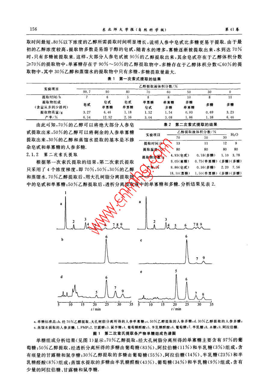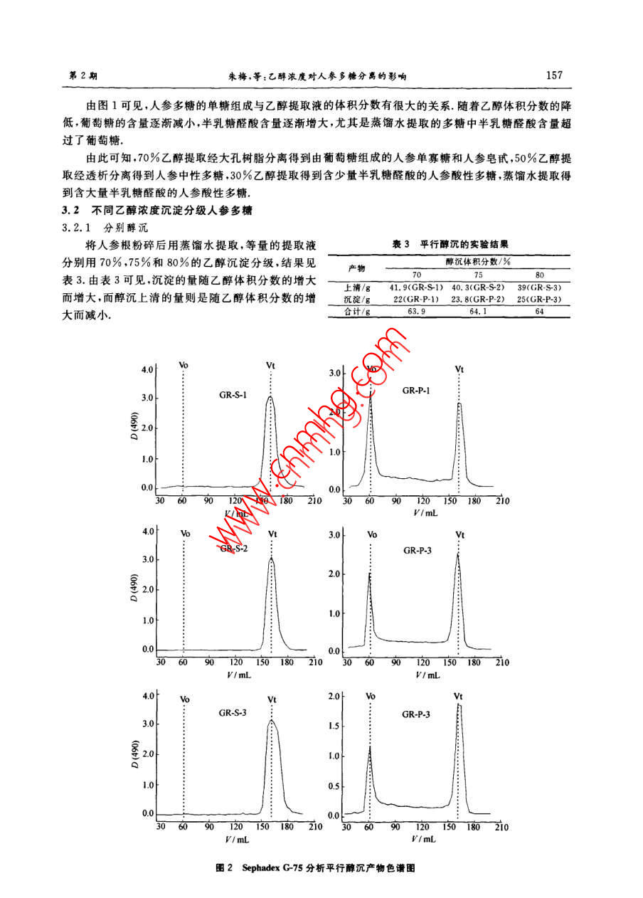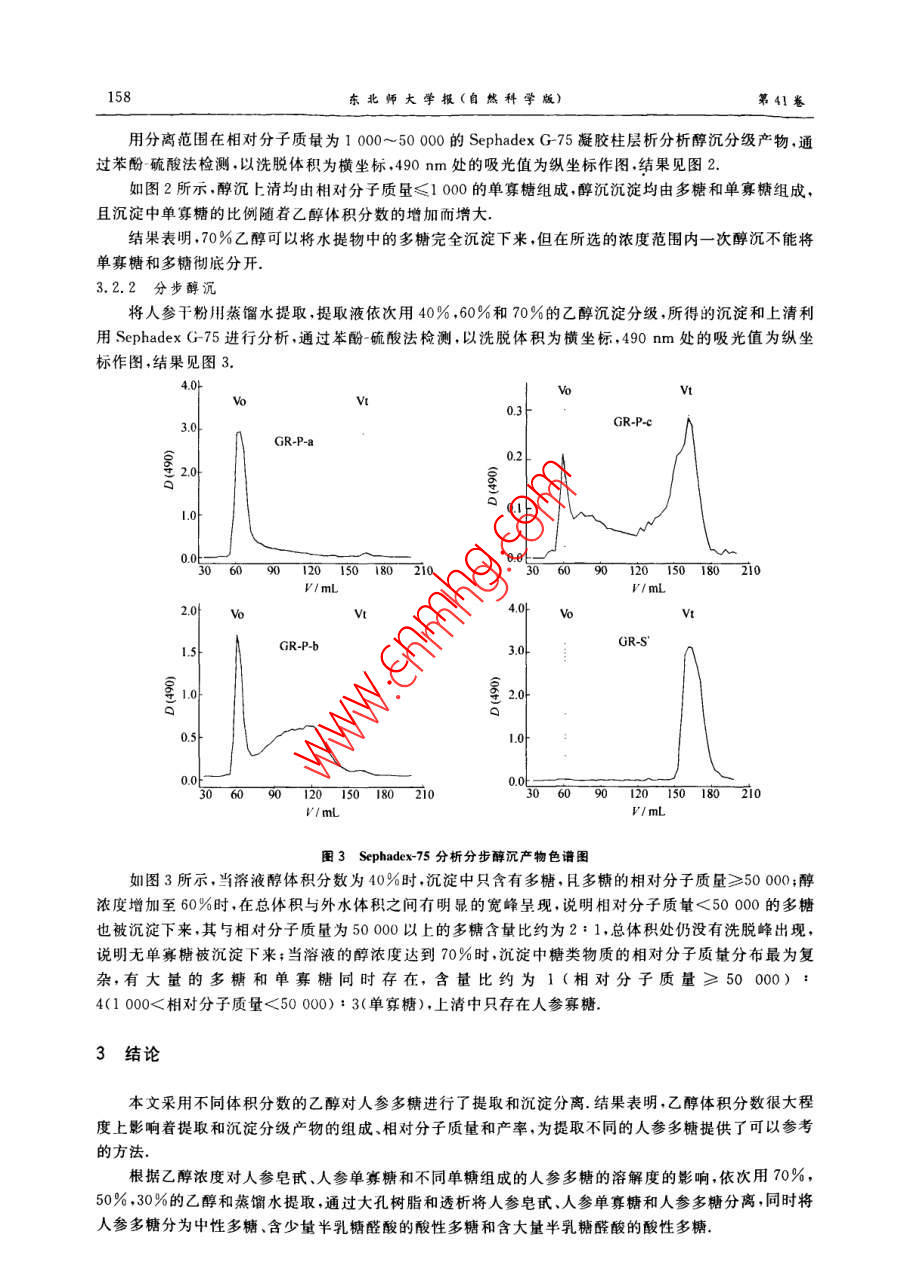 第41卷第2期東北師大學(xué)報(bào)(自然科學(xué)版Vol. 41 No, 22009年6月Journal of Northeast Normal University(Natural Science Edition)June 2009[文章編號(hào)]1001832(2009)02-0154-06醇濃度對(duì)人參多糖分離的影響朱梅',畢宏濤2,楊威2,劉楊2,臺(tái)桂花2,周義發(fā)2(1.北華大學(xué)化學(xué)與生物學(xué)院,吉林吉林132013;2.東北師范大學(xué)生命科學(xué)學(xué)院,吉林長(zhǎng)春130024)[摘要]研究了不同濃度的乙醇對(duì)人參多糖分離的影響.結(jié)果表明,乙醇濃度在很大程度上影響著人參多糖的分離效果和產(chǎn)率,通過(guò)對(duì)不同濃度乙醇提取和沉淀的多糖組成和相對(duì)分子質(zhì)量的分析,得出了分離人參多糖的簡(jiǎn)便方法:依次用體積分?jǐn)?shù)為70%,50%,30%的乙醇和蒸餾水提取,經(jīng)大孔樹脂和透析分離,可分別得到皂武、單寡糖、中性多糖和酸性多糖;人參水提取液經(jīng)40%60%,70%的乙醇分步醇沉,可分別得到不同相對(duì)分子質(zhì)量的多糖和單寡糖[關(guān)鍵詞]人參多糖;索氏提取法;乙醇分級(jí);人參寡糖[中圖分類號(hào)]Q538[學(xué)科代碼]180·1720[文獻(xiàn)標(biāo)識(shí)碼]A人參( Panar ginseng C.A. Meyer)是五加科( Araliaceae)人參屬植物,其根為名貴中藥,在我國(guó)和亞洲有著數(shù)千年的藥用歷史.人參具有多種藥理功能,其活性成分為人參皂苷、多糖、多肽和少量的小分子物質(zhì).人參多糖具有免疫調(diào)節(jié)、抗腫瘤、抗氧化、降血糖等藥理活性10),近些年來(lái)隨著糖生物學(xué)研究的迅速發(fā)展,人參多糖也越來(lái)越多地引起了人們的關(guān)注.大量的研究表明,人參多糖的相對(duì)分子質(zhì)量和組成與活性有著密切的關(guān)系11.通常水提取的人參多糖往往含有人參單寡糖和人參皂甙,需要經(jīng)過(guò)復(fù)雜的分離純化過(guò)程才能得到人參多糖純品影響人參多糖的研究和應(yīng)用本文探討了利用不同濃度的乙醇提取人參多糖和沉淀人參多糖的過(guò)程,并對(duì)所得人參多糖的產(chǎn)率和組成進(jìn)行了研究,以期優(yōu)化一種簡(jiǎn)便易行的分離人參多糖的方法1實(shí)驗(yàn)部分1.1材料、試劑與儀器實(shí)驗(yàn)所用干燥人參根購(gòu)于吉林省撫松縣人參種植基地,經(jīng)粉碎后用于人參多糖的提取.單糖、二糖及三糖標(biāo)準(zhǔn)品均為 Sigma- Aldrich公司產(chǎn)品, Sephadex G75凝膠為 Pharmacia公司產(chǎn)品,D101型非極性大孔樹脂(凈品級(jí))為天津海光試劑有限公司產(chǎn)品,其余均為國(guó)產(chǎn)分析純?cè)噭?shí)驗(yàn)儀器: Shimadzu10ATvp高效液相色譜儀(日本島津);723型分光光度計(jì)(上海精科);FD1A冷凍干燥機(jī)(北京博醫(yī)康);z36HK高速冷凍離心機(jī)(德國(guó) Herrle)1.2實(shí)驗(yàn)方法1.2.1不同濃度乙醇提取分級(jí)人參多糖1.2.1.1人參多糖的提取將50g人參干粉裝入索式提取器中,加入300mL99.7%(體積分?jǐn)?shù))的乙醇80℃條件下進(jìn)行索式提取,每隔1h用薄層層析法(TLC)檢測(cè)虹吸回流的液滴待硅膠板上各點(diǎn)的顏色基本消失時(shí),停止加熱;冷卻至室溫后,離心將提取液和殘?jiān)蛛x提取液旋轉(zhuǎn)蒸發(fā)除去乙醇后冷凍干燥,殘?jiān)凑丈鲜霾僮饕来斡?0%80%,70%,60%,50%,30%的乙醇溶液和蒸餾水進(jìn)行提取[收稿日期]2009-01-23[基金項(xiàng)目]國(guó)家自然科學(xué)基金資助項(xiàng)H(30770489);吉林省科技發(fā)展計(jì)劃項(xiàng)目(200707[作者簡(jiǎn)介]朱梅(1963-),女,副教授,主要從事藥用植物資源研究;周義發(fā)(1962-),男博士教授,博士研究生導(dǎo)師,主要從事多糖的結(jié)構(gòu)與功能研究第2期朱梅,等:乙醇濃度對(duì)人參多糖分離的影響1551.2.1.2人參多糖的分離采用D101型非極性大孔樹脂對(duì)提取液中的皂甙和糖類化合物進(jìn)行分離,樣品依次用蒸餾水和梯度乙醇溶液洗脫,TLC跟蹤檢測(cè)1.2.1.3TLC檢測(cè)人參多糖、單寡糖及皂甙采用硅膠G薄層層析板(厚約025mm);展層劑為氯仿與甲醇的混合溶液(V(氯仿):v(甲醇)v(水)=65:35:10);顯色劑為5%硫酸乙醇溶液在此檢測(cè)條件下,人參多糖由于極性大而位于原點(diǎn)處且為黃色斑點(diǎn);人參皂甙和人參單寡糖由于極性相對(duì)較小而隨展層劑展開,人參皂甙為粉紅色斑點(diǎn),人參單寡糖為黃棕色斑點(diǎn)斑點(diǎn)顏色的深淺與物質(zhì)的含量直接相關(guān),顏色越深含量就越高,因此可以用TLC估算出產(chǎn)物中人參多糖、人參皂甙和人參單寡糖的相對(duì)含量.1.2.2不同濃度乙醇沉淀分級(jí)人參多糖將500g人參干粉用蒸餾水進(jìn)行索氏提取,提取液濃縮至2L后,等分成4份備用1.2.2.1分別醇沉取3份濃縮液,緩慢加入96%的乙醇,使乙醇的體積分?jǐn)?shù)分別達(dá)到70%,75%和80%;靜置過(guò)夜離心,得到的上清和沉淀分別記作:GRS1和GR-P-1;GRS2和GR-P2;GR-S3和GRP3,沉淀常規(guī)干燥,上清旋轉(zhuǎn)蒸發(fā)除去乙醇后冷凍干燥1.2.2.2分步醇沉取1份濃縮液,緩慢加入96%的乙醇使乙醇的體積分?jǐn)?shù)達(dá)到40%靜置過(guò)夜,離心沉淀(GRPa)常規(guī)干燥;向上清繼續(xù)加入96%乙醇,使乙醇的體積分?jǐn)?shù)達(dá)到60%靜置過(guò)夜,離心,沉淀(GRPb)常規(guī)干燥;再向上清中加入96%乙醇,使乙醇的體積分?jǐn)?shù)達(dá)到70%,靜置過(guò)夜,離心,沉淀(GRPc)常規(guī)干燥,上清(GRS’)旋轉(zhuǎn)蒸發(fā)除去乙醇后冷凍干燥1.2.3相對(duì)分子質(zhì)量分布檢測(cè)采用 Sephadex G7