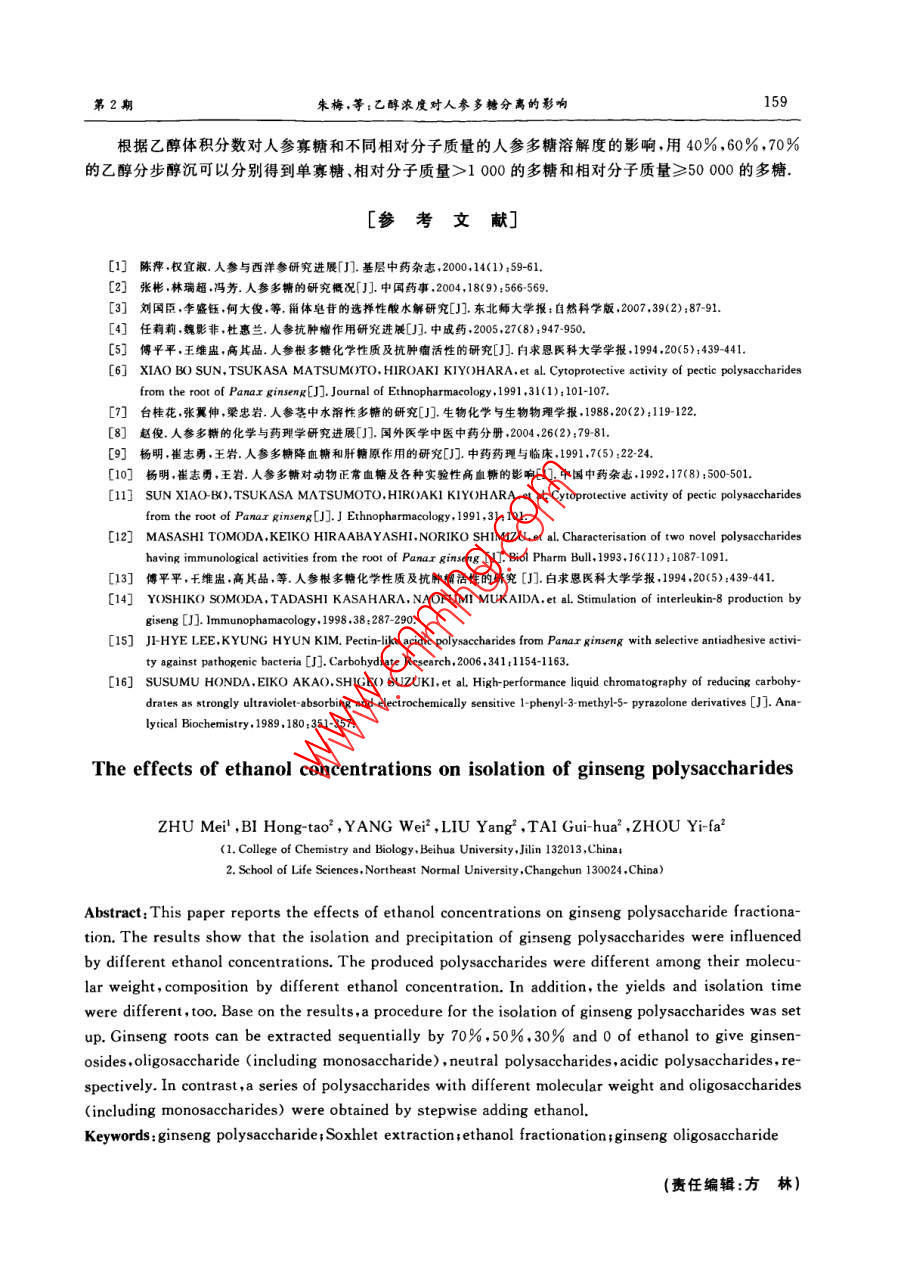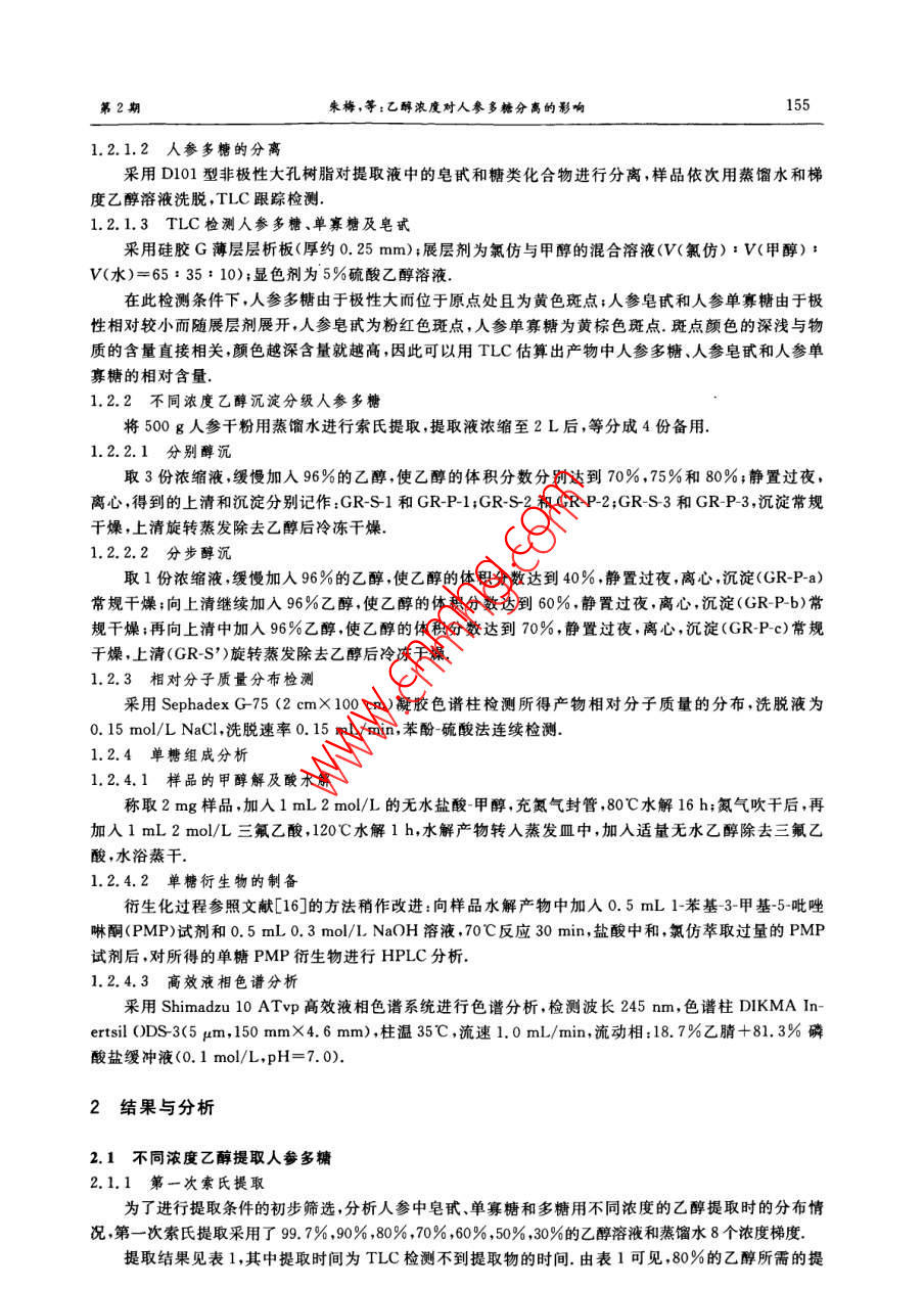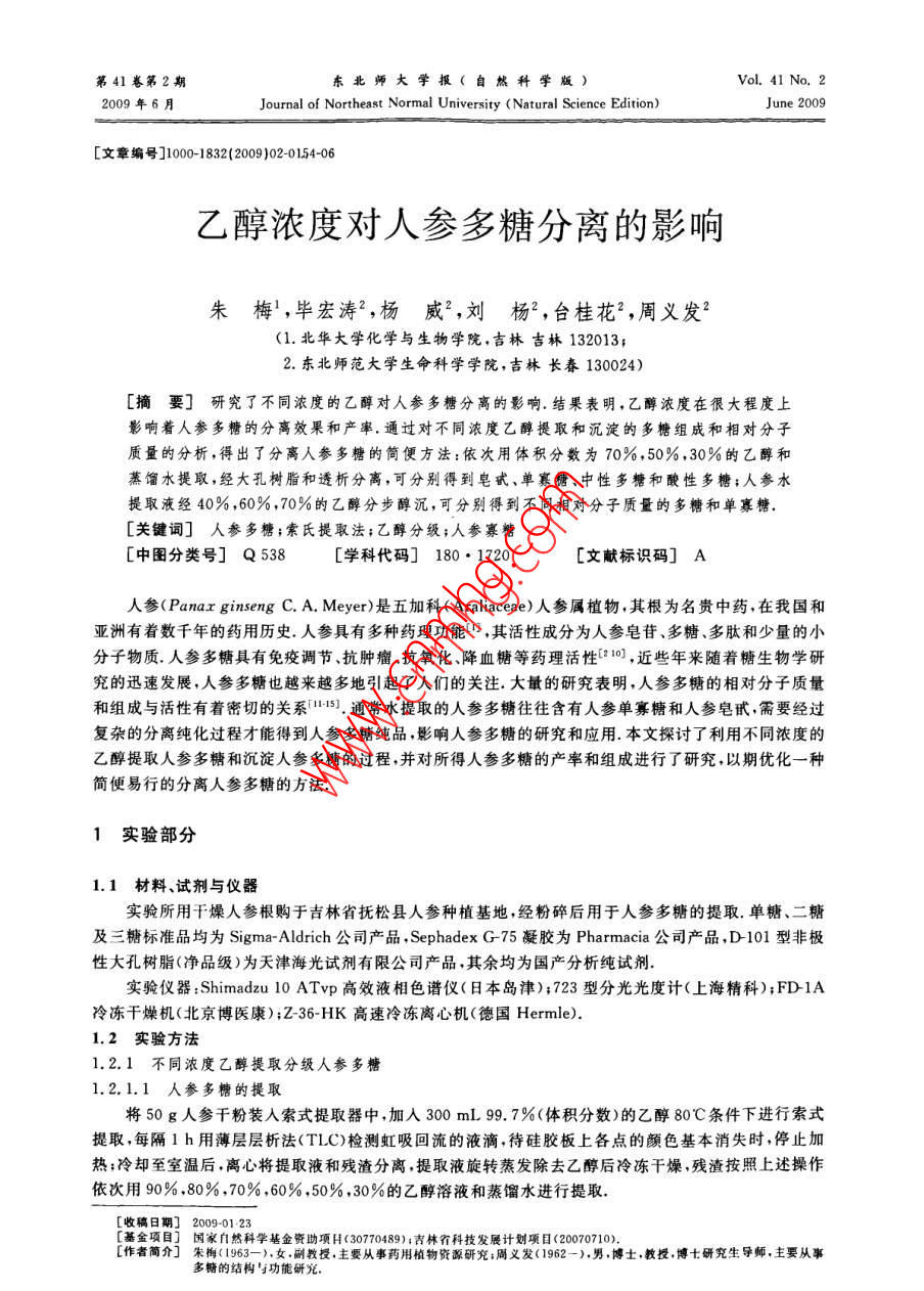 第41卷第2期東北師大學(xué)報(bào)(自然科學(xué)版Vol. 41 No, 22009年6月Journal of Northeast Normal University(Natural Science Edition)June 2009[文章編號(hào)]1001832(2009)02-0154-06醇濃度對(duì)人參多糖分離的影響朱梅',畢宏濤2,楊威2,劉楊2,臺(tái)桂花2,周義發(fā)2(1.北華大學(xué)化學(xué)與生物學(xué)院,吉林吉林132013;2.東北師范大學(xué)生命科學(xué)學(xué)院,吉林長(zhǎng)春130024)[摘要]研究了不同濃度的乙醇對(duì)人參多糖分離的影響.結(jié)果表明,乙醇濃度在很大程度上影響著人參多糖的分離效果和產(chǎn)率,通過(guò)對(duì)不同濃度乙醇提取和沉淀的多糖組成和相對(duì)分子質(zhì)量的分析,得出了分離人參多糖的簡(jiǎn)便方法:依次用體積分?jǐn)?shù)為70%,50%,30%的乙醇和蒸餾水提取,經(jīng)大孔樹脂和透析分離,可分別得到皂武、單寡糖、中性多糖和酸性多糖;人參水提取液經(jīng)40%60%,70%的乙醇分步醇沉,可分別得到不同相對(duì)分子質(zhì)量的多糖和單寡糖[關(guān)鍵詞]人參多糖;索氏提取法;乙醇分級(jí);人參寡糖[中圖分類號(hào)]Q538[學(xué)科代碼]180·1720[文獻(xiàn)標(biāo)識(shí)碼]A人參( Panar ginseng C.A. Meyer)是五加科( Araliaceae)人參屬植物,其根為名貴中藥,在我國(guó)和亞洲有著數(shù)千年的藥用歷史.人參具有多種藥理功能,其活性成分為人參皂苷、多糖、多肽和少量的小分子物質(zhì).人參多糖具有免疫調(diào)節(jié)、抗腫瘤、抗氧化、降血糖等藥理活性10),近些年來(lái)隨著糖生物學(xué)研究的迅速發(fā)展,人參多糖也越來(lái)越多地引起了人們的關(guān)注.大量的研究表明,人參多糖的相對(duì)分子質(zhì)量和組成與活性有著密切的關(guān)系11.通常水提取的人參多糖往往含有人參單寡糖和人參皂甙,需要經(jīng)過(guò)復(fù)雜的分離純化過(guò)程才能得到人參多糖純品影響人參多糖的研究和應(yīng)用本文探討了利用不同濃度的乙醇提取人參多糖和沉淀人參多糖的過(guò)程,并對(duì)所得人參多糖的產(chǎn)率和組成進(jìn)行了研究,以期優(yōu)化一種簡(jiǎn)便易行的分離人參多糖的方法1實(shí)驗(yàn)部分1.1材料、試劑與儀器實(shí)驗(yàn)所用干燥人參根購(gòu)于吉林省撫松縣人參種植基地,經(jīng)粉碎后用于人參多糖的提取.單糖、二糖及三糖標(biāo)準(zhǔn)品均為 Sigma- Aldrich公司產(chǎn)品, Sephadex G75凝膠為 Pharmacia公司產(chǎn)品,D101型非極性大孔樹脂(凈品級(jí))為天津海光試劑有限公司產(chǎn)品,其余均為國(guó)產(chǎn)分析純?cè)噭?shí)驗(yàn)儀器: Shimadzu10ATvp高效液相色譜儀(日本島津);723型分光光度計(jì)(上海精科);FD1A冷凍干燥機(jī)(北京博醫(yī)康);z36HK高速冷凍離心機(jī)(德國(guó) Herrle)1.2實(shí)驗(yàn)方法1.2.1不同濃度乙醇提取分級(jí)人參多糖1.2.1.1人參多糖的提取將50g人參干粉裝入索式提取器中,加入300mL99.7%(體積分?jǐn)?shù))的乙醇80℃條件下進(jìn)行索式提取,每隔1h用薄層層析法(TLC)檢測(cè)虹吸回流的液滴待硅膠板上各點(diǎn)的顏色基本消失時(shí),停止加熱;冷卻至室溫后,離心將提取液和殘?jiān)蛛x提取液旋轉(zhuǎn)蒸發(fā)除去乙醇后冷凍干燥,殘?jiān)凑丈鲜霾僮饕来斡?0%80%,70%,60%,50%,30%的乙醇溶液和蒸餾水進(jìn)行提取[收稿日期]2009-01-23[基金項(xiàng)目]國(guó)家自然科學(xué)基金資助項(xiàng)H(30770489);吉林省科技發(fā)展計(jì)劃項(xiàng)目(200707[作者簡(jiǎn)介]朱梅(1963-),女,副教授,主要從事藥用植物資源研究;周義發(fā)(1962-),男博士教授,博士研究生導(dǎo)師,主要從事多糖的結(jié)構(gòu)與功能研究第2期朱梅,等:乙醇濃度對(duì)人參多糖分離的影響1551.2.1.2人參多糖的分離采用D101型非極性大孔樹脂對(duì)提取液中的皂甙和糖類化合物進(jìn)行分離,樣品依次用蒸餾水和梯度乙醇溶液洗脫,TLC跟蹤檢測(cè)1.2.1.3TLC檢測(cè)人參多糖、單寡糖及皂甙采用硅膠G薄層層析板(厚約025mm);展層劑為氯仿與甲醇的混合溶液(V(氯仿):v(甲醇)v(水)=65:35:10);顯色劑為5%硫酸乙醇溶液在此檢測(cè)條件下,人參多糖由于極性大而位于原點(diǎn)處且為黃色斑點(diǎn);人參皂甙和人參單寡糖由于極性相對(duì)較小而隨展層劑展開,人參皂甙為粉紅色斑點(diǎn),人參單寡糖為黃棕色斑點(diǎn)斑點(diǎn)顏色的深淺與物質(zhì)的含量直接相關(guān),顏色越深含量就越高,因此可以用TLC估算出產(chǎn)物中人參多糖、人參皂甙和人參單寡糖的相對(duì)含量.1.2.2不同濃度乙醇沉淀分級(jí)人參多糖將500g人參干粉用蒸餾水進(jìn)行索氏提取,提取液濃縮至2L后,等分成4份備用1.2.2.1分別醇沉取3份濃縮液,緩慢加入96%的乙醇,使乙醇的體積分?jǐn)?shù)分別達(dá)到70%,75%和80%;靜置過(guò)夜離心,得到的上清和沉淀分別記作:GRS1和GR-P-1;GRS2和GR-P2;GR-S3和GRP3,沉淀常規(guī)干燥,上清旋轉(zhuǎn)蒸發(fā)除去乙醇后冷凍干燥1.2.2.2分步醇沉取1份濃縮液,緩慢加入96%的乙醇使乙醇的體積分?jǐn)?shù)達(dá)到40%靜置過(guò)夜,離心沉淀(GRPa)常規(guī)干燥;向上清繼續(xù)加入96%乙醇,使乙醇的體積分?jǐn)?shù)達(dá)到60%靜置過(guò)夜,離心,沉淀(GRPb)常規(guī)干燥;再向上清中加入96%乙醇,使乙醇的體積分?jǐn)?shù)達(dá)到70%,靜置過(guò)夜,離心,沉淀(GRPc)常規(guī)干燥,上清(GRS’)旋轉(zhuǎn)蒸發(fā)除去乙醇后冷凍干燥1.2.3相對(duì)分子質(zhì)量分布檢測(cè)采用 Sephadex G7