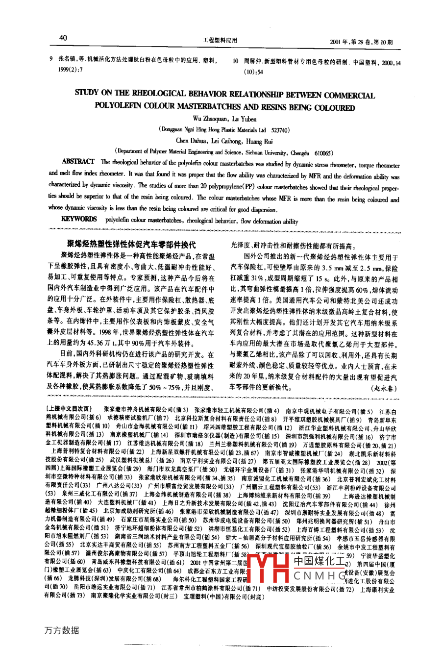 吳兆權(quán),等:聚烯烴色母粒與被著色樹脂的流變性能研究37聚烯烴色母粒與被著色樹脂的流變性能研究吳兆權(quán)陸玉本陳大華雷彩紅黃銳(東莞毅興塑膠原料有限公司523940) (四川大學(xué)高分 子材料科學(xué)與工程系,成都61006)摘要采用動(dòng)態(tài)應(yīng)力流變儀、轉(zhuǎn)矩流變儀和熔體流動(dòng)速率儀研究了聚烯烴色母粒熔體的流變特性。發(fā)現(xiàn)對色母粒這類特殊體系,其流動(dòng)能力和變形能力之間存在很大的區(qū)別;用MFR值或毛細(xì)管粘度來表征流動(dòng)能力及用動(dòng)態(tài)粘度來表征變形能力較為合適。對20多種注塑級P色母粒的研究表明,好的PP色母粒的流動(dòng)能力和變形能力都遠(yuǎn)高于被著色樹脂才能實(shí)現(xiàn)色母粒的良好分散。關(guān)鍵詞聚烯烴色母粒 流變特性流動(dòng)變形能力色母粒與被著色樹脂的流變特性之間應(yīng)滿足何果進(jìn)行比較,考察何種方式比較適合表征色母粒的種關(guān)系才能有利于色母粒的良好分散?這是一個(gè)世流動(dòng)變形能力。此外,我們采用動(dòng)態(tài)應(yīng)力流變儀、熔界性的技術(shù)難題,任何-個(gè)公司或研究機(jī)構(gòu)都不能體流動(dòng)速率儀等測試手段對數(shù)十種PP色母粒與被給出確切的回答。曹淑榮門對丙綸紡絲色母粒的研著色樹脂的流變性能進(jìn)行了比較,希望找出一個(gè)有究發(fā)現(xiàn),色母粒和紡絲基料熔體的流變性能差異是.利于色母粒分散的流變性能范圍。影響產(chǎn)品質(zhì)量的關(guān)鍵因素,并認(rèn)為色母粒和基料的1實(shí)驗(yàn)部分流變性能一致是比較好的??ú┨毓?1建議最好1.1 原材料選用與被著色樹脂熔體流動(dòng)速率(MFR)值相近的色低密度聚乙烯(LDPE):LDPE- A,TPC公司;母粒。詹寶玉等3認(rèn)為色母粒的流動(dòng)變形能力應(yīng)優(yōu)白色色母粒:W1.W2、W3,東莞毅興塑膠原料有于被著色樹脂。A.C-Y. Wang等4用以(苯乙烯/丙限公司;烯腈)共聚物(SAN)為載體的色母粒對ABS進(jìn)行著PP色母粒:注塑級,21種,東莞毅興塑膠原料有色發(fā)現(xiàn),所選用色母粒的MFR越高,所得注塑制品限公司。的顏色均勻性越好。因此,從文獻(xiàn)來看,似乎更傾向1.2實(shí)驗(yàn)儀器 與測試方法于色母粒的流動(dòng)變形能力應(yīng)優(yōu)于被著色樹脂。但對表1列出實(shí)驗(yàn)儀器、測試方法及生產(chǎn)廠家。.表!實(shí)驗(yàn)儀器、測試方法及生產(chǎn)廠家某一特定色母粒體系,其流變性能究競要比被著色儀器名稱型號測試方法生產(chǎn)廠家樹脂好多少尚不得而知。動(dòng)態(tài)應(yīng)力SR-500動(dòng)態(tài)頻率掃描美國Ronetric就測試手段而言,目前對色母粒流變行為的研流變儀Scientic Ine.究大多采用毛細(xì)管流變儀或轉(zhuǎn)矩流變儀。這種穩(wěn)態(tài)轉(zhuǎn)矩。SYS40恒定溫度下,最不同 德岡哈克公司流變僅轉(zhuǎn)速下的平衡轉(zhuǎn)矩測試下的連續(xù)形變常會造成高分子,特別是多相、多熔體流動(dòng)E.VINDEx按ASTM D1238 - 90意大利ATSAAR組分高分子形態(tài)結(jié)構(gòu)的變化或破壞,因而難以準(zhǔn)確.測試公司獲得材料結(jié)構(gòu)狀態(tài)的信息”’。Y.G. Yanovskyoi指2結(jié)果與討論出,對于填充高聚物體系,毛細(xì)管流變儀或轉(zhuǎn)矩流變2.1色母粒流動(dòng)變形能力的表征儀幾乎不能給出有關(guān)填料分散和混合程度等方面的塑料著色過程是通過色母粒與被著色樹脂的共信息,而動(dòng)態(tài)流變儀測試則能獲得大量這方面的有混來實(shí)現(xiàn)的,色母粒的流動(dòng)變形能力是影響共混效關(guān)信息。據(jù)筆者所知,還沒有人采用動(dòng)態(tài)應(yīng)力流變果從而影響著色效果的關(guān)鍵因素。因此,對色母粒測試手段測試色母粒熔體的動(dòng)態(tài)流變行為。生產(chǎn)、的流動(dòng)變形能力進(jìn)行表征無疑對色母粒的研究開研究人員比較習(xí)慣用MFR值和轉(zhuǎn)矩來表征色母粒發(fā)、生產(chǎn)及使用具有重要意義。在工業(yè)生產(chǎn)中,一般熔體的流動(dòng)變形能力17-10) ,并以此作為色母粒配方用MF中國煤化畢度(以下簡稱毛設(shè)計(jì)和改進(jìn)的依據(jù)之一。筆者擬采用動(dòng)態(tài)應(yīng)力流變儀測試色母粒的流變細(xì)TYHCNMH G淶表征。.特性,并與熔體流動(dòng)速率儀和轉(zhuǎn)矩流變儀的測試結(jié)收稿日期:2001-062138工程塑料應(yīng)用2001 年,第29卷,第I0期實(shí)際.上.流動(dòng)變形能力包括流動(dòng)能力和變形能力兩個(gè)方面。這兩者在本質(zhì)上有一定的共通性:變形就是一種流動(dòng),要流動(dòng)必須變形。表2列出用不A潤冊層同流變儀測得的4種原料的流變數(shù)據(jù)。從表2可看出,4種原料的流動(dòng)能力若按MFR值大小來表征,速率分布應(yīng)力分布速率分布成力分布則為:W3> W1> W2> LDPE- A;若按轉(zhuǎn)矩大小來表(a(b)征.則為:W3>W2>W1 > LDPE- A;若按復(fù)數(shù)粘度有潤滑層的流動(dòng): b-無潤滑層的流動(dòng)大小來表征,則為:LDPE -A>Wl> W2>W3。熔圈1毛細(xì)管內(nèi)兩種 不同流動(dòng)狀況示意圖體流動(dòng)速率儀和轉(zhuǎn)矩流變儀所測得的結(jié)果基本-要反映材料的流動(dòng)能力,而對材料的變形能力反映致,但與動(dòng)態(tài)流變儀所測得的結(jié)果幾乎完全相反。較少。三種流變儀就其本質(zhì)來說測定的都是材料的流動(dòng)變表