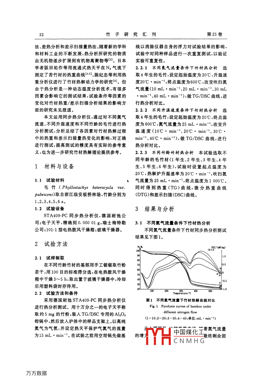 第25卷第2期竹子研究匯刊Vol 25. No. 22006年5月JOURNAL OF BAMBOO RESEARCHMay,2006用熱分析法研究竹材熱解特性影響因素李文珠1何擁軍2陳普(1.浙江林學(xué)院工程學(xué)院,浙江臨安311300;2浙江省義烏市大陳鎮(zhèn)農(nóng)業(yè)服務(wù)中心浙江義烏322011;福建省南平市技術(shù)監(jiān)督局,福建南平35摘要運(yùn)用熱重/差示掃描(TG/DSC)同步熱分析法,通過實(shí)驗(yàn)分析了不同氮?dú)饬髁?、不同升溫速度、不同竹齡等因素對毛竹材熱解過程的影響。結(jié)果表明:(1)氮?dú)饬髁康淖兓瘜Σ顭釖呙枇繜崆€沒有明顯影響,隨謄氮?dú)饬髁康脑龃?在熱解過程中失重增大,且最終剩余固體產(chǎn)物量呈遞減的趨勢。(2)升速度變化對熱重曲線沒有明顯影響,對DSC曲線的影響較明顯。隨著升溫速度的增大,在整個熱解過程中吸放熱更明顯。(3)在相同的試驗(yàn)條件下,不同竹齡的竹材的熱解過程中熱量吸放和失重變化溫度點(diǎn)存在著一定的差值鍵詞同步熱分析;毛竹;熱解;影響因素The factors Influencing the Characteristicsof Bamboo Pyrolysis, a Hot Analytic ApproachLi Wenzhu' He yongjun Chen Pu(1. School of Engineering, Zhejiang Forestry College, Lin'an 311300, Zhejiang, China;2. Agricultural Service Centre of Da-Chen Town Yiwu, Yiwu 3220113, Zhe jiang, China:3. Bureau of Technical Supervision of Nanping City, Nanping 353001, Fujian, China)Abstract Using hot weight-difference shows and scans(TG/DSC)the synchronous hotanalytic approach, factors such as different nitrogen flow, temperature raise pace, andbamboo ages were analyzed in the course of bamboo pyrolysis, The results showed (1)The change of the nitrogen flow did not obviously influence the hot curve of hotscanning amount of difference, with the increase of the nitrogen flow the weightlessnessincreased, and the remain solid amount decreased. (2)The change of temperature raisepacesly influence the hot heavy curve. The impact on dSc curve wasrelatively obvious. With the increase of the temperature raise pace, endothermic andexothermic phenomena were obvious during pyrolysis. (3) Under the same experimentalcondition, there found obvious difference during the whole pyrolysis of different bambooKey words Simultaneous thermal analyzer; Bamboo; Pyrolysis Influencing factors熱分析是在程序控制溫度的條件下,測量各類物質(zhì)在很寬的溫度范圍內(nèi)進(jìn)行定性、定量物質(zhì)的物理性質(zhì)與溫度關(guān)系的一種技術(shù),是對表征的極其有效的手段(2根據(jù)測量物質(zhì)的物理性質(zhì)的不同,熱分析方法的種類是多種多樣收稿日期:2006-03-12的。如:差熱分析(DTA)熱重分析(TG)、差示基金項目:浙江省重點(diǎn)招標(biāo)資助項目(2003c12016)作者簡介李文珠(1974-),女,浙江龍游人實(shí)驗(yàn)師,主掃掎C扭姚托TMA、DMA要從事木材科學(xué)與技術(shù)研究,E- mail.lwz@ife.edu,等中國煤化工是熱重CNMHG究匯刊第25卷法、差熱分析和差示掃描量熱法。隨著新的學(xué)科線以消除儀器自身的浮力對試驗(yàn)結(jié)果的影響,和材料工業(yè)的不斷發(fā)展,熱分析所研究的物質(zhì)試驗(yàn)中對同種樣品進(jìn)行一次重復(fù)測試,以驗(yàn)證由無機(jī)物逐步擴(kuò)展到有機(jī)物高聚物等。日本實(shí)驗(yàn)可重復(fù)性。學(xué)者阪田祐作等用流通式熱天平在N2氣流下2.2.1不同氮?dú)饬髁織l件下竹材熱分析選測定了苦竹材的熱重曲線43。陳紀(jì)忠等利用熱取4年生的毛竹,設(shè)定起始溫度為20℃,升溫速重分析儀進(jìn)行了竹材熱解動力學(xué)的研究但度20℃·min-1,終點(diǎn)溫度為600℃,改變吹掃氮由于熱分析是一種動態(tài)溫度分析技術(shù),有很多氣流量(10mL·min-1、20mL·min-、30mL因素會影響它的測試結(jié)果,試驗(yàn)條件等因素的min-1、40mL·min-1),做TG/DSC曲線,進(jìn)變化對竹材熱重/差示掃描分析結(jié)果的影響方行熱分析對比。面的研究未見報道。2.2.2不同升溫速度條件下竹材熱分析選本文運(yùn)用同步熱分析儀,通過對不同氮?dú)馊?年生的毛竹,設(shè)定起始溫度為20℃,終點(diǎn)溫流速、不同升溫速度和不同竹齡的毛竹進(jìn)行熱度為600℃C,氮?dú)饬髁繛?5mL·min-1,改變升分析測試,分析總結(jié)了各因素對竹材熱解過程溫速度(10℃c·min-1、20℃·min-1、30℃中的熱重和差示掃描量熱變化的影響,對正確min-1、40℃·min-1),做TG/DSC曲線,進(jìn)行進(jìn)行測試,提高測試的精度具有實(shí)際的參考意熱分析對比。義,也為進(jìn)一步研究竹材熱解理論提供參考。2.2.3不同竹齡竹材熱分析本試驗(yàn)選取不同年齡的毛竹材(1年生、2年生、3年生、4年1材料與設(shè)備生、5年生、6年生),試驗(yàn)時設(shè)置起點(diǎn)溫度為20℃,熱解爐升溫速率為20℃·min-,吹掃氮1.1試驗(yàn)材料氣流量為25mL·min-1,終點(diǎn)溫度為1000℃。毛竹( Phyllostachys heterocycla var.同時得到熱重(TG)曲線,微分熱重曲線pubescen)取自浙江臨安板橋林場,竹齡分別為(DTG)和差示掃描(DSC)曲線。1、2、3、4、5、6a。1.2試驗(yàn)設(shè)備3結(jié)果與分析STA409PC同步熱分析儀,德國耐弛公司;電子天平,精確到0.00001g,瑞士梅特勒3.1不同氮?dú)饬髁織l件下竹材熱分析公司;101-1型電熱鼓風(fēng)干燥箱;玻璃干燥器。不同氮?dú)饬髁織l件下竹材同步熱分析測試結(jié)果見下圖1。2試驗(yàn)方法2.1試樣制取在不同竹齡竹材的基部用手工鋸鋸取竹粉若干,用100目的標(biāo)準(zhǔn)篩分選,在電熱鼓風(fēng)干燥箱中干燥3~5h,取出置于玻璃干燥器中,冷卻后用塑料袋封存待