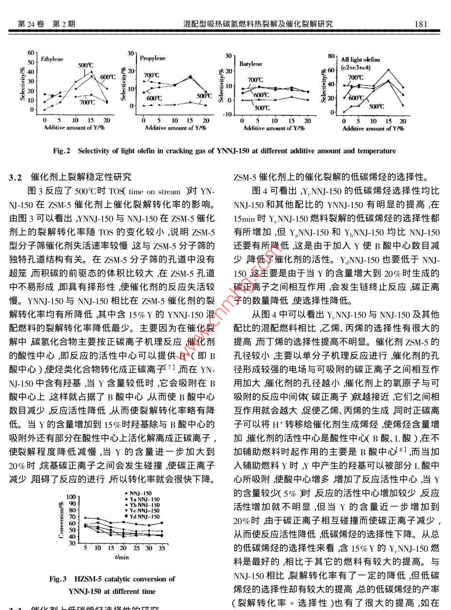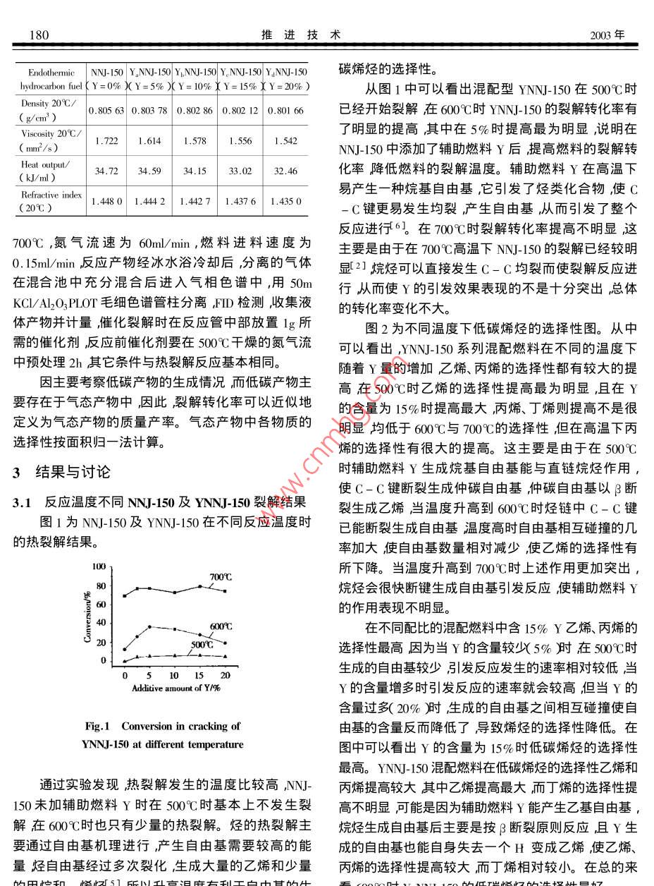 2003年4月推進技術Apr. 2003第24卷第2期JOURNAL OF PROPULSION TECHNOLOGYVol.24 No.2混配型吸熱碳氫燃料熱裂解及催化裂解咸春雷,方文軍,張波,王彬成,林瑞森(浙江大學化學系,浙江杭州310027)摘要:為提高吸熱型碳氫燃料的吸熱能效,將輔助燃料Y按不同比例與碳氫燃料混合,配制成新的混配型YNNJ-150燃料,利用連續(xù)流吸熱型碳氫燃料裂解微型反應色譜評價裝置,考察了它的熱裂解轉化率和低碳烯烴的選擇性,并在HZSM-5分子篩上進行了催化裂解評價。結果表明混配型YNNJ-150 燃料不僅降低了裂解溫度,同時提高了燃料裂解的低碳烯烴的選擇性,增加了燃料的吸熱能力,且混合輔助燃料Y的比例為15%時的混配燃料Y_NNJ-150 的效果最好。混配型燃料可成為今后研究的一個重要方向。關鍵詞:吸熱燃料;烴類燃料;混合燃料;熱降解;催化裂解中圖分類號: V312.1文獻標識碼: A文章編號: 1001-4055 ( 2003 ) 02-0179-04Thermal cracking and catalytic cracking of themixing endothermic hydrocarbon fuelXIAN Chun-lei , FANG Wen-jun , ZHANG Bo , WANG Bin-cheng , LIN Rui-sen( Dept. of Chemistry , Zhejiang Univ. , Hangzhou 310027 , China)Abstract: In order to improve the endothermtic capability of endothermtic hydrocarbon fuels ,new YNNJ-150 fuel was pre-pared by adding Y additive to NNJ-150. Cracking conversion and selectivity of light carbon olefins of mixing endothermic hydrocarbonfuels was investigated by the microreative chromatogram installation. Results show that the mixing YNNJ - 150 not only decreases thetemperature of cracking , but also improves the selectivity of light olefins and endothermic capability. Mixing fuel of containing percent15 Y is best in all diferent proportions. Cracking performance of mixing fuel on HZSM-5 was further studied. The mixing endothermichydrocarbon fuels may be the focus of future research.Key words: Endothermic fuel ; Hydrocarbon fuel ; Mixed fuel ; Thermal degradation ; Catalytic cracking1引言2實驗部分吸熱型碳氫燃料因可望更好地解決高超聲速飛2.1 吸熱型碳氫燃料的制備行器的冷卻問題而受到重視美國曾以沸石分子篩為通過對原油進行實沸點切割然后進行調(diào)配制成催化劑,對吸熱型碳氫燃料的催化裂解進行了評的吸熱型碳氫燃料NNJ-150 ) ,混配吸熱型碳氫燃料價1但固體催化劑裂解碳氫燃料要應用于高超聲速YNNJ- 150是把NNJ-150與一種輔助燃料Y按不同比例的航空、航天飛行器卻還存在著一些技術困難。 為此,混合配制而制成其主要性質與NNJ-150對比見表1。美國和俄羅斯開始著手引發(fā)劑添加劑)的研制和開2.2吸熱型碳氫燃料裂解測試發(fā)。鑒于國內(nèi)目前在這方面還是空白難度較大我們裂解反應利用連續(xù)流吸熱型碳氫燃料裂解微型首先在NN-150吸熱型碳氫燃料23]的基礎上用輔助反應色譜評價裝置3A中進行其熱裂解測試條件為在燃料Y與NNJ-150按不同比例進行混配制備了新的反應管內(nèi)全部填充小瓷管反應溫度為500C 600C ,YNNJ-150吸熱燃料提高吸熱型碳氫燃料的吸熱能效,Table 1 Main properties of endothermic hydrocarbon fuel并在ZSM-5催化劑上進行了催化裂解評價。180推進技術2003年Endohermice| NN-I50 | YNNJ-15OYNN- 150 YNJ-15OYNNJ-150碳烯烴的選擇性。hydrocarbon fuel Y=0% )(Y=5% )(Y=10% X Y=15%X Y=20% )從圖1中可以看出混配型YNNJ-150 在500時Density 20C/0.80563 0.803 780.802860.802 12 0.801 66已經(jīng)開始裂解在600C時YNNJ- 150的裂解轉化率有(gcm2 ) _了明顯的提高其中在5%時提高最為明顯,說明在Viscosity 20C/1.722 1 .6141.5781.556 1.542( mm2/s)NNJ-150中添加了輔助燃料Y后提高燃料的裂解轉Heat output/34.72 34. 5934.1533.02 32.46化率降低燃料的裂解溫度。輔助燃料Y在高溫下(kJ/ml )易產(chǎn)生一種烷基自由基,它引發(fā)了烴類化合物,使CRefractive index1.4480 1.4442 1.442 71.4376 1.4350(20C )-C鍵更易發(fā)生均裂產(chǎn)生自由基,從而引發(fā)了整個反應進行6]。在700C時裂解轉化率提高不明顯,這7009 ,氮氣流速為60ml/min ,燃料進料速度為主要是由于在700°高溫下NNJ- 150的裂解已經(jīng)較明0.15m/min ,反應產(chǎn)物經(jīng)冰水浴冷卻后,分離的氣體顯2]烷烴可以直接發(fā)生C-C均裂而使裂解反應進在混合池中充分混合后進入氣相色譜中,用50m行,從而使Y的引發(fā)效果表現(xiàn)的不是十分突出總體KC/AI2O,PLOT毛細色譜管柱分離,FID檢測收集液的轉化率變化不大。體產(chǎn)物并計量,催化裂解時在反應管中部放置1g所圖2為不同溫度下低碳烯烴的選擇性圖。從中需的催化劑,反應前催化劑要在500C干燥的氮氣流可以看出,YNNJ-150系列混配燃料在不同的溫度下中預處理2h其它條件與熱裂解反應基本相同。隨著Y量的增加,乙烯、丙烯的選擇性都有較大的提因主要考察低碳產(chǎn)物的生成情況而低碳產(chǎn)物主高在500C時乙烯的選擇性提高最為明顯,且在Y要存在于氣態(tài)產(chǎn)物中,因此裂解轉化率可以近似地的含量為15%時提高最大,丙烯、丁烯則提高不是很定義為氣態(tài)產(chǎn)物的質量產(chǎn)率。氣態(tài)產(chǎn)物中各物質的明顯均低于600C與7009C的選擇性,但在高溫下丙選擇性按面積歸一法計算。烯的選擇性有很大的提高。這主要是由于在500C3結果與討論時輔助燃料Y生成烷基自由基能與直鏈烷烴作用,3.1反應溫 度不同NNJ-150及YNNJ-150裂解結果使C-C鍵斷裂生成仲碳自由基,仲碳自由基以β斷裂生成乙烯當溫度升高到600C時烴鏈中C-C鍵.圖1為NNJ-150及YNNJ-150在不同反應溫度時已能斷裂生成自由基溫度高時自由基相互碰撞的幾的熱裂解結果。率加大使自由基數(shù)量相對