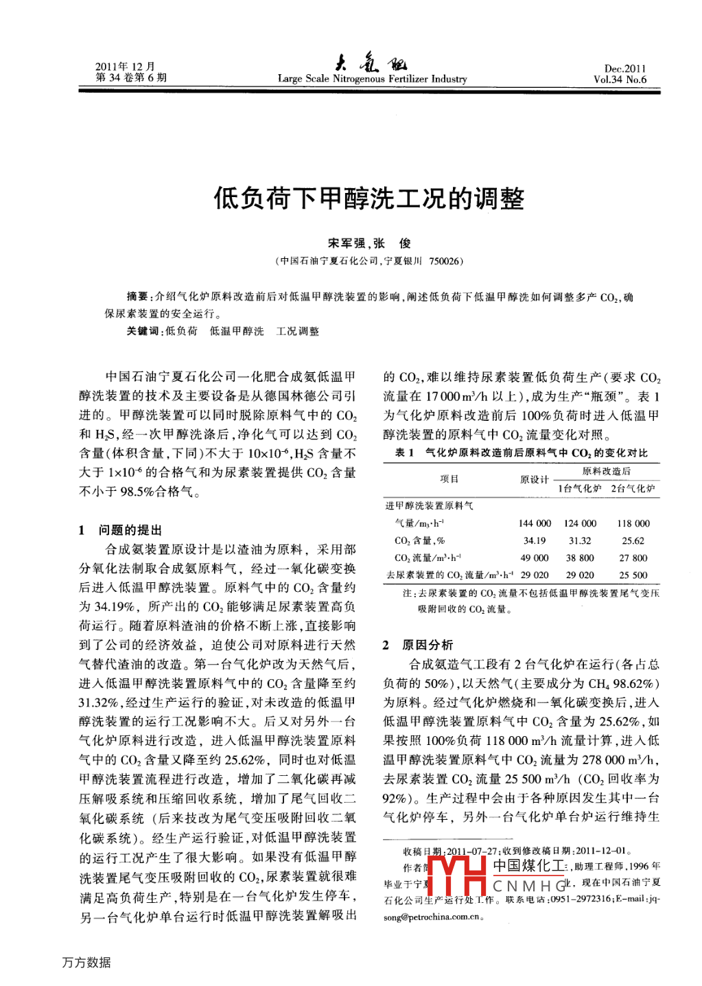 低負(fù)荷下甲醇洗工況的調(diào)整