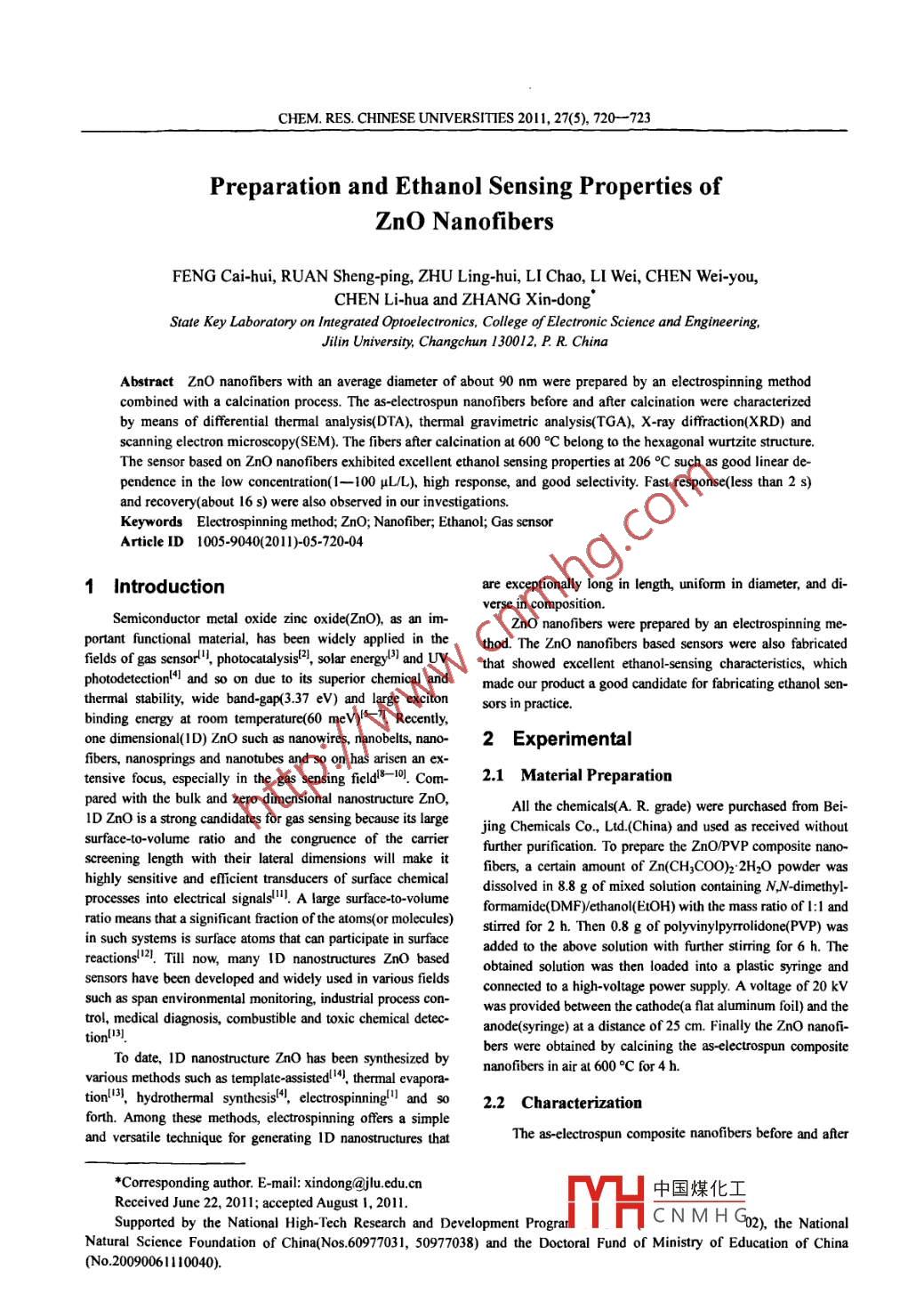 CHEM. RES CHINESE UNTVERSITIES 2011, 27(5), 720-723Preparation and Ethanol Sensing Properties ofZno NanofibersFENG Cai-hui, RUAN Sheng-ping, ZHU Ling-hui, LI Chao, LI Wei, CHEN Wei-you,CHEN Li-hua and zhang Xin-dongState Key laboratory on integrated Optoelectronics, College of Electronic Science and EngineeringJilin University, Changchun 130012, P R ChinaAbstract Zno nanofibers with an average diameter of about 90 nm were prepared by an electrospinning methodcombined with a calcination process. The as-electrospun nanofibers before and after calcination were characterizeby means of differential thermal analysis(DTA), thermal gravimetric analysis(TGA), X-ray diffraction(XRD) andscanning electron microscopy(SEM). The fibers after calcination at 600C belong to the hexagonal wurtzite structureThe sensor based on Zno nanofibers exhibited excellent ethanol sensing properties at 206C such as good linear dependence in the low concentration(1-100 HL/L), high response, and good selectivity. Fast response(less than 2 s)and recovery(about 16 s)were also observed in our investigationsKeywords Electrospinning method; ZnO; Nanofiber; Ethanol; Gas sensorArticle ID1005-9040(2011)-05-720-041 Introductionare exceptionally long in length, uniform in diameter, and di-verse in compositionSemiconductor metal oxide zinc oxide(ZnO), as an im-ZnO nanofibers were prepared by an electrospinning me-portant functional material, has been widely applied in theod. The Zno nanofibers based sensors were also fabricatedfields of gas sensor",photocatalysis, solar energy )and Uv that showed excellent ethanol-sensing characteristics, whichphotodetection!4I and so on due to its superior chemical and made our product a good candidate for fabricating ethanol sen-thermal stability, wide band-gap(3.37 ev)and large exciton sors in practicebinding energy at room temperature(60 mev)5-7. Recentlyone dimensional(I D) ZnO such as nanowires, nanobelts, nano- 2 Experimentalfibers, nanosprings and nanotubes and so on has arisen an ex-tensive focus, especially in the gas sensing field 8-10). Com- 2.1 Material Preparationpared with the bulk and zero dimensional nanostructure ZnoAll the chemicals(A. R. grade) were purchased from Bei-ID Zno is a strong candidates for gas sensing because its large jing Chemicals Co, Ltd(China)and used as received withoutsurface-to-volume ratio and the congruence of the carrier further purification. To prepare the ZnO/PVP composite nanofibers, a certain amount of Zn(CH3 COO): 2H o powder washighly sensitive and efficient transducers of surface chemical dissolved in 8. 8 g of mixed solution containing N, N-dimethyl-processes into electrical signals A large surface-to-volumeformamide (DMF)ethanol(EtoH)with the mass ratio of 1: 1 andratio means that a significant fraction of the atoms(or molecules) stirred for 2 h. Then 0.8 g of polyvinylpyrrolidone(PVP)wasin such systems is surface atoms that can participate in surfacereactions.Till now, many ID nanostructures Zno basedadded to the above solution with further stirring for 6 h. theobtained solution was then loaded into a plastic syringe andsensors have been developed and widely used in various fields connected to a high-voltage power supply. A voltage of 20 kVsuch as span environmental monitoring, industrial process con-trol, medical diagnosis, combustible and toxic chemical detec-tion[ 13)anode(syringe)at a distance of 25 cm. Finally the Zno nanofi-bers were obtained by calcining the as-electrospun compositeTo date, ID nanostructure Zno has been synthesized bynanofibers in air at 600oC for 4 h.various methods such as template-assisted!4), thermal evapora-tion>, hydrothermal synthesis, electrospinning!" and so 2.2 Characterizationforth. Among these methods, electrospinning offers a simpleand versatile technique for generating ID nanostructures thatThe as-electrospun composite nanofibers before and after*Corresponding author. E-mail: xindong@jlu.edu. cr中國煤化工Received June 22, 2011; accepted August 1, 2011Supported by the National High-Tech Research and Development ProgranCNMHO02),the NationalNaturalce Foundation of China(Nos. 60977031, 50977038)and the Doctoral Fund of Ministry of Education of ChinaNo200900610040)FENG Cai-hui et alcalcination were characterized by means of a differential ther- tions 6. according to the TG-DTa analyses above, 600C wasmal analyzer(DTA) and a thermal gravimetric analyzer(tga) chosen as the suitable sintering temperature(Melttler Toledo 825); an X-ray diffractometer(XRD)10(Shimadzu XRD-6000, Cu Ka radiation); a scanning electron100microscopy(sEM, XL30 ESEM FEG)The gas sensing properties of the sensor were measured ora CGS-8( Chemical gas sensor-8)intelligent gas sensing analy-60sis system(Beijing Elite Tech Co, Ltd, China)5.The responseis defined as Response R/Rg, where Ra and Rg are the resis-tances of the sensor in air and in the target gases, respectivelyig. I shows a schematic image of the as-fabricated sensor anda photograph of the sensor on a socket, respectively.02004006008001000ZnO nanofiberAu clectrodcig 2 TG-DTA curves of Zno/PVP composite nanofibersCeramic tubePrecursors were heated up to 900C in air at a scan rate of 10C/min.The XRD pattern of Zno nanofibers after calcination atNi-Cr hot wire600C for 4 h is shown in Fig 3. It can be seen that all the dif-fraction peaks correspond to the hexagonal wurtzite zincPt lcad wireoxide(JCPDS No 36-1451)7. No other diffraction peaks weredetected, which indicated the sample had a high purity.Fig 1 Schematic image(A)and photograph of Zno2/(°)nanofibers sensor ( B)Fig 3 XRD pattern of ZnO nanofibersThe SEM images of the as-electrospun composite nanofi2.3 Sensor Fabricationers before and after calcination are shown in Fig 4. As shownin Fig 4(A), the PVP/Zno composite nanofibers, which wereThe as-synthesized sample was mixed with deionized wa-ter in a mass ratio of 100: 25 to form a paste. The paste was thencoated on a ceramic tube to form a sensing film (with a thick-ness of abou