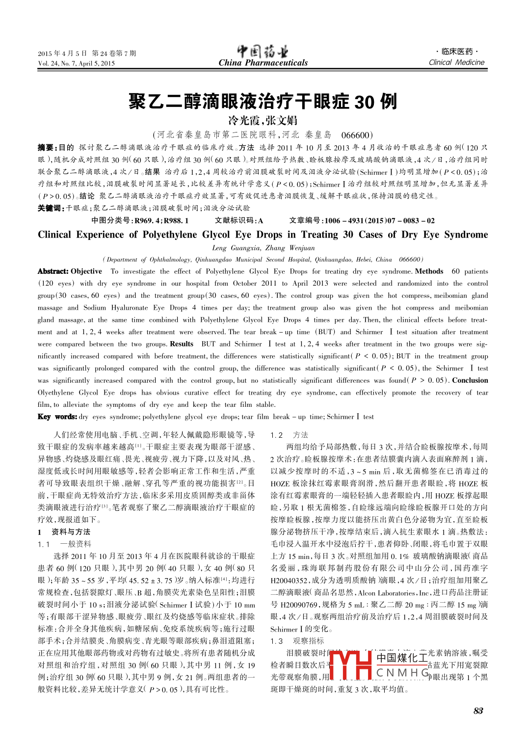 o15年4月5日第24卷第7期屮國業(yè)·臨床醫(yī)藥VoL. 24, No. 7, April 5, 2015China pharmaceuticalsClinical Medicine聚乙二醇滴眼液治療干眼癥30例冷光霞,張文娟(河北省秦皇島市第二醫(yī)院眼科,河北秦皇島06600摘要:目的探討聚乙二醇滴眼液治療干眼癥的臨床療效。方法選擇2011年10月至2013年4月收治的干眼癥患者60例(120只眼),隨杋分成對照組30例(60只眼),治療組30例(60只眼)對照組給予熱敷、瞼板腺按摩及玻璃酸鈉滴眼液,4次/日,治療組同時聯(lián)合聚♂二醇滴眼液,4次/日結(jié)果治療后1,2,4周較治療前淚膜破裂時間及淚液分泌試驗(yàn)( SchirmerⅠ)均明顯增加(ρ<0.05);治療組和對照組比較,淚膜破裂時間顯著延長,比較差異有統(tǒng)計(jì)學(xué)意義(P<0.05); SchirmerⅠ治療組較對照鉏明顯增加,但無顯著差異(P>0.05)結(jié)論聚乙二醇滴眼液治療干眼癥療效昰著,可有效促進(jìn)患者淚膜惔復(fù)、緩解干眼癥狀,保持淚膜的穩(wěn)定性關(guān)犍詞:干眼癥;聚♂二醇滴眼液;淚膜破裂時間;淚液分泌試驗(yàn)中圖分類號:R969.4;R988.1文獻(xiàn)標(biāo)識碼:A文章編號:1006-4931(2015)07-0083-02Clinical Experience of Polyethylene Glycol Eye Drops in Treating 30 Cases of Dry Eye SyndromeDepartment of Ophthalmology, Qinhuangdao Municipal Second Hospital, Qinhuangdao, Hebei, China 066600)Abstract: Objective To investigate the effect of Polyethylene Glycol Eye Drops for treating dry eye syndrome. Methods 60 patients(120 eyes) with dry eye syndrome in our hospital from October 2011 to April 2013 were selected and randomized into the controleyes)and the) The control group was givenpress, meibomiglarmassage and Sodium Hyaluronate Eye Drops 4 times per day: the treatment group also was given the hot compress and meibomiangland massage, at the same time combined with Polyethylene Glycol Eye Drops 4 times per day. Then, the clinical effects before treat-ment and at 1, 2, 4 weeks after treatment were observed. The tear break-up time (BUT)and Schirmer I test situation after treatmentwere compared between the two groups. Results BUT and Schirmer I test at 1, 2, 4 weeks after treatment in the two groups were significantly increased compared with before treatment, the differences were statistically significant( P<0. 05); BUT in the treatment groupwas significantly prolonged compared with the control group, the difference was statistically significant( P< 0. 05), the Schirmer Itestwas significantly increased compared with the control group, but no statistically significant differences was found (P>0. 05). ConclusionOlyethylene Glycol Eye drops has obvious curative effect for treating dry eye syndrome, can effectively promote the recovery of teafilm, to alleviate the symptoms of dry eye and keep the tear film stableKey words: dry eyes syndrome; polyethylene glycol eye drops; tear film break-up time: Schirmer I test人們經(jīng)常使用電腦、手機(jī)、空調(diào),年輕人佩戴隱形眼鏡等,導(dǎo)1.2方法致干眼癥的發(fā)病率越來越高l干眼癥主要表現(xiàn)為眼部干澀感兩組均給予局部熱敷,每日3次,并結(jié)合瞼板腺按摩術(shù),每周異物感、灼嬈感及眼紅痛、畏光、視疲勞、視力下降,以及對風(fēng)、熱、2次治療。瞼板腺按摩術(shù):在患者結(jié)膜囊內(nèi)滴亼表面麻醉劑1滴濕度低或長時間用眼敏感等,輕者會影響正常工作和生活,嚴(yán)重以減少按摩時的不適,3~5min后,取無菌棉簽在已消毒過的者可導(dǎo)致眼表組織干燥、融解、穿孔等嚴(yán)重的視功能損害l日HOEE板涂抹紅霉素眼膏潤滑,然后翻開患者眼瞼,將HOEE板前,干眼癥尚無特效治療方法,臨床多采用皮質(zhì)固醇類或非甾體涂有紅霉素眼膏的一端輕輕插亼患者眼瞼內(nèi),用HOZE板撐起眼類滴眼液進(jìn)行治療筆者觀察了聚乙二醇滴眼液治療于眼癥的瞼,另?、窀鶡o菌棉簽,自瞼緣遠(yuǎn)端向瞼緣瞼板腺開口處的方向療效,現(xiàn)報道如下。按摩瞼板腺,按摩力度以能擠壓出黃白色分泌物為宜,直至瞼板資料與方法腺分泌物擠壓干凈,按摩結(jié)束后,滴人抗生素眼水1滴。熱敷法1—般資料毛巾浸入溫開水中浸泡后擰干,患者仰臥、閉眼,將毛巾置于雙眼選擇2011年10月至2013年4月在醫(yī)院眼科就診的干眼癥上方15min,每日3次。對照組加用0.1%玻璃酸鈉滴眼液(商品患者60例(120只眼),其中男20例(40只眼),女40例(80只名愛麗,珠海聯(lián)邦制藥股份有限公司中山分公司,國藥準(zhǔn)字眼);年齡35~55歲,平均(45.52±3.75)歲。納人標(biāo)準(zhǔn)14:均進(jìn)行H20040352,成分為透明質(zhì)酸鈉墑眼,4次/日;治療組加用聚乙常規(guī)檢査,包括裂隙燈、眼壓、B超,角膜熒光素染色呈陽性;淚膜二醇滴眼液(商品名思然, Alcon lalυ oratoπies,Inc,進(jìn)口藥品注冊證破裂時間小于10s;淚液分泌試驗(yàn)( Schirmer I試驗(yàn))小于10mm號H20090769,規(guī)格為5mlL:聚乙二醇20mg:丙二醇15mg滴等;有眼部干澀異物感、眼疲勞、眼紅及灼燒感等臨床癥狀排除眼,4次/日。觀察兩組治療前及治療后1,2,4周汨膜破裂時間及標(biāo)準(zhǔn):合并全身其他疾病,如糖尿病、免疫系統(tǒng)疾病等;施行過眼 Schirmer i的變化。部手術(shù);合并結(jié)膜炎、角膜病變、青光眼等眼部疾病;鼻汨道阻塞;1.3觀察指標(biāo)正在應(yīng)用其他眼部藥物或?qū)λ幬镉羞^敏史。將所有患者隨機(jī)分成淚膜破裂時對照組和治療組,對照組30例(60只眼),其中男11例,女檢者瞬目數(shù)次后例;治療組30例60只眼),其中男9例,女21例。兩組患者的一光帶觀察角膜,用THa中國煤化工光素鈉溶液,囑受古藍(lán)光下用寬裂隙CNMH(眼出