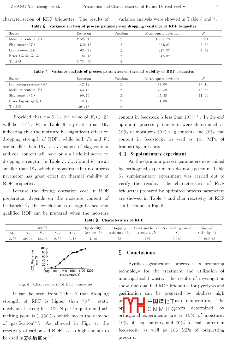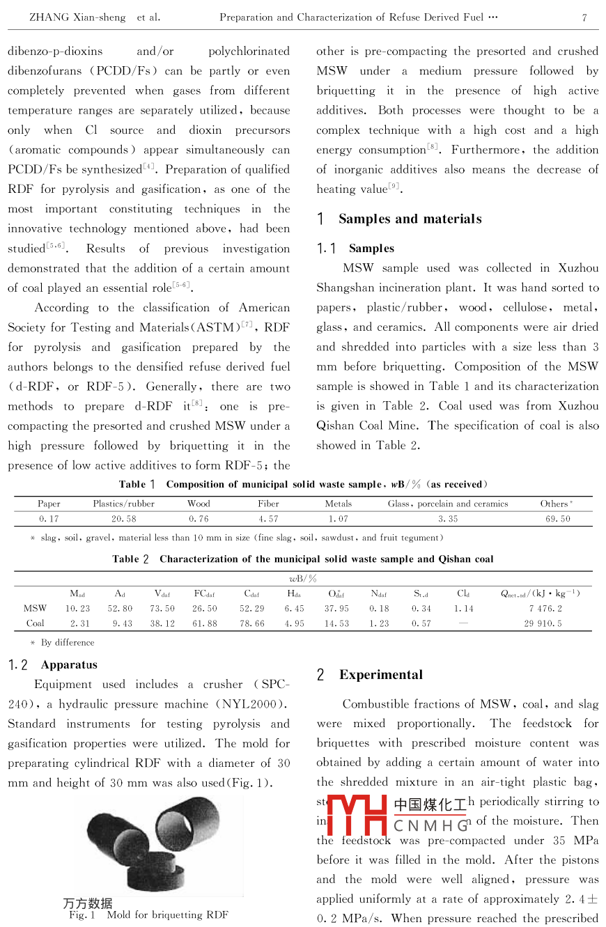 Jun.2004Journal of China University of Mining &. TechnologyVol. 14 No. 1Preparation and Characterization ofRefuse Derived Fuel for Pyrol ysisandGasification by Bindless High PressureBriquetting Technol ogyZHANG Xian-sheng(張憲生)',XIE Qiang(解強(qiáng))1.2,LI Wei(厲偉)', SHEN Ji-min(沈吉敏)'(1. School of Chemical Engineering and Technology, CUMT,Xuzhou ,Jiangsu 221008,China;2. School of Chemical and Environmental Engineering, CUMT ,Beijing 100083 China)Abstract: A new type of refuse derived fuel (RDF) for pyrolysis and gasification was prepared from municipal solidwaste (MSW ) in the presence of a small quantity of coal by bindless high pressure technology at room temperature.The physicochemical property of RDF was tested. Orthogonal experiment method was used to optimize the processparameters using dropping strength (mechanical strength) and thermal stability of the RDF as indices for quality ofRDF. The result shows that the mixture of MSW and coal with a total moisture ranging from 5% to 17% can beeasily compressed into RDF briquettes at a pressure above 70 MPa. When the briquetting pressure is higher than100 kN and moisture content is about 10%,the qualified RDF can be obtained. The orthogonal experiment showsthat the moisture can greatly affect the mechanical strength of RDF,while all the technique parameters have noobvious influence on thermal stability of RDF. The optimal parameters are a shaping pressure of 106 MPa, amoisture content of 10%,and a coal content of 20%.Key words: municipal solid waste; refuse derived fuel; preparation ; orthogonal experimentCLC number: X 705Document code: AArticle ID: 1006-1266(2004)01-0006-07Refuse derived fuel (RDF ) from municipalincineration process ”.In the light of dioxinsolid waste ( MSW ) is of manyfavorableformation mechanism an innovative technology wasperformances such as uniform size distribution,proposed and developed by the Research Center fohomogeneous composition,, high caloric value, andMSW and Biomass to Energy Technology, Chinaeasy in being handled in both transportation andUniversity of Mining and Technology. Thisstockpile.Therefore,various techniques oltechnology can be described as“preparation of RDFpreparating RDF have been developed and applied in-controlled pyrolysis of RDF at low temperaturerecent years- 1-21.Generally,RDF is utilized mainlywith the aim to dechlorination- gasification of charmeans of incineration for energy-recovery.derived from RDF pyrolysis to produce cleanHowever,some issues related to the MSW /RDF .gas”[4]. The results of TG FTIR study of RDFincineration have appeared, e. g. low combustionpyrolysis showed that during heat treatment under aefficiency,dioxin pollution, corrosion of boiler中國(guó)煤化工1evolved and aromaticcomponents caused by acidic flue gases ( mainly:THCN M H Gifferent temperatures,HCI ),which results in a high costs of theindecating that the tormation of polychlorinatedReceived date: 2003-11 -09Foundation item: Foundation of Education Department of Jjangsu Government for Commercialization of High Technology Developed inUniversities.Biograph5方數(shù)據(jù)Xian sheng(1972 ), male, from Jining, Shandong Province. Graduate student, engaged in the research on treatmentand utilization of solid wastes.ZHANG Xian-sheng et al.Preparation and Characterization of Refuse Derived Fuel ..dibenzo- p- dioxinsand/orpolychlorinatedother is pre-compacting the presorted and crusheddibenzofurans ( PCDD/Fs) can be partly or evenMSW under a medium pressure followed bycompletely prevented when gases from differentbriquetting it in the presence of high activetemperature ranges are separately utilized, becauseadditives. Both processes were thought to be aonly when Cl source and dioxinprecursorscomplex technique with a high cost and a high(aromatic compounds ) appear simultaneously canenergy consumptionl8l. Furthermore, the additionPCDD/Fs be synthesized4I. Preparation of qualifiedof inorganic additives also means the decrease ofRDF for pyrolysis and gasification, as one of theheating value[9].most important constituting techniques in theinnovative technology mentioned above, had been1Samples and materialsstudied5.60. Results of previousinvestigation1.1 Samplesdemonstrated that the addition of a certain amountMSW sample used was collected in Xuzhouof coal played an essential role[-6].Shangshan incineration plant. It was hand sorted toAccording to the classification of Americanpapers,plastic/rubber, wood, cellulose, metal,Society for Testing and Materials(ASTM)[7, RDFglass, and ceramics. All components were air driedfor pyrolysis and gasification prepared by theand shredded into particles with a size less than 3authors belongs to the densified refuse derived fuelmm before briquetting. Composition of the MSW(d- RDF,or RDF-5). Generally, there are twosample is showed in Table 1 and its characterizationmethods to prepare d-RDF it[8]: one is pre-is given in Table 2. Coal used was from Xuzhoucompacting the presorted and crushed MSW under aQishan Coal Mine. The specification of coal is alsohigh pressure followed by briquetting it in theshowed in Table 2.presence of low active additives to form RDF-5; theTable1 Composition of municipal solid waste sample, wB/ % (as received )PaperPlastics/ rubberWoodFiberMetalGlasporcelain and ceramicsOthers”0.1720. 580.764.571. 073. 3569. 50slag, soil, gravel, material less than 10 mm in size (fine slag,soil, sawdust, and fruit tegument )Table 2 Characterization of the municipal solid waste sample and Qishan coaltwB/%MadAdVarFCat .CafHaOautNatrSr.dClaQmet.nd/(kJ. kg-1)MSW10.23 52. 8073.50 26. 5052.29 6. 4537. 950. 180.341.147 476.2Coal2.319.43 38. 12 61. 8878. 664.9514. 531.230.5729 910.5t By difference1.2 Apparatus2 ExperimentalEquipment used includes a crusher ( SPC-240),a hydraulic pressure machine (NYL2000). .Combustible fractions of MSW, coal, and slagStandard instruments for testing pyrolysis andweremixed proportionally. The feedstock forgasificatio