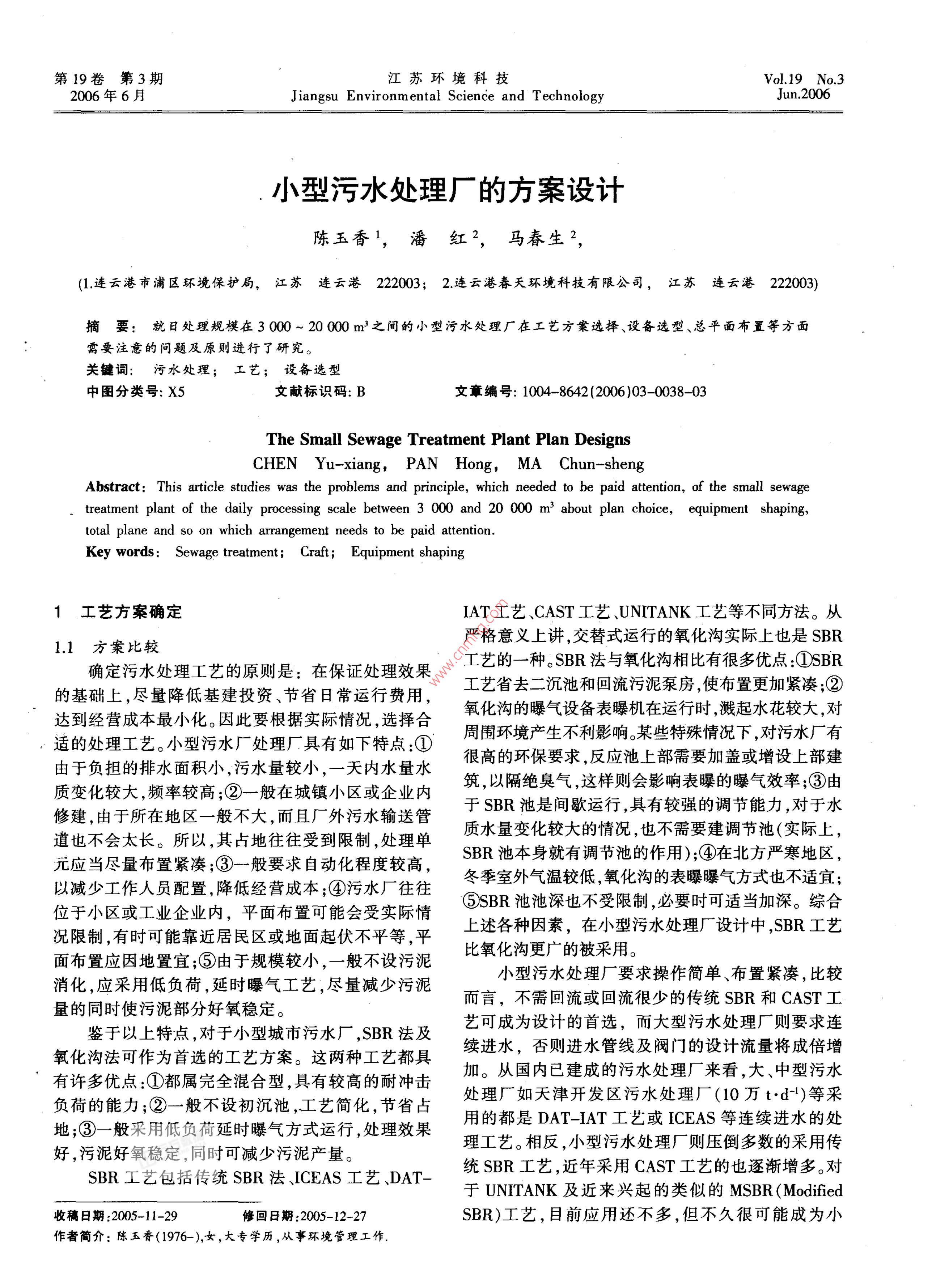 第19卷第3期江蘇環(huán)境科技Vol 19 No. 32006年6月Jiangsu Environmental Science and TechnologyJun.2006小型污水處理廠的方案設(shè)計(jì)陳玉香1,潘紅?,馬春生2,(1連云港市浦區(qū)環(huán)境保護(hù)局,江蘇連云港2220032:連云港春天環(huán)境科技有限公司,江蘇連云港22203摘要:就日處理規(guī)模在3000~加0000m3之間的小型污水處理廠在工藝方案選擇、設(shè)備選型、總平面布置等方面需要注意的問題及原則進(jìn)行了研究關(guān)鍵詞:污水處理;工藝;設(shè)備選型中圖分類號:X5文獻(xiàn)標(biāo)識碼:B文章編號:1004-8642(2006)03-0038-03The Small Sewage Treatment Plant Plan designsChen Yu-xiang, PAn Hong, MA Chun-shengAbstract: This article studies was the problems and principle, which needed to be paid attention, of the small sewagetreatment plant of the daily processing scale between 3 000 and 20 000 m'about plan choice, equipment shapingtotal plane and so on which arrangement needs to be paid attentionKey words: Sewage treatment; Craft; Equipment shaping1工藝方案確定IAT工藝、CAST工藝、 UNITANK工藝等不同方法。從1.1方案比較嚴(yán)格意義上講,交替式運(yùn)行的氧化溝實(shí)際上也是SBR是:在保證處理效果藝的一種。SBR法與氧化溝相比有很多優(yōu)點(diǎn):①SBR的基礎(chǔ)上,盡量降低基建投資、節(jié)省日常運(yùn)行費(fèi)用,工藝省去二沉池和回流污泥泵房,使布置更加緊湊;②達(dá)到經(jīng)營成本最小化。因此要根據(jù)實(shí)際情況,選擇合氧化溝的曝氣設(shè)備表曝機(jī)在運(yùn)行時(shí)濺起水花較大對適的處理工藝。小型污水廠處理廠具有如下特點(diǎn)①周圍環(huán)境產(chǎn)生不利影響某些特殊情況下,對污水廠有由于負(fù)擔(dān)的排水面積小,污水量較小,一天內(nèi)水量水很高的環(huán)保要求,反應(yīng)池上部需要加蓋或增設(shè)上部建質(zhì)變化較大,頻率較高;②一般在城鎮(zhèn)小區(qū)或企業(yè)內(nèi)筑,以隔絕臭氣,這樣則會影響表曝的曝氣效率;③由修建,由于所在地區(qū)一般不大,而且廠外污水輸送管于SBR池是間歇運(yùn)行,具有較強(qiáng)的調(diào)節(jié)能力,對于水道也不會太長。所以,其占地往往受到限制,處理單質(zhì)水量變化較大的情況,也不需要建調(diào)節(jié)池(實(shí)際上,元應(yīng)當(dāng)盡量布置緊湊;③一般要求自動(dòng)化程度較高,SBR池本身就有調(diào)節(jié)池的作用);④在北方嚴(yán)寒地區(qū)以減少工作人員配置,降低經(jīng)營成本;④污水廠往往冬季室外氣溫較低氧化溝的表曝曝氣方式也不適宜;位于小區(qū)或工業(yè)企業(yè)內(nèi),平面布置可能會受實(shí)際情⑤SBR池池深也不受限制,必要時(shí)可適當(dāng)加深。綜合況限制,有時(shí)可能靠近居民區(qū)或地面起伏不平等,平述各種因素,在小型污水處理廠設(shè)計(jì)中,SBR工藝面布置應(yīng)因地置宜;⑤由于規(guī)模較小,一般不設(shè)污泥比氧化溝更廣的被采用。消化,應(yīng)采用低負(fù)荷,延時(shí)曝氣工藝,盡量減少污泥小型污水處理廠要求操作簡單、布置緊湊,比較量的同時(shí)使污泥部分好氧穩(wěn)定。而言,不需回流或回流很少的傳統(tǒng)SBR和CAST工鑒于以上特點(diǎn),對于小型城市污水廠,SBR法及藝可成為設(shè)計(jì)的首選,而大型污水處理廠則要求連氧化溝法可作為首選的工藝方案。這兩種工藝都具續(xù)進(jìn)水,否則進(jìn)水管線及閥門的設(shè)計(jì)流量將成倍增有許多優(yōu)點(diǎn):①都屬完全混合型,具有較高的耐沖擊加。從國內(nèi)已建成的污水處理廠來看,大、中型污水負(fù)荷的能力;②一般不設(shè)初沉池,工藝簡化,節(jié)省占處理廠如天津開發(fā)區(qū)污水處理廠(10萬td4)等采地;③一般采用低負(fù)荷延時(shí)曝氣方式運(yùn)行處理效果用的都是 DAT-IAT工藝或 ICEAS等連續(xù)進(jìn)水的處好,污泥好氧穩(wěn)定,同時(shí)可減少污泥產(chǎn)量。理工藝。相反,小型污水處理廠則壓倒多數(shù)的采用傳SBR工藝包括傳統(tǒng)SBR法 ICEAS工藝、DAT統(tǒng)SBR工藝,近年采用CAST工藝的也逐漸增多。對于 UNITANK及近來興起的類似的MsBR( Modified收稿日期:2005-11-29修回日期:2005-12-27SBR)工藝,目前應(yīng)用還不多,但不久很可能成為小作者簡介:陳玉香(1976-),女,大專學(xué)歷,從事環(huán)境管理工作第19卷第3期程玉香等小型污水處理廠的方案設(shè)計(jì)39型污水處理廠的熱門工藝柵間往往有上部建筑,則增加了土建投資。所以在柵1.2CAST工藝的評述渣量不是很多的情況下,如果計(jì)算得格柵較小,可采CAST工藝是近年來在傳統(tǒng)SBR工藝上發(fā)展起用人工格柵代替機(jī)械格柵。來的一種新型工藝,它是利用不同微生物在不同負(fù)23沉砂池荷條件下生長速率差異和污水生物除磷脫氮機(jī)理,沉砂池一般選用鐘式沉砂池或類似產(chǎn)品。如果將生物選擇器與傳統(tǒng)SBR反應(yīng)器相結(jié)合的產(chǎn)物。這鐘式沉砂池池徑不太大,沉砂池可采用碳鋼制成的種工藝綜合了推流式活性污泥法的初始反應(yīng)條件成套設(shè)備。另外沉砂池進(jìn)出水渠也可采用相應(yīng)碳鋼(具有基質(zhì)濃度梯度和較高的絮體負(fù)荷)和完全活性制作。這樣不僅方便施工安裝,而且由于尺寸較小,污泥法的優(yōu)點(diǎn)(較強(qiáng)的耐沖擊負(fù)荷能力),無論對城造價(jià)經(jīng)濟(jì)可行。市污水還是工業(yè)廢水都很有效,并能有效地防