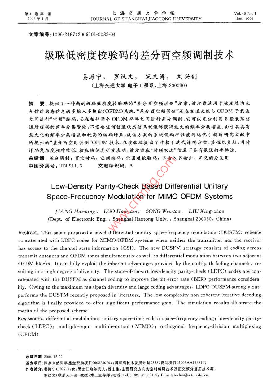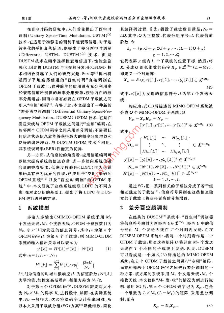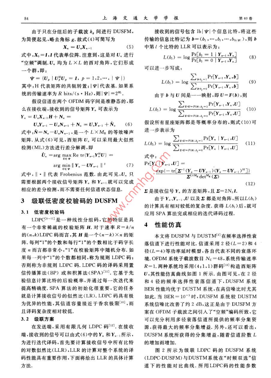 第40卷第1期上海交通大學(xué)學(xué)報2006年1月JOURNAL OF SHANGHAI JIAOTONG UNIVERSITYJan.2006文章編號:10062467(2006)01008204級聯(lián)低密度校驗碼的差分酉空頻調(diào)制技術(shù)姜海寧,羅漢文,宋文濤,劉興釗(上海交通大學(xué)電子工程系,上海200030)摘要:提出了一種新的級聯(lián)低密度校驗碼的“差分酉空頻調(diào)制”方案,該方案適用于收發(fā)端均未知信道狀態(tài)信息的多輸入多輸出(OFDM)系統(tǒng).“差分酉空頻調(diào)制”是在發(fā)送天線與OFDM子載波之間進(jìn)行“空頻”編碼,而在相鄰兩個OFDM碼字之間進(jìn)行差分調(diào)制,它可以充分利用多徑衰落信道所提供的頻率分集資源,不需要任何信道狀態(tài)信息就能夠獲得最大的頻率分集增益.由于其具有最大化的頻率分集增益和較高的編碼增益,故該方案的系統(tǒng)誤碼率性能遠(yuǎn)遠(yuǎn)優(yōu)于新近研究文獻(xiàn)中所提出的“差分酉空時調(diào)制”O(jiān)FDM技術(shù),在接收端提出了非相干迭代譯碼方案,其性能良好,同時譯碼復(fù)雜度相對較低.相應(yīng)的仿真研究表明,該方案在“時頻雙選”信道下具有很強的魯摔性關(guān)鍵詞:差分調(diào)制;酉空時碼;空頻編碼;低密度校驗碼;多輸入多輸出;正交頻分復(fù)用中圖分類號:TN911.3文獻(xiàn)標(biāo)識碼:ALow-Density Parity-Check Based Differential UnitarySpace-Frequency Modulation for MIMO-OFDM SystemsJIANG Hai-ning, LUO Han-wen, SONG Wen-tao, LIU Xing-zhaoDept. of Electronic Eng, Shanghai Jiaotong Univ, Shanghai 200030, China)Abstract: This paper proposed a novel differential unitary space-frequency modulation(DUSFM) schemeconcatenated with LDPC codes for MIMO-OFDM systems when neither the transmitter nor the receiverhas access to the channel state information (CSI). The new dUSFM strategy consists of coding acrosstransmit antennas and OFDM tones simultaneously as well as differential modulation between two adjacentOFDM blocks. It can fully exploit the inherent advantages provided by the multipath fading channels, re-sulting in a high degree of diversity. The state-of-the-art low-density parity-check(LDPC) codes are concatenated with the DUSFM as channel coding to improve the bit error rate(Ber) performance considera-bly. Owing to the maximum multipath diversity and large coding advantages, LDPC-DUSFM strongly out-performs the DUSTM recently proposed in literature. The low-complexity non-coherent iterative decodingalgorithm is finally provided to offer significant performance gain. The simulation results illustrate themerits of the premeKey words: differential modulation; unitary space-time codes; space-frequency coding; low-density parity-check( LDPC ): multiple-input multiple-ontput( MIMO); orthogonal frequency-division multiplexing(OFDM)收稿日期:2004-1209基金項目:國家自然科學(xué)基金資助項目(60272079);國家高技術(shù)發(fā)展計劃(863)資助項目(2003AA123310)作者簡介:姜海寧(1977-),女,黑龍江哈爾濱人,博士生,主要研究方向為空時編碼技術(shù)及正交頻分復(fù)用技術(shù)等羅漢文(聯(lián)系人),男,教授,博士生導(dǎo)師,電話(Tel.):021-62932159; E-mail: heluo@sjtu.edu,cn第1期姜海寧,等:級聯(lián)低密度校驗碼的差分酉空頻調(diào)制技術(shù)在盲空時碼的研究中,人們首先提出了酉空時其編譯碼過程.首先,假設(shè)子載波數(shù)目滿足:Nc=調(diào)制( Unitary Space-Time Modulation,USTM)LQ.其中:Q為正整數(shù),代表分組序號;L代表信道技術(shù),它適用于準(zhǔn)靜態(tài)的瑞利平坦衰落信道;對于連階數(shù).令續(xù)變化的平坦衰落信道,則提出了差分酉空時調(diào)制={g,Q+g,2Q+g,…,CL-1)Q+g( Differential USTM, DUSTM)(2)技術(shù),但是DUSTM技術(shù)在頻率選擇性衰落信道下,性能急劇它代表第g組內(nèi)L個子載波的位置下標(biāo),然后,將惡化因此將 DUSTM與正交頻分復(fù)用(OFDM)技X分成Q組低維數(shù)的碼字X?!省瓿鯩(L=M),術(shù)相結(jié)合引起了人們的研究興趣.Sun等提出將即定義一個對角陣:適用于平坦衰落信道的“酉空時碼”直接調(diào)制在X。=dagx1],x2],…,xM,[L]∈£OFDM子載波上,這種簡單的應(yīng)用沒有充分利用多徑衰落信道所提供的頻率分集資源獲得內(nèi)在的頻式中,x[k為發(fā)送的信息符號,i為第i個發(fā)送天率分集增益,因而非常有必要在OFDM子載波之間線引入“空頻”編碼.有鑒于此,本文提出了一種新的相應(yīng)地,式(1)所描述的 MIMO-OFDM系統(tǒng)被“差分西空頻調(diào)制”( Differential Unitary Space-Fre-分成Q個 MIMO-OFDM子系統(tǒng),即quency Modulation, DUSFM)OFDM技術(shù),它是在發(fā)送天線與OFDM子載波之間進(jìn)行“空頻”編碼,在[y[1],y[2],…,y[L]∈£1k(3)相鄰兩個OFDM碼字之間采用差分調(diào)制,不需要任式中何信道狀態(tài)信息就能夠獲得最大的頻率分集增益和H1[]HiM. [1]良好的編碼增益,與 DUSTM OFDM技術(shù)3相比,£MM其系統(tǒng)誤碼率(BER)性能更為優(yōu)異HM[L]…HMM[L]另一方面,從信息論的角度看,應(yīng)用信道編碼可以極大提高系統(tǒng)的信道容量,進(jìn)一步趨向系統(tǒng)信道y[]=[[],…,y]∈£容量的香農(nóng)極限.低密度校驗碼(LDPC)作為信道N=[N[1],N[2],…,N[L]]∈£編碼具有極為優(yōu)異的性能已應(yīng)用于“空時”編碼的N[k]=[N[k],…,NM4[k]]∈£MOFDM系統(tǒng)6以及“酉空時調(diào)制”的OFDM系k=1,2,…,L統(tǒng){中,本文研究了這些系統(tǒng)級聯(lián)LDPC的不同方通過SG,把一系列相關(guān)的子載波分成了若干組案,在對比分析的基礎(chǔ)上,提出了將LDPC與DUS相互獨立的子載波,信息符號調(di