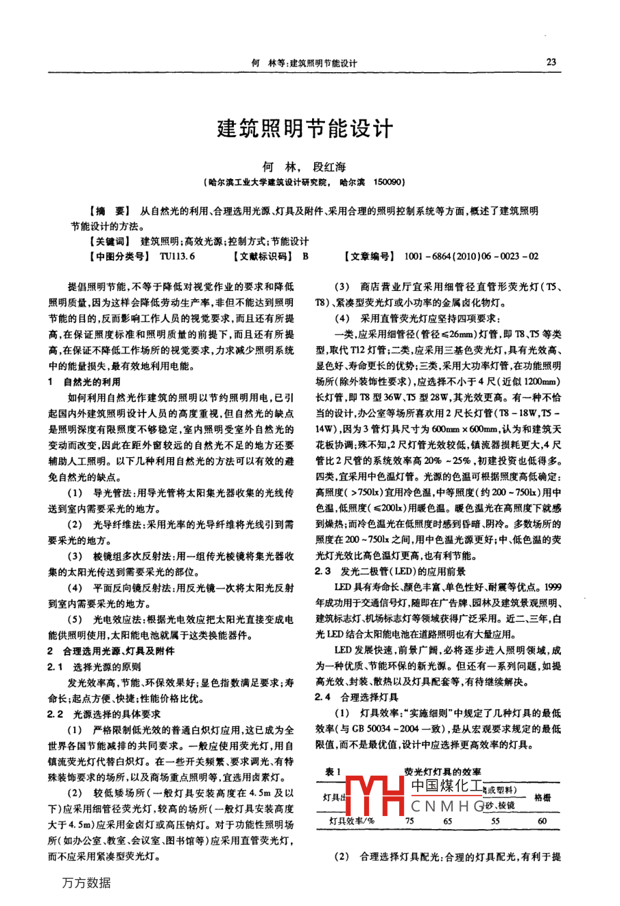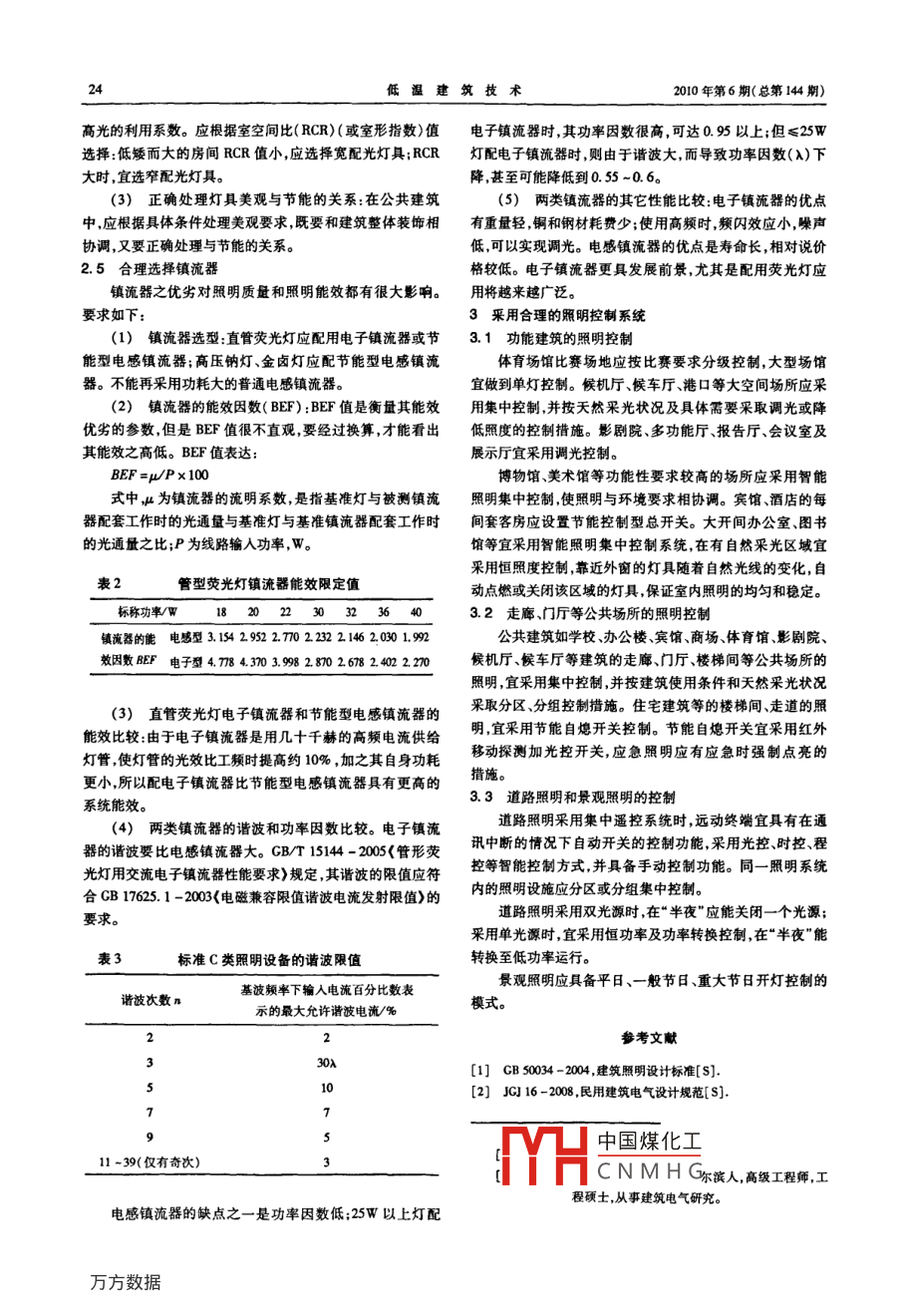何林等:建筑照明節(jié)能設(shè)計建筑照明節(jié)能設(shè)計何林,段紅海哈爾濱工業(yè)大學(xué)建筑設(shè)計研究院,哈爾濱150090)【摘要】從自然光的利用、合理選用光源燈具及附件、釆用合理的照明控制系統(tǒng)等方面概述了建筑照明節(jié)能設(shè)計的方法?!娟P(guān)鍵詞】建筑照明;高效光源;控制方式;節(jié)能設(shè)計【中圖分類號】TU.6【文獻(xiàn)標(biāo)識碼】B【文章編號】1001-6864(2010)06-0023-02提倡照明節(jié)能,不等于降低對視覺作業(yè)的要求和降低(3)商店?duì)I業(yè)廳宜采用細(xì)管徑直管形熒光燈(T、照明質(zhì)量,因?yàn)檫@樣會降低勞動生產(chǎn)率,非但不能達(dá)到照明18)緊湊型熒光燈或小功率的金屬鹵化物燈。節(jié)能的目的,反而影響工作人員的視覺要求,而且還有所提(4)采用直管熒光燈應(yīng)堅(jiān)持四項(xiàng)要求:高,在保證照度標(biāo)準(zhǔn)和照明質(zhì)量的前提下,而且還有所提一類應(yīng)采用細(xì)管徑(管徑≤26mm)燈管,即T8、T等類高,在保證不降低工作場所的視覺要求,力求減少照明系統(tǒng)型取代T2燈管;二類,應(yīng)采用三基色熒光燈,具有光效高中的能量損失,最有效地利用電能。顯色好、壽命更長的優(yōu)勢;三類采用大功率燈管在功能照明1自然光的利用場所(除外裝飾性要求),應(yīng)選擇不小于4尺(近似1200mm)如何利用自然光作建筑的照明以節(jié)約照明用電,已引長燈管,即T8型36W、T型28W,其光效更高。有一種不恰起國內(nèi)外建筑照明設(shè)計人員的高度重視,但自然光的缺點(diǎn)當(dāng)?shù)脑O(shè)計,辦公室等場所喜歡用2尺長燈管(T8-18W,T5是照明深度有限照度不夠穩(wěn)定,室內(nèi)照明受室外自然光的14W),因?yàn)?管燈具尺寸為600mmx600mm,認(rèn)為和建筑天變動而改變,因此在距外窗較遠(yuǎn)的自然光不足的地方還要花板協(xié)調(diào)殊不知2尺燈管光效較低,鎮(zhèn)流器損耗更大4尺輔助人工照明。以下幾種利用自然光的方法可以有效的避管比2尺管的系統(tǒng)效率高20%-25%,初建投資也低得多。免自然光的缺點(diǎn)。四類,宜采用中色溫?zé)艄?。光源的色溫可根?jù)照度高低確定(1)導(dǎo)光管法:用導(dǎo)光管將太陽集光器收集的光線傳高照度(>750x)宜用冷色溫,中等照度(約200-750-)用中送到室內(nèi)需要采光的地方。色溫,低照度(≤200x)用暖色溫。暖色溫光在高照度下就感(2)光導(dǎo)纖維法:采用光率的光導(dǎo)纖維將光線引到需到燥熱;而冷色溫光在低照度時感到昏暗、陰冷。多數(shù)場所的要采光的地方。照度在200-750x之間用中色溫光源更好;中、低色溫的熒(3)棱鏡組多次反射法用一組傳光棱鏡將集光器收光燈光效比高色溫?zé)舾咭灿欣?jié)能。集的太陽光傳送到需要采光的部位。23發(fā)光二極管(LED)的應(yīng)用前景(4)平面反向鏡反射法:用反光鏡一次將太陽光反射IED具有壽命長顏色豐富、單色性好、耐震等優(yōu)點(diǎn)。19到室內(nèi)需要采光的地方年成功用于交通信號燈隨即在廣告牌、園林及建筑景觀照明、(5)光電效應(yīng)法:根據(jù)光電效應(yīng)把太陽光直接變成電建筑標(biāo)志燈機(jī)場標(biāo)志燈等領(lǐng)域獲得廣泛采用。近二、三年,白能供照明使用,太陽能電池就屬于這類換能器件。光LED結(jié)合太陽能電池在道路照明也有大量應(yīng)用。2合理選用光源、燈具及附件LED發(fā)展快速,前景廣闊,必將逐步進(jìn)入照明領(lǐng)域,成2.1選擇光源的原則為一種優(yōu)質(zhì)、節(jié)能環(huán)保的新光源。但還有一系列問題,如提發(fā)光效率高節(jié)能、環(huán)保效果好;顯色指數(shù)滿足要求;壽高光效、封裝、散熱以及燈具配套等,有待繼續(xù)解決。命長;起點(diǎn)方便、快捷;性能價格比優(yōu)。24合理選擇燈具22光源選擇的具體要求(1)燈具效率:“實(shí)施細(xì)則”中規(guī)定了幾種燈具的最低(1)嚴(yán)格限制低光效的普通白熾燈應(yīng)用這已成為全效率(與GB50034-2004-致),是從宏觀要求規(guī)定的最低世界各國節(jié)能減排的共同要求。一般應(yīng)使用熒光燈,用自限值而不是最優(yōu)值設(shè)計中應(yīng)選擇更高效率的燈具。鎮(zhèn)流熒光燈代替白熾燈。在一些開關(guān)頻繁、要求調(diào)光、有特殊裝飾要求的場所,以及商場重點(diǎn)照明等,宜選用鹵素?zé)魺晒鉄魺艟叩男?2)較低矮場所(一般燈具安裝高度在4.5m及以中國煤化工燈具粵或塑料)柵下)應(yīng)采用細(xì)管徑熒光燈,較高的場所(一般燈具安裝高度CNMHG砂棱鏡大于4.5m)應(yīng)采用金鹵燈或高壓鈉燈。對于功能性照明場燈具效率/%所(如辦公室、教室、會議室、圖書館等)應(yīng)采用直管熒光燈,而不應(yīng)采用緊湊型熒光燈。(2)合理選擇燈具配光:合理的燈具配光有利于提建筑技術(shù)I0年第6期(總第144期)高光的利用系數(shù)。應(yīng)根據(jù)室空間比(RCR)(或室形指數(shù))值電子鎮(zhèn)流器時,其功率因數(shù)很高,可達(dá)095以上;但≤25W選擇:低矮而大的房間RCR值小,應(yīng)選擇寬配光燈具;RCR燈配電子鎮(zhèn)流器時則由于諧波大,而導(dǎo)致功率因數(shù)(A)下大時,宜選窄配光燈具。降甚至可能降低到0.55-0.6。(3)正確處理燈具美觀與節(jié)能的關(guān)系:在公共建筑(5)兩類鎮(zhèn)流器的其它性能比較:電子鎮(zhèn)流器的優(yōu)點(diǎn)中,應(yīng)根據(jù)具體條件處理美觀要求既要