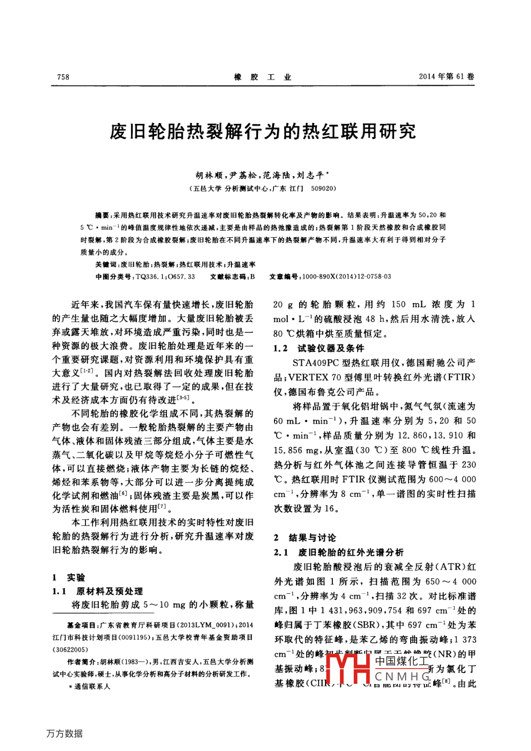 758橡膠工業(yè)2014年第61卷廢舊輪胎熱裂解行為的熱紅聯(lián)用研究胡林順,尹荔松,范海陸,劉志平(五邑大學分析測試中心,廣東江門509020)摘要:采用熱紅聯(lián)用技術研究升溫速率對廢舊輪胎熱裂解轉化率及產(chǎn)物的影響。結果表明:升溫速率為50,20和5℃·min-1的峰值溫度規(guī)律性地依次遞減,主要是由樣品的熱弛豫造成的;熱裂解第1階段天然橡膠和合成橡膠同時裂解第2階段為合成橡膠裂解;廢舊輪胎在不同升溫速率下的熱裂解產(chǎn)物不同,升溫速率大有利于得到相對分子質量小的成分關鍵詞:廢舊輪胎;熱裂解;熱紅聯(lián)用技術;升溫速率中圖分類號:TQ336.1;0657.33文獻標志碼:B文章編號:1000-890X(2014)120758-03近年來,我國汽車保有量快速增長,廢舊輪胎20g的輪胎顆粒,用約150mL濃度為1的產(chǎn)生量也隨之大幅度增加。大量廢舊輪胎被丟mol·L的硫酸浸泡48h,然后用水清洗,放入棄或露天堆放,對環(huán)境造成嚴重污染,同時也是一80℃烘箱中烘至質量恒定。種資源的極大浪費。廢舊輪胎處理是近年來的1.2試驗儀器及條件個重要研究課題,對資源利用和環(huán)境保護具有重STA409PC型熱紅聯(lián)用儀,德國耐馳公司產(chǎn)大意義12,國內對熱裂解法回收處理廢舊輪胎品; VERTEX70型傅里葉轉換紅外光譜(FTIR)進行了大量研究,也已取得了一定的成果,但在技儀,德國布魯克公司產(chǎn)品。術及經(jīng)濟成本方面仍有待改進5不同輪胎的橡膠化學組成不同,其熱裂解的將樣品置于氧化鋁坩鍋中,氮氣氣氛(流速為產(chǎn)物也會有差別。一般輪胎熱裂解的主要產(chǎn)物由60mL·min-1),升溫速率分別為5,20和50氣體、液體和固體殘渣三部分組成,氣體主要是水℃·min-1,樣品質量分別為12.860,13.910和蒸氣、二氧化碳以及甲烷等烷烴小分子可燃性氣15.856mg,從室溫(30℃)至800℃線性升溫。體,可以直接燃燒;液體產(chǎn)物主要為長鏈的烷烴熱分析與紅外氣體池之間連接導管恒溫于230烯烴和苯系物等,大部分可以進一步分離提純成℃。熱紅聯(lián)用時FTIR儀測試范圍為600~400化學試劑和燃油);固體殘渣主要是炭黑,可以作cm,分辨率為8cm-1,單一譜圖的實時性掃描為活性炭和固體燃料使用[。次數(shù)設置為16。本工作利用熱紅聯(lián)用技術的實時特性對廢舊輪胎的熱裂解行為進行分析,研究升溫速率對廢2結果與討論舊輪胎熱裂解行為的影響。2.1廢舊輪胎的紅外光譜分析廢舊輪胎酸浸泡后的衰減全反射(ATR)紅1實驗外光譜如圖1所示,掃描范圍為650~40001.1原材料及預處理cm-1,分辨率為4cm-1,掃描32次。對比標準譜將廢舊輪胎剪成5~10mg的小顆粒,稱量庫,圖1中1431,963,909,754和697cm處的基金項目:廣東省教育廳科研項目(2013LYM_091);2014峰歸屬于丁苯橡膠(SBR),其中697cm-1處為苯江門市科技計劃項目(009195);五邑大學校青年基金資助項目環(huán)取代的特征峰,是苯乙烯的彎曲振動峰;1373(30622005)cm-1處的峰智作者簡介:胡林順(1983-),男,江西吉安人,五邑大學分析測中國煤化⊥(NR)的甲試中心實驗師,碩士從事化學分析和高分子材料的分析研發(fā)工作基振動峰;8CNMH為氯化于通信聯(lián)系人基橡膠(CI4能以媽證峰8。由此第12期胡林順等.廢舊輪胎熱裂解行為的熱紅聯(lián)用研究7590.085001000150020002500300035004000波數(shù)/cm-10100200300400500600700800溫度/℃圖1硫酸浸泡后的廢舊輪胎ATR紅外光譜(a)TG初步判斷該廢舊輪胎的成分主要為SBR,NR和CIR。2.2廢舊輪胎的熱裂解分析3種不同升溫速率下的熱重(TG)和熱質量損失率(DTG)曲線如圖2所示。由圖2(b)可見,熱裂解為兩個階段,第1階段主要為NR的裂解,5E水第2階段主要為合成橡膠(SR)的熱裂解,其階段峰值溫度(Tmx)以及時間(t)相關數(shù)據(jù)見表1。25對比第1和2階段的峰值溫度可以看到,升溫速0100200300400500600700800率50,20和5℃·min-1的峰值溫度規(guī)律性地依溫度/℃次遞減,這主要是由樣品的熱弛豫造成的。升溫速率/(℃·min-1):1-5樣品的差示掃描量熱(DSC)曲線如圖3所圖2廢舊輪胎熱分析的TG和DTG曲線表1廢舊輪胎熱裂解兩個階段的峰值溫度相對應的時間點及其質量保持率升溫速率/質量保持率/%Rt1/mint2/minTmx/℃76.8067.5437.0342.5541.275.32391.0457.021.878.34400.07.7468.0387.3619.0現(xiàn)為兩個階段,均表現(xiàn)為放熱峰,400℃之前的放放熱熱峰主要為NR的解聚,對應TG曲線中的第1階段;緊接著出現(xiàn)第2階段的裂解放熱,主要是SR的裂解,對應TG曲線中的第2階段3種升溫速率的裂解產(chǎn)物質量保持率相差很小,但是反應時間卻相差很大,從時效性方面考慮高速升溫有利。對比表1中DTG和DSC的峰值溫度,第1階段DTG高于DSC,第2階段DTG0100200300400500600700800卻低于DSC,進一步說明第2階段主要為SR裂注同圖2。解,因為SR的活化能大于NR。圖3廢舊輪胎熱裂解的DSC曲線2.3裂解產(chǎn)竹公中國煤化工示。由圖3可見,隨升溫速率減小,峰值溫度同樣不同升譜如圖4所為依次遞減(詳細數(shù)據(jù)見表1),DSC曲線同樣表示。由圖4CNMHG速率下的熱760橡膠工業(yè)2014年第61卷1454cm-1處苯環(huán)的振動峰、3020和3074cm-1處苯環(huán)上的碳氫鍵振動峰,說明第1階段NR和0.020SR同時發(fā)生熱裂解。第1階段升溫速率為50.015℃·min-1的裂解產(chǎn)物紅外光譜中1377和14610.010cmˉ處的兩個峰的峰強度明顯較弱,甲基和亞甲0.005基數(shù)目相對較少,說明低升溫速率時NR斷鏈成8000分子鏈更長的成分。由此可得出,快速升溫有利0.0056000于橡膠中高分子裂解成相對分子質