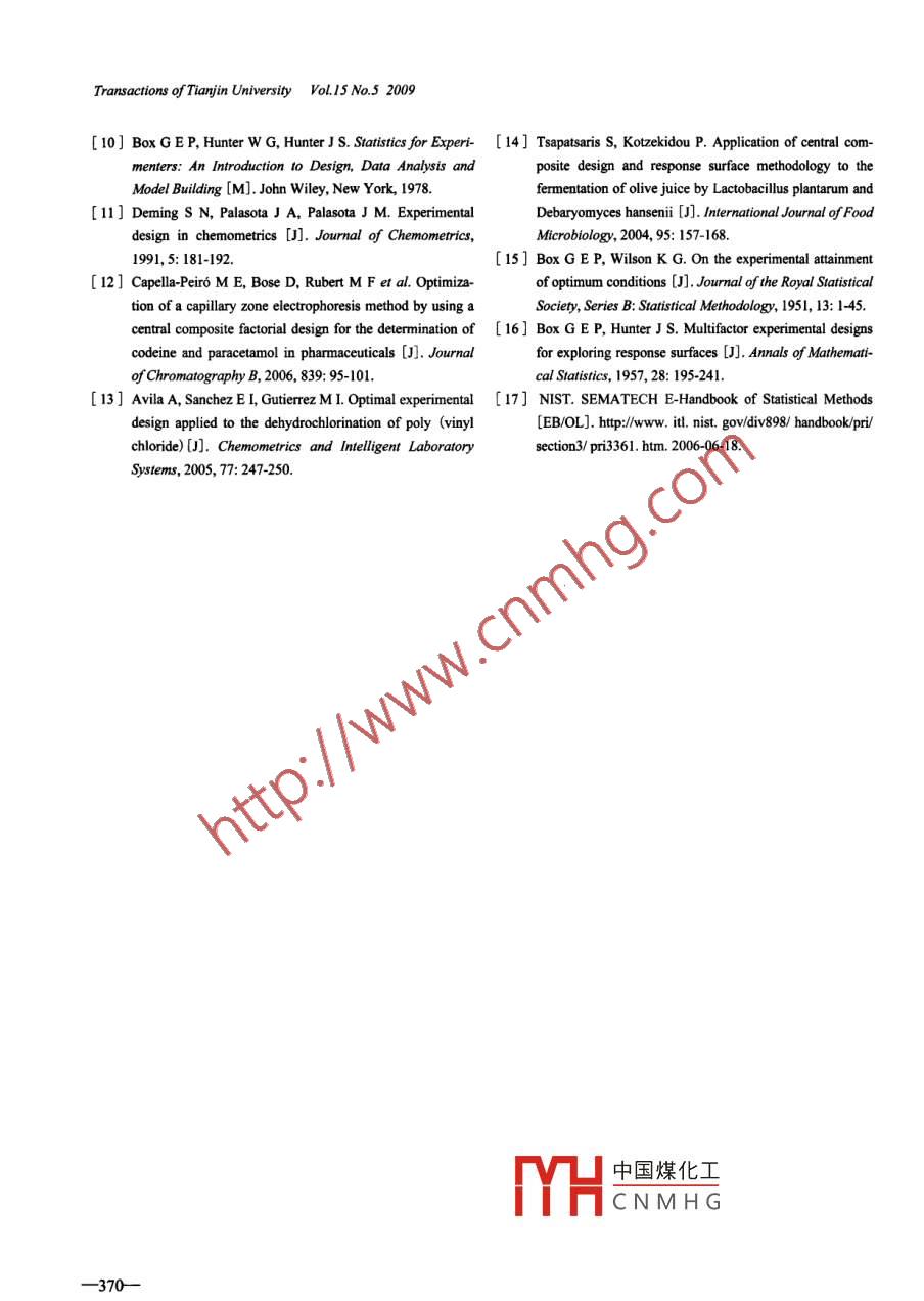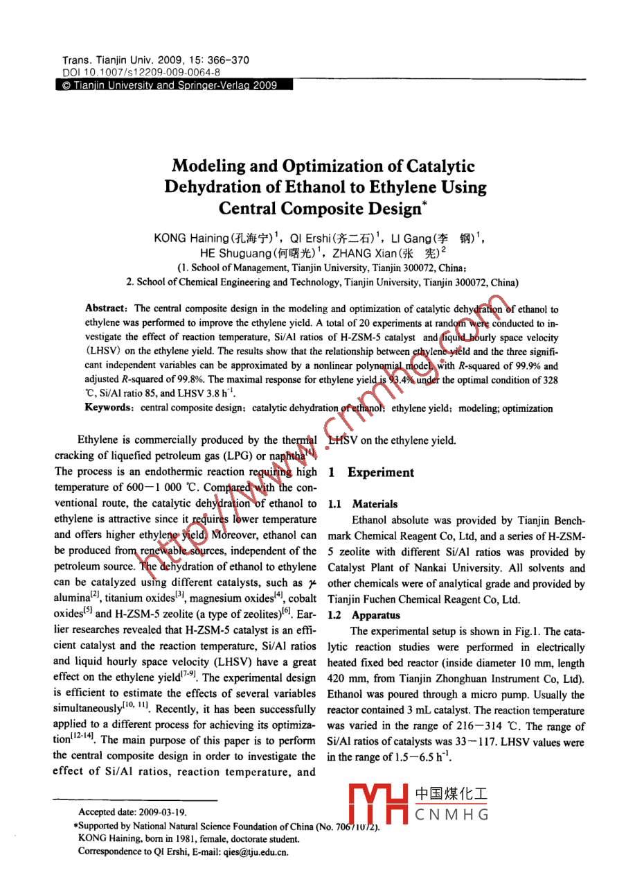 Trans. Tianjin Univ. 2009, 15: 366-370DOl10.1007/s1220900900648Modeling and optimization of catalyticDehydration of Ethanol to Ethylene UsingCentral Composite DesignKONG Haining(孔海寧), QI Ers(齊二石)1, LI Gang(李鋼)',HE Shuguang(何曙光)1, ZHANG Xian(張憲)2(1. School of Management, Tianjin University, Tianjin 300072, China;2. School of Chemical Engineering and Technology, Tianjin University, Tianjin 300072, China)Abstract: The central composite design in the modeling and optimization of catalytic dehydration of ethanol toethylene was performed to improve the ethylene yield. A total of 20 experiments at random were conducted to in-vestigate the effect of reaction temperature, Si/Al ratios of H-ZSM-5 catalyst and liquid hourly space velocity(LHSV) on the ethylene yield. The results show that the relationship between ethylene yield and the three signifi-cant independent variables can be approximated by a nonlinear polynomial model, with R-squared of 99.9%andadjusted R-squared of 99.8%. The maximal response for ethylene yield is 93. 4% under the optimal condition of 328C. Si/Al ratio 85 and LHSV 3.8h 1Keywords: central composite design: catalytic dehydration of ethanol; ethylene yield; modeling; optimizationEthylene is commercially produced by the thermal LHSv on the ethylene yieldcracking of liquefied petroleum gas(LPG) or naphthaThe process is an endothermic reaction requiring high 1 Experimenttemperature of 600-1 000 C. Compared with the con-ventional route, the catalytic dehydration of ethanol to 1.1 Materialsethylene is attractive since it requires lower temperature Ethanol absolute was provided by Tianjin Bench-and offers higher ethylene yield. Moreover, ethanol can mark Chemical Reagent Co, Ltd, and a series of H-ZSM-be produced from renewable sources, independent of the 5 zeolite with different Si/Al ratios was provided bypetroleum source. The dehydration of ethanol to ethylene Catalyst Plant of Nankai University. All solvents andcan be catalyzed using different catalysts, such as x other chemicals were of analytical grade and provided byalumina, titanium oxides), magnesium oxides+, cobalt Tianjin Fuchen Chemical Reagent Co, Ltdoxides'5)and H-ZSM-5 zeolite(a type of zeolites)(6). Ear- 1.2 apparatuslier researches revealed that H-ZSM-5 catalyst is an effi-The experimental setup is shown in Fig. 1. The catacient catalyst and the reaction temperature, Si/Al ratios lytic reaction studies were performed in electricallyand liquid hourly space velocity(LHSV) have a great heated fixed bed reactor(inside diameter 10 mm,lengtheffect on the ethylene yield! -). The experimental design 420 mm, from Tianjin Zhonghuan Instrument Co, Ltd)is efficient to estimate the effects of several variables Ethanol was poured through a micro pump. Usually theRecently, it has been successfully reactor contained 3 mL catalyst. The reaction temperatureapplied to a different process for achieving its optimiza- was varied in the range of 216-314 C. The range oftion. The main purpose of this paper is to perform si/Al ratios of catalysts was 33-117. LHSV values werethe central composite design in order to investigate the in the range of 1.5-65h.effect of Si/Al ratios, reaction temperature, and中國煤化工Accepted date: 2009-03-19CNMHGSupported by National Natural Science Foundation of China(No. 70671UKONG Haining, bom in 1981, female doctorate student.CorrespondencetoQIErshi,E-mail:qies@tju.edu.cnKONG Haining et al: Catalytic Dehydration of Ethanol to EthylenGas chromatograph1.3 Analysis of productsb2x x2+i x,X,+b2x2x,The products were analysed on gas chromatograph where Y is the predicted response(ethylene yield); bo isSP-3420( Bejing Beifen Instrument Co, Ltd )with flame the average of the results of all experiments; b, bz and byionization detector( FID)using PEG 20 000 capillary are the main half-effects of the coded factors X, X, andcolumn by programming the oven temperature in the X, respectively; bu, bz and ba3 are the quadratic effectsrange of60-10℃atl℃/minb12, b13 and b23 are two-factor interaction half-effects1.4 Experimental designThe design and analysis of the central compositeThe central composite design is an ettective experiment were carried out with Minitab. The experi-higher-order experimental design method, which seeks ments were conducted in a randomized order to avoidthe optimal conditions for a multivariable system, butsystematic bias. The central composite experimental de-requires much fewer experiments than a full factorialsign is shown in Tab. 2design method and has been shown to be sufficient todescribe the majority of steady-state process respTab2 Central composite experimental designThis paper performs the central composite design of three Standard Runorderorderfactors. The 20 experiments were performed at randorThe central composite experimental factors and level val68272.6ues are shown in Tab. 15341.6820Tab1 Experimental factors and levels in dehydration ofethanol to ethylene68.915913Factor85.72162503003501.68275.720The factors in this experiment are X (reaction tem-0010001010001000perature, C), X2(Si/Al ratios)and X,(LHSV,hThe central composite design is mainly employed in or-16-1.682der to produce a detailed model(Eq (1)), and investigateits linear, interaction and higher-order(quadratic) terms中國煤化工-1682774Y=bo+bx,+b2x2+b,x,+CNMHG88.7b1X2+b2X2+b3x2+Transactions of Tian in UniversityNo.520092 Results and discussionR-sq=Using Minitab 14.0 statistical software, the experi-mental results are fitted to a second-order model. Thecoefficients of the model and p value are shown in Tab. 3With a 95% confidence, blocks, XiX3 and X2x3 are insig-nificant. The model is as follows:Y=90.7+10.8X1-23X2Fig 2 Relationship between experimental and predicted15X3-116X2-09X2-54X3+54Xx1x2Tab3 Estimated regression coefficients for ethylene yieldCoefficientf-testConstan90.73330.276528.1100.0001083130.1835590350.1835-12.75-14550.18350.1786Fig 3 Normal probability plot of residuals for F0