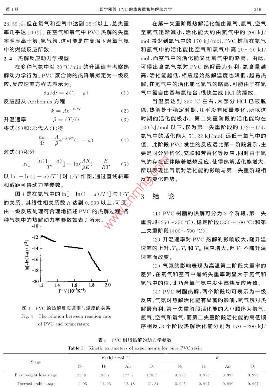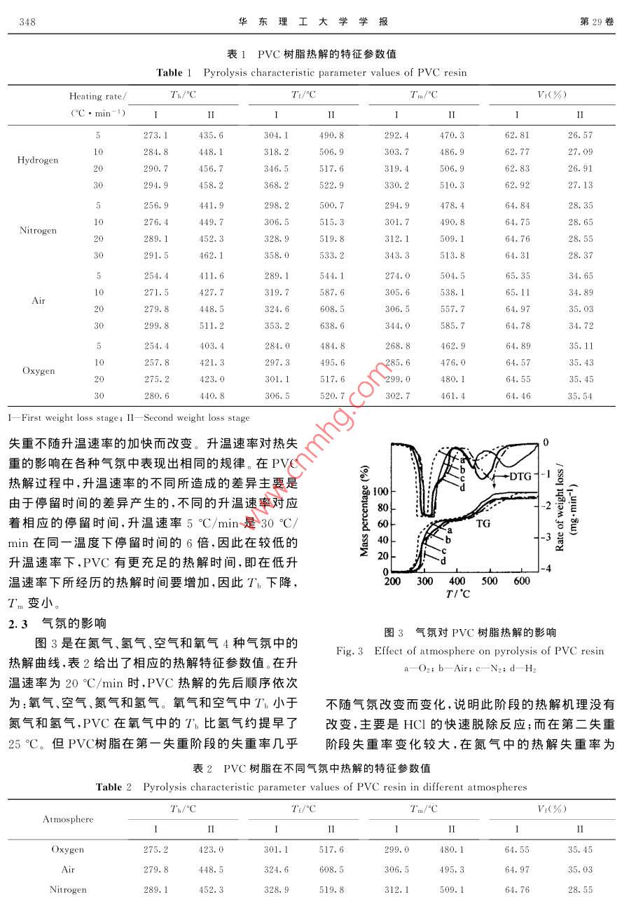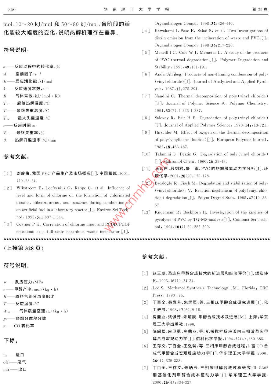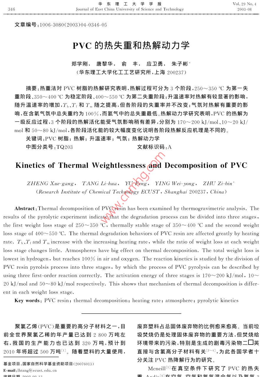 華東理工大學(xué)學(xué)報(bào)Vol 29 No4346Journal of East China University of Science and Technolog2003-08文章編號:1006-3080(2003)04-0346-05PⅤC的熱失重和熱解動力學(xué)鄭學(xué)剛,唐黎華,俞豐,應(yīng)衛(wèi)勇,朱子彬(華東理工大學(xué)化工工藝研究所,上海200237)摘要:熱重法對PⅤC樹脂的熱解研究表明,熱解過程可分為3個(gè)階段,250~350°C為第一失重階段、350~400℃C為穩(wěn)定階段、400~550℃為第二失重階段:升溫速率對熱解有較顯著的影響,隨升溫速率的增加,T、T'和Tn隨之提高,但各階段的失重率并不改變;氣氛對熱解有重要的影響,在含氧氣氛中總失重約為100%,而氫氣中的總失重最低。熱解動力學(xué)研究表明,PⅤC的熱解為級反應(yīng)過程,3個(gè)階段的熱解活化能受氣氛影響稍有差異,分別為170~200kJ/mol、10~20kJ/mol和50~80kJ/mol,各階段活化能的較大幅度變化說明各階段熱解反應(yīng)機(jī)理是不同旳。關(guān)鍵詞:PⅤC樹脂;熱解;升溫速率;氣氛;熱解動力學(xué)中圖分類號:TQ203文獻(xiàn)標(biāo)識碼:AKinetics of Thermal Weightlessness and Decomposition of PVcZHENG Xue-gang, TANG Li-hua, YU Feng, YING Wei-yong, ZHU Zi-bin(Research Institute of Chemical Technology eCust, Shanghai 200237, China)Abstract: Thermal decomposition of PVC resin has been examined by thermogravimetric analysis. Theresults of the pyrolytic experiment indicate that the degradation process can be divided into three stagesthe first weight loss stage of 250-350C, thermally stable stage of 350-400C and the second weightloss stage of 400-550C. The thermal degradation behaviors of PVC resin are affected greatly by heatingrate. Tb,TI and Tm increase with the increasing heating rate, while the ratio of weight loss at each weightloss stage changes little. Atmospheres have big effect on thermal decomposition. The total weight loss isowest in hydrogen, but reaches 100% in air and oxygen. The reaction kinetics is studied by the division ofPVC resin pyrolsis process into three stages, by which the process of Pvc pyrolysis can be described byusing three first-order reaction correctly. The activation energy of three stages is 170-200 kJ/mol, 10-20 kJ/mol and 50-80 kJ/mol respectively. This shows that mechanism of thermal decomposition is different in each weight loss stageKey words PVC resin; thermal decomposition; heating rate; atmosphere; pyrolytic kinetics聚氯乙烯(PVC)是重要的高分子材料之一,目廢棄塑料占總固體廢棄物的比例愈來愈高。當(dāng)前垃前全世界聚氯乙稀的年產(chǎn)量已達(dá)到2800萬噸左圾焚燒仍是處理固體廢棄物的重要方法,但焚燒給右,我國的生產(chǎn)能力也已達(dá)到320萬噸,預(yù)計(jì)到環(huán)境帶來的污染,特別是生成的劇毒污染物二□英2010年將超過500萬噸。隨著塑料的大量使用,直接與含氯高分子材料有關(guān)-,為此各國學(xué)者十基金項(xiàng)目:國家自然科學(xué)基金資助項(xiàng)目(20076013)分關(guān)注PⅤC熱降解行為的研究,E-mail:Ihtang@ecust.edu.cnMcneill在真空條件下研究了PVC的熱失第4期鄭學(xué)剛等:PVC的熱失重和熱解動力學(xué)347料的熱解過程分為4個(gè)階段,而 Salovey在氮?dú)夥諔?yīng),隨著大量HCl的生成,在PVC大分子鏈上形成的研究中將其熱解確定為兩個(gè)過程,但 Hirschler一些相鄰的多烯烴鏈段,從而生成少量的環(huán)烷烴和采用熱重法在氧氣、空氣以及氮?dú)庵醒芯亢?認(rèn)為苯等芳香族化合物13。第二失重階段表現(xiàn)為一些結(jié)PVC的熱解經(jīng)歷3個(gè)失重階段。由于PⅤC熱解過構(gòu)的重整,如少量HCl的生成、同分異構(gòu)化、交聯(lián)和程極為復(fù)雜,對熱解階段的劃分各不相同,而氣氛對芳香化等熱失重影響的研究尚不充分。此外對PVC熱解動力學(xué)的研究更少見報(bào)道, Talaminil0報(bào)道了第一失重階段PVC的熱解動力學(xué)行為,認(rèn)為氮、氧氣氛中的DTG0.5熱解為1.5級反應(yīng),而氨氣中的活化能大于氧氣氛,但研究的溫度范圍甚窄。近年馬師白等研究了氮-1.00氣氛中第一階段的脫氯動力學(xué)。1.5本研究是在常溫至600℃C的寬溫度范圍內(nèi),采用熱天平考察PVC樹脂的熱失重行為、升溫速率對0熱失重的影響、氣氛與熱失重的關(guān)系以及熱失重的200300400500600T/°C特征參數(shù)等,同時(shí)還對氮、氫、空氣和氧氣等多種氣氛中的熱解進(jìn)行了研究,以及分別對兩個(gè)階段PVC圖1PVC樹脂熱失重與溫度的關(guān)系的熱失重動力學(xué)進(jìn)行研究。Fig. 1 The relation between temperature andof Pvc resin1實(shí)驗(yàn)部分2.2升溫速率的影實(shí)驗(yàn)分別在4種氣氛中考察了5、10、20以及實(shí)驗(yàn)采用程序升溫?zé)崽炱絻x(上海分析儀器廠30"℃/min升溫速率對PVC樹脂熱解的影響。圖2WRT-2P型)進(jìn)行熱解失重的研究選用PⅤC樹脂是在氮?dú)庵胁煌郎厮俾氏翽VC樹脂熱失重曲線為200目以下粉末(上海氯堿總廠),試樣用量約8圖。由TG、DTG曲線可知,升溫速率對熱失重有較mg,氣體流量為100mL/min,升溫速率分別為5、大的影響,隨著升溫速率的增加,TG曲線移向高溫10、20和3o"/min,且分別于氮?dú)?、氫氣、空氣和氧區(qū),DTG曲線最高峰的位置也向右偏移,峰高增加氣等氣氛中考察PⅤC樹脂的熱解行為。相應(yīng)最大失重速率也提高。表1是在4種氣氛中熱失重率計(jì)算:失重率(X)=(試樣失重(W)/試解的特征參數(shù)值。由表可知隨著升溫速率的提高樣重量(W))×100%第一失重階段和第二失重階段Tn都增大,同時(shí),Tb和T都相應(yīng)地上升。雖然熱解各階段的溫度范圍有