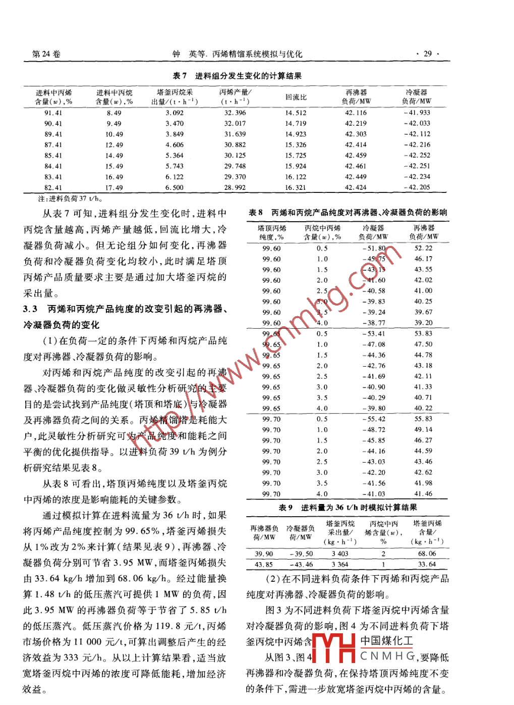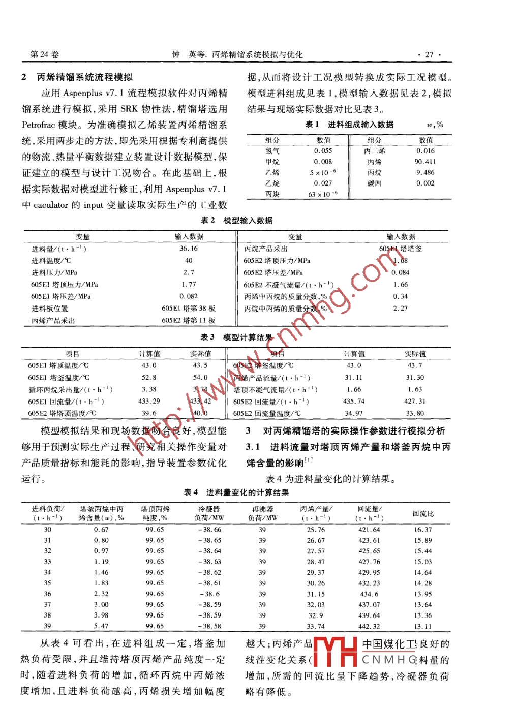 工業(yè)拉術(shù)乙烯工業(yè)2012,24(3)26ETHYLENE INDUSTRY丙烯精餾系統(tǒng)模擬與優(yōu)化鐘英,李兵,李懷玉(中國石油蘭州石化分公司,甘肅蘭州730060)摘要:基于丙烯精餾系統(tǒng)的實際運行教據(jù),利用 Aspenplus模擬軟件建立了能夠良姸描述裝置實際運行工況的模型,實現(xiàn)了對丙烯精餾過程的流程模擬。利用所建模型,研究了進料負荷、進料組威的變牝?qū)Ρ┊a(chǎn)品產(chǎn)量、丙烷中丙烯濃度控制指標的影響以及對塔頂丙烯產(chǎn)品純度和丙炕中丙烯濃度指標所引起的冷凝器和再沸器負荷的變化做靈敏度分析,分別從控制回流比、嚴格控制產(chǎn)品質(zhì)量純度和改變丙烷中丙烯的濃度指標方面提出了優(yōu)化建議。關(guān)鍵詞:丙烯丙烷模擬優(yōu)化丙烯精餾塔是乙烯裝置中較為特殊的一個1號丙烯精餾塔塔,因為丙烯和丙烷的相對揮發(fā)度非常小,分離要精餾塔不凝氣去脫「最進料來自丙烷塔求較高,丙烯精餾塔在整個分離過程中塔板數(shù)最多、回流比最大,其能量消耗也較高。在實際生產(chǎn)中,進料負荷或進料組成的變化以及外界干擾給丙烯精餾塔的穩(wěn)定操作和優(yōu)化帶來了極大不便。本文利用 Aspenplus模擬軟件建立丙烯精餾系統(tǒng)實際工況模型硏究丙烯精餾塔的進料負荷、進料去裂解爐聚合級丙烯產(chǎn)品組分的變化對丙烯產(chǎn)品產(chǎn)量和循環(huán)丙烷帶走的丙烯損失的影響,對塔頂丙烯產(chǎn)品純度和循環(huán)丙烷烯精餾系統(tǒng)流程示意中丙烯含量所引起的冷凝器和再沸器負荷的變化1.2實際運行情況做靈敏度分析,對丙烯精餾系統(tǒng)工藝變量進行尋隨著節(jié)能降耗工作的開展,裝置逐漸優(yōu)化裂解原料的投油結(jié)構(gòu),改善原料品質(zhì),提高了裂解爐優(yōu)輕質(zhì)原料投用比例。目前輕質(zhì)原料比例最高可達48.72%,且氣相原料通道由開車初期的3組,增1丙烯精餾系統(tǒng)簡介1流程簡介加至目前的7組。原料變輕,裂解氣輕組分增多,中國石油蘭州石化分公司(以下簡稱蘭化公特別是在滿負荷下投用IPG原料增加時,裂解氣司)460kta乙烯裝置丙烯精餾塔為雙塔系統(tǒng),包中的丙烷含量較高。受外界干擾,進料量一般在括2號丙烯精餾塔(605E1)和Ⅰ號丙烯精餾塔29~40th間變化,進料中的丙烯含量為82%~93%,丙烷含量在6%~17%間變化,影響丙烯精(605E2),605E1有129塊塔板,605E2有137塊塔餾塔的穩(wěn)定操作。板。來自MAPD反應(yīng)器(601D)的進料(99.9%為碳三組分),從605E1的第38塊塔板進入。605E2第11板側(cè)線抽出純度為99.6%丙烯產(chǎn)品,塔釜丙中國煤化工作者石油大學(xué)化學(xué)工程與烷返回裂解爐作為裂解原料,丙烷中丙烯含量要YHCNMHG理工作,現(xiàn)為乙烯廠乙求控制在3%以下。流程見圖1。烯車間工藝技術(shù)員,工程師第24卷鐘英等.丙烯精餾系統(tǒng)模擬與優(yōu)化272丙烯精餾系統(tǒng)流程模擬據(jù),從而將設(shè)計工況模型轉(zhuǎn)換成實際工況模型。應(yīng)用 Aspenplus.Ⅰ流程模擬軟件對丙烯精模型進料組成見表1,模型輸入數(shù)據(jù)見表2,模擬餾系統(tǒng)進行模擬,采用SRK物性法,精餾塔選用結(jié)果與現(xiàn)場實際數(shù)據(jù)對比見表3。Petrofrac模塊。為準確模擬乙烯裝置丙烯精餾系表1進料組成輸入數(shù)據(jù)統(tǒng),采用兩步走的方法,即先采用根據(jù)專利商提供數(shù)值數(shù)值的物流、熱量平衡數(shù)據(jù)建立裝置設(shè)計數(shù)據(jù)模型,保氫氣0.055丙二烯0.016甲烷0.00890.411證建立的模型與設(shè)計工況吻合。在此基礎(chǔ)上,根據(jù)實際數(shù)據(jù)對模型進行修正,利用 Aspenplus v70.027碳四0.00263×10-6中 caculator的 Input變量讀取實際生產(chǎn)的工業(yè)數(shù)表2模型輸入數(shù)據(jù)變量輸人數(shù)據(jù)變量輸人數(shù)據(jù)進料量/(th-1)36.16丙烷產(chǎn)品采出605E1塔塔釜進料溫度℃605E2塔頂壓力/MPa進料壓力/MP2.7605E2塔壓差/MPa0.084605El塔頂壓力/MPa605E2不凝氣流量/(t·h-1)605EI塔壓差/MPa丙烯中內(nèi)烷的質(zhì)量分數(shù),%進料板位置605E1塔第38板丙烷中丙烯的質(zhì)量分數(shù),%丙烯產(chǎn)品采出605E2塔第11板表3模型計算結(jié)果項目計算值實際值計算值值605E1塔頂溫度/℃43.0605F2塔釜溫度/℃605E塔釜溫度/℃丙烯產(chǎn)品流量/(t·h-1)31.30循環(huán)丙烷采出量/(th)3.74塔頂不凝氣流量/(t·h-1)605E1回流量/(t·h-)605E2回流量/(t·h-)435.74605E2塔塔頂溫度/℃605E2回流量溫度/℃34.9模型模擬結(jié)果和現(xiàn)場數(shù)據(jù)吻合良好,模型能3對丙烯精餾塔的實際操作參數(shù)進行模擬分析夠用于預(yù)測實際生產(chǎn)過程、研究相關(guān)操作變量對3.1進料流量對塔頂丙烯產(chǎn)量和塔釜丙烷中丙產(chǎn)品質(zhì)量指標和能耗的影響,指導(dǎo)裝置參數(shù)優(yōu)化烯含量的影響表4為進料量變化的計算結(jié)果。表4進料量變化的計算結(jié)果進料負荷/塔釜丙烷中丙塔頂丙烯再沸器丙烯產(chǎn)量/回流量(t·h-1)烯含量(w),%純度,%負荷/MW負荷/MW(th-1)回流比0.6799.6538.6625.76421.66.3726.670.9738.621.8399.6538.2.329999999999425.6528.47427.7615.0343231.15434.613.9599.6538.5932.9439.6413.3633.74442.32從表4可看出,在進料組成一定,塔釜加越大;丙烯產(chǎn)品V中國煤化工良好的熱負荷受限,并且維持塔頂丙烯產(chǎn)品純度一定線性變化關(guān)系CNMHG料量的時,隨著進料負荷的增加,循環(huán)丙烷中丙烯濃增加,所需的回