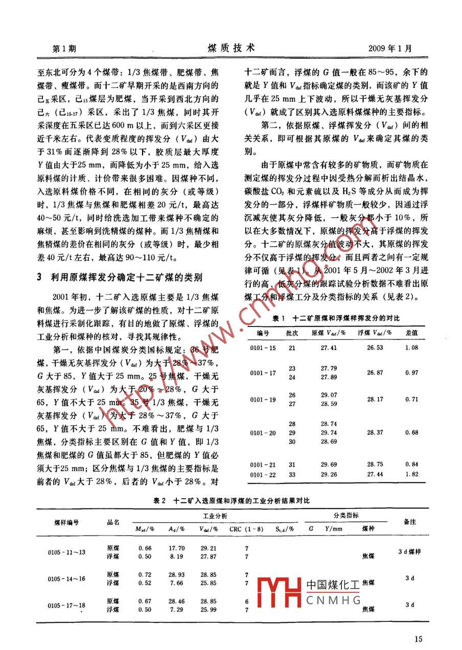 第1期煤質(zhì)技術(shù)2009年1月用原煤樣揮發(fā)分核定平煤十二礦煤的類別暴榕(平頂山煤業(yè)(集團(tuán))有限責(zé)任公司十二礦,河南平頂山467021)摘要: 利用平頂山煤業(yè)集團(tuán)十二礦謀質(zhì)較為穩(wěn)定、各層煤的黏結(jié)指數(shù)和Y值變化較小的特點(diǎn),采用通過原煤的干燥無灰基揮發(fā)分推算出其浮煤的干燥無灰基揮發(fā)分,并由此確定該礦煤炭的類別。關(guān)鍵詞:原煤樣;揮發(fā)分;類別中圖分類號(hào): TQ533. 2文獻(xiàn)標(biāo)識(shí)碼: B文章編號(hào): 1007-7677 (2009) 01-0014-03The application of coal volatile matter in determination ofcoal class for Pingdingshan No.12 MineBAO Rong(No.12 Mine, Pingdingshan Coul Industrial Group Corporalion Lid. Pingdingshan 467021, China)Abstract: Use of the Pingdingshan Coal Group No. 12 Mine stability, all floors of coals bond index and the value of Y changes in thecharacteristics of the smaller, through the dry ash-free coal- volatile estimated its floating dry ash- free coal- volatile, and thusdetermine the type of coal.Key words: raw coal sample; volatile matter; coal class1礦區(qū)基本情況2平煤集團(tuán)十二礦生產(chǎn)概況平頂山煤業(yè)(集團(tuán))有限責(zé)任公司位于河南省十二礦位于平頂山礦區(qū)東部,投產(chǎn)于1960年,中部,地跨平頂山市及其所屬寶豐、魯山、郟縣、到2006年,已由一個(gè)年生產(chǎn)30萬t進(jìn)而達(dá)到超臨汝、葉縣等市及襄縣、禹州等地。平煤集團(tuán)是國(guó)百萬噸的礦井。原煤生產(chǎn)主要供給礦區(qū)洗煤廠加內(nèi)最大的產(chǎn)煤礦區(qū)之一,既產(chǎn)煉焦煤,又有動(dòng)力煤,工成優(yōu)質(zhì)的煉焦洗精煤,是20世紀(jì)70年代至更是中南地區(qū)產(chǎn)煤最多的特大型礦區(qū), 2006年生90年代以來肥精煤原料的主要供給者。該礦含煤產(chǎn)原煤3095萬t,目前有生產(chǎn)及擴(kuò)建礦井27對(duì),十層,主要可采4層,己1s、 已1s:7、 已1617、 庚x。選煤廠7座,年洗選能力達(dá)1 700多萬t。已跨入在實(shí)際開采過程中為已1s17 (庚2a 至今未揭露),以全國(guó)工業(yè)企業(yè)百?gòu)?qiáng)之行列。地質(zhì)鉆探煤樣資料和當(dāng)時(shí)的分析化驗(yàn)數(shù)據(jù),按平頂山礦區(qū)所轄范圍:平頂山煤出、韓梁煤.GB 5751--86《中國(guó)煤炭分類》國(guó)家標(biāo)準(zhǔn)劃定大類田.臨汝煤田、禹州煤田。含煤系為石炭、二疊.為肥煤,小類為1號(hào)肥煤。1986 年,在全國(guó)核定系,包括下部的太原群高硫煤和上部的山西組及上標(biāo)牌時(shí),對(duì)已揭露部分的己1s、己1617 煤層定為.下石盒子組低硫煤,礦區(qū)含煤地層劃分為9個(gè)煤組36號(hào)肥煤,供洗煤廠加工的商品煤為肥煤。88個(gè)煤層。其中可采煤層以河南省統(tǒng)一編碼(由隨著開采范圍的擴(kuò)展和深度的增加,煤質(zhì)也發(fā)下而上)為一s、二、二21、二22.四2.四3、五2、生了變化。在1996年核定牌號(hào)時(shí),出現(xiàn)了3個(gè)煤六、七2。平頂山煤田編號(hào)為十層,庚z、已r7、中國(guó)煤化工:要是由煤的變質(zhì)規(guī)己16、己1s、 戊1o、 戊s、戊s、丁。、丁s、丙3。煤YHCNMH G程度由西向東,由種為肥煤、焦煤、1/3 焦煤及部分瘦煤、氣煤和少.南向北逐漸增高,在垂直方向上,由上至下煤的量無煙煤等。Vur降低。以已組煤為例,沿煤層傾斜方向由西南14第1期煤質(zhì)技術(shù)2009年1月至東北可分為4個(gè)煤帶: 1/3 焦煤帶、肥煤帶、焦十二礦而言,浮煤的G值一般在85~95,余下的煤帶、瘦煤帶。而十二礦早期開采的是西南方向的就是Y值和Va指標(biāo)確定煤的類別,而該礦的Y值己采區(qū),己is煤層為肥煤,當(dāng)開采到西北方向的幾乎在25 mm.上下波動(dòng),所以千燥無灰基揮發(fā)分己大(已1s17)采區(qū),采出了1/3焦煤,同時(shí)其開(Var)就成了區(qū)別其入選原料煤煤種的主要指標(biāo)。采深度在五采區(qū)已達(dá)600 m以上,而到六采區(qū)更接第二,依據(jù)原煤、浮煤揮發(fā)分(Va1) 間的相近千米左右。代表變質(zhì)程度的揮發(fā)分(Van) 由大關(guān)關(guān)系,即可根據(jù)其原煤的Var來 確定其煤的類于31%而逐漸降到28%以下,膠質(zhì)層最大厚度別。Y值由大于25 mm,而降低為小于25 mm,給入選由于原煤中常含有較多的礦物質(zhì),而礦物質(zhì)在原料煤的計(jì)質(zhì)、計(jì)價(jià)帶來很多困難。因煤種不同,測(cè)定煤的揮發(fā)分過程中因受熱分解而析出結(jié)晶水,入選原料煤價(jià)格不同,在相同的灰分(或等級(jí))碳酸鹽CO2和元素硫以及H2S等成分從而成為揮時(shí),1/3 焦煤與焦煤和肥煤相差20元/t,最高達(dá)發(fā)分的一-部分,浮煤樣礦物質(zhì)一般較少,因通過浮40~50元/t,同時(shí)給洗選加工帶來煤種不確定的沉減灰使其灰分降低,一般灰分都小于10%,所麻煩,甚至影響到洗精煤的煤種。而1/3焦精煤和以在大多數(shù)情況下,原煤的揮發(fā)分高于浮煤的揮發(fā)焦精煤的差價(jià)在相同的灰分(或等級(jí))時(shí),最少相分。十二礦的原煤灰分值波動(dòng)不大,其原煤的揮發(fā)差40元/t左右,最高達(dá)90~110元/t。分不僅高于浮煤的揮發(fā)分,而且兩者之間有一定規(guī)律可循(見表1)。從2001年5月~2002年3月進(jìn)3利用原煤揮發(fā)分確定十二礦煤的類別行的高、低灰分煤的跟蹤試驗(yàn)分析數(shù)據(jù)不難看出原2001年初,十二礦入選原煤主要是1/3焦煤煤工分和浮煤工分及分類指標(biāo)