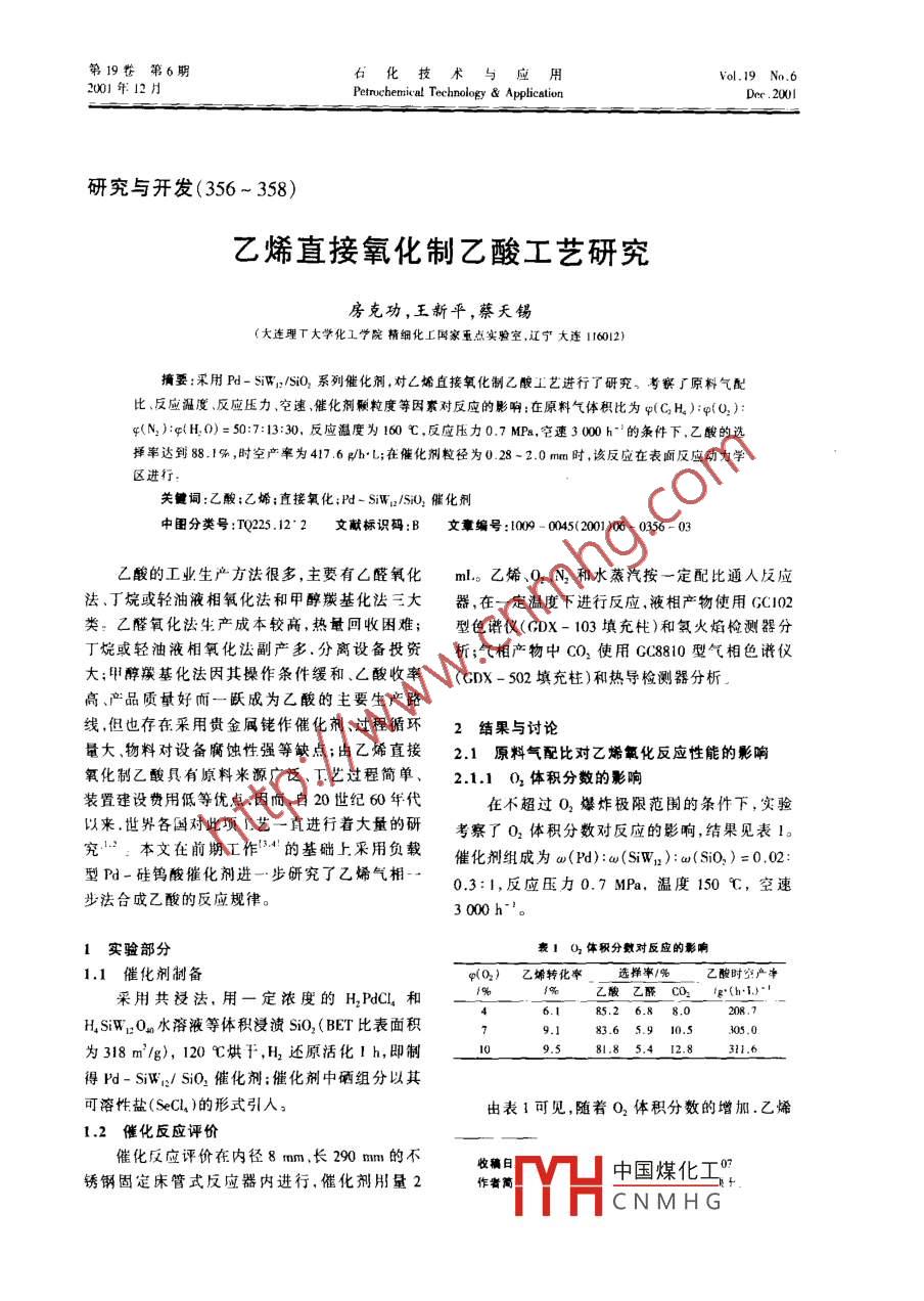 第19卷第6期5i 化技術(shù)與應(yīng)用Vol.19 No.62001年12月Petuchenical Technology & ApplicationDee .2001研究與開發(fā)(356~358)乙烯直接氧化制乙酸工藝研究.房克功,王新平,蔡天錫(大連理T大學(xué)化工學(xué)院精細(xì)化工國(guó)家重點(diǎn)實(shí)驗(yàn)室,遼寧大連116012)摘要:采用Pd- siw;/i02系列催化劑,對(duì)C烯直接氧化制乙酸工藝進(jìn)行了研究??疾炝嗽蠚馀浔确磻?yīng)溫度、反應(yīng)壓力、它速、催化劑顆粒度等因素對(duì)反應(yīng)的影響:在原料氣體積比為q(CH ):p(02):q(N):q(H.0)=50:7:13:30,反應(yīng)溫度為160 C,反應(yīng)壓力0.7 MPa,兗連30000 h"'的條件下,乙酸的選擇率達(dá)到88.1%,時(shí)空產(chǎn)率為417.6g/hbL;在催化劑粒徑為0.28-2.0ma時(shí),該反應(yīng)在表面反應(yīng)動(dòng)力學(xué)區(qū)進(jìn)行:關(guān)鍵詞:乙酸:乙烯;直接氧化;Pd - SiW2/SiO2催化劑中圖分類號(hào):T0225.12*2文獻(xiàn)標(biāo)識(shí)碼:B文章編號(hào) :t000 - 0045(2001 )06 - 0356 - 03乙酸的工業(yè)生產(chǎn)方法很多,主要有厶醛氧化ml。乙烯、0O2、N2和水蒸汽按-定配比通人反應(yīng)法、丁烷或輕油液相氧化法和甲醇羰基化法三大器,在一定溫度下進(jìn)行反應(yīng),液相產(chǎn)物使用GC102類。乙醛氧化法生產(chǎn)成本較高,熱量回收困難;型色譜儀(GDX- 103填充化)和氫火焰檢測(cè)器分丁烷或輕油液相氧化法副產(chǎn)多.分離設(shè)備投資析;氣相產(chǎn)物中CO2使用GC8810型氣相色譜儀大;甲醇羰基化法因其操作條件緩和.乙酸收率(GDX - 502填充柱)和熱導(dǎo)檢測(cè)器分析.高、產(chǎn)品質(zhì)量好而一躍成為乙酸的主要生產(chǎn)路線,但也存在采用貴金屬銠作催化劑、過程循環(huán)2結(jié)果與討論量大、物料對(duì)設(shè)備腐蝕性強(qiáng)等缺點(diǎn);由乙烯直接2.1原料氣配比對(duì)乙烯氧化反應(yīng)性能的影響氧化制乙酸具有原料米源廣泛、T.藝過程簡(jiǎn)單、2.1.1 02 體積分?jǐn)?shù)的影響裝置建設(shè)費(fèi)用低等優(yōu)點(diǎn).因而,自20世紀(jì)60年代在不超過O2爆炸極限范圍的條件下,實(shí)驗(yàn)以來.世界各國(guó)對(duì)此項(xiàng)I藝一直進(jìn)行著大量的研考察了O2體積分?jǐn)?shù)對(duì)反應(yīng)的影響,結(jié)果見表1。究:本文在前期工作0.48的基礎(chǔ)上.采用負(fù)載催化劑組成為w( Pd):w(Siw,):w(Si0,) =0.02:型陽一硅鎢酸催化劑進(jìn)-步研究了乙烯氣相--0.3:1,反應(yīng)壓力0.7 MPa,溫度150 C,空速步法合成乙酸的反應(yīng)規(guī)律。3 000 h"'。1實(shí)驗(yàn)部分表1 02體積分?jǐn)?shù)對(duì)反應(yīng)的影響1.1 催化劑制備q(02) 乙烯轉(zhuǎn)化率~乙酸乙醛CO2° 1g*(h-1.)"'選擇事/%乙酸時(shí)空產(chǎn)凈采用共浸法,用一定濃度的H,PdCl, 和6.1- 85.26.8 8.208.7HSiW2On水溶液等體積浸漬SiO2(BET比表面積9.183.6. 5.9 10.5305.0為318 m'lg), 120 C烘干,H2還原活化1 h,即制9.581.8 5.4 12.8311.6得Pd- SiWi2/ Si0,催化劑;催化劑中硒組分以其可溶性鹽(SeCl, )的形式引人。由表1可見,隨著02體積分?jǐn)?shù)的增加.乙烯1.2催化反 應(yīng)評(píng)價(jià)催化反應(yīng)評(píng)價(jià)在內(nèi)徑8 mm.長(zhǎng)290 mm的不收稿日中國(guó)煤化工7銹鋼固定床管式反應(yīng)器內(nèi)進(jìn)行,催化劑用量2作者簡(jiǎn):fYHCNMHG第6期房克功等.乙嫌直接氧化制C酸工藝研究35轉(zhuǎn)化率和CO2選擇率同步上升,而乙醛和乙酸的汽所起的作用,認(rèn)為水燕汽有助下改變乙酸在催總生成選擇率則逐漸下降.這可能是由于O,分化劑表面的吸附 -脫附平衡。使平衡問著乙酸脫壓的增加加劇了C烯的完全燃燒反應(yīng)和乙醛及.附方向移動(dòng),并日提出了如卜假設(shè):乙酸的二次氧化所造成的從表1中還可以看出.在O.體積分?jǐn)?shù)為7% ~ 10%的范圍內(nèi).乙酸CH,c () +H,0一- CH,--C-0H + 0H時(shí)空收率基本保持不變.但從保證月的產(chǎn)物乙酸s時(shí)空產(chǎn)率及選擇率最作的角度考慮.應(yīng)選擇0,式中.s為催化劑活性位、體積分?jǐn)?shù)為7%:表了長(zhǎng)明,對(duì)于Pd-SiW:/Si0,系列儲(chǔ)化劑,2.1.2乙 烯體積分?jǐn)?shù)的影響在乙烯體積分?jǐn)?shù)為30% ~ 50%的范固內(nèi),號(hào)水蒸汽在乙烯催化氧化合成乙酸的反應(yīng)過陽中.察了乙烯含量對(duì)氧化反應(yīng)的影響,結(jié)果見表2具有與上述假設(shè)相似的作用此外,雜多酸的“準(zhǔn)液相"狀態(tài)也能夠促使水載著晶格氯在其-催化劑組成:w( Pd):o(SiWl):w(Si0、) = 0.02:級(jí)結(jié)構(gòu)中迅速擴(kuò)散.從而加速氧的循環(huán)。.提尚0.3:1.反應(yīng)壓力0.7 MPa. 溫度150 心,空速反應(yīng)活性。月前.關(guān)于水蒸汽在乙烯直接氧化反3 000 h"應(yīng)制乙酸反應(yīng)中的作用機(jī)理還儀限于假改.尚需在以后的實(shí)驗(yàn)中得到進(jìn)-步驗(yàn)證。表2乙蠕體積分?jǐn)?shù)對(duì)氧化反應(yīng)的影響"當(dāng)水蒸汽體積體積分?jǐn)?shù)為30%時(shí),反應(yīng)牛成0:轉(zhuǎn)化率選擇率/骨乙酸時(shí)空產(chǎn)率19乙酸乙醛02 /g(0r-L.J ↓的乙酸時(shí)空產(chǎn)率及選擇率最高.隨著水蒸汽含量;050.4 80.1 5.1 14.8的繼續(xù)增加.厶烯的轉(zhuǎn)化率和匕酸的時(shí)空產(chǎn)率顯.68.382.05.6 12.4292.0弄下降??梢哉J(rèn)為.過多的水蒸汽已開始在催化72.5305.0劑的細(xì)孔內(nèi)凝結(jié).引起反應(yīng)物在孔內(nèi)的內(nèi)擴(kuò)散阻力,以至于降低了反應(yīng)速率:由表2可見,隨著乙烯體積分?jǐn)?shù)的增加,
