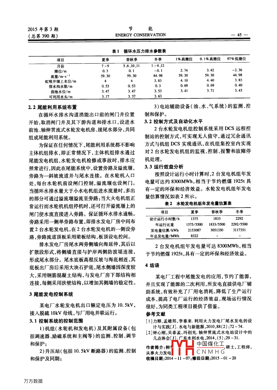 能2015年第3期ENERGY CONSERVATION(總第390期)循環(huán)水尾能發(fā)電在電廠中的應(yīng)用柳華,丁倩(國(guó)核電力規(guī)劃設(shè)計(jì)研究院,北京10005)摘要:提出沿江沿海的大型直流循環(huán)火電機(jī)組在循環(huán)水排水過(guò)程中加設(shè)小型水輪發(fā)電機(jī)可進(jìn)行尾能利用方案,利用排水尾能進(jìn)行二次發(fā)電以供廠內(nèi)用電,節(jié)約能源;并介紹水輪發(fā)電機(jī)組利用循環(huán)水尾能發(fā)電在某2×1000MW電廠中的應(yīng)用情況。關(guān)鍵詞:小水電站;火電廠;循環(huán)水尾能;節(jié)能中圖分類號(hào):TK115;TM621文獻(xiàn)標(biāo)識(shí)碼B文章編號(hào):1004-7948(2015)03-004-0doi:103969/j.isn.1004-7948.2015.03.011尾能發(fā)電機(jī)組→大海。引言循環(huán)水尾能發(fā)電系統(tǒng)流程如圖1所示。地處沿江沿海的大型火力發(fā)電廠循環(huán)水排水,存在可利用的貫流尾能,如果直接排掉,能量未充水輪發(fā)電機(jī)配電及控制室分利用,易造成浪費(fèi)。為了進(jìn)一步做到能源的綜合利用,充分利用火力發(fā)電廠循環(huán)水排水尾能,一些機(jī)組循環(huán)火力發(fā)電廠在循環(huán)水排水口安裝小型水輪發(fā)電機(jī),水輪發(fā)電機(jī)房排水溝充分利用其水頭及流量進(jìn)行循環(huán)水排水尾能發(fā)電最水輪發(fā)電機(jī)前池循環(huán)水虹排水溝2機(jī)組循環(huán)大限度地發(fā)揮節(jié)能減排、環(huán)境保護(hù)、循環(huán)經(jīng)濟(jì)等優(yōu)勢(shì)。水排水近年來(lái),多個(gè)采用直流供水系統(tǒng)的大型火力發(fā)水輪發(fā)電機(jī)電廠,像湖北省的陽(yáng)邏、襄樊、黃石,江西省的豐城檢修間電廠,均建設(shè)了尾水回收水利發(fā)電站都取得了良好的經(jīng)濟(jì)效益口。根據(jù)濱海電廠循環(huán)水排水口特點(diǎn),存在可利用的貫流尾能,為了進(jìn)一步做到能源圖1循環(huán)水尾能發(fā)電系統(tǒng)流程圖的綜合利用,充分利用電廠循化水排水尾能,某電廠2×100機(jī)組在循環(huán)水排水口處設(shè)置2臺(tái)2循環(huán)水尾能發(fā)電系統(tǒng)裝機(jī)、布置及運(yùn)行方式50%的軸伸貫流式水輪發(fā)電機(jī)組2,利用排水尾21水輪發(fā)電機(jī)的裝機(jī)情況能發(fā)電,裝機(jī)容量達(dá)2×670kW,并于2012年投入夏季、春秋季時(shí)虹吸井設(shè)計(jì)堰上水位為4m,冬使用。季為383m,可利用水頭為3.0m,夏季、春秋季循1循環(huán)水排水尾能發(fā)電系統(tǒng)流程環(huán)冷卻水量為5930m3/s,冬季循環(huán)冷卻水量為44.98m3/s,具體參數(shù)如表1所示。某電廠循環(huán)水系統(tǒng)為單元制,采用以海水為水某電廠循環(huán)水流量大、變化幅度小,且可利用源的直流供水系統(tǒng)。2臺(tái)機(jī)組共用1座循環(huán)水泵水頭在30m以上,水輪機(jī)額定水頭為292m,總房,每臺(tái)機(jī)組配3臺(tái)3%容量循環(huán)水泵,1條流量為60m3/s。根據(jù)以上參數(shù)電廠安裝2臺(tái)額定D3800循環(huán)水壓力排水管,1座虹吸井;1條36mx出力為746kW的軸伸貫流機(jī)組的水輪機(jī)型號(hào)為36m單孔鋼筋混凝土排水溝。GDO08-w中國(guó)煤化工定容量為循環(huán)水尾能發(fā)電系統(tǒng)流程為:循環(huán)水壓力排水837.VA的CN MHGW670-10管→虹吸井→排水溝→水輪發(fā)電機(jī)組前池→排水1180,利用循環(huán)水的尾能進(jìn)行發(fā)電。2015年第3期節(jié)能(總第390期ENERGY CONSERⅤ ATION45表1循環(huán)水壓力排水參數(shù)表夏季春秋季冬季1%高潮位0.1%高潮位97%低潮位5、6、10、11潮位/2.36流量/m·s59.3059.3044.9859.3059.3044.98虹吸井堰上水位/m3.834.103.83排水溝水阻/m0.530.530.6940前池水位/m3.473.533.413.713.43可利用水頭/632.2尾能利用系統(tǒng)布置3)電站輔助設(shè)備(油、水、氣系統(tǒng))的監(jiān)測(cè)、控在循環(huán)水排水溝道消能出口前的閘門(mén)井位置制和保護(hù)。開(kāi)始取消閘門(mén)井及其下游溝道和排水口,設(shè)進(jìn)水3.2控制方式及自動(dòng)化水平前池、軸伸貫流式水輪發(fā)電機(jī)房、接尾水部分,共同2臺(tái)水輪發(fā)電機(jī)組控制系統(tǒng)采用DCS遠(yuǎn)程控組成尾能利用系統(tǒng)。制站的控制方式,可實(shí)現(xiàn)無(wú)人值守,通過(guò)冗余通訊為保證在任何情況下,尾能利用系統(tǒng)都不影響方式與機(jī)組DCS實(shí)現(xiàn)通訊,在機(jī)組集控室內(nèi)實(shí)現(xiàn)主體機(jī)組排水,即正常情況下,主體機(jī)組排水通過(guò)對(duì)2臺(tái)水輪發(fā)電機(jī)組的監(jiān)視、控制、報(bào)警和故障停尾能發(fā)電機(jī)組,水輪發(fā)電機(jī)檢修或事故時(shí),排水應(yīng)機(jī)處理。照常進(jìn)行,因此在尾能系統(tǒng)中,設(shè)置旁路及溢流堰,3.3運(yùn)行效益分析旁路為一斜坡流道并與尾水連接。在水輪機(jī)入口按照設(shè)計(jì)運(yùn)行小時(shí)計(jì)算時(shí),2臺(tái)發(fā)電機(jī)組年發(fā)處,每臺(tái)水輪機(jī)前設(shè)閘門(mén)控制,溢流堰也設(shè)閘門(mén)。電量可達(dá)約8300MWh,相當(dāng)于節(jié)約燃煤1925t具當(dāng)循環(huán)水排水量大于小水電機(jī)組進(jìn)水流量時(shí),多出有一定的環(huán)保和經(jīng)濟(jì)效益。水輪發(fā)電機(jī)組年發(fā)電的部分可通過(guò)溢流堰溢流至旁路;當(dāng)大火電機(jī)組正量估算情況如表2所示。常運(yùn)行而水輪機(jī)機(jī)組停