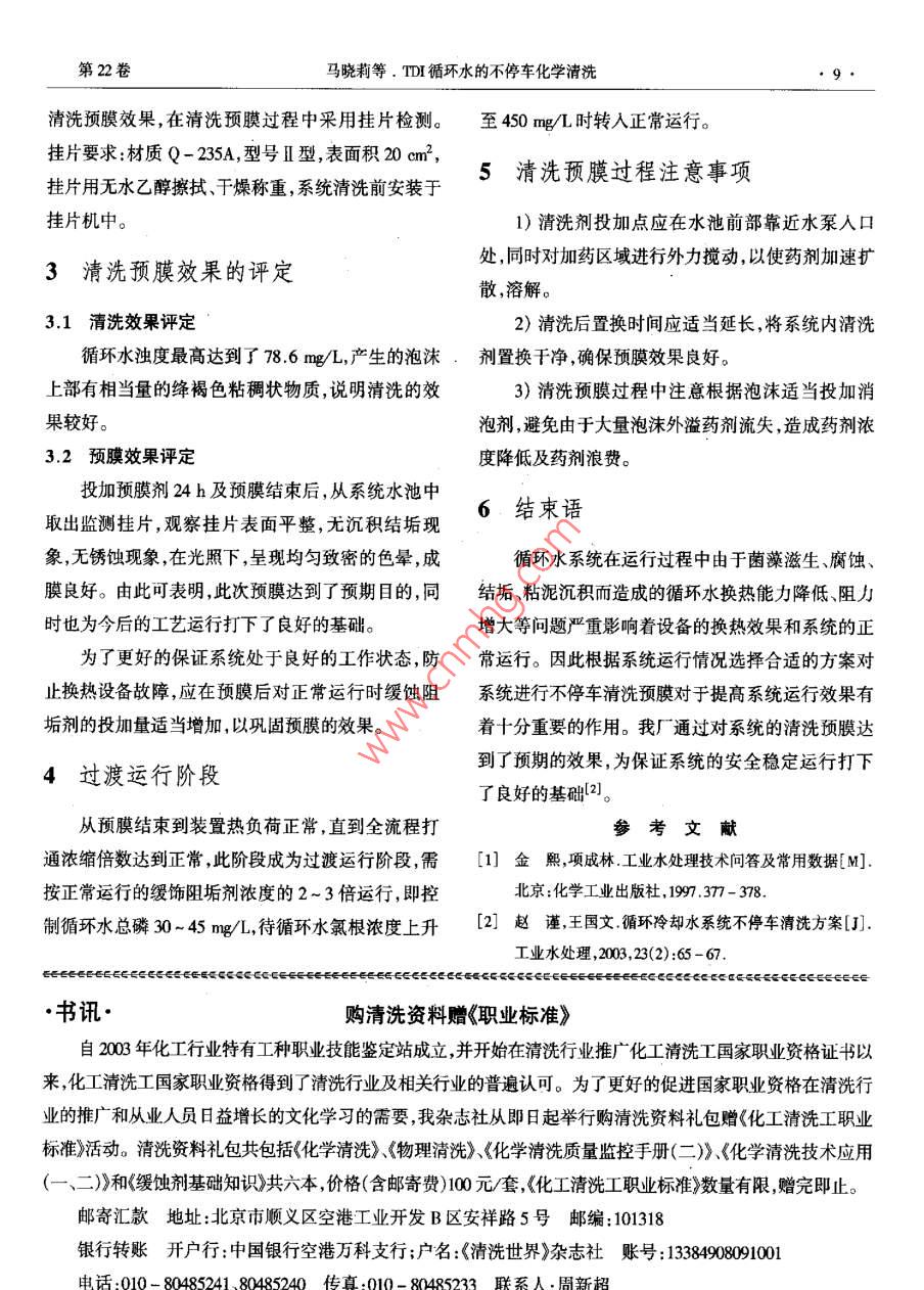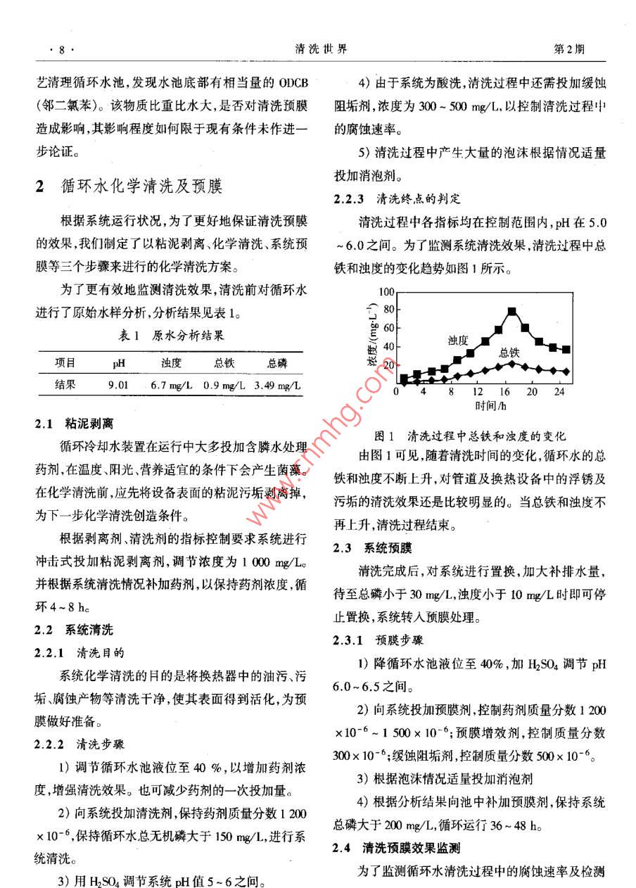 實(shí)用拉求清洗世界2005,22(2):7-9Cleaning WorldTDI循環(huán)水的不停車(chē)化學(xué)清洗孟繁敬馬曉莉河北滄州大化TD有限責(zé)任公司,河北滄州061000摘要:介紹TD公司循環(huán)水系統(tǒng)的運(yùn)行概況和系統(tǒng)的在線清洗預(yù)膜過(guò)程,以及清洗預(yù)膜的效果。關(guān)鍵詞:循環(huán)水系統(tǒng);化學(xué)清洗;生物粘泥;預(yù)膜中圖分類(lèi)號(hào):TQ085文獻(xiàn)標(biāo)識(shí)碼:BOnline chemical cleaning of TDi circulating waterMENF Fanjing, MA XiaoliCang/hou Dahua Corp. TDI Co, Ld. Cangzhou, Hebei 061000)Abstract: The paper briefly introduces the running situation of the TDI Co 's circulating water system andprocess and the results of the on-line cleaning and pre-film of this systemKey words: circulating water system; chemical cleaning: biological slime; pre-film冷卻水系統(tǒng)運(yùn)行過(guò)程中,雖經(jīng)過(guò)常規(guī)處理但是水量600mh,冷卻塔包括一座抽風(fēng)式橫流冷卻水由于現(xiàn)場(chǎng)條件及系統(tǒng)特性的不同,在冷卻設(shè)備的金泥塔和一座抽風(fēng)式逆流冷卻玻璃鋼塔整個(gè)系統(tǒng)共屬表面上,還是會(huì)發(fā)生系統(tǒng)結(jié)垢、油污及微生物滋生有循環(huán)水換熱設(shè)備約90臺(tái),換熱設(shè)備材質(zhì)有CS、316等情況,從而造成粘泥沉積,影響循環(huán)水的冷卻效L、Ni、hncy、T等。果。同時(shí),沉積物使換熱器及系統(tǒng)管道變小,水通量1.2補(bǔ)水水質(zhì)減小,水流阻力增大,進(jìn)而進(jìn)一步降低系統(tǒng)冷卻效補(bǔ)水水質(zhì)概況:pH8.13,Cl-219.6mg/L,總硬果。而且沉積物還會(huì)阻礙循環(huán)水中緩蝕劑、預(yù)膜劑度為04mmoL,總堿度4.08mm0L,電導(dǎo)率達(dá)到金屬表面使之難與金屬反應(yīng)形成保護(hù)膜。因1100gS/cm由以上數(shù)據(jù)可以看出,我廠水質(zhì)屬于高此,循環(huán)水系統(tǒng)應(yīng)進(jìn)行定期清洗、預(yù)膜。為了保證生堿度低硬度的負(fù)硬度水質(zhì),具有較高的腐蝕性,定產(chǎn)的連續(xù)性減少生產(chǎn)的損失,一般采用不停車(chē)清洗期的清洗預(yù)膜是十分必要的。方式。1.3系統(tǒng)檢查1系統(tǒng)運(yùn)行概況在系統(tǒng)大檢修過(guò)程中重點(diǎn)對(duì)循環(huán)水換熱系統(tǒng)進(jìn)行了檢查,從打開(kāi)的換熱設(shè)備來(lái)看,循環(huán)水流經(jīng)管程1概況的換熱設(shè)備腐蝕較嚴(yán)重,尤其是管板處沉積的銹泥mI循環(huán)水系統(tǒng)保有水量為200m3,系統(tǒng)循環(huán)較多,這給系統(tǒng)清洗預(yù)膜帶來(lái)較大的困難。通過(guò)工稿日期:2005-10-25作者簡(jiǎn)介:孟繁敬(192-),男,河北滄州市人,工程師,從事化學(xué)水處理工作清洗世界第2期藝清理循環(huán)水池,發(fā)現(xiàn)水池底部有相當(dāng)量的ODCB4)由于系統(tǒng)為酸洗,清洗過(guò)程中還需投加緩蝕(鄰二氯苯)。該物質(zhì)比重比水大,是否對(duì)清洗預(yù)膜阻垢劑,濃度為300-500mg/L,以控制清洗過(guò)程中造成影響,其影響程度如何限于現(xiàn)有條件未作進(jìn)一的腐蝕速率。步論證。5)清洗過(guò)程中產(chǎn)生大量的泡沫根據(jù)情況適量2循環(huán)水化學(xué)清洗及預(yù)膜投加消泡劑。2.2.3清洗終點(diǎn)的判定根據(jù)系統(tǒng)運(yùn)行狀況,為了更好地保證清洗預(yù)膜清洗過(guò)程中各指標(biāo)均在控制范圍內(nèi),pH在5.0的效果我們制定了以粘泥剝離化學(xué)清洗、系統(tǒng)預(yù)6.0之間。為了監(jiān)測(cè)系統(tǒng)清洗效果,清洗過(guò)程中總膜等三個(gè)步驟來(lái)進(jìn)行的化學(xué)清洗方案。鐵和濁度的變化趨勢(shì)如圖1所示為了更有效地監(jiān)測(cè)清洗效果,清洗前對(duì)循環(huán)水100進(jìn)行了原始水樣分析,分析結(jié)果見(jiàn)表1。表1原水分析結(jié)果濁度總鐵項(xiàng)目pH總鐵總磷結(jié)果9.016.7m/L0.9mg/L3.49mg/L8121620時(shí)間h2.1粘泥剝離循環(huán)冷卻水裝置在運(yùn)行中大多投加含膦水處理圖1清洗過(guò)程中總鐵和濁度的變化由圖1可見(jiàn),隨著清洗時(shí)間的變化,循環(huán)水的總藥劑在溫度陽(yáng)光營(yíng)養(yǎng)適官的條件下會(huì)產(chǎn)生菌藻。鐵和濁度不斷上升,對(duì)管道及換熱設(shè)備中的浮銹及在化學(xué)清洗前,應(yīng)先將設(shè)備表面的粘泥污垢剝離掉污垢的清洗效果還是比較明顯的。當(dāng)總鐵和濁度不為下一步化學(xué)清洗創(chuàng)造條件。再上升,清洗過(guò)程結(jié)束。根據(jù)剝離劑、清洗劑的指標(biāo)控制要求系統(tǒng)進(jìn)行2.3系統(tǒng)預(yù)膜沖擊式投加粘泥剝離劑,調(diào)節(jié)濃度為100mg/L并根據(jù)系統(tǒng)清洗情況補(bǔ)加藥劑,以保持藥劑濃度循清洗完成后,對(duì)系統(tǒng)進(jìn)行置換,加大補(bǔ)排水量,待至總磷小于30mg/L,濁度小于10mg/L時(shí)即可停環(huán)4~8h止置換,系統(tǒng)轉(zhuǎn)入預(yù)膜處理。2.2系統(tǒng)清洗23.1預(yù)膜步驟2.2.1清洗目的1)降循環(huán)水池液位至40%,加H2SO4調(diào)節(jié)pH系統(tǒng)化學(xué)清洗的目的是將換熱器中的油污、污6.0~6.5之間。垢、腐蝕產(chǎn)物等清洗干凈使其表面得到活化,為預(yù)2)向系統(tǒng)投加預(yù)膜劑,控制藥劑質(zhì)量分?jǐn)?shù)1200膜做好準(zhǔn)備。10-6~1500×10-6;預(yù)膜增效劑,控制質(zhì)量分?jǐn)?shù)2.22清洗步驟300×10-6;緩蝕阻垢劑,控制質(zhì)量分?jǐn)?shù)500×10-6。1)調(diào)節(jié)循環(huán