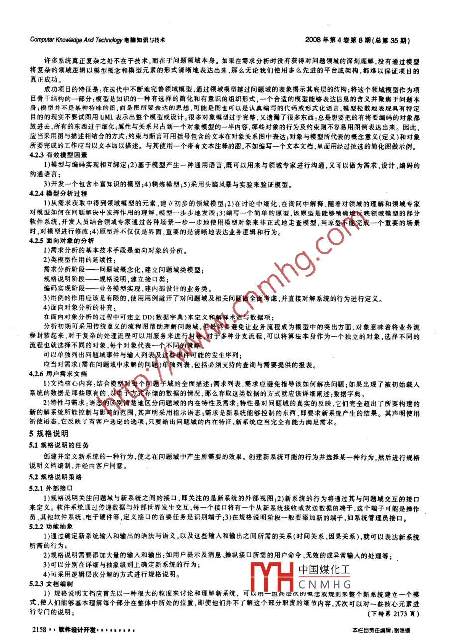 ISSN 1009 3044E- -mail: xil@cce.net.cnComputer Knowledge And Technology電脯知識與技術(shù)htp/://ww.w.net.cnnVolL4.No.8.December 2008. pp.2156 -2158.2173Tel:+86- 551-56909635690964需求分析導(dǎo)引付紅雷',張勇鳳2(1.深圳市南凌科技發(fā)展有限公司軟件研發(fā)中心干細(xì)胞業(yè)務(wù)部,北京100062:2.山西師范大學(xué).山西臨汾041004)摘要:各種需求分析方法各具特點(diǎn),如果僅使用某種方法在項(xiàng)目實(shí)踐中往往會困難重重,怎樣結(jié)合各種需求分析方法之長為項(xiàng)目實(shí)踐建立一種需求分析參考標(biāo)準(zhǔn)成為一個迫切需要解決的問題。通過對面向問題域、面向?qū)ο?、模型?qū)動等分析方法的研究,并結(jié)合在項(xiàng)目實(shí)踐中應(yīng)用,以面向問題域分析為核心規(guī)定需求分析的根本目的與基本活動,結(jié)合面向?qū)ο蟮姆治雠c模型驅(qū)動分析說明有效建模的技術(shù)要點(diǎn),初步形成一個適合于實(shí)際項(xiàng)目活動的需求分析標(biāo)準(zhǔn)的框架。關(guān)鍵詞:需求分析;西向問題域的需求分析;面向?qū)ο蠓治?領(lǐng)域模型驅(qū)動;需求分析標(biāo)準(zhǔn)中圖分類號:TP302文獻(xiàn)標(biāo)識碼:A 文章編 號:1009 -0442008353 -2156-03An Introduction to Requirements AnalysisFU Hong-lei', ZHANG Yong feng(1.CMDP Service Department of Nova Network Software Development Center, Bejing 10002,0 Chin; 2.Shanxi Normal Univecity,Linfen 041004, China)Abstract: Each kind of denand analysis method each characteristic, but if will only use some method to be ofen beset with dificulies inthe project practice, how to unify each demand analysis method long to establish one kind of demand analysis reference standard for theproject practice to become the question which urgent needs to solve. Through the opposite to the question teritory's analysis method, theobject- oriented analysis method, the model actuation analysis method's tresearch, and unifies in the project practice applies, ake fces thequestion trritory analysis as the core stipulation demand analysis primary purpose and the basic activity, unifies the object-oriented analysisand the model actuation analysis explanation efective modeling importance and the technical point, forms one to suit initally in the actualproject activity demand analysis standard fame.Key words: requirements anlysis; problem domain oriented analysis; analysis strategy; domain model driven; requirements analysis standard1引膏開發(fā)軟件就是通過描述來構(gòu)建-部軟件機(jī)器去實(shí)現(xiàn)某一目的,因此在動手之前.我們需要詳細(xì)地弄清這個特定目的是什么,這就是需求分析需要完成的任務(wù)。需求分析過程處于軟件工程的開始階段,它提供了軟件項(xiàng)其余部分得以構(gòu)建的根基,如果錯誤出現(xiàn)在需求分析階段,而且并未立即予以糾正,那么所有后續(xù)階段的工作將都在錯誤的基礎(chǔ)上進(jìn)行,修正錯誤的代價將飛速增加。對于一個大型的軟件項(xiàng)目,一旦忽略或低估需求分析過程必將承擔(dān)風(fēng)險。2需求分析的目的與活動軟件項(xiàng)目的目的一般是解決一個信息化的問題.而需求分析的目的就是要定義所需解決的問題。-般情況下,對于項(xiàng)目組來說,總是要面對向題定義不足,需求不清的閑境。因此.可以這樣初步理解需求分析的目的一需求 分析過程就是要把-一個定義不足的問題轉(zhuǎn)換為一個定義良好認(rèn)并且清晰的問題并且找出解決方案。要確定軟件項(xiàng)目的目的,那么首先要做的是識別問題,然后再去研究解決方案。要識別問題.那么首先要去了解向題域。問題域.應(yīng)用領(lǐng)域或客戶領(lǐng)域,就是需要解決問題的現(xiàn)實(shí)世界的一個領(lǐng)域,面項(xiàng)目的最終成果,即解系統(tǒng)或新系統(tǒng),將運(yùn)行其上,產(chǎn)生某種效果而最終解決問題。問題域并不等同新系統(tǒng)運(yùn)作的環(huán)境,因?yàn)樾碌慕庀到y(tǒng)將不可避免地對問題域進(jìn)行改變,否則它就不可能解決問題,因此問題域與新系統(tǒng)運(yùn)作環(huán)境事實(shí)上存在差別。向題域也不等同于舊的應(yīng)用系統(tǒng),這個舊的應(yīng)用系統(tǒng)可能是原有的計(jì)算機(jī)軟件系統(tǒng)或是非軟件的解決方案,因?yàn)榕f的應(yīng)用系統(tǒng)本身只是問題城的解決方案.即問題域的一-個不成功的解系統(tǒng),新的解系統(tǒng)也許會繼承其運(yùn)作方式或者產(chǎn)生全新的運(yùn)作方式,因此對舊的應(yīng)用系統(tǒng)的研究不能替代對向題域的研究,雖然它可以提供一些知識.但它始終是問題域的一種包裝??诮饫劢y(tǒng)舊的應(yīng)用系統(tǒng)不僅僅指原有的計(jì)算機(jī)信息系統(tǒng),也涉及客戶當(dāng)前的工作流程和工作方式。整個需求分析過程需要關(guān)注兩個系統(tǒng)一問題域與解 系統(tǒng),它們的相互關(guān)系如圖1。中國煤化工解系統(tǒng)的關(guān)系MYHCNMHG收稿日期:2008-09-16作者簡介:付紅雷(1973-),男,山西太原人,主要研究方向:軟件工程;張勇鳳,講師,文學(xué)博士。2156”軟件設(shè)計(jì)開發(fā).......本欄目責(zé)任編輯:謝媛媛付紅需等:需求分析導(dǎo)引這個相互關(guān)系也定義了三個主要開發(fā)活動的區(qū)域,如圖2所示。對于這三個主要開發(fā)活動可以區(qū)別如下:分析:關(guān)注問題城本身,清晰定義需要解決的問題。(口規(guī)格說明:關(guān)注解系統(tǒng)與問題城的交互,規(guī)定解系統(tǒng)的運(