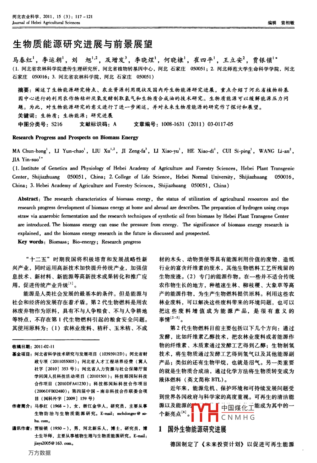 河北農(nóng)業(yè)科學(xué),2011,15(3):117-121Journal of Hebei Agricultural Sciences編輯索相敏生物質(zhì)能源研究進(jìn)展與前景展望馬春紅,李運(yùn)朝,劉旭2,及增發(fā)3,李曉煜!,何曉棣',崔四平',王立安2,賈銀鎖(1.河北省農(nóng)林科學(xué)院遺傳生理研究所,河北省植物轉(zhuǎn)基因中心,河北石家莊05051;2.河北師范大學(xué)生命科學(xué)學(xué)院,河北石家莊050016;3.河北省農(nóng)林科學(xué)院,河北石家莊050051)摘要:闡述了生物能源研究特點(diǎn)、農(nóng)業(yè)資源利用現(xiàn)狀及國(guó)內(nèi)外生物能源研究進(jìn)展,重點(diǎn)介紹了河北省植物轉(zhuǎn)基因中心進(jìn)行的利用農(nóng)作物秸稈厭氧發(fā)酵制取氬氣和生物質(zhì)合成油的技術(shù)研究。生物質(zhì)能源可以緩解能源壓力問(wèn)題。為此,對(duì)生物能源研究的意義進(jìn)行了進(jìn)一步闡述,并對(duì)未來(lái)生物質(zhì)能源的研究作了探討和展望。關(guān)鍵詞:生物質(zhì);生物能源;研究進(jìn)展中圖分類(lèi)號(hào):S216文獻(xiàn)標(biāo)識(shí)碼:A文章編號(hào):1008-1631(2011)03011705Research Progress and Prospects on Biomass EnergyMA Chun-hong, LI Yun-chao, LIu Xu, JI Zeng-fa, LI Xiao-yu, HE Xiao-di, CUI Si-ping, WANG Li-anJIA Yin-suo1. Institute of Genetics and Physiology of Hebei Academy of Agriculture and Forestry Sciences, Hebei Plant TransgenicCenter, Shijiazhuang 050051, China; 2. College of Life Science, Hebei Normal University, Shijiazhuang 050016China; 3. Hebei Academy of Agriculture and Forestry Sciences, Shijiazhuang 050051, China)Abstract: The research characteristics of biomass energy, the status of utilization of agricultural reresearch progress development of biomass energy at home and abroad are describes. The preparation of hydrogen using cropsstraw via anaerobic fermentation and the research techniques of synthetic oil from biomass by Hebei Plant Transgene Centerand the biomass energy research in the future is discussed and Prospected Ce of biomass energy research isare introduced. The biomass energy can ease the pressure from energy. The significandexplained,Key words: Biomass; Bio-energy; Research progress十二五”時(shí)期我國(guó)將積極培育和發(fā)展戰(zhàn)略性新材的木頭、動(dòng)物糞便等具有能源利用價(jià)值的廢物、造紙興產(chǎn)業(yè),同時(shí)運(yùn)用高新技術(shù)加快提升傳統(tǒng)產(chǎn)業(yè),加強(qiáng)信行業(yè)的富含纖維素的廢水,其他生物燃料工藝所殘留的息技術(shù)、新材料、新能源等高新技術(shù)成果轉(zhuǎn)化和推廣應(yīng)生物廢渣。(2)專(zhuān)門(mén)的能源作物。在一些并不適合傳統(tǒng)用,促進(jìn)傳統(tǒng)產(chǎn)業(yè)升級(jí)。農(nóng)作物生長(zhǎng)的地方,種植速生林、柳枝稷、大象草等高能源是人類(lèi)社會(huì)發(fā)展的最基本的條件。但是能源與產(chǎn)的能源作物,為生產(chǎn)生物燃料提供原料。利用這些農(nóng)社會(huì)和經(jīng)濟(jì)的發(fā)展存在著矛盾。第2代生物燃料是用農(nóng)林業(yè)廢料,可以解決這些廢料帶來(lái)的環(huán)境問(wèn)題,也可以林廢棄物作為原料,具有不與人爭(zhēng)糧食、不與人爭(zhēng)耕地把這些廢料增值成為能源產(chǎn)品,是很有意義的等特點(diǎn),不存在第1代生物燃料引起的糧食安全問(wèn)題。事情2-3其使用原料為:(1)農(nóng)林業(yè)廢料、秸稈、玉米秸、不成第2代生物燃料目前主要包括以下幾個(gè)方向:通過(guò)發(fā)酵,比如纖維素乙醇技術(shù),把農(nóng)林業(yè)廢料或者能源作收稿日期:2011-02-11物的纖維素、木質(zhì)素通過(guò)發(fā)酵工藝得到乙醇;生物制氫基金項(xiàng)目:河北省科學(xué)技術(shù)研究與發(fā)展項(xiàng)目(10393912D);河北省財(cái)技術(shù),將生物質(zhì)通過(guò)發(fā)酵工藝得到氫氣以及其他能源副政專(zhuān)項(xiàng)(2011050);河北省人才工程培養(yǎng)經(jīng)費(fèi)(冀人產(chǎn)品;類(lèi)似的還有生物甲烷,也就是沼氣。另一類(lèi)重要社字[2010]353號(hào));河北省人力資源與社會(huì)保障廳留的就是生物質(zhì)合成油,通過(guò)化學(xué)方法將生物質(zhì)轉(zhuǎn)變成為學(xué)回國(guó)人員科技活動(dòng)項(xiàng)目(20101501);科技部國(guó)際科技合作項(xiàng)目(2010DFA41230);科技部國(guó)際科技合作項(xiàng)目液體燃料(英文簡(jiǎn)稱(chēng)BTL)。(2006DFB02480);第四屆中國(guó)-南非科技合作聯(lián)委會(huì)項(xiàng)近年來(lái),能源危機(jī)、保護(hù)環(huán)境和可持續(xù)發(fā)展問(wèn)題受目(網(wǎng)科外字[2009]159號(hào))到世界各國(guó)政府與科學(xué)家的高度重視??稍偕那鍧嵞茏髡吆?jiǎn)介:馬春紅(1968-),女,浙江金華人,研究員,主要從事源以及能源中國(guó)煤化工能成為其中的生物防治與生物質(zhì)能源研究。E-mlil: mchdonger@個(gè)新亮點(diǎn)什HCNMHG通訊作者:賈銀鎖(90-),男,河北新樂(lè)人,博士,研究員,博1國(guó)外生物能源研究進(jìn)展士生導(dǎo)師,主要從事植物生理與生物質(zhì)能源研究。 E-mail:jiay20os@163.com。德國(guó)制定了《未來(lái)投資計(jì)劃》以促進(jìn)可再生能源118河北農(nóng)業(yè)科學(xué)2011年的開(kāi)發(fā),迄今投入研發(fā)經(jīng)費(fèi)達(dá)17.4億歐元。2004年2007年受美國(guó)進(jìn)口生物質(zhì)能源影響,生物柴油產(chǎn)量將德國(guó)可再生能源發(fā)電量占總發(fā)電量的8%,年銷(xiāo)售額達(dá)增長(zhǎng)放緩,總產(chǎn)量為45億L左右。20