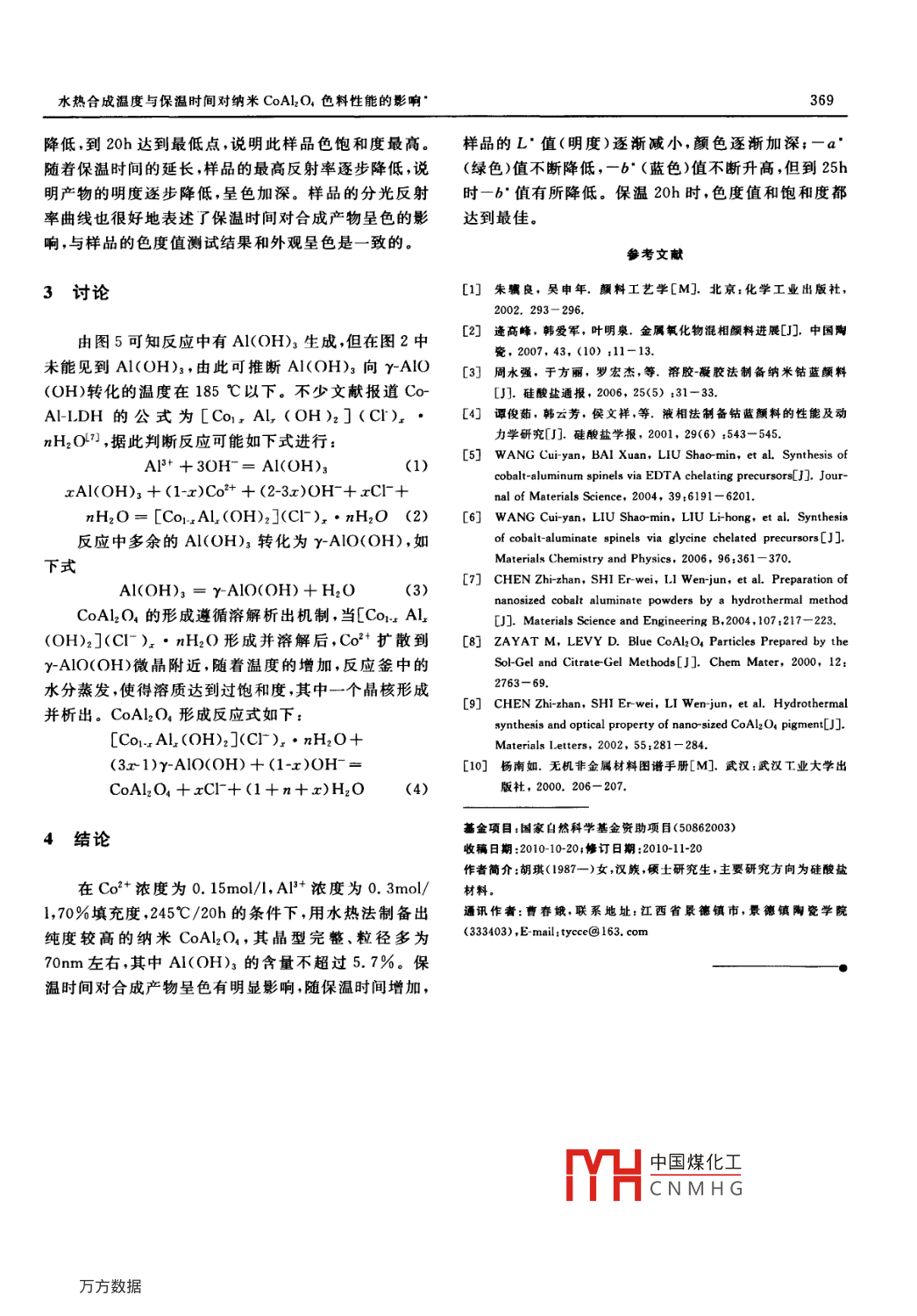 材料T程/2010年增刊2水熱合成溫度與保溫時間對納米CoAl2O4色料性能的影響Effect of Hydrothermal Temperature and HoldingTime on Properties of Nano CoAl2 O4 Pigment胡琪,曹春娥,陳云霞,沈華榮,熊春華(景德鎮(zhèn)陶瓷學院,景德鎮(zhèn)333403QI Hu, CAO Chun-e, ChEN Y un-xia, SHEN Hua-rong, XIONG Chun-hua(Jingdezhen Ceramic Institute, Jingdezhen, 333001, Jiangxi China摘要:以CoCl2·6H2O和ACl2為原料,NaOH為沉淀劑,采用水熱法合成尖晶石型納米鉆藍色料。主要研究合成溫度和保溫時間對CoAl2O色料主晶相、呈色的影響,采用XRD,TEM,FTIR, TG-DTA分光光度計等分析測試技術對合成產物進行表征。結果表明,在245℃/20h能制備出純度較高的納米CoAl2O4,其晶型完整粒度均勻,粒徑多為70m左右,此時的色飽和度和色度值也達最佳關鍵詞:CoAl2O4色料;納米;水熱法;合成溫度;保溫時間中田分類號:TQ174.4文獻標識碼:AAbstract: Nano-sized CoAl2 O, spinel pigment was synthesized hydrothermally using AlCl3 and CoCl26H20 as raw materials, and Naoh as precipitating agent The influence of the hydrothermal treating temperature and holding time on the phase formation, morphology and color generation of theproducts was investigated. The powders were characterized by x-ray diffraction, transmission electronmicroscope, Fourier transform infrared spectroscopy thermal analysis and ultraviolet and visiblespectrophotometer. The results indicate that the spinel structure CoAl2 O nano-powders with high pu-rity, good crystal integrity, uniformly small size and diameter of 70 nm were obtained by hydrother-mal treatment at 245C for 20h, and as well the as-prepared CoAl2 O pigment has optimal chroma saturation and colorimetric valueKey words: CoAl, O4 pigment; nanometer; hydrothermal method; synthesis temperature; holding time鉆藍色料是具有完好尖晶石結構的金屬氧化物混本工作以CoCl2·6H2O和AICl3為原料,NaOH為沉相色料化學式可寫成CoO·Al2O3或CoA2O4,其色淀劑,采用水熱法合成尖晶石型納米鉆藍色料,主要研澤鮮明,耐候性和耐酸堿性好,能耐受各種溶劑,耐熱究合成溫度和保溫時間對CoAl2O4色料主晶相、呈色可達1200℃,是一般色料所不能及的。金屬氧化物的影響,采用XRD,TEM,FTIR和 TG-DTA、分光光混相色料多數采用高溫固相反應獲得,但固相反應受度計、色度儀等分析測試技術對合成產物進行表征。擴散過程控制,需要在高溫條件下,且經過較長的時間,反應才能進行得較完全1。不少文獻報導采用溶1實驗膠凝膠法沉淀法、有機螯合前驅體法等濕化學方法制備鉆藍色料-,但這些方法仍然需要后期的熱處1.1樣品制備理,導致微粒間的團聚和晶粒長大。水熱法的最大優(yōu)本實驗控制不同的合成溫度和保溫時間,確定了點就是可以直接從水介質中得到結晶氧化物,避免了水熱法制備CoAl2O4粉體的最佳工藝條件。具體制高溫煅燒工藝,這不僅使粉體粒度分布窄,團聚程度備過程:取低,純度高,而且為色料合成的低碳工藝開辟了新的道純)和0.31中國煤化h·6HO,分析CNMHG所純),溶于30mL路。 Zhi-Zhan Chen(等人研究了水熱合成鈷藍色料,的蒸餾水中,得 smol, L y ivan分析純)溶液逐滴主要對沉淀劑種類、pH值以及合成溫度進行了探討。加入混合溶液中,直至沉淀完全,并在20℃恒溫水浴水熱合成溫度與保溫時間對納米CoA2O1色料性能的影響367中攪拌1h。前驅體按填充度70%,放入100mL的反245℃應釜內。首先在185,215,245℃三個溫度點,分別保溫20h合成CoAl2O色料,反應結束后產物經去離子水沖洗后,在80℃烘干后得到粉體;再取1,5,10,15,20,25h6種不同的保溫時間,在245℃下合成215℃CoAl2O4色料,反應結束后產物同樣經去離子水沖洗后,在80℃烘干。其具體工藝流程如圖1。AICIHydrothermaCocl, Mixingtreatment10203040506070Filteing and圖2不同反應溫度樣品的XRD曲線SampleDryingwashingFig 2 XRD patterns of samples preparedat various temperatures圖1CoAl2O)4色料制備工藝流程圖Fig 1 Flow chart for the preparation of CoAlg O, pigment3307cm-1是水分子之間的氫鍵和CO2所形成的1.2樣品表征CO2-可能來自于前軀體制備時空氣中混入的雜質。可知,在樣品的紅外吸收譜中,檢測到CoAl2O4與水采用美國 Termo Electron Corporation Nicolet分子的存在。5700傅立葉紅外光譜儀和德國 Bruker D)8 Advance X射線粉末衍射儀進行樣品物相分析,日本電子JEM2010透射電鏡觀察合成產物顯微形貌與顆粒大小,德國耐馳STA449C綜合熱分析儀進行樣品的熱分析美國珀金埃爾默 lambda850紫外-可見光光度計測定樣品的分光反射率,北京康光儀器有限公司的WSO3A型色度儀測定樣品的色度值。245℃40002結果與分析圖3245℃反應20h樣品的FTIR譜2.1反應溫度對納米CoAl2O4的影響Fig 3 FTIR spectrum of CoAl, O)a pigment at 245C for 20h圖2為前驅體在185,215,245℃反應20h所得產物的XRD圖譜。從圖中可以看出,當前驅體在185圖4為245℃反應20h所得樣品的TEM照片?!嫣幚?0h時,主要成分是yAlO(OH)( JCPDS21-從圖中可以看出,晶粒發(fā)育完整,粒度均勻,粒徑多為1307)和 Co-AI-LDH( JCPDS22700);在215℃時,y70m左右,這與用謝勒公式計算的結果相一致。AlO(OH)衍射峰增強,同時CoAl2O4的衍射峰開始出現(xiàn);到245℃時,出現(xiàn)明顯的CoAl2O4衍射峰(JCPDS44-0160),而γAO(OH)的衍射峰消失,得到純相的CoAl2O4。在245℃反應20h所得樣品的XRD曲線中,測得(311)面的半高寬、0角,根據謝勒公式dk/cos(d為晶粒尺寸,λ為X射線波長,B為衍射峰半高寬,0為半衍射角,K取0.89),計算得粒子平均粒徑是70nm。lOOm圖3為在245℃反應20h所得樣品的紅外透射中國煤化工圖CNMHG片譜。526cm-1和679cm1是典型的CoAl2O4吸收Fig 4 TEM micrograph of