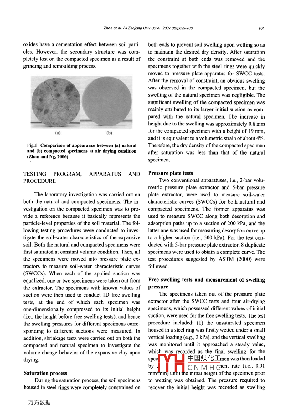 Zhan et al. 1J Zhejiang Univ SciA 2007 8(5):699-706699Journal of Zhejiang Unlversity SCIENCE AISSN 1673-565X (Prit; ISSN 1862- 1775 (Online)www.zju. educnjzus; www. springerink.comE-mail: jzus@zju.edu.cngZUSEffect of suction change on water content and total volumeof an expansive clay'ZHAN Liang-tongt", CHEN Ping', NG C.w.W.3('Department of Civil Engineering, Zhejiang University, Hangzhou 310027, China)(Department of Civil Engineering, Zhejiang Sci-Tech University, Hangzhou 310018, China)(Department ofCivil Engineering. Hong Kong University of Science and Technology, Hong Kong, China)E-mail: zhanlt@zju.edu.cn; chen_ 1230@yahoo.com.cnReceived Oct. 10, 2006; revision acepted Feb. 20, 2007Abstract: A laboratory study was carried out on both natural and compacted specimens to investigate the complex soil-waterinteraction in an unsaturated expansive clay. The laboratory study includes the measurement of soil-water characteristic curves, 1Dfree swelling tests, measurement of swelling pressure and shrinkage tests. The test results revealed that the air-entry value of thenatural specimen was quite low due to cracks and fissures present. The hydraulic hysteresis of the natural specimen was relativelyinsignificant as compared with the compacted specimen. Within a suction range 0 to 500 kPa, a bilinear relationship between freeswelling strain (or swelling pressure) and initial soil suction was observed for both the natural and compacted specimens. As aresult of over-consolidation and secondary structures such as cementation and cracks, the natural specimens exhibited significantlower swelling (or swelling pressure) than the compacted specimen. The change of matric suction exerts a more significant effecton the water phase than on the soil skeleton for this expansive clay.Key words: Expansive soil, Water content, Suction, Swelling, Shrinkagedoi:10.163 1/jzus.2007.A0699Document code: ACLC number: TU4INTRODUCTIONstrength and soil swelling (or a development ofswelling pressure under a confined condition). FieldExpansive clay is widely distributed in the world,studies show that the soil-water interaction inducedand often causes damages to light buildings, pave-by wetting-drying cycles is very complex, and in-ments, and slopes, which has been reported in manyvolves the coupled effects among the changes in wa-countries around the world (Nelson and Miller, 1992;ter content, suction, stress, deformation and shearLiu, 1997). The damage of expansive soils is closelystrength (Ng et al, 2003; Zhan, 2003). For example,related to the strong soil-water interaction in thethe wetting- induced swelling of an expansive clay is ashallow soil layers subject to seasonal wetting-drying function of initial suction (or initial water content),cycles. During dry seasons, evapotranspiration causes initial dry density and confining stress, with the as-loss of water content in the shallow soil layer, andsociated swelling pressure also depending on thehence the expansive soil shrinks and cracks. Duringstress-path employed in the tests (Brackley, 1975).wet seasons, rainfall infiltration results in an increaseA laboratory study was carried out on bothin water content and a decrease in soil suction in thenatural and compacted specimens to improve ourshallow soil layer, which leads to a reduction of shearunde中國(guó)煤化工-water interaction inanC N M H Ghe laboratory studyincluaes tne Tmeasurement 0I soll-water characteristic↓Corresponding author"Project No. 50408023) supported by National Natural Sciencecurves, free swelling tests, measurement of swellingFoundation of Chinapressure, and shrinkage tests. On the basis of the test00Zhan et al. 1J Zhejing Univ SciA 2007 8(5):699-706results, the relationships among matric suction, wateras 18.5%, with the maximum compaction pressurecontent and void ratio for the expansive soil werebeing 800 kPa. The dry density of the obtainedobtained, and the difference in the soil-water charac-specimens was equal to the average value of theteristic between natural and compacted specimensnatural specimens (i.e, 1.56 Mg/m ). The compactionwas identified.water content (i.e, 18.5%) was on the dry side of theoptimum water content. The optimum water contentas determined by the proctor compaction test wasMATERIALS AND SPECIMEN PREPARATION20.5%, corresponding to a maximum dry density ofMETHOD1.66 Mg/m'. After completion of preparation, theinitial suction of the natural specimens was measuredThe soil used in this laboratory study was aby a tensiometer, with the values ranging from 20 tobrownish-yellow expansive clay taken from the re-30 kPa. The initial suction of the compacted specimensearch slope in Zaoyang, Hubei of China (Ng et al,was measured by a high suction probe, with the2003). The basic physical properties of the soil aremeasured value being about 540 kPa (Zhan, 2003). Itpresented in Table 1. In accordance with the USCS was obvious that the difference in the initial suctionclassification system, the soil is clasified as a siltybetween the natural and compacted specimens is at-clay. With respect to expansion potential, the soil cantributable to the difference in their initial water con-be classified as a medium expansive soil in accor-tent.dance with the criterion proposed by Sridharan andFig.1 shows a comparison of the appearance ofPrakash (2000).natural and compacted specimens. The two specimensThe procedure for preparing natural specimenswere both in an air-drying state. Open cracks andincludes cutting appropriate size of soil blocks from fissures were well developed in the natural specimen,the block samples and then trimming them into di-whereas no obvious cracks appeared on the com-mensions ftting an oedometer ring (i.e, 70 mm in pacted specimen. In addition, there appeared somediameter and 19 mm in height). The compactedblack mottles on the natural specimen, which werespecimens were prepared with static compactionidentified as iron and manganese oxides (approxi-method. The compaction wate