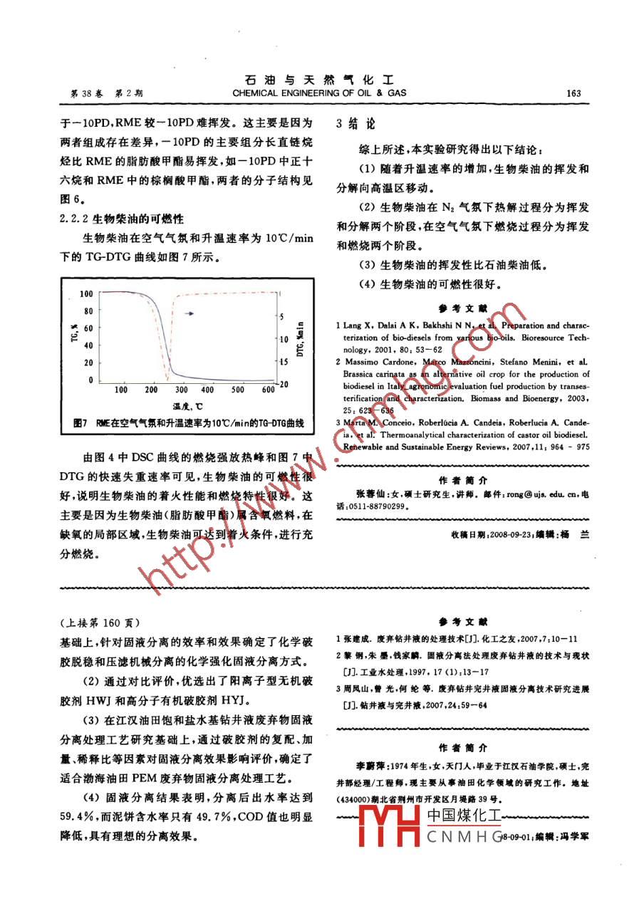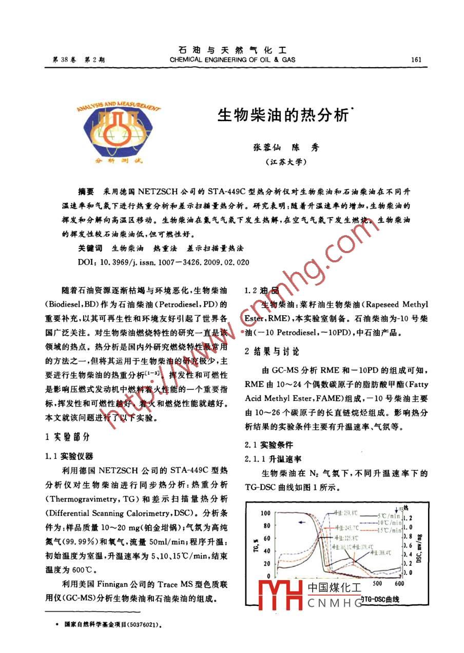石油與天然氣化工第38卷第2期CHEMICAL ENGINEERING OF OIL & GAS生物柴油的熱分析張蓉仙陳秀江蘇大學(xué))摘要朱用德國(guó) NETZSCH公司的STA449C型熱分析儀對(duì)生物柴油和石油柴油在不同升溫速率和氣氛下進(jìn)行熱重分析和差示掃描量熱分析。研究表明:隨著升溫速率的增加,生物柴油的揮發(fā)和分解向高溫區(qū)移動(dòng)。生物柴油在氯氣氣氛下發(fā)生熱解,在空氣氣氛下發(fā)生燃燒。生物柴油的揮發(fā)性較石油柴油低,但可燃性好關(guān)鍵詞生物柴油熱重法差示掃描量熱法DOl:10.3969/j,issn.1007-3426.209.02.020隨著石油資源逐漸枯竭與環(huán)境惡化,生物柴油1.2油品( Biodiesel,BD)作為石油柴油( Petrodiesel,PD)的生物柴油:菜籽油生物柴油( Rapeseed Methyl重要補(bǔ)充,以其可再生性和環(huán)境友好引起了世界各 Ester,RME),本實(shí)驗(yàn)室制備。石油柴油為-10號(hào)柴國(guó)廣泛關(guān)注。對(duì)生物柴油燃燒特性的研究一直是該油(-10 Petrodiesel,-10PD),中石油產(chǎn)品。領(lǐng)域的熱點(diǎn)熱分析是國(guó)內(nèi)外研究燃燒特性最常用2結(jié)果與討論的方法之一,但將其運(yùn)用于生物柴油的研究極少,主要進(jìn)行生物柴油的熱重分析-3。揮發(fā)性和可燃性由GCMS分析RME和-10PD的組成可知,是影響壓燃式發(fā)動(dòng)機(jī)中燃料著火性能的一個(gè)重要指RME由10~24個(gè)偶數(shù)碳原子的脂肪酸甲酯(Fay標(biāo),揮發(fā)性和可燃性越好,著火和燃燒性能就越好Acid Methyl Ester,FAME)組成,-10號(hào)柴油主要本文就該問(wèn)題進(jìn)行了以下實(shí)驗(yàn)由10~26個(gè)碳原子的長(zhǎng)直鏈烷烴組成。影響熱分析結(jié)果的實(shí)驗(yàn)條件主要有升溫速率、氣氛等。1實(shí)驗(yàn)部分2.1實(shí)驗(yàn)條件1.1實(shí)驗(yàn)儀器2.1.1升溫速率利用德國(guó) NETZSCH公司的STA-449C型熱生物柴油在N2氣氛下,不同升溫速率下的分析儀對(duì)生物柴油進(jìn)行同步熱分析:熱重分析 TG-DSC曲線如圖1所示。( Thermogravimetry,TG)和差示掃描量熱分析( Differential Scanning Calorimetry,DSC)。分析條+135c/min.2件為:樣品質(zhì)量10~20mg(鉑金坩鍋);氣氛為高純+12C15℃/m0氮?dú)?9.998和氧氣流量50 ml/ming;程序升溫;2804:25.8.8曾1.6音初始溫度為室溫升溫速率為5、10、15℃/min,結(jié)束上混4.4溫度為600℃。利用美國(guó) Finnigan公司的 Trace Ms型色質(zhì)聯(lián)中國(guó)煤化工0600用儀(GCMS)分析生物柴油和石油柴油的組成CNMHTGDs曲線國(guó)家自然科學(xué)基金項(xiàng)目(50376021)生物柴油的熱分析由圖1可見(jiàn),隨著升溫速率的增加,RME的下的熱解過(guò)程分成二個(gè)階段:揮發(fā)和分解。RME中TG和DSC曲線向高溫區(qū)偏移。這主要是由于隨FAME揮發(fā)和分解吸收的熱量及峰值溫度見(jiàn)圖3著升溫速率的增加,RME中FAME尚未來(lái)得及揮RME在空氣氣氛下的燃燒過(guò)程也分為兩個(gè)階發(fā)和分解就進(jìn)入更高的溫度,造成揮發(fā)和分解滯后。段:揮發(fā)和燃燒。RME中FAME揮發(fā)時(shí)吸收的熱升溫速率越大,熱滯后現(xiàn)象越明顯。這與 Marta M.量和燃燒時(shí)放出的熱量及峰值溫度見(jiàn)圖4。Concei等的研究結(jié)果一致]。2.2生物柴油的揮發(fā)性和可燃性2.1.2氣氛2.2.1生物柴油的揮發(fā)性生物柴油在升溫速率為10℃/min,情性(N2)生物柴油與石油柴油在N2氣氛和升溫速率為和氧化(模擬空氣:N+O2)氣氛下的 TG-DSC曲10c/min下的 TGDTG曲線如圖5所示,揮發(fā)溫線如圖2所示。RME中FAME在N2氣氛下熱解,度如表1所示。在空氣氣氛下燃燒。由圖2可見(jiàn)RME在N2氣氛峰值:245.7℃峰值:228.9℃值4C一室氣0.540}峰值:18061.5另峰值:304.1℃100200300400500溫度,℃度,℃圖5RE與-100在№氣氛和升溫速率為10℃/min下的TG-DTG曲線圖2R在不同氣氛下的 TG-DSC曲線樣品88.5℃250.580.0316.8注:T為揮發(fā)分初析溫度,樣品失重5%對(duì)應(yīng)的溫度T。為揮發(fā)分最大析出速率對(duì)應(yīng)的溫度,DTG曲線峰值對(duì)應(yīng)的溫度;T為揮發(fā)分析出終止溫度,樣品200300400500600失重95%對(duì)應(yīng)的溫度溫度,℃圖3RME在№氣氛和升溫速率為10℃/min下的 TG-DSC曲線由圖5和表1可見(jiàn)RME較-10PD難揮發(fā),難著火。這與X.Lang等的研究結(jié)果一致10PD的初析溫度較低,只有88.5℃,終止溫度為↓放熱10.52197℃。而在-10PD揮發(fā)分析出速率已達(dá)到最峰的綜合分析0.5曾大(180.0℃)時(shí),RME的失重僅為3.92%,幾乎未峰的綜合分1.0終止點(diǎn):186.9℃開(kāi)始揮發(fā)。RME的初析溫度為186.5℃,終止溫度起始點(diǎn):253終止點(diǎn):34-2.0為316.8℃,揮發(fā)分的初析溫度和終止溫度明顯高100200300400500600溫度,℃中國(guó)煤化工圖4"E在空氣氣氛和升溫速率為10℃/mn下的dYHCNMHG綜橢酸甲脂TG-DSC曲線圖6分子結(jié)構(gòu)石油與天然氣化工第38卷第2期CHEMICAL ENGINEERING OF OIL GAS163于-1 PD, RME較-10PD難揮發(fā)。這主要是因?yàn)?結(jié)論兩者組成存在差異,-10PD的主要組分長(zhǎng)直鏈烷綜上所述,本實(shí)驗(yàn)研究得出以下結(jié)論:烴比RME的脂肪酸甲酯易揮發(fā),如-10PD中正十(1)隨著升溫速率的增加,生物柴油的揮發(fā)和六烷和RME中的棕櫚酸甲酯,兩者的分子結(jié)構(gòu)見(jiàn)分解向高溫區(qū)移動(dòng)圖6(2)生物柴油在N2氣氛下熱解過(guò)程分為揮發(fā)2.2生物柴油的可燃性和分解兩個(gè)階段,在空氣氣氛下燃燒過(guò)程分為揮發(fā)生物柴油在空氣氣氛和升溫速率為10