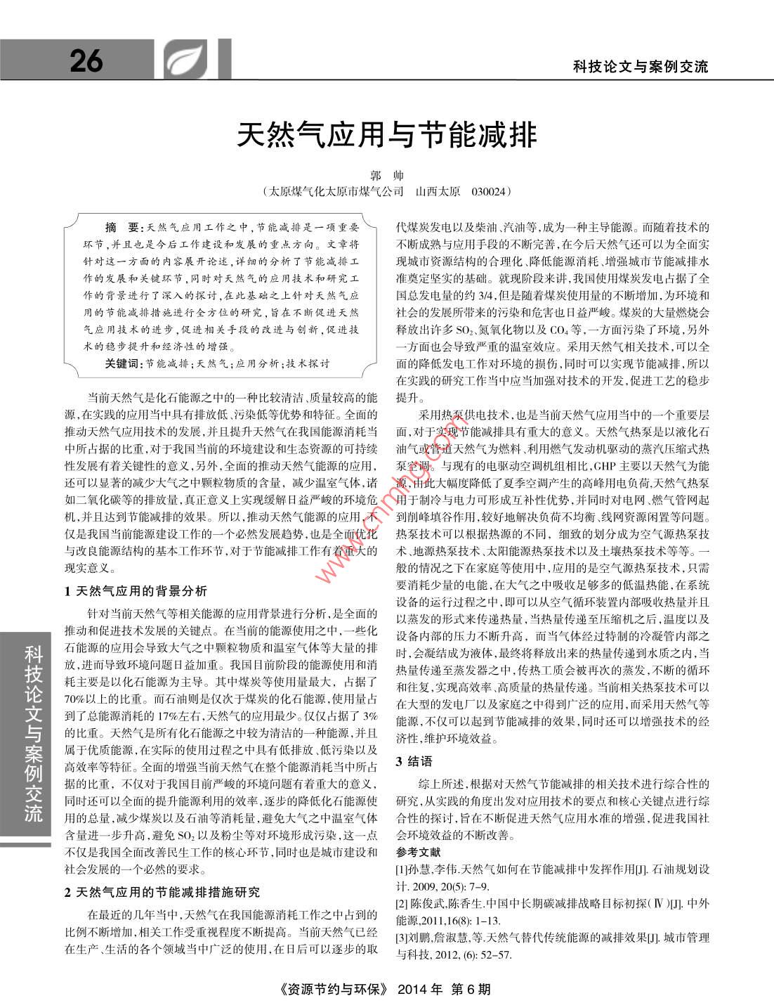 26科技論文與案例交流天然氣應(yīng)用與節(jié)能減排郭帥太原煤氣化太原市煤氣公司山西太原030024)摘要:天然氣應(yīng)用工作之中,節(jié)能減排是一項(xiàng)重要代煤炭發(fā)電以及柴油、汽油等,成為一種主導(dǎo)能源。而隨著技術(shù)的環(huán)節(jié),并且也是今后工作建設(shè)和發(fā)展的重點(diǎn)方向。文章將不斷成熟與應(yīng)用手段的不斷完善,在今后天然氣還可以為全面實(shí)針對(duì)這一方面的內(nèi)容展開(kāi)論述,詳細(xì)的分析了節(jié)能減排工現(xiàn)城市資源結(jié)構(gòu)的合理化、降低能源消耗、增強(qiáng)城市節(jié)能減排水作的發(fā)展和關(guān)鍵環(huán)節(jié),同時(shí)對(duì)天然氣的應(yīng)用技術(shù)和研究工準(zhǔn)奠定堅(jiān)實(shí)的基礎(chǔ)。就現(xiàn)階段來(lái)講我國(guó)使用煤炭發(fā)電占據(jù)了全作的背景進(jìn)行了深入的探討,在此基礎(chǔ)之上針對(duì)天然氣應(yīng)國(guó)總發(fā)電量的約34,但是隨著煤炭使用量的不斷増加,為環(huán)境和用的節(jié)能減排措施進(jìn)行全方住的研究,旨在不斷促進(jìn)天然社會(huì)的發(fā)展所帶來(lái)的污染和危害也日益嚴(yán)峻。煤炭的大量燃燒會(huì)氣應(yīng)用技術(shù)的進(jìn)步,促進(jìn)相關(guān)手段的改進(jìn)與創(chuàng)新,促進(jìn)技釋放出許多SO2、氮氧化物以及CO4等,一方面污染了環(huán)境,另外術(shù)的穩(wěn)步提升和經(jīng)濟(jì)性的增強(qiáng)方面也會(huì)導(dǎo)致嚴(yán)重的溫室效應(yīng)。采用天然氣相關(guān)技術(shù),可以全關(guān)鍵詞:節(jié)能減排;天然氣;應(yīng)用分析;技術(shù)探討面的降低發(fā)電工作對(duì)環(huán)境的損傷,同時(shí)可以實(shí)現(xiàn)節(jié)能減排,所以在實(shí)踐的研究工作當(dāng)中應(yīng)當(dāng)加強(qiáng)對(duì)技術(shù)的開(kāi)發(fā),促進(jìn)工藝的穩(wěn)步當(dāng)前天然氣是化石能源之中的一種比較清潔、質(zhì)量較高的能提升。源,在實(shí)踐的應(yīng)用當(dāng)中具有排放低、污染低等優(yōu)勢(shì)和特征。全面的采用熱泵供電技術(shù),也是當(dāng)前天然氣應(yīng)用當(dāng)中的一個(gè)重要層推動(dòng)天然氣應(yīng)用技術(shù)的發(fā)展,并且提升天然氣在我國(guó)能源消耗當(dāng)面,對(duì)于實(shí)現(xiàn)節(jié)能減排具有重大的意義。天然氣熱泵是以液化石中所占據(jù)的比重,對(duì)于我國(guó)當(dāng)前的環(huán)境建設(shè)和生態(tài)資源的可持續(xù)油氣或管道天然氣為燃料、利用燃?xì)獍l(fā)動(dòng)機(jī)驅(qū)動(dòng)的蒸汽壓縮式熱性發(fā)展有著關(guān)鍵性的意義,另外,全面的推動(dòng)天然氣能源的應(yīng)用,泵空調(diào)。與現(xiàn)有的電驅(qū)動(dòng)空調(diào)機(jī)組相比,GHP主要以天然氣為能還可以顯著的減少大氣之中顆粒物質(zhì)的含量,減少溫室氣體,諸源,由此大幅度降低了夏季空調(diào)產(chǎn)生的高峰用電負(fù)荷,天然氣熱泵如二氧化碳等的排放量,真正意義上實(shí)現(xiàn)緩解日益嚴(yán)峻的環(huán)境危用于制冷與電力可形成互補(bǔ)性?xún)?yōu)勢(shì),并同時(shí)對(duì)電網(wǎng)、燃?xì)夤芫W(wǎng)起節(jié)能減排的效果。所以,推動(dòng)天然氣能源的應(yīng)用,不到削峰填谷作用,較好地解決負(fù)荷不均衡、線(xiàn)網(wǎng)資源閑置等問(wèn)題。僅是我國(guó)當(dāng)前能源建設(shè)工作的一個(gè)必然發(fā)展趨勢(shì),也是全面優(yōu)化熱泵技術(shù)可以根據(jù)熱源的不同,細(xì)致的劃分成為空氣源熱泵技與改良能源結(jié)構(gòu)的基本工作環(huán)節(jié)對(duì)于節(jié)能減排工作有著重大的術(shù)、地源熱泵技術(shù)、太陽(yáng)能源熱泵技術(shù)以及土壤熱泵技術(shù)等等現(xiàn)實(shí)意義。般的情況之下在家庭等使用用的是空氣源熱泵技術(shù),只需1天然氣應(yīng)用的背景分析要消耗少量的電能,在大氣之中吸收足夠多的低溫?zé)崮?在系統(tǒng)設(shè)備的運(yùn)行過(guò)程之中,即可以從空氣循環(huán)裝置內(nèi)部吸收熱量并且針對(duì)當(dāng)前天然氣等相關(guān)能源的應(yīng)用背景進(jìn)行分析,是全面的以蒸發(fā)的形式來(lái)傳遞熱量,當(dāng)熱量傳遞至壓縮機(jī)之后,溫度以及推動(dòng)和促進(jìn)技術(shù)發(fā)展的關(guān)鍵點(diǎn)。在當(dāng)前的能源使用之中,一些化設(shè)備內(nèi)部的壓力不斷升高,而當(dāng)氣體經(jīng)過(guò)特制的冷凝管內(nèi)部之科石能源的應(yīng)用會(huì)導(dǎo)致大氣之中顆粒物質(zhì)和福室氣體等大量的排時(shí),會(huì)凝結(jié)成為液體最終將釋放出來(lái)的熱量傳遞到水質(zhì)之內(nèi),當(dāng)放,進(jìn)而導(dǎo)致環(huán)境問(wèn)題日益加重。我國(guó)目前階段的能源使用和消熱量傳遞至蒸發(fā)器之中,傳熱工質(zhì)會(huì)被再次的蒸發(fā),不斷的循環(huán)70%以上的比重。而石油則是僅次于煤炭的化石能源使用量占在大型的發(fā)電廠以及家庭之中得到廣泛的應(yīng)用,而采用天然氣等到了總能源消耗的17%左右,天然氣的應(yīng)用最少。僅僅占據(jù)了3%能源,不僅可以起到節(jié)能減排的效果,同時(shí)還可以增強(qiáng)技術(shù)的經(jīng)與的比重。天然氣是所有化石能源之中較為清潔的種能源,并且濟(jì)性,維護(hù)環(huán)境效益。