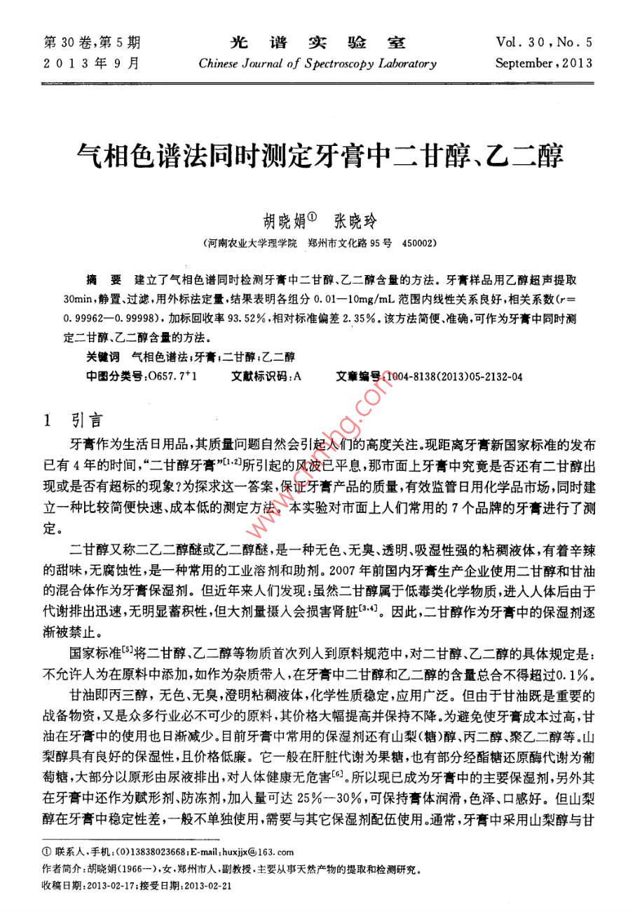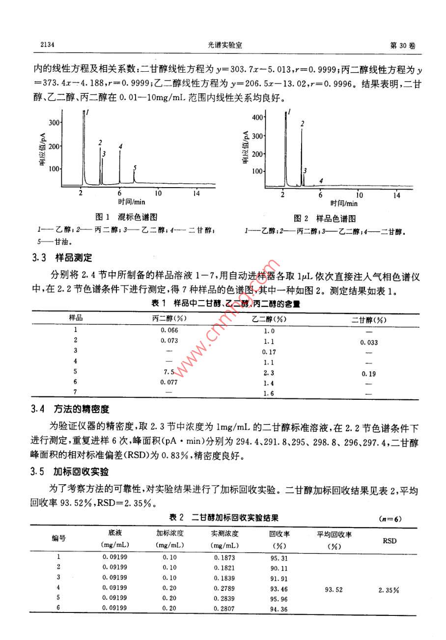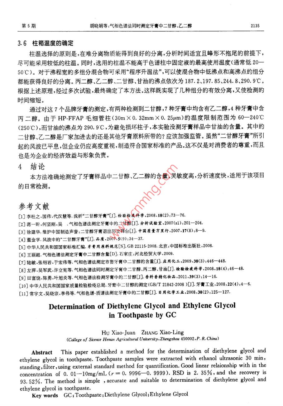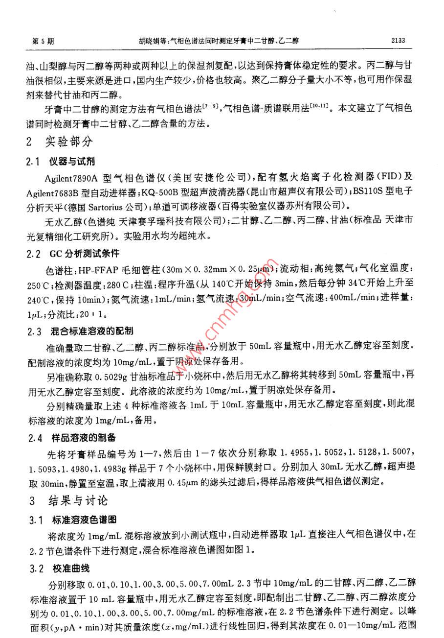 第30卷,第5期光譜實(shí)驗(yàn)室Vol 30, No. 52013年9月Chinese journal of Spectroscopy LaboratorySeptember, 2013氣相色譜法同時(shí)測定牙膏中二甘醇、乙二醇胡曉娟①張曉玲(河南農(nóng)業(yè)大學(xué)理學(xué)院鄭州市文化路95號(hào)450002)摘要建立了氣相色譜同時(shí)檢測牙膏中二甘醇、乙二醇含量的方法。牙膏樣品用乙醇超聲提取30min,靜置、過濾用外標(biāo)法定量結(jié)果表明各組分0.01-10mg/mL范圖內(nèi)線性關(guān)系良好,相關(guān)系數(shù)(r=0.99962-0.9998),加標(biāo)回收率9352%相對(duì)標(biāo)準(zhǔn)偏差235%該方法簡便、準(zhǔn)確,可作為牙膏中同時(shí)測定二甘醇、乙二醇含量的方法關(guān)鍵詞氣相色譜祛;牙膏;二甘醇;乙二醇中圖分類號(hào):O657.71文獻(xiàn)標(biāo)識(shí)碼:A文章編號(hào):1004-8138(2013)05-2132-04引言牙膏作為生活日用品,其質(zhì)量問題自然會(huì)引起人們的高度關(guān)注現(xiàn)距離牙膏新國家標(biāo)準(zhǔn)的發(fā)布已有4年的時(shí)間,“二甘醇牙膏1:2所引起的風(fēng)波已平息,那市面上牙膏中究竟是否還有二甘醇出現(xiàn)或是否有超標(biāo)的現(xiàn)象?為探求這一答案保證牙膏產(chǎn)品的質(zhì)量,有效監(jiān)管日用化學(xué)品市場,同時(shí)建立一種比較簡便快速、成本低的測定方法。本實(shí)驗(yàn)對(duì)市面上人們常用的7個(gè)品牌的牙膏進(jìn)行了測定二甘醇又稱二乙二醇醚或乙二醇醚是一種無色、無臭、透明、吸濕性強(qiáng)的粘稠液體,有著辛辣的甜味,無腐蝕性是一種常用的工業(yè)溶劑和助劑。2007年前國內(nèi)牙膏生產(chǎn)企業(yè)使用二甘醇和甘油的混合體作為牙膏保濕劑。但近年來人們發(fā)現(xiàn):雖然二甘醇屬于低毒類化學(xué)物質(zhì)進(jìn)入人體后由于代謝排出迅速,無明顯蓄積性,但大劑量攝入會(huì)損害腎臟。因此,二甘醇作為牙膏中的保濕劑逐漸被禁止。國家標(biāo)準(zhǔn)將二甘醇乙二醇等物質(zhì)首次列入到原料規(guī)范中,對(duì)二甘醇、乙二醇的具體規(guī)定是不允許人為在原料中添加如作為雜質(zhì)帶入,在牙膏中二甘醇和乙二醇的含量總合不得超過0.1%甘油即丙三醇,無色、無臭澄明粘稠液體,化學(xué)性質(zhì)穩(wěn)定,應(yīng)用廣泛。但由于甘油既是重要的戰(zhàn)備物資,又是眾多行業(yè)必不可少的原料,其價(jià)格大幅提高并保持不降。為避免使牙膏成本過高,甘油在牙膏中的使用也日漸減少目前牙膏中常用的保濕劑還有山梨(糖)醇、丙二醇聚乙二醇等。山梨醇具有良好的保濕性,且價(jià)格低廉。它一般在肝臟代謝為果糖,也有部分經(jīng)酯糖還原酶代謝為葪萄糖,大部分以原形由尿液排出,對(duì)人體健康無危害。所以現(xiàn)已成為牙膏中的主要保濕劑,另外其在牙膏中還作為賦形劑防凍劑加入量可達(dá)25%-30%,可保持膏體潤滑色澤、口感好。但山梨醇在牙膏中穩(wěn)定性差,一般不單獨(dú)使用需要與其它保濕劑配伍使用。通常,牙膏中采用山梨醇與甘①聯(lián)系人,手機(jī):(0)13838023668E-mailhuxjjx@163.com作者簡介:胡曉娟(1966-),女,鄭州市人,副教授主要從事天然產(chǎn)物的提取和檢測研究。收稿日期:2013-02-17;接受日期:2013-02-21第5期胡曉娟等:氣相色譜法同時(shí)測定牙膏中二甘醇、乙二醇油、山梨醇與丙二醇等兩種或兩種以上的保濕劑復(fù)配,以達(dá)到保持膏體穩(wěn)定性的要求。丙二醇與甘油很相似,主要來源是進(jìn)口,國內(nèi)生產(chǎn)較少,價(jià)格也較高。聚乙二醇分子量大小不等,也可用作保濕劑來替代甘油和丙二醇。牙膏中二甘醇的測定方法有氣相色譜法-”,氣相色譜質(zhì)譜聯(lián)用法。本文建立了氣相色譜同時(shí)檢測牙膏中二甘醇、乙二醇含量的方法。2實(shí)驗(yàn)部分2.1儀器與試劑Agilent7890A型氣相色譜儀(美國安捷倫公司),配有氫火焰離子化檢測器(FD)及Agilent7683B型自動(dòng)進(jìn)樣器;KQ-500B型超聲波清洗器(昆山市超聲儀有限公司);BS110S型電子分析天平(德國 Sartorius公司);單道可調(diào)移液器(百得實(shí)驗(yàn)室儀器蘇州有限公司)。無水乙醇(色譜純天津賽孚瑞科技有限公司);二甘醇、乙二醇、丙二醇甘油(標(biāo)準(zhǔn)品天津市光復(fù)精細(xì)化工研究所)。實(shí)驗(yàn)用水均為超純水。2.2GC分析測試條件色譜柱: HP-FFAP毛細(xì)管柱(30m×0.32mm×0.25pm);流動(dòng)相:高純氮?dú)?氣化室溫度:250C;檢測器溫度:280C;柱溫:程序升溫(從14℃開始保持3min,然后每分鐘34℃開始上升至240℃,保持10min);氮?dú)饬魉?1mL/min;氫氣流速:30mL/min;空氣流速:400mL/min;進(jìn)樣量:1μL;分流比:20:12.3混合標(biāo)準(zhǔn)溶液的配制準(zhǔn)確量取二甘醇、乙二醇、丙二醇標(biāo)準(zhǔn)品,分別放于50mL容量瓶中,用無水乙醇定容至刻度。配制溶液的濃度均為10mg/mL,置于陰涼處保存?zhèn)溆谩A頊?zhǔn)確稱取0.5029g甘油標(biāo)準(zhǔn)品于小燒杯中,然后用無水乙醇將其轉(zhuǎn)移到50mL容量瓶中,再用無水乙醇定容至刻度。此溶液的濃度約為10mg/mL,置于陰涼處保存?zhèn)溆谩7謩e精確量取上述4種標(biāo)準(zhǔn)溶液各1mL于10mL容量瓶中,用無水乙醇定容至刻度,則此混標(biāo)溶液的濃度為1mg/mL,備用。2.4樣品溶液的制備先將牙膏樣品編號(hào)為1-7,然后由1-7依次分別稱取1.4955,1,5052,1.5128,1.5007,1.5093,1,4980,1.4983g樣品于7個(gè)小燒杯中,用保鮮膜封口。分別加入30mL無水乙醇,超