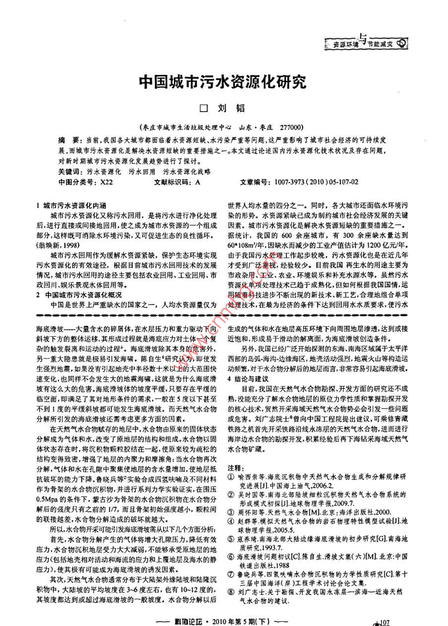 匯資源環(huán)境與節(jié)能減文可中國城市污水資源化研究0劉韜(棗莊市城市生活垃圾處理中心山東. 棗莊277000)摘要:當前,我國各大城市都面臨著水資源短缺、水污染嚴重等問題,這嚴重影響了城市社會經(jīng)濟的可持續(xù)發(fā)展,而城市污水資源化是解決水資源短缺的重要措施之一。本文通過論述國內(nèi)污水資源化技術狀況及存在問題,對新時期城市污水資源化發(fā)展趨勢進行了探討。關鍵詞:污水資源化污水回用污水資源化戰(zhàn)略中圖分類號: X22文獻標識碼: A文章編號: 1007-3973(2010 )0S-107-021城市污水資源化內(nèi)涵世界人均水量的四分之一。同時,各大城市還面臨水環(huán)境污城市污水資源化又稱污水回用,是將污水進行凈化處理染的形勢。 水資源緊缺已成為制約城市社會經(jīng)濟發(fā)展的關鍵后,進行直接或間接地回用,使之成為城市水資源的一一個組成因素。城市污水資源化是解決水資源短缺的重要措施之一。部分,這樣既可消除水環(huán)境污染,又可促進生態(tài)的良性循環(huán)。據(jù)統(tǒng)計,我國的600余座城市,有300余座缺水量達到(翁煥新,1998)60* 108m/年,因缺水而減少的工業(yè)產(chǎn)值估計為1200 億元/年。城市污水回用作為緩解水資源緊缺,保護生態(tài)環(huán)境實現(xiàn)由于我國污水處理工作起步較晚,污水資源化也是在近幾年污水資源化的有效途徑,根據(jù)目前城市污水回用技術的發(fā)展才受到廣 泛重視,經(jīng)驗較少。目前我國再生水的用途主要為情況,城市污水回用的途徑主要包括農(nóng)業(yè)回用、工業(yè)回用、市市政雜用、 工業(yè)、農(nóng)業(yè)、環(huán)境娛樂和補充水源水等。雖然污水政回川、娛樂景觀水體回用等。資源化單項處理技術己趨于成熟化,但如何根據(jù)我國國情,運2中國城市污水資源化概況用隨著科技進步不斷出現(xiàn)的新技術、新工藝,合理地組合單項中國是世界上嚴重缺水的國家之一,人均水資源量僅為處理技術,在最為經(jīng)濟的條件下達到回用水水質(zhì)要求,使污水海底滑坡---大量含水的碎屑體,在水層壓力和重力驅(qū)動下向生成的氣體和水在地層 高壓環(huán)境下向周圍地層滲透,達到或接斜坡下方的整體運移,其形成過程就是海底應力對土體-一個復近飽和,形成 易于滑動的解離面,為海底滑坡創(chuàng)造條件。雜的觸發(fā)裂離和運動的過程*。海底滑坡除其本身的危害外,另外,我國已經(jīng)廣泛開始探測的東海、南海區(qū)域?qū)儆谔窖罅硪恢卮箅[患就是極易引發(fā)海嘯。陳自生“研究認為,即使發(fā)西部的 島弧-海溝-邊緣海區(qū),地殼活動強烈,地震火山等構造運生強烈地震,如果沒有引起地殼中半徑數(shù)十米以上的大范圍快動頻繁,對 于水合物分解后的地層而言,非常容易引起海底滑坡。速變化,也同樣不會發(fā)生大的地霞海嘯。這就是為什么海底滑4結論與建議坡有這么大的危害。海底滑坡體的坡度平緩,只要存在平緩的目前,我國在天然氣水合物勘探.開發(fā)方面的研究還不成臨空面,即滿足了其對地形條件的需求,一-般在5度以下甚至熟, 沒能充分了解水合物地層的原位力學性質(zhì)和掌握勘探開發(fā)不到I度的平緩斜坡都可能發(fā)生海底滑坡。而天然氣水合物的核心技術, 貿(mào)然開采海域天然氣水合物勢必會引發(fā)一些問題分解所引發(fā)的海底滑坡還需考慮更多方面的因素。或危害。劉廣志院士*曾向中國工程院提出建議,可乘修青藏在天然氣水合物賦存的地層中,水合物由原來的固體狀態(tài)鐵路之機首先開采鐵路沿線永凍層的天然氣水合物,進而進行分解成為氣體和水,改變了原地層的結構和組成。水合物以固海岸邊水 合物的勘探開發(fā),積累經(jīng)驗后再下海鉆采海域天然氣體狀態(tài)存在時,將沉積物顆粒膠結在一一起, 使原來較為疏松的水合物礦藏。結構變得致密,增強了地層的內(nèi)聚力和摩擦角:當水合物再次分解,氣體和水在孔際中聚集使地層的含水量增加,使地層抵注釋:抗破壞的能力下降。魯曉兵等”實驗合成四氫味響及不同材料0喻西柴等,海底沉積物中天然氣水合物生成和分解規(guī)律研作為骨架的水合物沉積物,并進行系列力學實驗證實,在圍壓究進展[].中國海上油氣,2006.2.0.5Mpa的條件下,蒙古沙為骨架的水合物沉積物在水合物分②吳時國等,南海北部陸坡細粒沉積物天然氣水合物系統(tǒng)的解后的強度只有之前的1/7,而且骨架初始強度越小,顆粒間形成模式初探[].地球物理學報,2009.7.③周懷陽等.天然氣水合物[M].北京:海洋出版社,2000.的聯(lián)接越差,水合物分解造成的破壞就越大。④趙群等.模擬天然氣水合物的巖石物理特性模型試驗[].地所以,水合物開采可能引發(fā)海底滑坡需從以下幾個方面分析:球物理學報,2005..首先,水合物分解產(chǎn)生的氣體將增大孔隙壓力,降低有效⑤ 寇養(yǎng)琦.南海北部大陸邊緣海底滑坡的初步研究[G]南海地應力水合物沉積地層受力大大減弱,不能夠承受原地層的地質(zhì)研究,1993.7.應力(包括地殼相對活動和海流的應力和上覆地層及海水的靜⑥ 海底滑坡問題初議(C1.陳自生滑坡文集(六)ML.北京:中國鐵道出版社,1988應力),使其極有可能成為海底滑坡的誘發(fā)因素。其次,天然氣水合物通常分布于大陸架外緣陸坡和陸隆沉⑦魯曉兵等,四氫呋哺水合物沉積物的力學性質(zhì