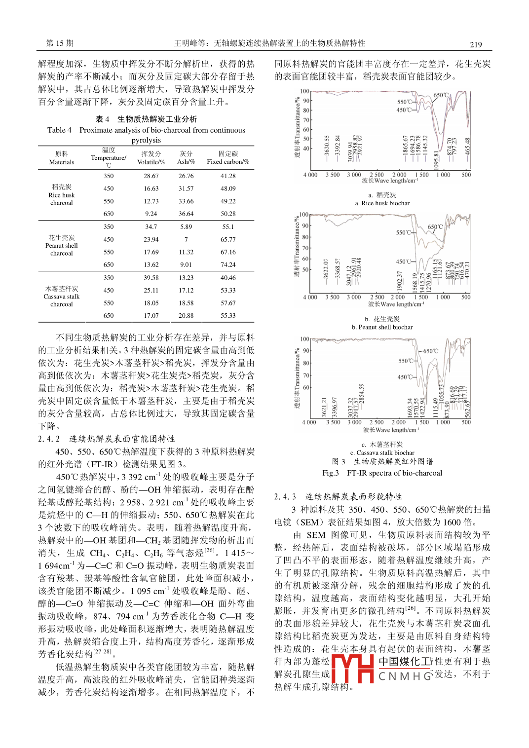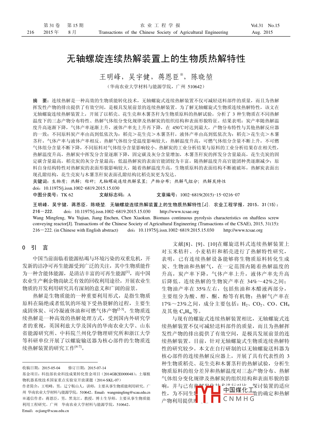 第31卷第15期農(nóng)業(yè)工程學(xué)報(bào)Vol 31 No 152162015年8月Transactions of the Chinese Society of Agricultural EngineeringAug.2015無軸螺旋連續(xù)熱解裝置上的生物質(zhì)熱解特性王明峰,吳宇健,蔣恩臣,陳曉堃(華南農(nóng)業(yè)大學(xué)材料與能源學(xué)院,廣州510642)摘要:連續(xù)熱解是一種髙效的生物質(zhì)能轉(zhuǎn)化技術(shù),無軸螺旋式連續(xù)熱解裝置不僅可減輕送料部件的質(zhì)量,而且為熱解揮發(fā)性產(chǎn)物的排岀提供了有效空間,是極具發(fā)展前景的連續(xù)熱解裝置。為了解無軸螺旋式生物質(zhì)連續(xù)熱解特性,該文在無軸螺旋連續(xù)熱解裝置上,開展了以稻殼、花生殼和木薯莖稈為生物質(zhì)原料的熱解試驗(yàn),分析了3種生物質(zhì)在不同熱解溫度下的三態(tài)產(chǎn)物分布特性、熱解氣體組分變化規(guī)律及熱解炭的組織結(jié)構(gòu)和表面形貌特征。結(jié)果表明:炭產(chǎn)率隨熱解溫度升高逐漸下降,氣體產(chǎn)率逐漸上升,液體產(chǎn)率先上升再下降,在450℃時(shí)達(dá)到最大,產(chǎn)物分布特性與其他熱解反應(yīng)器的一致;不同原料炭產(chǎn)率由高到低依次為:稻殼>花生殼>木薯莖稈,液體產(chǎn)率由高到低依次為:稻殼>花生殼>木薯莖稈,氣體產(chǎn)率與液體產(chǎn)率相反。熱解氣體組分受溫度影響較大,熱解溫度升高,可燃?xì)怏w組分含量不斷上升,不可燃?xì)怏w組分含量不斷下降,不同原料對(duì)氣體組分含量影響較小。熱解炭的工業(yè)分析結(jié)果與原料的工業(yè)分析結(jié)果存在相關(guān)性熱解溫度升高,熱解炭中揮發(fā)分含量逐漸下降,固定碳及灰分含量増加,木薯莖稈炭的揮發(fā)分含量最高,花生殼炭的固定碳含量最高,稻殼炭的灰分含量最高;低溫?zé)峤馓康谋砻婀倌軋F(tuán)較為豐富,隨熱解溫度升髙官能團(tuán)種類逐漸減少;原料自身結(jié)構(gòu)特性對(duì)熱解炭的表面形貌影響較大,隨著熱解溫度升高,生物質(zhì)原料的表面結(jié)枃不斷被破壞,熱解炭表面岀現(xiàn)孔隙結(jié)構(gòu),花生殼炭與木薯莖稈炭表面孔隙結(jié)構(gòu)比稻殼炭更為發(fā)達(dá)。關(guān)鍵詞:生物質(zhì);熱解;秸稈;無軸螺旋連續(xù)熱解裝置;產(chǎn)物分布;熱解氣組分;熱解炭特性doi:10.11975/sn.1002-6819.2015.15.030中圖分類號(hào):TK62文獻(xiàn)標(biāo)志碼:文章編號(hào):1002-6819(2015)-15-021607王明峰,吳宇健,蔣恩臣,陳曉堃.無軸螺旋連續(xù)熱解裝置上的生物質(zhì)熱解特性[].農(nóng)業(yè)工程學(xué)報(bào),2015,31(15)216-222.doi:10,11975/j.issn1002-6819.2015.15.030http://www.tcsae.orgWang Mingfeng, Wu Yujian, Jiang Enchen, Chen Xiaokun. Biomass continuous pyrolysis characteristics on shaftless screwconveying reactor[J]. Transactions of the Chinese Society of Agricultural Engineering(Transactions of the CSAE), 2015, 31(15)216-222.(inChinesewithEnglishabstractdoi:10.11975/j.issn.1002-6819.2015.15.030http://www.tcsae.org文獻(xiàn)[8]、[9]、[0在螺旋送料式連續(xù)熱解裝置上對(duì)玉米秸稈、小麥秸稈和稻殼進(jìn)行了熱解特性研究,中國當(dāng)前面臨著能源枯竭與環(huán)境污染的雙重危機(jī),開表明,已有連續(xù)熱解設(shè)備能夠?qū)⑸镔|(zhì)原料轉(zhuǎn)化生成發(fā)新的潔浄可再生能源受到廣泛的關(guān)注,其中生物質(zhì)能作炭、生物油和熱解氣,在一定范圍內(nèi)隨著熱解溫度的為一種含能體能源,是清潔豐富的可再生能源,而中國升高,炭產(chǎn)率下降,氣體產(chǎn)率上升,液體產(chǎn)率先升高農(nóng)業(yè)生產(chǎn)剩余物尚缺乏有效的回收利用途徑,開展農(nóng)業(yè)生后降低。連續(xù)熱解的生物炭產(chǎn)率在34%~42%之間;物質(zhì)的開發(fā)利用研究具有深刻的意義和廣闊的前景生物油產(chǎn)率在35%左右,包括焦油和木醋液兩部分,熱解是生物質(zhì)能的一種重要利用形式,是指生物質(zhì)主要組分為酸、醇、酮、酚等有機(jī)物;熱解氣產(chǎn)率在原料在隔絕或者低氧的環(huán)境下受熱裂解的過程,主要生17%~23%之間,成分主要包括:H2、CO2、CO、CH成固體炭、可冷凝液體油和可燃?xì)怏w產(chǎn)物23。生物質(zhì)連及其他CHn等。續(xù)熱解是一種高效的熱解處理方式,受到國內(nèi)外研究學(xué)與現(xiàn)有的螺旋式連續(xù)熱解裝置相比,無軸螺旋式連者的重視,英國利茲大學(xué)及國內(nèi)的華南農(nóng)業(yè)大學(xué)、山東續(xù)熱解裝置不僅可減輕送料部件的質(zhì)量,而且為熱解揮省能源研究所、中科院蘭州化學(xué)物理研究所和浙江大學(xué)發(fā)性產(chǎn)物的排出提供了有效空間,是極具發(fā)展前景的連等科硏單位開展了以螺旋輸送器為核心部件的生物質(zhì)連續(xù)熱解裝置。目前,針對(duì)無軸螺旋式生物質(zhì)連續(xù)熱解特續(xù)熱解裝置的研究工作41性的研究較少。本文在自行研制的以無軸螺旋送料器為核心部件的連續(xù)熱解反應(yīng)器上,開展了具有代表性的3種生物質(zhì)稻殼、花生殼和木薯莖稈的熱解試驗(yàn),分析生收稿日期:2015-05-04修訂日期:201507-14基金項(xiàng)目:科技部農(nóng)業(yè)科技成果轉(zhuǎn)化資金項(xiàng)目(201462E000壤植物質(zhì)原料的組分差異和熱解溫度對(duì)三態(tài)產(chǎn)物分布、熱解物機(jī)器系統(tǒng)技術(shù)國家重點(diǎn)實(shí)驗(yàn)室開放課題(2014SKL-07)氣體組分變化規(guī)律及熱解炭的組織結(jié)構(gòu)和表面形
