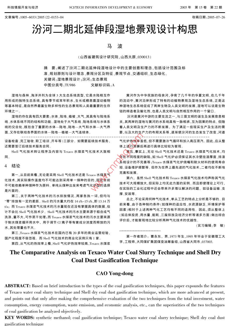 科技情報開發(fā)與經(jīng)濟SCI/TECH INFORMATION DEVELOPMENT ECONOMY2005年第15卷第22期文章編號:1005-6033(2005)22-0152-02收稿日期:2005-10-08Texaco水煤漿技術(shù)與 Shell干煤某粉氣化技術(shù)的比較分析曹永東(大同煤礦集團煤變油籌備組,山西大同,037003)摘要:在簡介煤氣化技術(shù)類型的基礎(chǔ)上,闡述了目前比較先進的 Texaco水煤漿技術(shù)和 Shell干煤粉氣化技術(shù)的特點和特征,提出只有從整體上(如總體投資、用水量、能耗、三廢排放及經(jīng)濟分析等諸多方面)對二者做出綜合評價后,才能客觀地分析出兩種氣化技術(shù)的優(yōu)越性關(guān)鍵詞:合成甲醇;煤氣化技術(shù); Texaco水煤漿技術(shù); Shell千煤粉氣化技術(shù)中圖分類號:TQ54文獻標識碼:A煤氣化技術(shù)是煤合成甲醇生產(chǎn)工藝中的關(guān)鍵技術(shù)之一—。主要影響因床加壓氣化,固定排渣,但由于氣化溫度較低,粗煤氣中CH含量、焦油素為:一是粗合成氣有效組分(H2+CO);二是不同的氣化技術(shù)所帶來的及酚含量較高,氣化效率較低(冷煤氣效率只有70%-76%),且三廢處能耗、環(huán)境影響、投資成本等。理系統(tǒng)復雜,所以只用于生產(chǎn)城市煤氣或IGCC電廠,較少用于生產(chǎn)合成氣1煤氣化技術(shù)的類型Texaco水煤漿技術(shù)原料為水煤漿,采用純氧氣流床加壓氣化,液態(tài)目前國內(nèi)小型甲醇廠均采用常壓固定層間歇煤氣化技術(shù),該技術(shù)成排渣;She干煤粉氣化技術(shù)原料為干粉煤,采用純氧氣流床加壓氣化液熟可靠,投資較省,設(shè)備全部國產(chǎn)化,但需用無煙塊煤或型煤,生產(chǎn)強態(tài)排渣。二者技術(shù)特點的對比見表1。小,“三廢”排放量大,原料利用率低且能耗高。另外,還有其他常壓氣化由表1可以看出,無論是She干煤粉還是 Texaco水煤漿氣化技術(shù)都不可能做到完美無缺。客觀地講,兩種技術(shù)各有優(yōu)缺點:shel氣化技技術(shù)相比均存在較大的差距,已經(jīng)不是煤氣化生產(chǎn)發(fā)展的主流。當代煤術(shù)的優(yōu)點是操作溫度高冷煤氣效率和炭轉(zhuǎn)化率均高于 Texaco媒漿氣氣化技術(shù)發(fā)展方向是純氧加壓連續(xù)氣化,最具代表性的工藝有urgi技化技術(shù),但其氣化爐結(jié)構(gòu)較復雜,且完全需要進囗(包括濾灰器和廢鍋)術(shù)、 Texaco水煤漿技術(shù)和 Shell干煤粉氣化技術(shù)投資成本大;而且國內(nèi)實際運行經(jīng)驗少,技術(shù)風險也較大。 Texaco水煤漿Lurgi技術(shù)是最早工業(yè)化的加壓氣化工藝,使用Lurg技術(shù)的工藝裝氣化技術(shù)的優(yōu)點是設(shè)備結(jié)構(gòu)簡單,工作壓力高,運行經(jīng)驗豐富,投資成本置較多操作經(jīng)驗豐富。該技術(shù)原料為粒度6mm-50mm碎煤,采用固定相對較低但其氣化爐需要有備用爐,且需定期對爐內(nèi)部件進行檢修更表 Shell干煤粉和 Texaco水煤漿氣化技術(shù)對比換,爐內(nèi)操作溫度和冷煤氣效率較低。從設(shè)備的故障率分析來看,無論是She氣化還是 Texaco水煤漿氣化,均在原料項目Shel干煤粉氣化 Texaco水煤漿氣化備注煤、灰渣的輸送環(huán)節(jié)上存在磨蝕現(xiàn)象因此,上述兩種工藝均原料煤粉粒度/m800×106300×10°-400×1排渣系統(tǒng)、排灰系統(tǒng)以及進料系統(tǒng)容易岀現(xiàn)故障和設(shè)備損系統(tǒng)需要壞。在相同條件下,引進 Texaco水煤漿氣化技術(shù)的投資成本干燥系統(tǒng)需要粉無約是引進She氣化技術(shù)的90%左右。進料方式干水煤漿進料位置氣化爐下部氣化爐頂部2兩種氣化技術(shù)在中國的發(fā)展現(xiàn)狀合成氣出口位置氣化爐上部氣化爐下部激冷方式循環(huán)氣激冷冷卻液激冷國內(nèi)目前已有12家企業(yè)簽訂了 Shell氣化技術(shù)轉(zhuǎn)讓合操作壓力/Pa27486-44132942-8531.79同。他們分別是湖南岳陽、湖北應城、廣西柳州、中石化湖北操作溫度咒℃C101480后者最高可達到160分公司中石化安慶分公司云南云天化工股份有限公司、云冷煤氣效率/%80-8374-77南沾化集團(以上為合成氨);大連大化、河南永城、河南中原炭轉(zhuǎn)化率/%大化、河南開洋化工(以上為合成甲醇);神化集團(制氫)。只合成氣有效組分H+CO有武漢雙環(huán)于2004年9月份開始設(shè)備安裝,預計2005年試H/CO合成氣N2含量/%高無運行目前國內(nèi)有21家企業(yè)使用 Texaco水煤漿氣化技術(shù)。有H_O/(H2+C0)低1.3~14后者無需加入蒸汽16家已經(jīng)投產(chǎn)運營,其中陜西榆林神木是新建的用于甲醇可直接進行變的合成,其生產(chǎn)規(guī)模為20萬ta合成氣循環(huán)需要不需要H壓縮3氣化技術(shù)轉(zhuǎn)讓程序無Texaco水煤漿氣化技術(shù)轉(zhuǎn)讓分為商務(wù)談判和技術(shù)轉(zhuǎn)讓主要讠設(shè)備制造周期/月短低短兩部分:商務(wù)談判主要是受讓雙方就該項技術(shù)的內(nèi)容投資較高較轉(zhuǎn)讓條件及費用等進行磋商,最終簽訂技術(shù)轉(zhuǎn)讓合同;技術(shù)開車時間較長較轉(zhuǎn)讓包括技術(shù)轉(zhuǎn)讓費、工程軟件包(關(guān)鍵設(shè)備、技術(shù)指標、控可蒸干處理大部分循環(huán)使用科技情報開發(fā)與經(jīng)濟SCITECH INFORMATION DEVELOPMENT ECONOMY2005年第15卷第22期文章編號:1005-6033(2005)22-0153-04收稿日期:2005-07-26汾河二期北延伸段濕地景觀設(shè)計構(gòu)思馬波(山西省建筑設(shè)計研究院,山西太原,030013)摘要:闡述了汾河二期北延伸段濕地設(shè)計