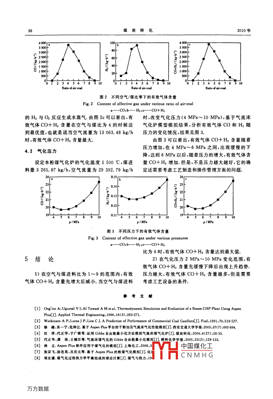 第33卷 第3期煤炭轉(zhuǎn)化VoL.33 No. 32010年7月COAL CONVERSIONJul. 2010粉煤氣流床氣化爐的數(shù)值模擬”鄭煜鑫"吳 學(xué)紅2)張文慧3)呂彥力"摘要應(yīng)用AspenPlus工業(yè)系統(tǒng)流程軟件和Gibbs 自由能最小化方法對(duì)粉煤氣流床氣化爐進(jìn)行模擬.在設(shè)定粉煤氣流床氣化爐條件下,研究空氣(O2占0.21,N2占0. 79)與煤比和氣化壓力對(duì)有效氣體(C0+ H2)含量的影響.結(jié)果表明,在設(shè)定粉煤氣流床氣化爐溫度為1 500 C和碳轉(zhuǎn)化率為99%的條件下,當(dāng)煤進(jìn)料量為3 265.87 kg/h,空氣與煤比為4: 1時(shí),有效氣體含量最大.同時(shí),氣化壓力越大,有效氣體含量越大.關(guān)鍵詞氣流床氣化爐 ,Gibbs自由能,有效氣體,數(shù)值模擬.中圖分類號(hào)TQ545,TQ541擬,同時(shí)考慮操作條件的改變對(duì)煤氣化性能的影響;0引言張宗飛等以以Aspen Plus為模擬工具,選擇反應(yīng)平Aspen Plus是一種通用的化工過程模擬、優(yōu)化衡模型,并應(yīng)用Gibbs自由能最小化方法建立了和設(shè)計(jì)軟件,源于美國(guó)能源部20世紀(jì)70年代后期Shell粉煤氣化模型,并應(yīng)用神華、沾化和天堿煤種在麻省理工學(xué)院MIT組織會(huì)戰(zhàn),要求開發(fā)的第三代對(duì)模型進(jìn)行檢驗(yàn);項(xiàng)友謙[8]用能量最小化原理建立流程模擬軟件.這個(gè)項(xiàng)目稱為“先進(jìn)過程工程系統(tǒng)”加壓氣化模型,并用四種方法對(duì)微分方程求解.以上.(advanced system for process engineering),簡(jiǎn)稱研究發(fā)現(xiàn),采用Aspen Plus軟件對(duì)粉煤氣流床氣化ASPEN.其主要功能包括:1)具有工藝過程的熱動(dòng)爐進(jìn)行模擬仍然有一定的局限性,主要是需要一些力學(xué)和傳輸特性模型;2)擁有一個(gè)完善的物性數(shù)據(jù)參數(shù)的設(shè)定,還需要考慮實(shí)際工藝設(shè)備的操作條件,庫(kù);3)具有物性參數(shù)分析系統(tǒng);4)包括50余種單元有待于建立更加細(xì)致和全面的氣化模型,使模擬結(jié)模型;5)擁有一個(gè)強(qiáng)大的模擬分析工具.果對(duì)實(shí)際工藝設(shè)備的運(yùn)行起到- -定的理論指導(dǎo)作Ong'ro"早在1996年就用Aspen Plus軟件來用.本實(shí)驗(yàn)采用化學(xué)計(jì)量反應(yīng)器與吉布斯自由能最模擬蒸汽熱電聯(lián)產(chǎn)電廠熱力學(xué)模型,并且用105 MW小的平衡反應(yīng)器相結(jié)合的化學(xué)計(jì)量粉煤煤氣化模型電廠的實(shí)際應(yīng)用數(shù)據(jù)驗(yàn)證了模擬的可靠性;Wat-來研究不同的空氣與煤比,不同的氣化壓力對(duì)粉煤kinson[2] 提出平衡模型,通過質(zhì)量和能量平衡及反氣化爐中有效氣體CO+H2含量的影響.應(yīng)平衡方程式的關(guān)聯(lián),可以得到產(chǎn)品組成、產(chǎn)率和最佳適宜溫度;在國(guó)內(nèi),徐越等”基于Aspen Plus的1粉煤氣流床煤氣化爐模型圖形化建模工具,與傳統(tǒng)的煤氣化過程計(jì)算方法相運(yùn)用Gibbs自由能最小化方法建立粉煤氣流床比,可以實(shí)現(xiàn)快速編制模擬煤氣化過程的模擬軟件,煤氣化模型見圖1,其中包括:1)規(guī)定反應(yīng)程度和轉(zhuǎn)并可將氣化過程與整體煤氣化聯(lián)合循環(huán)(IGCC)發(fā)23一電系統(tǒng)的優(yōu)化設(shè)計(jì)過程整合;汪洋等[0基于AspenB1Plus工業(yè)系統(tǒng)流程模擬軟件,運(yùn)用Gibbs自由能最.Dcmp-- Burm-03+小化的方法建立了氣流床煤氣化模型,研究了氣化.⑥→爐的主要操作參數(shù);代正華等5]用Gibbs自由能最00°T-Q-”中小化的方法對(duì)粉煤氣化過程和某一混合煤種進(jìn)行了中↓熱力學(xué)平衡分析,并對(duì)某一混合煤種進(jìn)行了氣化模圖1氣流床煤氣化爐 模型擬;林立[6]用Aspen Plus軟件對(duì)煤氣化過程進(jìn)行模中國(guó)煤化Iedco Baile#國(guó)家科技支撐計(jì)劃項(xiàng)目(2006BAJ01A10)、河南省科技攻關(guān)項(xiàng)目(10210221.MYHC N M H G項(xiàng)01J00).0)1)碩士生;2)副教授;3)講師;4)教授,鄭州輕工業(yè)學(xué)院機(jī)電工程學(xué)院450002鄭州收稿日期:2010-03-12;修回8期:2010-05-05第3期鄭燦蠡等粉煤 氣流床氣化爐的數(shù)值模擬35化率的化學(xué)計(jì)量反應(yīng)器(Rstioc);以物料平衡為基3計(jì)算模型設(shè)定礎(chǔ)的收率反應(yīng)器(RYield),并將其命名為DECOMP模塊;以化學(xué)平衡和相平衡為基礎(chǔ)的吉布斯自由能本模型考慮了固體顆粒與氣化劑之間的反應(yīng)以最小的平衡反應(yīng)器(RGibbs),并將其命名為BURN及氣體之間的反應(yīng).氣化過程中的化學(xué)反應(yīng)在進(jìn)行模塊;兩股出口流的閃蒸罐(Flash2);子物流分流器正反應(yīng)的同時(shí),反應(yīng)產(chǎn)物也相互作用形成逆反應(yīng).當(dāng).(SSplit);2)十個(gè)物料工藝流股;3)熱流工藝流段.正逆反應(yīng)的速度相等時(shí),化學(xué)反應(yīng)達(dá)到平衡. .水煤漿氣化爐模型的工藝流程為:由DECOMP用AspenPlus軟件計(jì)算時(shí),一般所涉及到的組模塊將粉煤裂解成單元素分子和灰分并將裂解熱分分為常規(guī)組分和非常規(guī)組分兩大類.對(duì)于常規(guī)組QTRANSFER(12)導(dǎo)入BURN模塊,粉煤裂解后分,用RK-SOAVE方程計(jì)算物質(zhì)的相關(guān)熱力學(xué)性的產(chǎn)物INBURN進(jìn)入BURN模塊,運(yùn)用吉布斯自質(zhì).非常規(guī)固體組分不參與化學(xué)平衡和相平衡,只是由能最小化方法可以確定出口溫度和組成,子物流計(jì)算密度和焓.一般用HCOALGEN