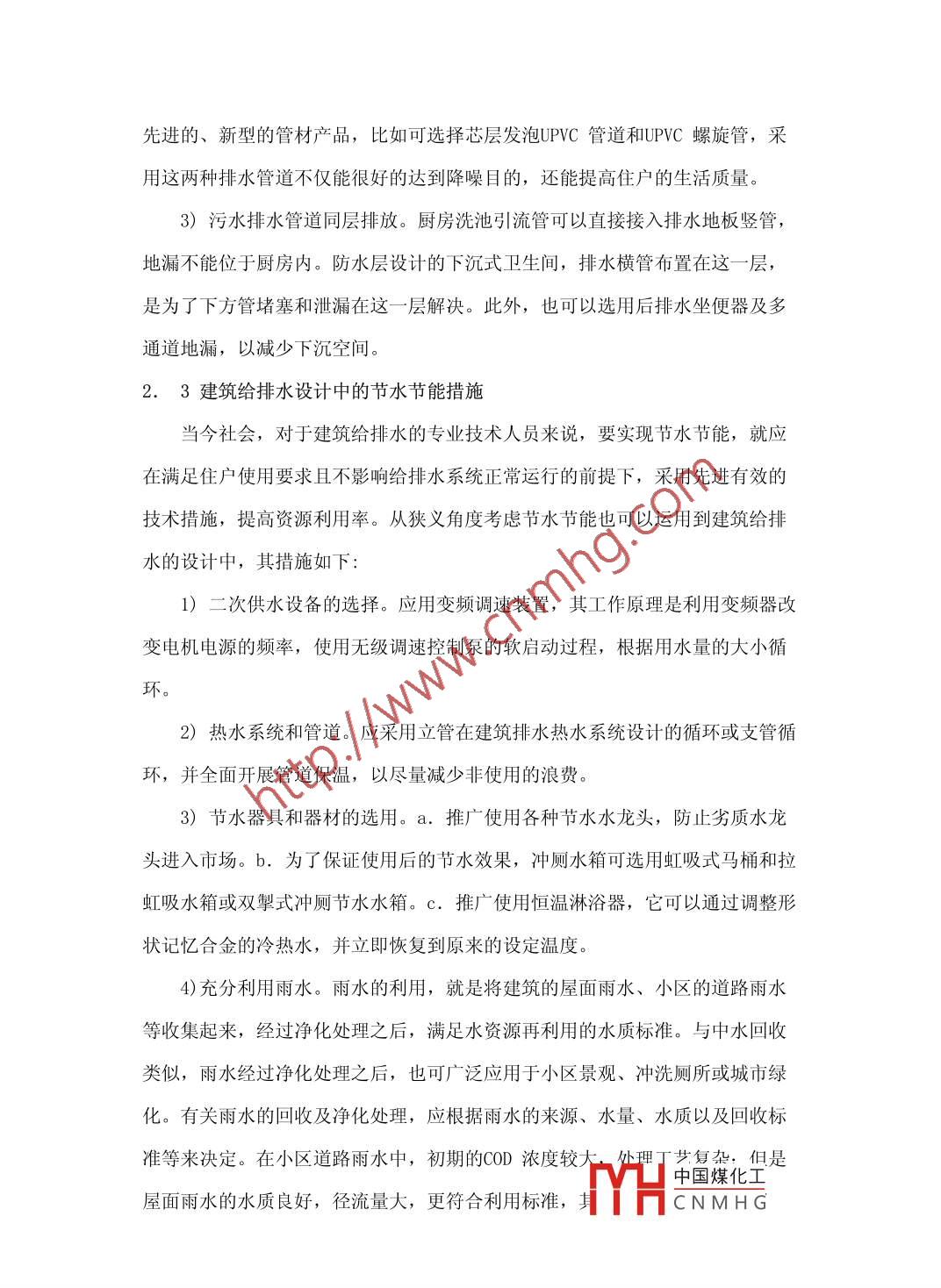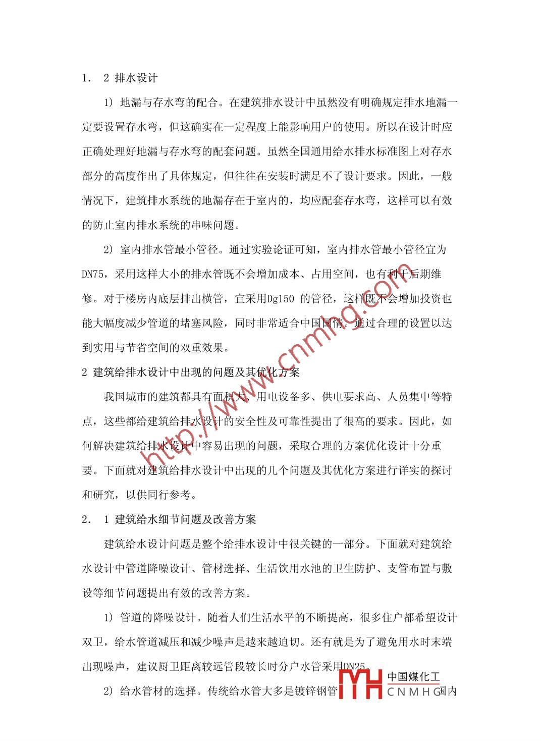 分析建筑給排水設(shè)計(jì)的優(yōu)化設(shè)計(jì)廖修文景紅莉機(jī)械工業(yè) 第六設(shè)計(jì)研究院有限公司摘要:在新世紀(jì),構(gòu)建經(jīng)濟(jì)節(jié)約型和環(huán)境友好型社會的主題不斷的深入到社會各個(gè)行業(yè)及人們的生活,建筑給排水設(shè)計(jì)人員必須緊跟時(shí)代,與時(shí)俱進(jìn),正視新情況和新問題,并勇于挑戰(zhàn)。具體而言,應(yīng)從設(shè)計(jì)過程的各個(gè)細(xì)節(jié)嚴(yán)格把關(guān),不斷從工作實(shí)踐中總結(jié)經(jīng)驗(yàn),不斷研究新情況,解決新問題,不斷完善設(shè)計(jì)技術(shù),以更好地適應(yīng)建筑業(yè)蓬勃發(fā)展的今天對建筑給排水設(shè)計(jì)提出的新要求,實(shí)現(xiàn)全面均衡、務(wù)實(shí)安全、可持續(xù)發(fā)展戰(zhàn)略。關(guān)鍵詞:建筑給排水;優(yōu)化設(shè)計(jì);常見問題中圖分類號: TL353+.2文獻(xiàn)標(biāo)識碼: A文章編號:1建筑給排水設(shè)計(jì)各個(gè)環(huán)節(jié)的作用1. 1給水設(shè)計(jì)1)自動排氣閥。自動排氣閥通常作用于延時(shí)自閉閥蹲式大便器的供水系統(tǒng),如辦公樓、學(xué)校、酒店等,管道系統(tǒng)的頂層自動排氣閥最好裝置在管道的最高點(diǎn)。延時(shí)自閉閥能很好地控制流量,但無法控制氣流。當(dāng)系統(tǒng)停水,給水管內(nèi)通常會積累大量的空氣?;謴?fù)供水管道的空氣將被壓縮至水管道系統(tǒng)的頂部,形成一個(gè)壓縮空氣區(qū)。此時(shí)如果有人再按下延時(shí)自閉閥的按鈕,則會將便器內(nèi)的污物隨氣流帶至地面或?qū)⑽蹪n濺到使用者身上。2)戶外控制閥門。適當(dāng)增設(shè)單體建筑戶外控制閥門在住宅給水設(shè)計(jì)中立管底部的給水閥門是必不可少的,這一 ~措 施增加之后當(dāng)?shù)讓幼舭l(fā)現(xiàn)下水管堵塞引起地面冒水時(shí),可及時(shí)關(guān)閉給水總閥,從而有效減少排污量。3)室外閥門。注意室外閥門的安裝形式,大部分室外安裝的閥門口徑都是Dg7以上的,可以采用截止閥、閘板閥或蝶閥等。一 般均是法蘭安裝,而且有國家標(biāo)準(zhǔn)圖。值得注意的是,設(shè)計(jì)時(shí)在每--個(gè)法蘭連接閥處設(shè)--個(gè)伸縮器則可以解決這一-問題。中國煤化工MYHCNMH G1.2排水設(shè)計(jì)1)地漏與存水彎的配合。在建筑排水設(shè)計(jì)中雖然沒有明確規(guī)定排水地漏定要設(shè)置存水彎,但這確實(shí)在一-定 程度上能影響用戶的使用。所以在設(shè)計(jì)時(shí)應(yīng)正確處理好地漏與存水彎的配套問題。雖然全國通用給水排水標(biāo)準(zhǔn)圖上對存水部分的高度作出了具體規(guī)定,但往往在安裝時(shí)滿足不了設(shè)計(jì)要求。因此,- -般情況下,建筑排水系統(tǒng)的地漏存在于室內(nèi)的,均應(yīng)配套存水彎,這樣可以有效的防止室內(nèi)排水系統(tǒng)的串味問題。2)室內(nèi)排水管最小管徑。通過實(shí)驗(yàn)論證可知,室內(nèi)排水管最小管徑宜為DN75,采用這樣大小的排水管既不會增加成本、占用空間,也有利于后期維修。對于樓房內(nèi)底層排出橫管,宜采用Dg150的管徑,這樣既不會增加投資也能大幅度減少管道的堵塞風(fēng)險(xiǎn),同時(shí)非常適合中國國情。通過合理的設(shè)置以達(dá)到實(shí)用與節(jié)省空間的雙重效果。2建筑給排水設(shè)計(jì)中出現(xiàn)的問題及其優(yōu)化方案我國城市的建筑都具有面積大、用電設(shè)備多、供電要求高、人員集中等特點(diǎn),這些都給建筑給排水設(shè)計(jì)的安全性及可靠性提出了很高的要求。因此,如何解決建筑給排水設(shè)計(jì)中容易出現(xiàn)的問題,采取合理的方案優(yōu)化設(shè)計(jì)十分重要。下面就對建筑給排水設(shè)計(jì)中出現(xiàn)的幾個(gè)問題及其優(yōu)化方案進(jìn)行詳實(shí)的探討和研究,以供同行參考。2.1建筑給水細(xì)節(jié)問題及改善方案建筑給水設(shè)計(jì)問題是整個(gè)給排水設(shè)計(jì)中很關(guān)鍵的一部分。下面就對建筑給水設(shè)計(jì)中管道降噪設(shè)計(jì)、管材選擇、生活飲用水池的衛(wèi)生防護(hù)、支管布置與敷設(shè)等細(xì)節(jié)問題提出有效的改善方案。1)管道的降噪設(shè)計(jì)。隨著人們生活水平的不斷提高,很多住戶都希望設(shè)計(jì)雙衛(wèi),給水管道減壓和減少噪聲是越來越迫切。還有就是為了避免用水時(shí)末端出現(xiàn)噪聲,建議廚衛(wèi)距離較遠(yuǎn)管段較長時(shí)分戶水管采用DN25..中國煤化工2)給水管材的選擇。傳統(tǒng)給水管大多是鍍鋅鋼管MHCNMHG國內(nèi)水路運(yùn)輸不能滿足水質(zhì)衛(wèi)生標(biāo)準(zhǔn)。因而為了滿足標(biāo)準(zhǔn)要求,應(yīng)選擇最佳的、最優(yōu)質(zhì)的給水管材。與金屬管相較之,塑料給水管的優(yōu)勢則更加明顯,一-般而 言塑料給水管不僅重量輕、耐壓強(qiáng)度好,而且安裝方便,省鋼節(jié)能,使用壽命又長。因此,建設(shè)部應(yīng)大力推廣使用塑料給水管。3)生活飲用水池的衛(wèi)生防護(hù)。在供水環(huán)節(jié)中,生活飲用水池是不容忽視的--個(gè)重要環(huán)節(jié),因而做好水質(zhì)的防污染工作刻不容緩。應(yīng)針對水池的入孔、溢.流管等制定出切實(shí)可行的措施,有效地防止昆蟲爬入池內(nèi),并使用無毒的軟質(zhì).泡沫材料嵌入