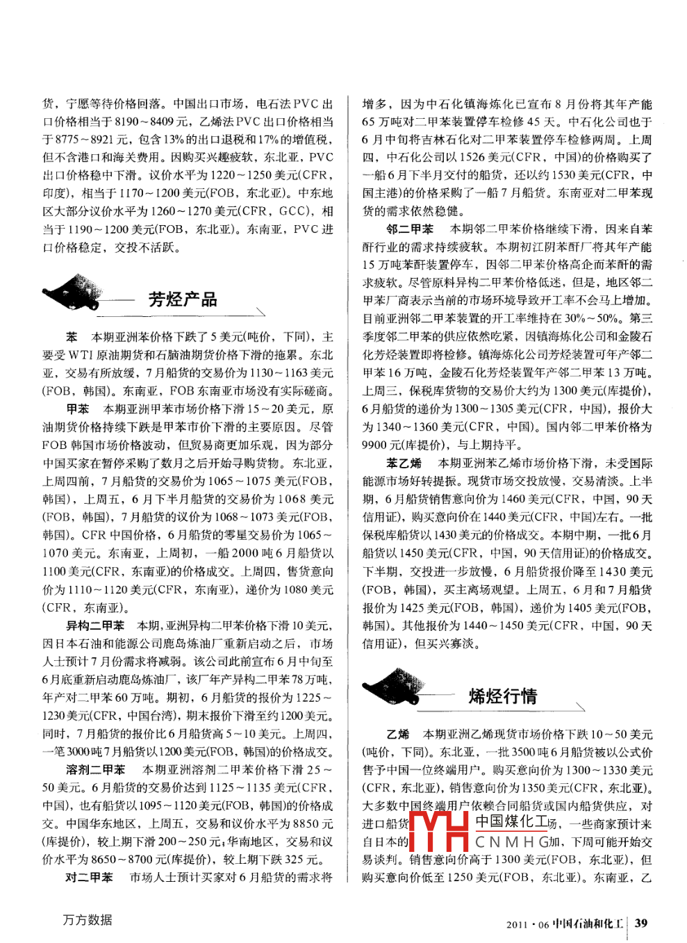 ■HH{行情 月報(bào)為1610美元(CFR,中國(guó)),遞價(jià)為1580美元(CFR,中國(guó));同樣來(lái)自亞洲的6月纖維級(jí)船貨報(bào)價(jià)為1630美元(CFR,中國(guó)),遞價(jià)為1600美元(CFR,中國(guó));韓國(guó)6月船貨的報(bào)價(jià)為1660~ 1670美元(CFR,中國(guó)),遞價(jià)為1600美元(CFR,中國(guó))。共聚PP市場(chǎng),亞洲6月船貨的售貨意向價(jià)高于1700美元(CFR,中國(guó))。一船6月沙特船貨的售價(jià)為1590美元(CFR,中國(guó)),但此消息未獲證實(shí)。中國(guó)國(guó)內(nèi)市場(chǎng),進(jìn)口貨物的交易價(jià)為12600~ 13200元(倉(cāng)庫(kù)價(jià)),與上期持平。東南亞6月船貨的售貨意向價(jià)為1800美元(CFR,東南亞)。PS 因中國(guó)的需求持續(xù)疲軟,本期亞洲聚苯乙烯(PS)行情月報(bào)價(jià)格依然面臨壓力。華東市場(chǎng),國(guó)內(nèi)通用聚苯乙烯(GPPS)交付價(jià)下滑至11350~ 12300元,高抗沖聚苯Z烯(HIPS)交付價(jià)為13300~ 14300元;華南市場(chǎng),GPPS交付價(jià)下跌至11350 ~ 12300元,HIPS 交付價(jià)為13300~ 14300元?,F(xiàn)貨市場(chǎng),GPPS 船貨報(bào)價(jià)為1620~ 1640美元(CFR,中國(guó)),此價(jià)格交易冷清,部分船貨的交易價(jià)為1580~ 1590美元(CFR,中國(guó));HIPS船貨的報(bào)價(jià)為1820 ~ 1860美元(CFR,合成樹(shù)脂中國(guó)),在此價(jià)格水平的購(gòu)買(mǎi)興趣同樣疲軟,部分船貨的交易價(jià)為1780~ 1800美元(CFR,中國(guó))。東南亞,GPPSPE 本期中國(guó)聚乙烯(PE)價(jià)格穩(wěn)中走低。低密度聚船貨報(bào)價(jià)為1590 ~ 1630美元(CFR),部分船貨的交易價(jià)乙烯(LDPE)市場(chǎng),- -位中東廠(chǎng)商對(duì)6月船貨的報(bào)價(jià)為大約為1580美元(CFR,東南亞);HIPS船貨報(bào)價(jià)為1730美元(噸價(jià),下同,CFR,中國(guó),90天信用證),1820~ 1850美元(CFR,東南亞),部分船貨的交易價(jià)大約船即期到貨的伊朗薄膜級(jí)船貨的報(bào)價(jià)為1580美元(CFR,為1800美元(CFR,東南亞)。中國(guó)),5月交付的沙特薄膜級(jí)船貨的報(bào)價(jià)為1600美元ABS本 期亞洲ABS價(jià)格下滑,因中國(guó)市場(chǎng)需求持(CFR,中國(guó)),保稅倉(cāng)庫(kù)即期裝運(yùn)的馬來(lái)西亞薄膜級(jí)船貨續(xù)疲軟。苯乙烯價(jià)格依然在低于1450美元(CFR,中國(guó))的報(bào)價(jià)為1680美元(CFR,中國(guó)),東南亞保稅倉(cāng)庫(kù)即期的水平。丙烯腈價(jià)格下滑至2700美元(CFR,東北亞),丁裝運(yùn)的沙特薄膜級(jí)船貨的報(bào)價(jià)為1670美元(CFR,越南)。二烯價(jià)格堅(jiān)挺在3400美元(CFR,東北亞)以上。因苯乙線(xiàn)型低密度聚乙烯(LLDPE)市場(chǎng),貿(mào)易商對(duì)即期船貨的報(bào)烯價(jià)格疲軟,ABS買(mǎi)家多數(shù)預(yù)期價(jià)格將下滑。大部分買(mǎi)價(jià)下滑至1300美元(CFR,中國(guó)),低于上期1300美元高家認(rèn)為ABS價(jià)格偏高,并且難以將ABS成本轉(zhuǎn)嫁到終端段位的報(bào)價(jià)水平。盡管報(bào)價(jià)下滑,但交易依然有限。一船產(chǎn)品。中國(guó)ABS裝置開(kāi)工率多數(shù)穩(wěn)定在85%~90%。國(guó)內(nèi)5月東南亞船貨的報(bào)價(jià)為1450美元(CFR,中國(guó)),東南亞價(jià)格下滑至17150~ 17800元(交付價(jià)),較上期下滑400元。5月沙特船貨的報(bào)價(jià)為1430美元(CFR,印尼),6月中東現(xiàn)貨市場(chǎng),即期貨物的報(bào)價(jià)為2320~ 2370美元(CFR,中船貨報(bào)價(jià)為1400美元(CFR,印尼)。高密度聚乙烯(HDPE)國(guó)),基本與上期持平。零星船貨的交易價(jià)大約為2300美元市場(chǎng),貿(mào)易商們對(duì)即期提貨的伊朗薄膜級(jí)保稅倉(cāng)庫(kù)船貨(CFR,中國(guó))。部分船貨的交易價(jià)大約為2280美元(CFR,的報(bào)價(jià)為1360~ 1380美元(CFR,中國(guó))。中國(guó))。東南亞報(bào)價(jià)為2320~ 2350美元(CFR),購(gòu)買(mǎi)興趣PP本期中國(guó)聚丙烯(PP)價(jià)格 穩(wěn)中下滑。雙向拉伸聚有限。印度,亞洲船貨的報(bào)價(jià)為2350美元(CFR)。丙烯(BOPP)市場(chǎng),貿(mào)易商對(duì)米自伊朗的保稅倉(cāng)庫(kù)船貨銷(xiāo)售VC 本期中國(guó)和東南業(yè)PVC進(jìn)口價(jià)格穩(wěn)定。在當(dāng)價(jià)格為1650~ 1660美元(CFR,中國(guó)),美國(guó)6月船貨的售價(jià)前居高不下的價(jià)格下,亞洲市場(chǎng)的需求疲軟。中國(guó)市場(chǎng)為1660美元(CFR,印尼)。中國(guó)國(guó)內(nèi)市場(chǎng),當(dāng)?shù)貜S(chǎng)商報(bào)價(jià)為交投有限,進(jìn)口到中國(guó)的價(jià)格穩(wěn)定。市場(chǎng)參與者依然預(yù)12450~ 12950元(倉(cāng)庫(kù)價(jià)/出廠(chǎng)價(jià)), 較上期下跌200元。等期6月船貨的中國(guó)煤化工國(guó)國(guó)內(nèi)市場(chǎng),華規(guī)聚丙烯(IPP)市場(chǎng),中國(guó)和東南亞估價(jià)下滑至1650 ~東地區(qū)電石法CNMHG0元,至7900~1680美元(CFR,中國(guó))或1680~ 1760美元(CFR,東南8000元(倉(cāng)庫(kù)價(jià));乙烯法PVC現(xiàn)貨價(jià)格下跌150元,至亞)。注塑/纖維級(jí)PP市場(chǎng),亞洲注塑級(jí)6月船貨的報(bào)價(jià)8350 ~ 8800元(倉(cāng)庫(kù)價(jià))。下游 買(mǎi)家不愿采購(gòu)高價(jià)位的船38 |中國(guó)石藏桃I 2011 .06貨,寧愿等待價(jià)格回落。中國(guó)出口市場(chǎng),電石法PVC出增多,因?yàn)橹惺?zhèn)海煉化已宣布8月份將其年產(chǎn)能.口價(jià)格相當(dāng)于8190~ 8409元,乙烯法PVC出口價(jià)格相當(dāng)65萬(wàn)噸對(duì)二甲苯裝置停車(chē)檢