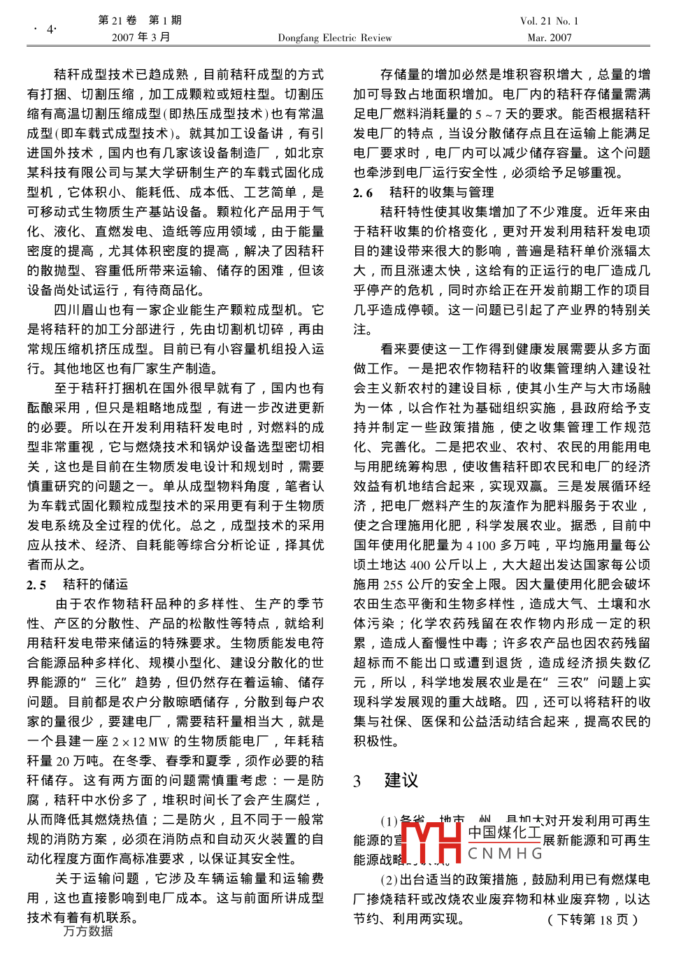 第21卷第1期007年3月Dongfang Electric ReviMar.2007生物質(zhì)能(秸稈)發(fā)電的思考閆廷滿(四川省電力設(shè)計院,四川成都,610072)摘要:簡要說明了由于石化能源在地球上資源量旳有限性,必須開發(fā)利用新能源和可再生能源的必要性。重點分析了生物質(zhì)能的開發(fā)利用,主要是農(nóng)作物秸稈的利用。從秸稈的特點出發(fā),即秸稈品種的多樣性、產(chǎn)地的分散性、產(chǎn)生的季節(jié)性和質(zhì)地散拋性,提岀在開發(fā)利用過程中關(guān)于6個方面問題的思考。扼要闡述了解決這些問題的途徑,以供討論。關(guān)鍵詞:生物質(zhì)能;秸稈發(fā)電;問題探討中圖分類號:TM619文獻標識碼:A文章編號:1001-9006(2007)-0001-04Consideration for Generating Eletricityby Using Bio-protoplasmYAN Ting-man( Sichuan Power Design Institute, Chengdu 610072Abstract: This paper elaborates that as the finiteness of petrifactive energy on the earth, we must develop to use thenew energy and the renewable energy. It also analyzes the emphasis on the development and use of biological energy which mainly refered to the cropper straw stalk, also named agricultural rejectuse. Embarking from the straw stalk characteristics, such as the stram stalk variety multiplicity, the habitat dispersivity, the production seasonal property and the quality of material disperses, to take the six as-pects to ponder which appear in the development and use process. It presents briefly the approach toKey words: fresh matter i electricity generation by using straw stalk i quesion discussion能源對人類生存和社會經(jīng)濟發(fā)展極為重要,由北和東北)各省相當豐富。生物質(zhì)能也是我國的優(yōu)勢于常規(guī)能源的有限性,近年來世界各國對可持續(xù)能資源,因我國是農(nóng)業(yè)大國,生物質(zhì)種類多,如:農(nóng)源的未來給予了高度重視,尋找新型能源、提高能作物類、農(nóng)業(yè)廢棄物、林作物類和水生藻類等,據(jù)源利用率和節(jié)約能源已成為重要的戰(zhàn)略任務。我國初步統(tǒng)計生物質(zhì)資源總量每年可超過7億噸標準煤在其中長期發(fā)展規(guī)劃中已眀確提出可再生能源的發(fā)量。有專家分析計算,地球上的生物質(zhì)能源資源量展目標:到2020年可再生能源新增裝機容量要達到可相當于全世界能源消耗總量的10~20倍,而目前1億千瓦,除太陽能、水電和其他能源外,風力發(fā)只有1%TV凵中國煤化工電裝機3000萬千瓦,生物質(zhì)能發(fā)電裝機2000萬千但CNMHG發(fā)利用剛起步。西瓦。我國風力資源在沿海各省和”三北”(西北、華歐一些國家起步早一點,有了一些較成熟的經(jīng)驗收稿日期:2006-10-31作者簡介1939—),男,教授級高工,四川省電力設(shè)計院原院長、總工程師。第21卷第1期007年3月Dongfang Electric ReviMar.2007但也有待進一步研究的問題。中國一歐盟合作項目(3)城市垃圾:工業(yè)、生活和商業(yè)垃圾的示范將為我國生物質(zhì)能的開發(fā)利用積累經(jīng)驗。生(4)有機廢水:工業(yè)和生活污水物質(zhì)能開發(fā)利用在許多國家受到高度重視,聯(lián)合國(5)糞便:牲畜、家禽和人的糞便等開發(fā)計劃署(UNDP)、世界能源委員會、美國能源部(6)能源植物:生長超速、輪伐期短的高能喬都把它作為發(fā)展可再生能源的首要選擇。世界糧農(nóng)木、灌木和草本植物,如麻風樹、芒草、棉籽、芝組織認為,生物質(zhì)能有可能成為未來可持續(xù)能源系麻、花生、大豆等統(tǒng)的主要能源。預計到本世紀中葉,采用新技術(shù)生(7)水生植物:藻類、海草、浮萍、水葫蘆、蘆產(chǎn)的各種生物質(zhì)能替代燃料將占全球總能耗的40%葦、水風信子等。以上目前產(chǎn)量最大、用得最多的生物質(zhì)就是農(nóng)作物然而近年我國在開發(fā)生物質(zhì)能發(fā)電的過程中出秸稈、林木和糞便。許多農(nóng)村仍有相當多的農(nóng)戶利現(xiàn)了許多新的情況,如何健康地、可持續(xù)地發(fā)展我用各種農(nóng)作物秸稈作為生活用燃料,也有一定數(shù)量國生物質(zhì)能產(chǎn)業(yè)和技術(shù),成了大家十分關(guān)注的問農(nóng)戶在國家和政府支助下利用人畜糞便產(chǎn)生沼氣作為生活用燃料。1.4產(chǎn)地分散性1生物質(zhì)能的特點這里指農(nóng)業(yè)廢棄物秸稈、牲畜糞便和林業(yè)廢棄物,全國每年有超過7億噸標準煤量,它的產(chǎn)生遍1.1可再生特性及全部農(nóng)業(yè)生產(chǎn)地區(qū)和林業(yè)區(qū)(含加工地),由于產(chǎn)這里著重介紹農(nóng)作物秸稈。它屬可再生能源生面積大,農(nóng)戶管理特別分散。四川省是我國第三年復一年可保證能源的永續(xù)利用。有資料介紹,植大農(nóng)業(yè)省,有占地面積48.5萬平方公里,2005年物在燃燒過程中放出CO2,但它在生長過程中要吸末總?cè)丝跒?750萬人,絕大部分是農(nóng)業(yè)人口,全收CO2,這放出和吸收是基本平衡的,所以對環(huán)境年農(nóng)業(yè)秸稈總量加上牲畜糞便達1億噸保護有利。同時從秸稈的化學成分和熱值看亦有它1.5質(zhì)地散拋性的優(yōu)勢,將它燃燒產(chǎn)生的灰分不小于10%,而且灰生物質(zhì)能的體積密度相當?shù)?如稻草和稻谷殼分還是一種好的農(nóng)作物所需的肥料,是發(fā)展循環(huán)經(jīng)的體積密度分別約50kg/m3和122kg/m3,就是目濟的好項目。前打包成型的稻草體積密度也僅70~90kg/m31.2產(chǎn)生的季節(jié)性般,在自然堆積或單靠人工綁扎的條件下的體積密