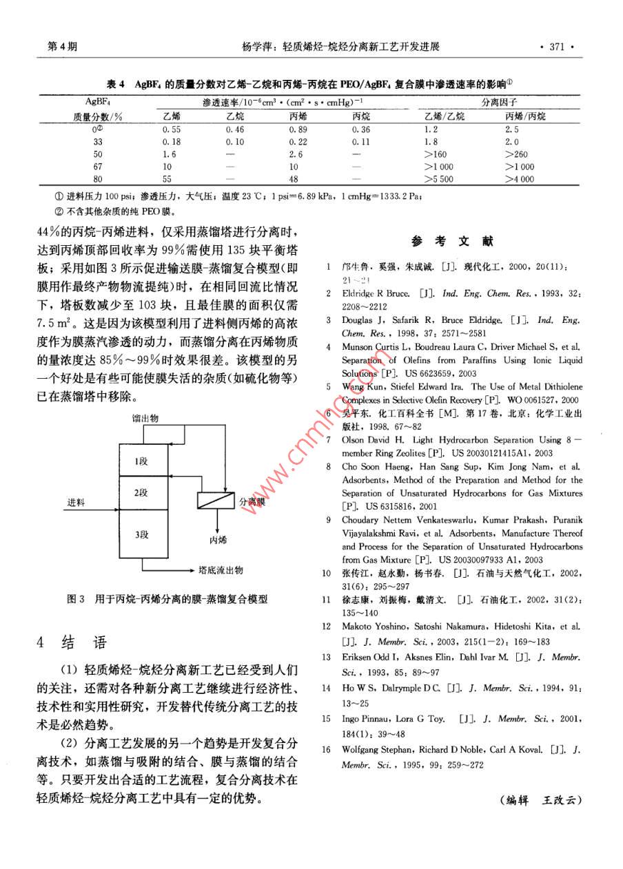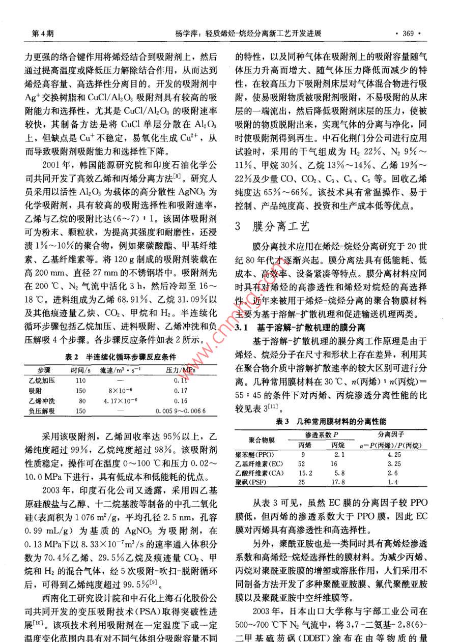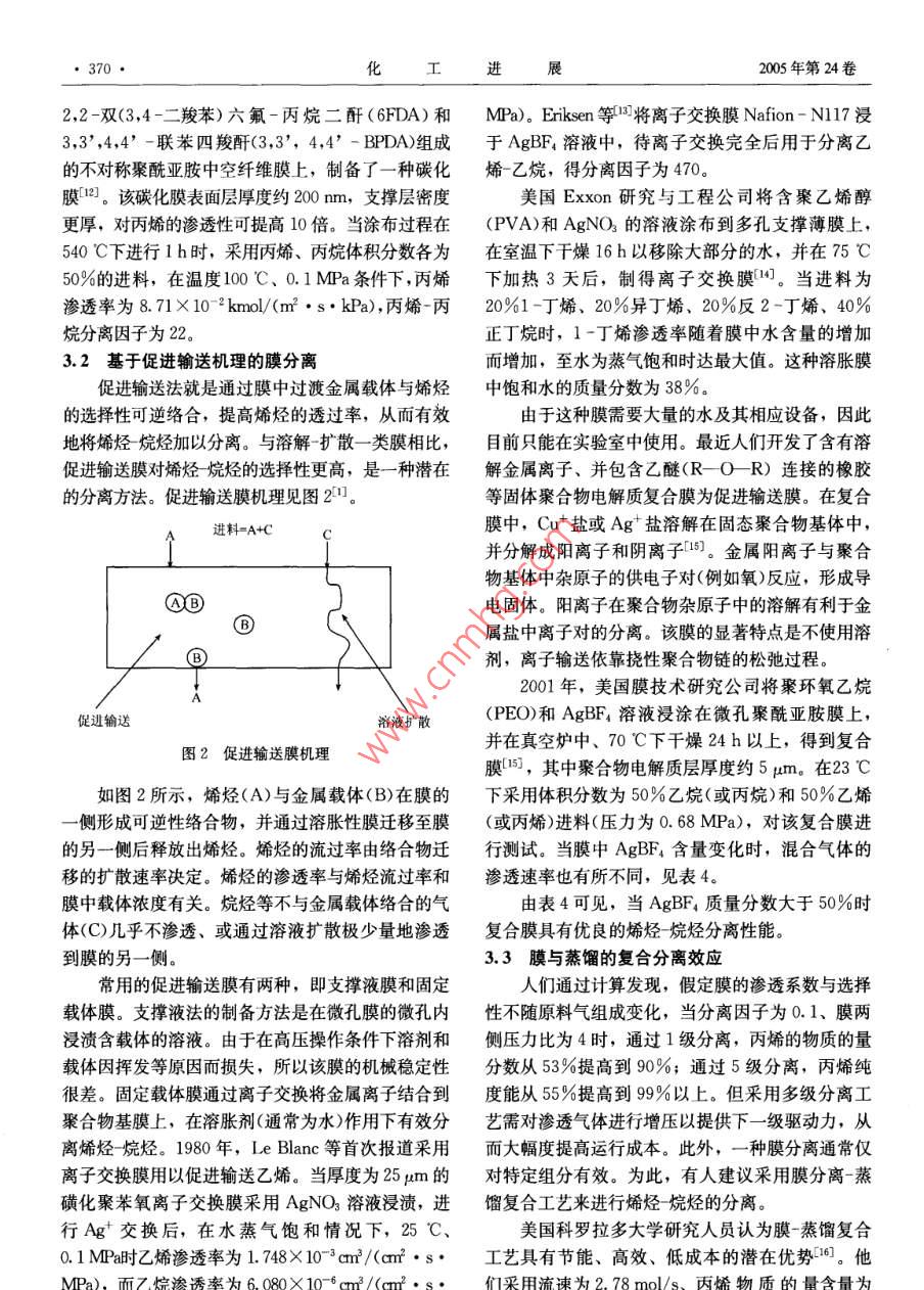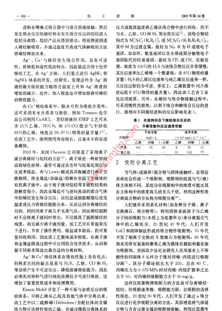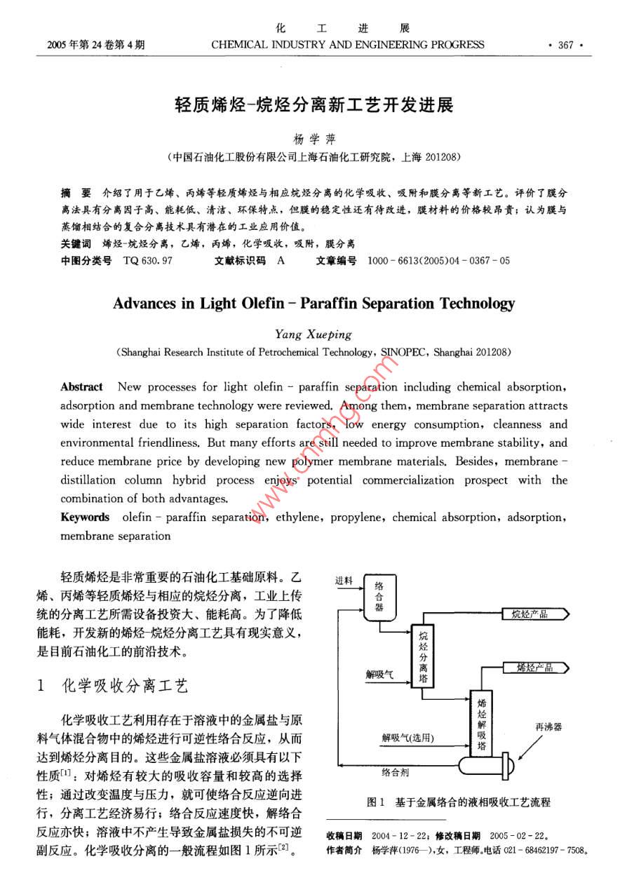 化工進(jìn)2005年第24卷第4期CHEMICAL INDUSTRY AND ENGINEERING PROGRESS●367●輕質(zhì)烯烴烷烴分離新工藝開發(fā)進(jìn)展楊學(xué)萍(中國石油化工股份有限公司上海石油化工研究院,上海201208)摘要介紹了用于乙烯、丙烯等輕質(zhì)烯烴與相應(yīng)烷烴分離的化學(xué)吸收、吸附和膜分離等新工藝。評(píng)價(jià)了膜分離法具有分離因子高、能耗低、清潔、環(huán)保特點(diǎn),但膜的穩(wěn)定性還有待改進(jìn),膜材料的價(jià)格較昂貴;認(rèn)為膜與蒸餾相結(jié)合的復(fù)合分離技術(shù)具有潛在的工業(yè)應(yīng)用價(jià)值。關(guān)鍵詞烯烴-烷烴分離, 乙烯,丙烯,化學(xué)吸收,吸附,膜分離中圖分類號(hào)TQ 630. 97文獻(xiàn)標(biāo)識(shí)碼A文章編號(hào)1000- 6613(2005)04 - 0367 - 05Advances in Light Olefin - Paraffin Separation TechnologyYang Xueping(Shanghai Research Institute of Petrochemical Technology, SINOPEC, Shanghai 201208)Abstract New processes for light olefin - paraffin separation including chemical absorption,adsorption and membrane technology were reviewed. Among them, membrane separation attractswide interest due to its high separation factors, low energy consumption, cleanness andenvironmental friendliness. But many efforts are still needed to improve membrane stability, andreduce membrane price by developing new polymer membrane materials. Besides, membrane ”distillation column hybrid process enjoys potential commercialization prospect with thecombination of both advantages.Keywords olefin - paraffin separation, ethylene, propylene, chemical absorption, adsorption,membrane separation輕質(zhì)烯烴是非常重要的石油化工基礎(chǔ)原料。乙進(jìn)料、絡(luò)烯、丙烯等輕質(zhì)烯烴與相應(yīng)的烷烴分離,工業(yè)上傳統(tǒng)的分離工藝所需設(shè)備投資大、能耗高。為了降低C烷烴產(chǎn)品能耗,開發(fā)新的烯烴烷烴分離工藝具有現(xiàn)實(shí)意義,烴是目前石油化工的前沿技術(shù)。分|烯烴嚴(yán)品D解吸氣1化學(xué)吸收分離工藝化學(xué)吸收I藝?yán)么嬖谟谌芤褐械慕饘冫}與原|炒|烴解再沸器料氣體混合物中的烯烴進(jìn)行可逆性絡(luò)合反應(yīng),從而解吸氣(選用)吸.|塔達(dá)到烯烴分離目的。這些金屬鹽溶液必須具有以下性質(zhì):對(duì)烯烴有較大的吸收容量和較高的選擇絡(luò)合劑性;通過改變溫度與壓力,就可使絡(luò)合反應(yīng)逆向進(jìn)圖1基于金屬絡(luò) 合的液相吸收工藝流程行,分離工藝經(jīng)濟(jì)易行;絡(luò)合反應(yīng)速度快,解絡(luò)合反應(yīng)亦快;溶液中不產(chǎn)生導(dǎo)致金屬鹽損失的不可逆收稿日期2004-12-22; 修改稿日期2005-02 -22.副反應(yīng)?;瘜W(xué)吸收分離的一般流程如圖1所示0。作者簡介楊學(xué)萍(1976- ),女, 工程師。.電話021 - 68462197- 7508?!?68●化I進(jìn)展2005年第24卷進(jìn)料在噴淋式絡(luò)合器中與絡(luò)合溶液接觸,然后壓力或提高溫度將乙烯從絡(luò)合物中進(jìn)行回收,但不發(fā)生絡(luò)合反應(yīng)的烯烴和未發(fā)生絡(luò)合反應(yīng)的烷烴進(jìn)入與水、 乙炔、CO和H2等雜質(zhì)反應(yīng)5。該絡(luò)合物結(jié)烷烴分離塔,烷烴產(chǎn)品從塔頂排出,塔底物流則進(jìn)構(gòu)式為M[SC2(RR,)]2或M[S2C2 (R RRR)]2,人烯烴解吸塔,并通過溫度升高或氣體解吸的方法其中M為過渡金屬,最好為Ni;R為H或吸電子將烯烴釋放出來?;鶊F(tuán),如雜環(huán)、氰基基團(tuán)以及全部或部分被吸電子Ag+、Cu+ 與烯烴發(fā)生絡(luò)合作用,具有可逆基團(tuán)取代的烴基基團(tuán),最好為CFs或CN。實(shí)驗(yàn)發(fā)性、價(jià)格低和毒性低的特點(diǎn),因此最適合用于化學(xué)現(xiàn),濃度為100%的H2S與該絡(luò)合物反應(yīng)非常緩慢,吸收工藝。在Agt方面,人們重點(diǎn)進(jìn)行AgBF,和其反應(yīng)速率比乙烯慢一個(gè)數(shù)量級(jí); 含8%(物質(zhì)的量AgNO體系的開發(fā)。經(jīng)研究,發(fā)現(xiàn)這些含Agt溶含量) H2S的乙烯反應(yīng)速率與純乙烯反應(yīng)速率- -樣,液的最大吸收能力隨絡(luò)合溫度上升和Ag+濃度的且反應(yīng)過程仍為可逆。事實(shí)上,乙烯裝置中H2S濃增加而減少。此外,加入銨鹽也可增加溶液對(duì)烯烴度遠(yuǎn)低于8%(物質(zhì)的量含量),因此該工藝有工業(yè)的吸收能力?;瘧?yīng)用前景。另外,在烯烴與絡(luò)合物接觸過程中,在Cu+吸收體系中,除水可作為吸收介質(zhì)外,可采用惰性共溶劑,以利于絡(luò)合和解絡(luò)合反應(yīng)的進(jìn)還可采用非水介質(zhì)參與吸收。例如Tenneco化學(xué)行。溶劑對(duì)不同烯烴進(jìn)料的反應(yīng)影響見表1。品公司利用CuAICl, -芳烴溶液的ESEP工藝可從表1共溶劑存在 下烯烴絡(luò)合反應(yīng)的含21%乙烯、76%N2和3%CO混合氣中回收平衡常數(shù)和反應(yīng)速率常數(shù)99%的乙烯,純度達(dá)99. 97%(物質(zhì)的量含量)問。平衡常數(shù)速率常數(shù)在該工藝中,溶劑使用壽命很長,且基本不存在設(shè)共溶劑/mol.L ./X104 mol.L-1.S-1乙烯丙烯 1-己烯 乙烯 丙烯 1-己烯備腐蝕。甲若1407030925112003年,美國Chevron公司報(bào)道了采用離子二氣乙烷515377_液分離烯烴與烷烴的方法[1。離子液是- -種新型的2吸附分離工藝高效綠色溶劑,通??赏ㄟ^雜芳環(huán)與烷基化劑反應(yīng)生成季銨鹽、再與Lewis酸或其共軛堿進(jìn)行離子交當(dāng)氣體(或液體)混合物與固體接觸時(shí),在鄰近換制得。將金屬鹽(如銀鹽)溶解在室溫下為液