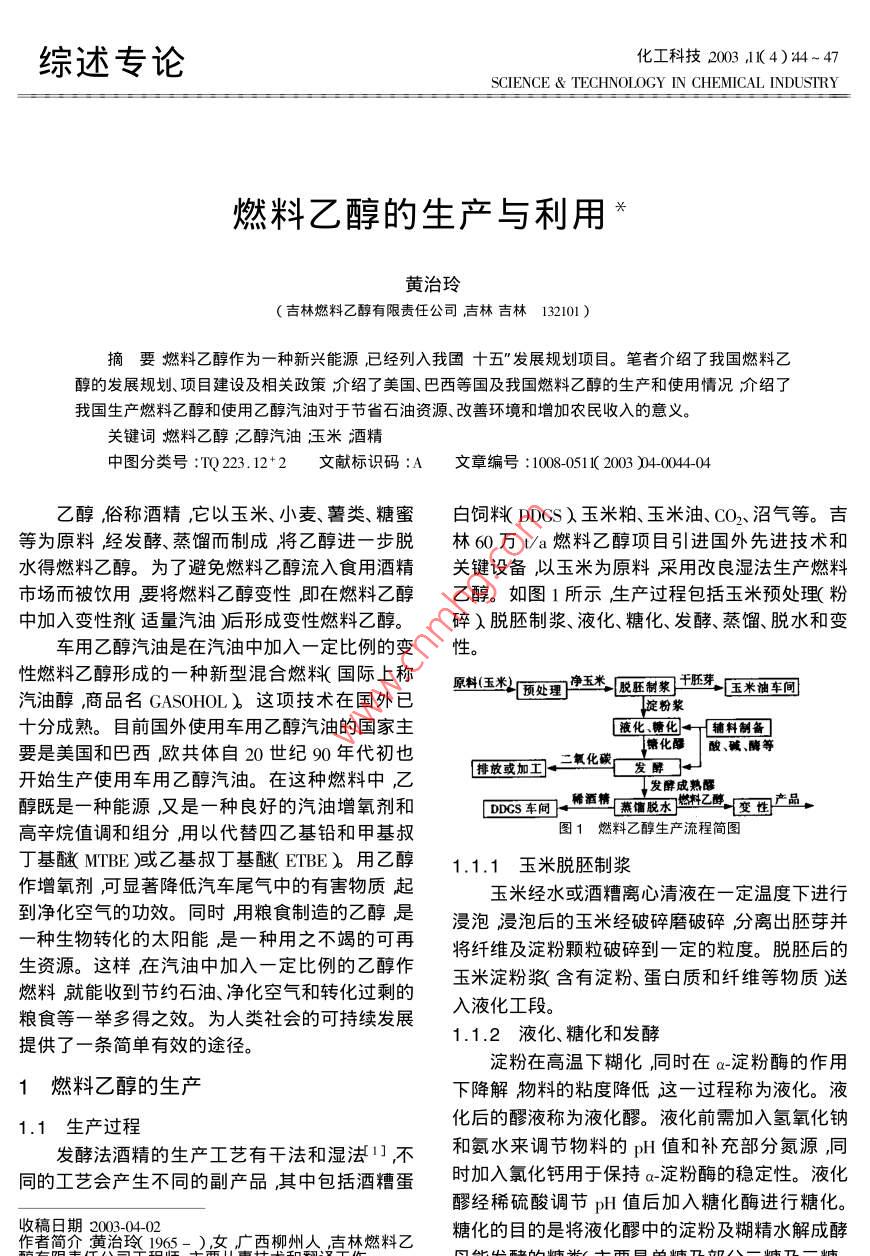 綜述專論化工科技200311(4)44~47 SCIENCE TECHNOLOGY IN CHEMICAL INDUSTRY燃料乙醇的生產(chǎn)與利用*黃治玲(吉林燃料乙醇有限責(zé)任公司吉林吉林132101)摘要燃料乙醇作為一種新興能源已經(jīng)列入我國(guó)十五發(fā)展規(guī)劃項(xiàng)目。筆者介紹了我國(guó)燃料乙醇的發(fā)展規(guī)劃項(xiàng)目建設(shè)及相關(guān)政策介紹了美國(guó)、巴西等國(guó)及我國(guó)燃料乙醇的生產(chǎn)和使用情況介紹了我國(guó)生產(chǎn)燃料乙醇和使用乙醇汽油對(duì)于節(jié)省石油資源、改善環(huán)境和增加農(nóng)民收入的意義。關(guān)鍵詞燃料乙醇乙醇汽油玉米酒精中圖分類號(hào):TQ223.12+2文獻(xiàn)標(biāo)識(shí)碼:文章編號(hào):1008-0511(2003040044-04乙醇俗稱酒精,它以玉米小麥、薯類、糖蜜白飼料DDGS)玉米粕、玉米油、CO2、沼氣等。吉等為原料經(jīng)發(fā)酵蒸餾而制成將乙醇進(jìn)一步脫林60萬(wàn)ta燃料乙醇項(xiàng)目引進(jìn)國(guó)外先進(jìn)技術(shù)和水得燃料乙醇。為了避免燃料乙醇流入食用酒精關(guān)鍵設(shè)備以玉米為原料采用改良濕法生產(chǎn)燃料市場(chǎng)而被飲用要將燃料乙醇變性即在燃料乙醇乙醇。如圖1所示生產(chǎn)過(guò)程包括玉米預(yù)處理粉中加入變性劑適量汽油后形成變性燃料乙醇。碎)脫胚制漿、液化、糖化、發(fā)酵、蒸餾、脫水和變車用乙醇汽油是在汽油中加入一定比例的變性。性燃料乙醇形成的一種新型混合燃料國(guó)際上稱原料玉米預(yù)處理脫胚制漿干胚玉米油車間汽油醇,商品名GASOHOL)這項(xiàng)技術(shù)在國(guó)外已淀粉漿十分成熟。目前國(guó)外使用車用乙醇汽油的國(guó)家主液化糖化輔料制備要是美國(guó)和巴西,歐共體自20世紀(jì)90年代初也放或加工二氧化碳化酸、堿、酵等開始生產(chǎn)使用車用乙醇汽油。在這種燃料中乙發(fā)酵成熟醇既是一種能源,又是一種良好的汽油增氧劑和DDS車間稀酒精燃料乙醇變性產(chǎn)品高辛烷值調(diào)和組分用以代替四乙基鉛和甲基叔圖1燃料乙醇生產(chǎn)流程簡(jiǎn)圖丁基醚MTBE)或乙基叔丁基醚(ETBE)用乙醇1.1.1玉米脫胚制漿作增氧劑可顯著降低汽車尾氣中的有害物質(zhì)起玉米經(jīng)水或酒糟離心清液在一定溫度下進(jìn)行到凈化空氣的功效。同時(shí)用糧食制造的乙醇是浸泡浸泡后的玉米經(jīng)破碎磨破碎分離出胚芽并一種生物轉(zhuǎn)化的太陽(yáng)能是一種用之不竭的可再將纖維及淀粉顆粒破碎到一定的粒度。脫胚后的生資源。這樣在汽油中加入一定比例的乙醇作玉米淀粉漿(含有淀粉、蛋白質(zhì)和纖維等物質(zhì))送燃料就能收到節(jié)約石油、凈化空氣和轉(zhuǎn)化過(guò)剩的糧食等一舉多得之效。為人類社會(huì)的可持續(xù)發(fā)展入液化工段。提供了一條簡(jiǎn)單有效的途徑。1.1.2液化、糖化和發(fā)酵淀粉在高溫下糊化,同時(shí)在a-淀粉酶的作用1燃料乙醇的生產(chǎn)下降解物料的粘度降低這一過(guò)程稱為液化。液1.1生產(chǎn)過(guò)程化后的醪液稱為液化醪。液化前需加入氫氧化鈉發(fā)酵法酒精的生產(chǎn)工藝有干法和濕法1,不和氨水來(lái)調(diào)節(jié)物料的pH值和補(bǔ)充部分氮源同同的工藝會(huì)產(chǎn)生不同的副產(chǎn)品,其中包括酒糟蛋時(shí)加入氯化鈣用于保持a淀粉酶的穩(wěn)定性。液化醪經(jīng)稀硫酸調(diào)節(jié)pH值后加入糖化酶進(jìn)行糖化。收稿日期2003-02作者簡(jiǎn)介黃治玲(1965-)廣西柳州人吉林燃料乙糖化的目的是將液化醪中的淀粉及糊精水解成酵第4期黃治玲燃料乙醇的生產(chǎn)與利用45化醪。通過(guò)酵母對(duì)糖化醪進(jìn)行連續(xù)發(fā)酵。在發(fā)酵1.2我國(guó)燃料乙醇生產(chǎn)裝置過(guò)程中酵母將糖轉(zhuǎn)化成乙醇和CO2同時(shí)釋放出在國(guó)家原計(jì)委的統(tǒng)一安排下在中國(guó)石油、中熱量所產(chǎn)生的二氧化碳經(jīng)水洗回收隨之帶出的國(guó)石化兩大集團(tuán)的參與下我國(guó)于2000年正式啟乙醇排入大氣。動(dòng)了燃料乙醇的生產(chǎn)與試用工作按照新建廠與1.1.3蒸餾、脫水、變性老廠改造相結(jié)合的精神國(guó)家制定了燃料乙醇生含有乙醇的發(fā)酵成熟醪通過(guò)蒸餾裝置進(jìn)行蒸產(chǎn)試點(diǎn)規(guī)劃2。根據(jù)這一規(guī)劃我國(guó)目前建成、正餾提純所產(chǎn)生的高純度乙醇蒸汽經(jīng)過(guò)兩級(jí)分子在建設(shè)和擬建設(shè)的燃料乙醇裝置如表1所示。吉篩的交替吸附作用吸除水分從分子篩出來(lái)的含林60萬(wàn)t/a和河南30萬(wàn)t/a年燃料乙醇項(xiàng)目分有少量水分的乙醇?xì)怏w經(jīng)冷卻后即為燃料乙醇。別于2001年9月和2002年11月開工建設(shè)安徽分子篩即3A沸石該材料上的微孔孔徑比水分豐原30萬(wàn)t/a燃料乙醇的可行性報(bào)告正待國(guó)務(wù)子大而小于乙醇分子因此水分子可以被吸附,院審批。另外河南天冠20萬(wàn)ta與黑龍江華潤(rùn)而乙醇分子可從其表面通過(guò)產(chǎn)生高純度乙醇?xì)饨鹩?0萬(wàn)ta燃料乙醇的改擴(kuò)建項(xiàng)目已分別于體。2000年和2001年完成并在當(dāng)?shù)亻_始了乙醇汽油所生產(chǎn)的燃料乙醇加入體積分?jǐn)?shù)為2%~的試用工作。5%的變性劑汽油成為變性燃料乙醇產(chǎn)品。表1我國(guó)燃料乙醇生產(chǎn)裝置企業(yè)名稱規(guī)模投資產(chǎn