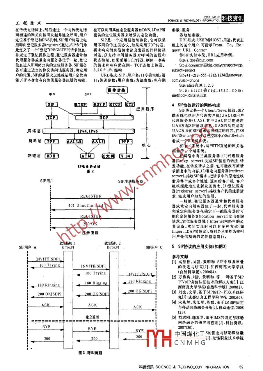 科技資訊SCIENCE & TECHNO ey INFOPMATION工程技術(shù)SIP原理分析王云嵐(中央電視臺(tái)北京100859)摘要:本文首先用逮了SIP的提出和發(fā)起和SIP協(xié)議所使用的環(huán)境,其次,對(duì)SIP協(xié)議的功能概述和SIP協(xié)議的功能概述進(jìn)行了探討,同時(shí)對(duì)SIP協(xié)議運(yùn)行的網(wǎng)絡(luò)構(gòu)成進(jìn)行分析。最后,還對(duì)SIP協(xié)議的應(yīng)用實(shí)例進(jìn)行研究。關(guān)鍵詞:SIP原理分析中圖分類號(hào):TP14文獻(xiàn)標(biāo)識(shí)碼:A文章編號(hào):1672-3791(2010)02(b)-0058-02隨著IP電話應(yīng)用的普及,建立終端設(shè)型,RFC3265確定 了具體的事件通知。從Call Server的角度來(lái)看,SIP Adapter備和網(wǎng)關(guān)的可擴(kuò)展網(wǎng)絡(luò)已成為業(yè)界面臨的早在2001年,供應(yīng)商就已開始推出基于的功能主要有兩部分。一大技術(shù)挑戰(zhàn)。目前IP電話技術(shù)已完美實(shí)SIP的服務(wù)。 今天,人們對(duì)該協(xié)議的熱情不(1)將其 他SoftSwitch交換機(jī)發(fā)來(lái)的SIP現(xiàn)了對(duì)語(yǔ)音和傳真信息的編碼和傳輸,但斷 高張.Sun Microsystems的Java Commu-消 息轉(zhuǎn)換成統(tǒng)-的內(nèi)部呼叫協(xié)議。仍需進(jìn)-步發(fā)展為大型公司和服務(wù)提供平nity Process等組織正在使用通用的Java編(2)將Call Server產(chǎn)生 的呼叫消息轉(zhuǎn)臺(tái)的呼叫控制和地址管理技術(shù)。因此,支持程語(yǔ) 言定義應(yīng)用編程接H(API),以便開發(fā)換 成標(biāo)準(zhǔn)的SIP協(xié)議消息,發(fā)送給其他IP電話系統(tǒng)互通的多個(gè)協(xié)議已經(jīng)出臺(tái)。常商 能夠?yàn)榉?wù)提供商和企業(yè)構(gòu)建SIP組件SoftSwitch.用的IP電話協(xié)議(如H.323. MGCP和SIP)的和應(yīng)用程序。最重要的是,越來(lái)越 多的競(jìng)爭(zhēng)2.2 基于SIP的IP網(wǎng)絡(luò)電話系統(tǒng)所用的協(xié)議棧優(yōu)缺點(diǎn)各異.其中,秉承越簡(jiǎn)單越流行這一者正在借助前途光明的新服務(wù)進(jìn)人SIP市如: 圖2所示,媒體傳輸層采用PCM編設(shè)計(jì)思想的SIP協(xié)議的應(yīng)用前最無(wú)限。場(chǎng)。SIP正在成為自HTTP和SMTP以來(lái)最為碼 或各種壓編編碼的話音信號(hào)經(jīng)RTP協(xié)議重要的協(xié)議之一分裝后在IP網(wǎng)上傳送,RTCP檢測(cè)傳送的SIP協(xié)議的發(fā)展及優(yōu)點(diǎn)SIP的優(yōu)點(diǎn):類似Web的可擴(kuò)展開放通Q0S , RSVP用于資源預(yù)留,保證傳送的.SIP出現(xiàn)于二十 世紀(jì)九十年代中期,源信。使用SIP ,服務(wù)提供商叮以隨意選擇標(biāo)準(zhǔn)QOS,SIP協(xié)議基于文本 ,結(jié)構(gòu)靈活,易于擴(kuò)于哥倫比亞大學(xué)計(jì)算機(jī)系副教授Henning 組件 ,快速駕馭新技術(shù)。不論媒體內(nèi)容和參展 ,低層傳輸協(xié)議可用TCP或UDP,推薦首Schulzinne及其研究小組的研究。Schulzrinne與方 數(shù)量,用戶都可以查找和聯(lián)系對(duì)方.SIP選UDP. 另外,在SIP協(xié)議中,呼叫和媒體控教授除與人共同提出通過(guò)Internet傳輸實(shí)時(shí) 對(duì) 會(huì)話進(jìn)行協(xié)商,以便所有參與方都能夠就制信 息同時(shí)傳送。數(shù)據(jù)的實(shí)時(shí)傳輸協(xié)議(RTP)外, 還與人合作會(huì)話功能達(dá)成一 一 致以及進(jìn)行修改。它甚至可編寫了實(shí)時(shí)流傳輸協(xié)議(RTSP)標(biāo)準(zhǔn)提案,用以添加、 刪除或轉(zhuǎn)移用戶。不過(guò),SIP不是萬(wàn)3" SIP協(xié)議的功能概述于控制音頻視頻內(nèi)容在Web上的流傳輸。能的。它既不是會(huì)話描述協(xié)議,也不提供會(huì)3.1 SIP協(xié)議的功能和特點(diǎn)Schulzrinne本來(lái)打算編寫多方多媒體議控制功能。 為了描述消息內(nèi)容的負(fù)載情況SIP是一個(gè)客戶/服務(wù)器協(xié)議。協(xié)議消會(huì)話控制(MMUSIC)標(biāo)準(zhǔn)。1996年,他向和特 點(diǎn), SIP使用Internet的會(huì)話描述協(xié)議息分 為兩類:請(qǐng)求和響應(yīng)。請(qǐng)求消息從客戶IETF提交了一個(gè)草案,其中包含了SIP的重(SDP)來(lái)描述終端設(shè)備的特點(diǎn).SIP 自身也不機(jī)發(fā) 往服務(wù)器,響應(yīng)消息則從服務(wù)器發(fā)往要內(nèi)容。1999年,Shulzrinne在提交的新標(biāo)準(zhǔn)提供服 務(wù)質(zhì)量(QoS),它與負(fù)責(zé)語(yǔ)音質(zhì)量的客 戶機(jī)。協(xié)議消息的目的是建立或終結(jié)會(huì)中刪除了有關(guān)媒體內(nèi)容方面的無(wú)關(guān)內(nèi)容。隨資 源保留設(shè)置協(xié)議(RSVP)互操作。它還與若話, 該會(huì)話可以是Internet多媒體會(huì)議、后,IETF發(fā)布了第一個(gè)SIP規(guī)范,即干個(gè)其他 協(xié)議進(jìn)行協(xié)作,包括負(fù)責(zé)定位的輕Internet電話呼 叫或多媒體信息流分配。RFC2543.雖然一些供應(yīng)商表示了擔(dān)憂,認(rèn)型 目錄訪向協(xié)議(LDAP).負(fù)責(zé)身份驗(yàn)證的遠(yuǎn)SIP響應(yīng)消息的消息體還包含指示呼叫為H.323和MGCP協(xié)議叮能會(huì)大大危及他們程 身份驗(yàn)證撥入用戶服務(wù)(RADIUS)以及 進(jìn)展 和失敗原因的文本信息。為了能正確傳在SIP服務(wù)方面的投資,IETF繼續(xù)進(jìn)行這項(xiàng)負(fù) 責(zé)實(shí)時(shí)傳輸?shù)腞TP等多個(gè)協(xié)議。送協(xié)議消息,SIP還需解決兩個(gè)重要的問(wèn)題。工作,于2001年發(fā)布了SIP規(guī)范RFC3261.一是尋址,即采用什么樣的地址