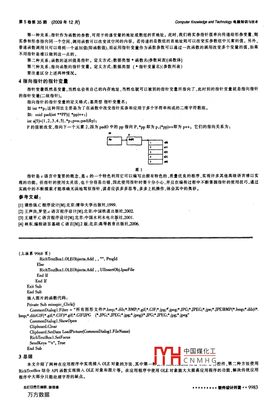 ssN1009304Computer Knowledge and Technology t電腦知識與技術(shù)http://www.dnzs.net.cnVol 5, No 35, December 2009, pp. 9982-9983Tel:+86-551-56909635690964c語言指針的應(yīng)用王美蒙(安徽新華學院信息工程學院安徽合肥230088)摘要:指針是C語言的靈魂,是C語言的精華和重要特色,理解指針的概念應(yīng)從計算機存儲儲系統(tǒng)硬件結(jié)構(gòu)入手。它是C語言學習的重點和難點,也是學好C語言的關(guān)鍵,針對學生在學習指針過程中遇到的困難及使用指針過程中出現(xiàn)的常兒錯誤,該文從指針的定義、指針的基本操作、指針與其他數(shù)據(jù)類型的關(guān)系等方面對指針做詳細分析,以助學習者更好的理解與記憶。關(guān)鍵詞:C程序設(shè)計;指針;數(shù)組;函數(shù);字符串;內(nèi)存地址;變量參數(shù)中圖分類號:TP3112文獻標識碼:A文章編號:1009-304420035-998202指針是C語言的一個重要概念。由于指針的概念比較抽象,使用起來又相對靈活因而正確理解和運用指針就成了C語言程序設(shè)計的一個難點,掌握好指針,可以增強學生閱讀C程序的能力,可以使程序變得簡潔、緊湊和高效同時也讓學生對“駕馭了”計算機產(chǎn)生一種自豪感,為日后更進一步的學習奠定良好的基礎(chǔ)計算機內(nèi)存中的每個存儲單元,都有一個相應(yīng)編號,叫做內(nèi)存地址。若在程序中定義了一個變量,C編譯系統(tǒng)就會根據(jù)定義中變量的類型。為其分配一定字節(jié)數(shù)的內(nèi)存空間。同時建立一個變量名與地址間的對應(yīng)關(guān)系。變量值就存放于該地址的內(nèi)存單元中。而指針(即地址)也是一種數(shù)據(jù)類型,指針變量是只能存放地址類型數(shù)據(jù)的變量,我們把存放指針的變量稱為指針變量,簡稱指針。這個變量和基本變量的不同點就在于基本類型變量內(nèi)部存儲了同類型的常量,而指針變量內(nèi)部存儲的則是同類型變量的首地址(所指向的變量的地址)。在C語言中,訪問數(shù)據(jù)對象一般采用直接訪問的方法,而引人指針變量的目的則是用來間接訪問數(shù)據(jù)對象,這種訪問的特點是先找到存放數(shù)據(jù)的地址,然后通過該地址來訪問數(shù)據(jù)。指針變量的定義:基類型*指針變量名;此處的“”要與指針運算符“區(qū)分開,前者用來標示所定義的變量是指針變量,只起到標志的作用;而后者是一個運算符,用于取該指針變量所指向的變量。無論什么樣的基類型指針變量本身所占內(nèi)存大小一般是固定的,與CPU的地址總線寬度及計算機系統(tǒng)總線有關(guān)。指針變量可以指向變量,也可以指向數(shù)組、字符串,還可以指向函數(shù)。使用時要切記:一定要讓指針變量指向同類型的數(shù)據(jù)。1指針的基本操作指針的基本操作包括指針賦值、取地址、判斷指針是否為空、計算兩地址間相隔元素的個數(shù)、操作符“”或“+"運算以及指針操作符綜合運用等。指針賦值、取地址運算在指針運用中比較普遍,如inti=5;int*ip=&i;判斷指針是否為空可以用語句p=0)或iip=NULL)其中p為指針變量。指針“”或“+”一個整數(shù)n,表示將指針由當前位置移動到前面(或后面)的第n個數(shù)據(jù)處。兩指針相減的結(jié)果是兩指針之間相隔數(shù)據(jù)的個數(shù)結(jié)果是一個整數(shù),而不是地址。如:inta[0;imtx=B,y=B;則x+2表示將指針x由指向a數(shù)組中第一個元素改為向后移動兩個數(shù)據(jù),即指向第三個元素。而xy的結(jié)果是x與y這兩個指針之間相隔數(shù)據(jù)的個數(shù),等于2。利用這個特點,若將y指向數(shù)組a的首地址將x移到a數(shù)組的末尾,則用xy就可以求出數(shù)組a的長度,即a中數(shù)據(jù)的個數(shù)2指針與數(shù)組的關(guān)系指針常用于數(shù)組中,數(shù)組名本身是一個指向該數(shù)組首地址的常量指針。在應(yīng)用時把數(shù)組名賦值給指針,通過指針的運算可以定位到數(shù)組中的任一元素。應(yīng)用指針和數(shù)組的方式都可以訪問數(shù)組中的元素,但二者的訪問效率并不一樣。指向同一數(shù)組的兩個指針變量可作減法(結(jié)果為相隔的元素個數(shù))及關(guān)系運算。如:ina5}{1,2,3,4,5,p語句:forp=;p