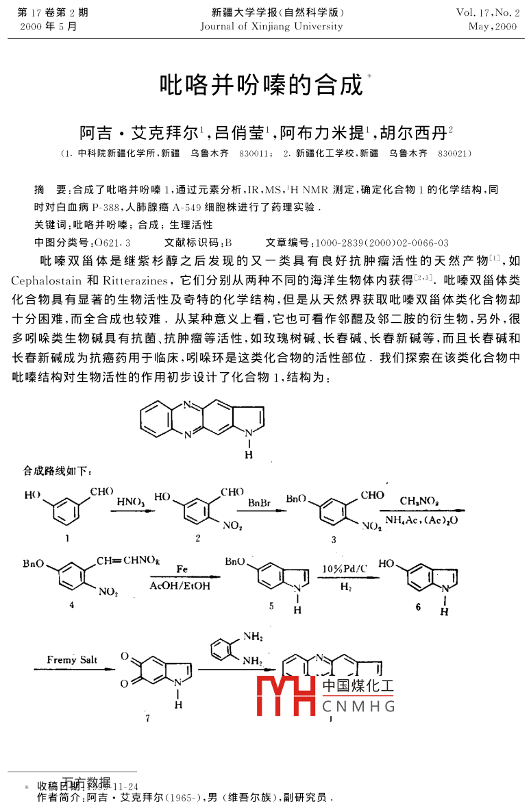第17卷第2期新疆大學(xué)學(xué)報(bào)(自然科學(xué)版)Vol. 17,No. 22000年5月Journal of Xinjiang UniversityMay ,2000吡咯并吩嗪的合成阿吉●艾克拜爾,呂俏瑩! ,阿布力米提1 ,胡爾西丹2(1.中科院新疆化學(xué)所,新疆 烏魯木齊830011; 2.新疆化工學(xué)校,新疆 烏魯木齊 830021)摘要:合成 了吡咯并吩嗪1,通過元素分析,IR,MS,'H NMR測定.確定化合物1的化學(xué)結(jié)構(gòu),同時(shí)對(duì)白血病P-388,人肺腺癌A-549細(xì)胞株進(jìn)行了藥理實(shí)驗(yàn).關(guān)鍵詞:吡咯并吩嗪;合成;生理活性中圖分類號(hào):O621.3文獻(xiàn)標(biāo)識(shí)碼:B文章編號(hào):1000-2839( 2000)02-0066-03吡嗪雙甾體是繼紫杉醇之后發(fā)現(xiàn)的又一類具有良好抗腫瘤活性的天然產(chǎn)物,如Cephalostain和Ritterazines,它們分別從兩種不同的海洋生物體內(nèi)獲得[2.3].吡嗪雙甾體類化合物具有顯著的生物活性及奇特的化學(xué)結(jié)構(gòu),但是從天然界獲取吡嗪雙甾體類化合物卻十分困難,而全合成也較難.從某種意義上看,它也可看作鄰醌及鄰二胺的衍生物,另外,很多吲哚類生物堿具有抗菌、抗腫瘤等活性,如玫瑰樹堿、長春堿、長春新堿等,而且長春堿和長春新堿成為抗癌藥用于臨床,吲哚環(huán)是這類化合物的活性部位.我們探索在該類化合物中吡嗪結(jié)構(gòu)對(duì)生物活性的作用初步設(shè)計(jì)了化合物1,結(jié)構(gòu)為:H合成路線如下:H()CH()HNOsHOCHOBnBrBnO. CHOCHzNO。NHAc ,(Ac)2ONO,NOr2BnO、CH= = CHNOgBnO.10%Pd/CHO、AcOH/EtOH“ NO:56, NH:Fremy SaltNH,KY江中國煤化工YHCNMHG收稿西方教據(jù)11-24作者簡介:阿吉●艾克拜爾(1965-).男(維吾爾族),副研究員.第2期阿吉●艾克拜爾等:吡咯并吩嗪的合成67實(shí)驗(yàn)部分1.1儀器和試劑Fisher- John熔點(diǎn)儀(溫度計(jì)未經(jīng)校正), Perkin Elmer 559B型和Nicolet Magha FL-TR750型紅外光譜儀,Carloerba 1106 型自動(dòng)元素分析儀, Bruker AM400型和GEMINI- 300型核磁共振儀,MAT-711型和MAT-95型質(zhì)譜儀.青島海洋化工廠層析硅膠(200~300目),煙臺(tái)化工實(shí)驗(yàn)廠HSF 254薄層層析預(yù)制板,顯色劑為碘、氯化鐵乙醇液.試劑:m-羥基苯甲醛、溴卞,鋰鋁氫,鄰苯二胺,10%Pd/C,Fremy鹽等,溶劑DMF,Et2O, AcOH, C2H.OH, CHsCOCH3,吡啶等.1.2合成1)5-羥基吲哚的合成按文獻(xiàn)[4]的方法合成mp:107~ 108C(文獻(xiàn)值:108~ 108.5°C)'H NMR (300MHz,CDCl3, δppm),6. 44(1H,m,Ar-H),6. 78(1H,dd,J=2.4Hz,8.7Hz, Pyr- H), 7.05(1H,S,Ar- H), 7.18(1H,t,J= 2.8Hz,Ar- H), 7.25(1H,d,J=8.7Hz,Pyr-H),8. 05(1H,br.,Ar- H); MS(m/z): 133(M+), 132,104, 79,67, 51.2) Fremy鹽的合成按文獻(xiàn)[5]的方法合成3) 5,6-吲哚鄰醌的合成取100mg (0. 752mmol) 5-羥基吲哚溶解于45mL乙腈中,攪拌,冰浴冷卻,滴加由904.5mg(3.37mmol)Fremy鹽和45mL(0.062M)磷酸二氫鉀緩沖溶液配制的溶液,滴加完畢,室溫反應(yīng)l小時(shí),乙酸乙酯(20mlX3)提取、飽和食鹽水洗滌,無水硫酸鎂干燥,減壓濃縮,殘余物柱層析(SiO2,200~300目)CH2Cl2: AcOEt (5: 2)洗脫,得紅色的固體產(chǎn)物7,重62mg ,收率56. 2% ,mp :300°C以上,H NMR (300MHz,DMSO, δppm) 5.92 (1H, d, J=9.9Hz,Pyr一H),6.51 (1H, s,Ar-H), 7. 02 (1H,s,Ar- H),7.38 (1H,d,J= 10. 4Hz,Pyr一H),12.00 (1H, br. ,N-H).4)吡咯并吩嗪的合成取50mg(0.352mmol)5,6-吲哚鄰醌溶解于5mL醋酸,加由37mg(0.342mmol)鄰苯二胺和4mL醋酸配制的溶液,加熱至100°C反應(yīng)30分鐘,冷卻至室溫,減壓濃縮,氯仿提取,碳酸氫鈉水溶液洗滌,飽和食鹽水洗滌,無水硫酸鈉干燥,蒸除溶劑,殘余物柱層析(SiO2, 200~300目),石油醚:乙酸乙酯(5: 1)洗脫,得黃色的固體1,重60mg收率80. 5% ,mp :255~259C,H NMR (300MHz, CDCls, δppm),7. 41 (1H,t,J=2. 7Hz,Ar-H),7. 60(1H,t,J=2.6Hz,Ar- H),7.82(2H,m,Ar-H),7.91(2H中國煤化工J =2.4Hz,7. 7Hz,Ar-H),8.36(1H,dd,J=1.7Hz,8.3Hz,Ar-H):CYHCN MH GS:219(M+ ),218,203,192, 165, 140,117;元素分析,計(jì)算值:C76.70%;H4. 14%;N19. 16%;測定值:C76.23%; .H4.54% ;N19.33%.2結(jié)果與討論中間體5-羥基吲|哚是文獻(xiàn)報(bào)道的已知物,有關(guān)合成5-羥基吲哚的文獻(xiàn)報(bào)道很多,雖然我68新疆大學(xué)學(xué)報(bào)(自然科學(xué)版)2000年們選擇的合成路線用的起始原料較貴,但具有反應(yīng)操作簡單,反應(yīng)收率高等特點(diǎn)用Fremy鹽氧化反應(yīng)過程中,我們發(fā)現(xiàn),反應(yīng)產(chǎn)物的乙酸乙酯提取液放置數(shù)小時(shí)無變化,但蒸干溶劑后,所得是一黑色產(chǎn)物,薄層層析顯示,大部分是極性的黑色物,僅有少量的.紅色鄰醌產(chǎn)物,說明產(chǎn)物對(duì)酸、堿、熱敏感.經(jīng)多次實(shí)驗(yàn),摸索出以下氧化反應(yīng)條件:反應(yīng)溶劑是乙腈和水(1 : 1),磷酸二氫鉀緩沖液預(yù)先調(diào)節(jié)至pH=7,提取液濃縮時(shí)水浴溫度保持在20°C以下,這樣得到了鄰醌產(chǎn)物.由于鄰醌產(chǎn)物很不穩(wěn)定,所以要保存在惰性的氣體中并盡快用于下一步反應(yīng).我們用常規(guī)的反應(yīng)方法合成了具有吡嗪結(jié)構(gòu)的化合物1,同時(shí)對(duì)其進(jìn)行了藥理實(shí)驗(yàn),很可惜化合物1對(duì)A-549人肺腺癌和P-388小鼠白血病無效,所以我們認(rèn)為吡嗪雙甾體化合物有效部位有可能是環(huán)醚的甾體部位.致謝:本工作是在.上海藥物所蔡俊超教授的指導(dǎo)和幫助下進(jìn)行的,所有光譜均由中國科學(xué)院上海藥物所分析室測試,在此特表示感謝.參考文獻(xiàn):[1] Ganesan A, Heathcock C H. Isolation and structure of the powerful cell growth inhibitor cephalostatin 1[J]. Org Chem,1988,1(4):311~312.[2] Pettit G R,Inou
